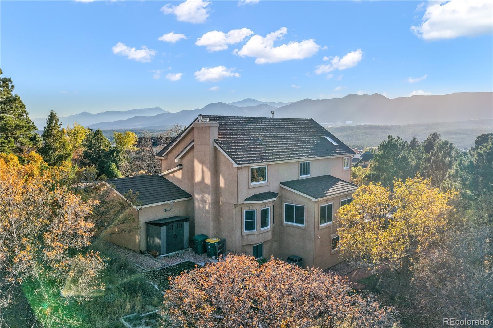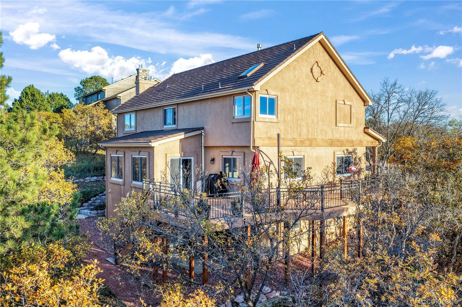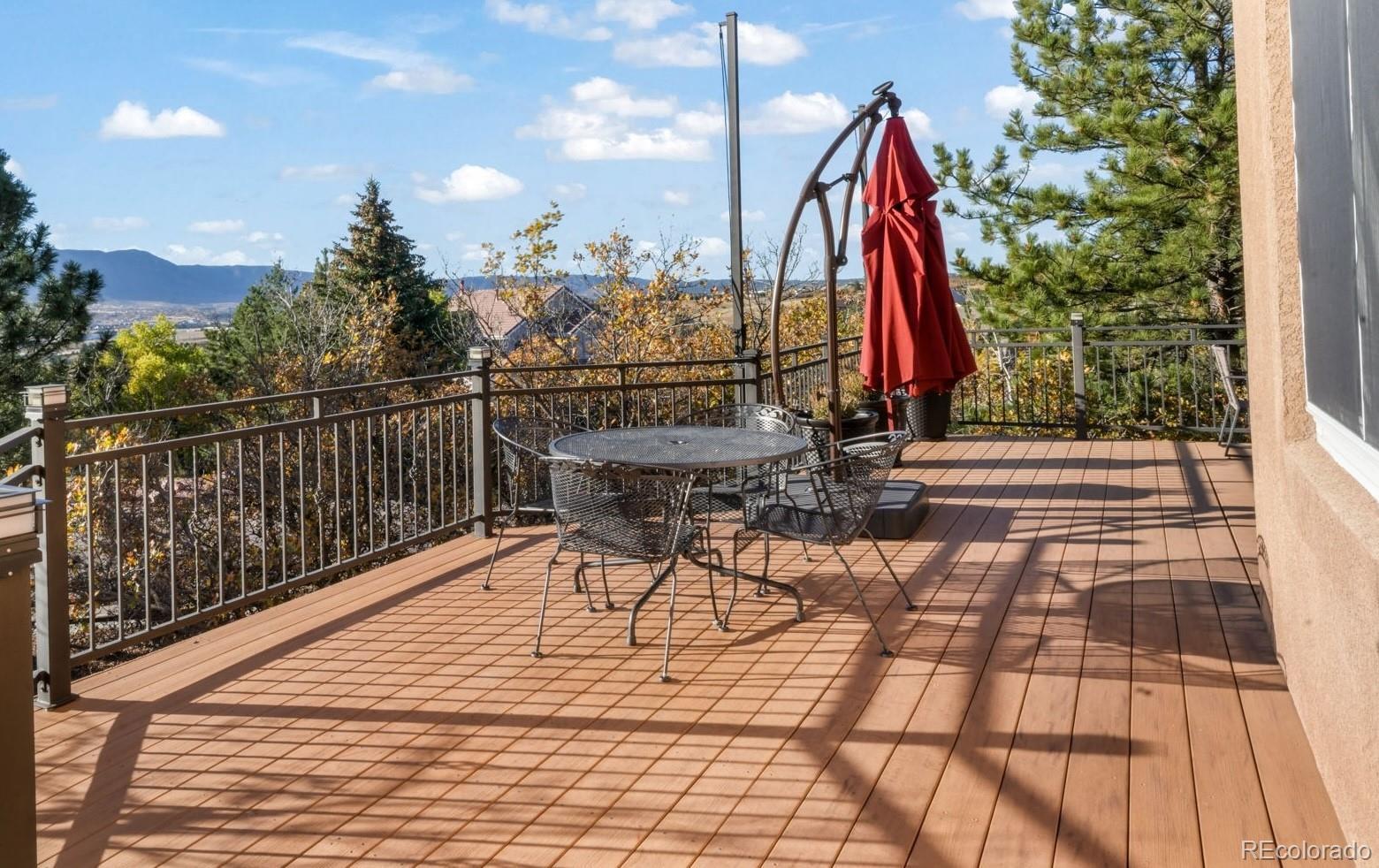 Fall in love with the views in this warm and inviting Gleneagle home. Perfectly positioned on a large corner lot, this 5 bedroom, 4 bath residence captures breathtaking Front Range and Pikes Peak views from its expansive 25x50 wraparound deck. Ideal for morning coffee, al fresco dining, and unforgettable Colorado sunsets. This two story floorplan blends elegance and comfort throughout. The heart of the home is the gourmet kitchen, featuring granite countertops, abundant cabinetry, upgraded stainless steel appliances and a bright dining area that opens directly to the deck, creating effortless indoor-outdoor living and entertaining. The adjoining family room welcomes you with a cozy gas fireplace, custom built-ins, and a wall of windows framing the stunning mountain vistas. Formal living and dining rooms offer versatile spaces for gatherings, celebrations, or quiet evenings at home. Upstairs, retreat to the luxurious primary suite complete with a private sitting area, large walk-in closet, and 5 piece bath with soaking tub and dual vanities. Three additional bedrooms and a full bath complete the upper level. The walkout lower level is an entertainer’s dream—boasting a spacious recreation room, private guest suite with full bath, a convenient snack bar, and a workshop area perfect for hobbies or storage. Step outside to mature landscaping, lush grassy areas, and multiple outdoor entertaining spaces designed for true Colorado living. Additional highlights include central air conditioning, main level laundry, an insulated oversized 3-car garage, and a durable Class 4 composite steel tile roof that’s both stylish and insurance friendly. Located within top rated District 20 schools, this exceptional property offers quick access to I-25, Denver, the Air Force Academy, and premier shopping, dining, and entertainment options in Northgate. Experience comfort, functionality, and spectacular views in one of Northern Colorado Springs’ most sought after neighborhoods.