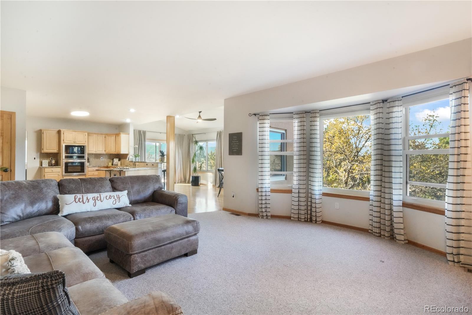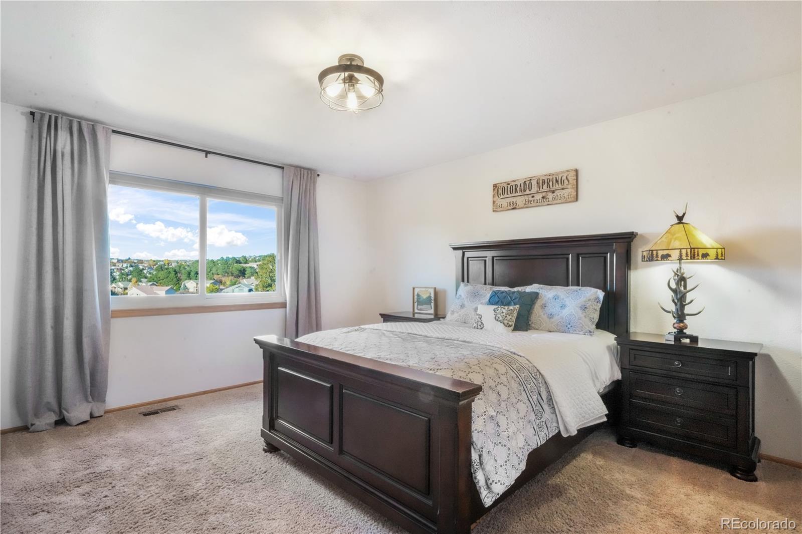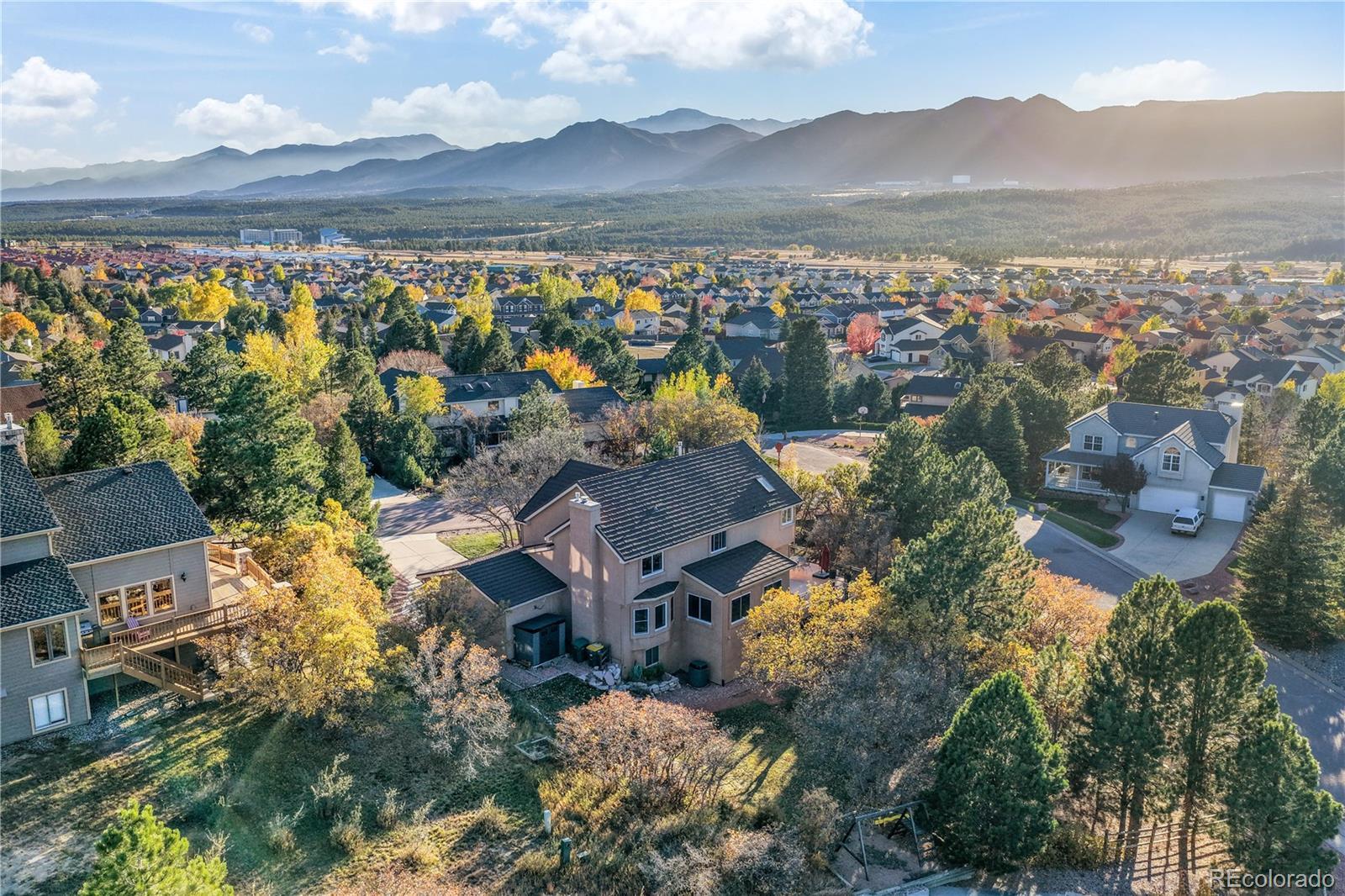Fall in love with the views in this warm and inviting Gleneagle home. Perfectly positioned on a large corner lot, this 5 bedroom, 4 bath residence captures breathtaking Front Range and Pikes Peak views from its expansive 25x50 wraparound deck. Ideal for morning coffee, al fresco dining, and unforgettable Colorado sunsets. This two story floorplan blends elegance and comfort throughout. The heart of the home is the gourmet kitchen, featuring granite countertops, abundant cabinetry, upgraded stainless steel appliances and a bright dining area that opens directly to the deck, creating effortless indoor-outdoor living and entertaining. The adjoining family room welcomes you with a cozy gas fireplace, custom built-ins, and a wall of windows framing the stunning mountain vistas. Formal living and dining rooms offer versatile spaces for gatherings, celebrations, or quiet evenings at home. Upstairs, retreat to the luxurious primary suite complete with a private sitting area, large walk-in closet, and 5 piece bath with soaking tub and dual vanities. Three additional bedrooms and a full bath complete the upper level. The walkout lower level is an entertainer’s dream—boasting a spacious recreation room, private guest suite with full bath, a convenient snack bar, and a workshop area perfect for hobbies or storage. Step outside to mature landscaping, lush grassy areas, and multiple outdoor entertaining spaces designed for true Colorado living. Additional highlights include central air conditioning, main level laundry, an insulated oversized 3-car garage, and a durable Class 4 composite steel tile roof that’s both stylish and insurance friendly. Located within top rated District 20 schools, this exceptional property offers quick access to I-25, Denver, the Air Force Academy, and premier shopping, dining, and entertainment options in Northgate. Experience comfort, functionality, and spectacular views in one of Northern Colorado Springs’ most sought after neighborhoods.