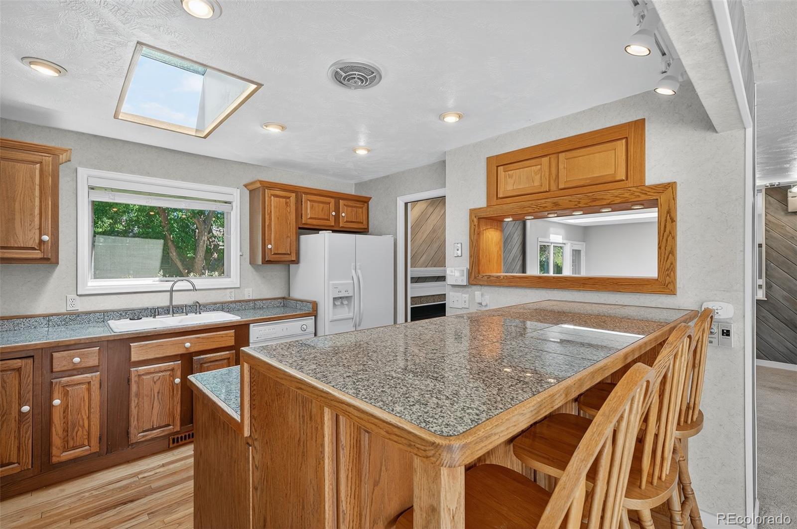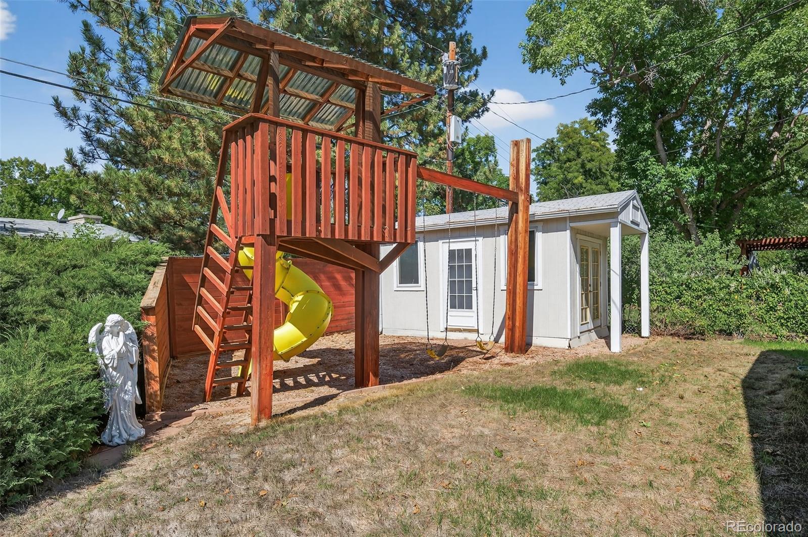 Welcome to 7753 S Ames Way, a mid-century modern ranch home in the highly sought-after Columbine Hills neighborhood of Littleton! This 3-bedroom, 3-bathroom home offers 1,625 square feet of comfortable living space above grade, plus an additional 725 square feet in the partially finished basement, giving you room to grow, play, or create your dream space. Nestled on a generous 11,979 square foot lot, this property offers privacy, space, and functionality inside and out. Step into the inviting open floor plan with lots of natural light, perfect for modern living and entertaining. The expanded primary suite is a true retreat, featuring an en-suite bath and extra closet space. Flex space on the main floor is currently a sunny dining area and it could be space for a large office, playroom, or gameroom. Love to tinker or need more storage? You’ll enjoy the oversized 2-car attached garage with a built-in workbench, and a large detached storage shed—ideal for a workshop or even more storage. A large patio area just off the living room greets you as you enter the private oasis back yard, complete with a playground set and plenty of space to relax or garden. Bring your boat or RV - the driveway extenda behind the fence for extra space. Built in 1959 and lovingly updated over the years, this home offers timeless charm with thoughtful updates. And with no HOA, you have the freedom to truly make this space your own. Located within the Jefferson County School District and just minutes from Chatfield State Park & Reservoir, this home is close to outdoor adventures while still offering easy commuter access to C-470. Don't miss your chance to own this Littleton gem that blends style, space, and convenience!