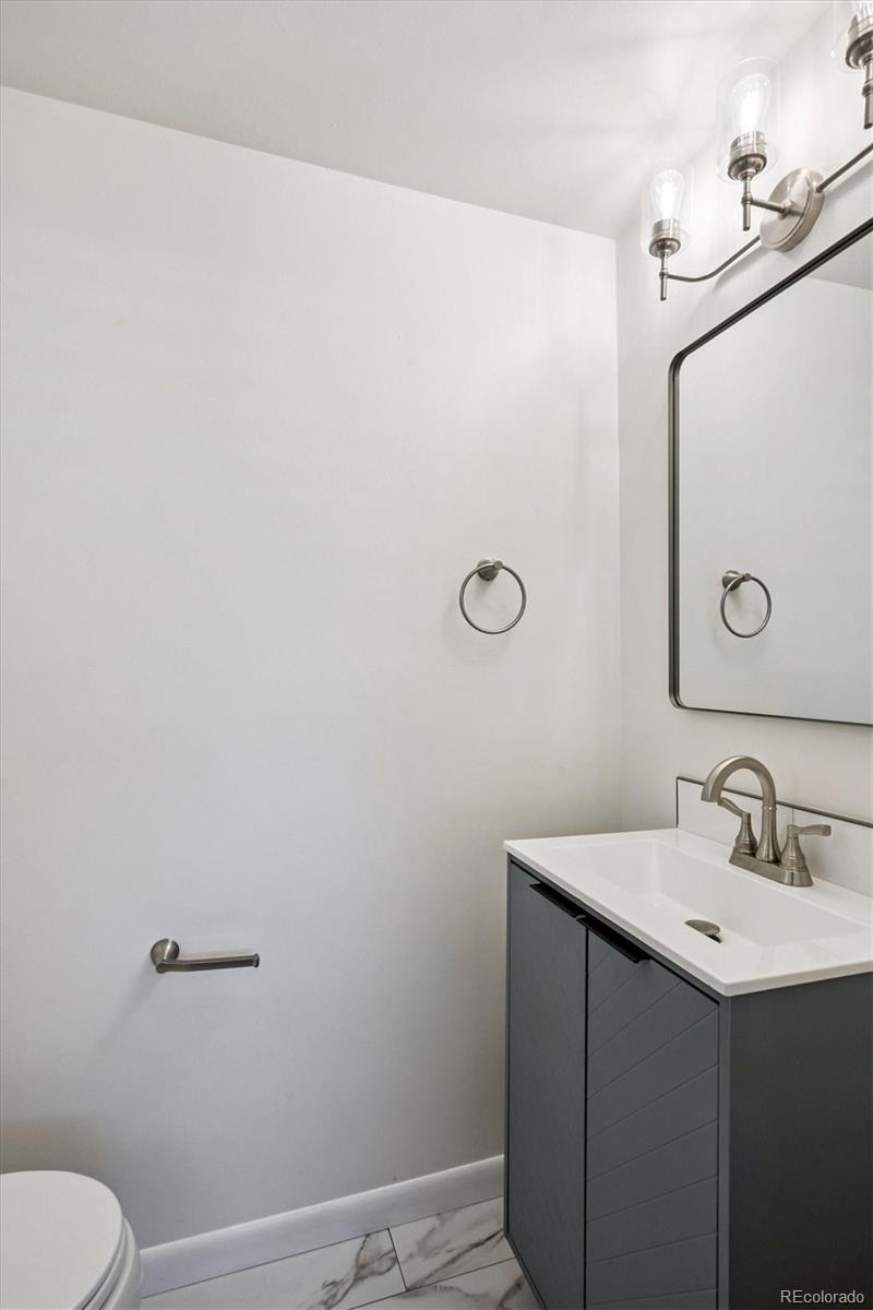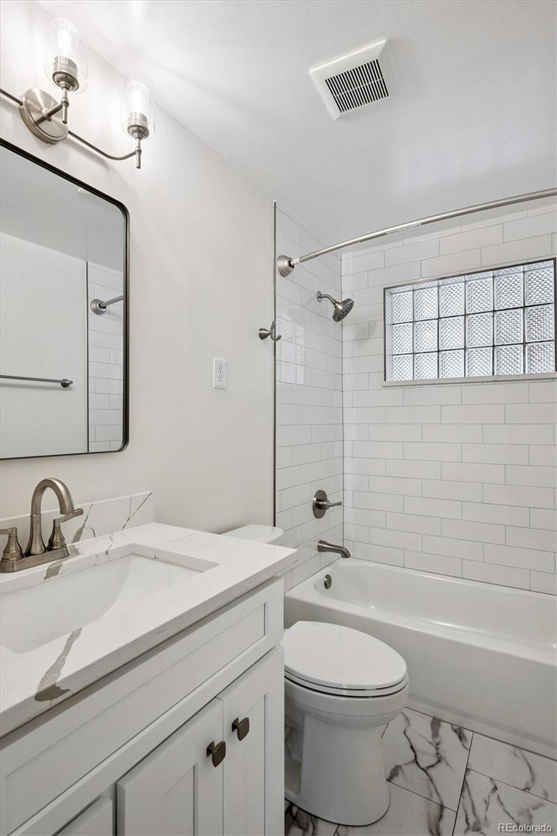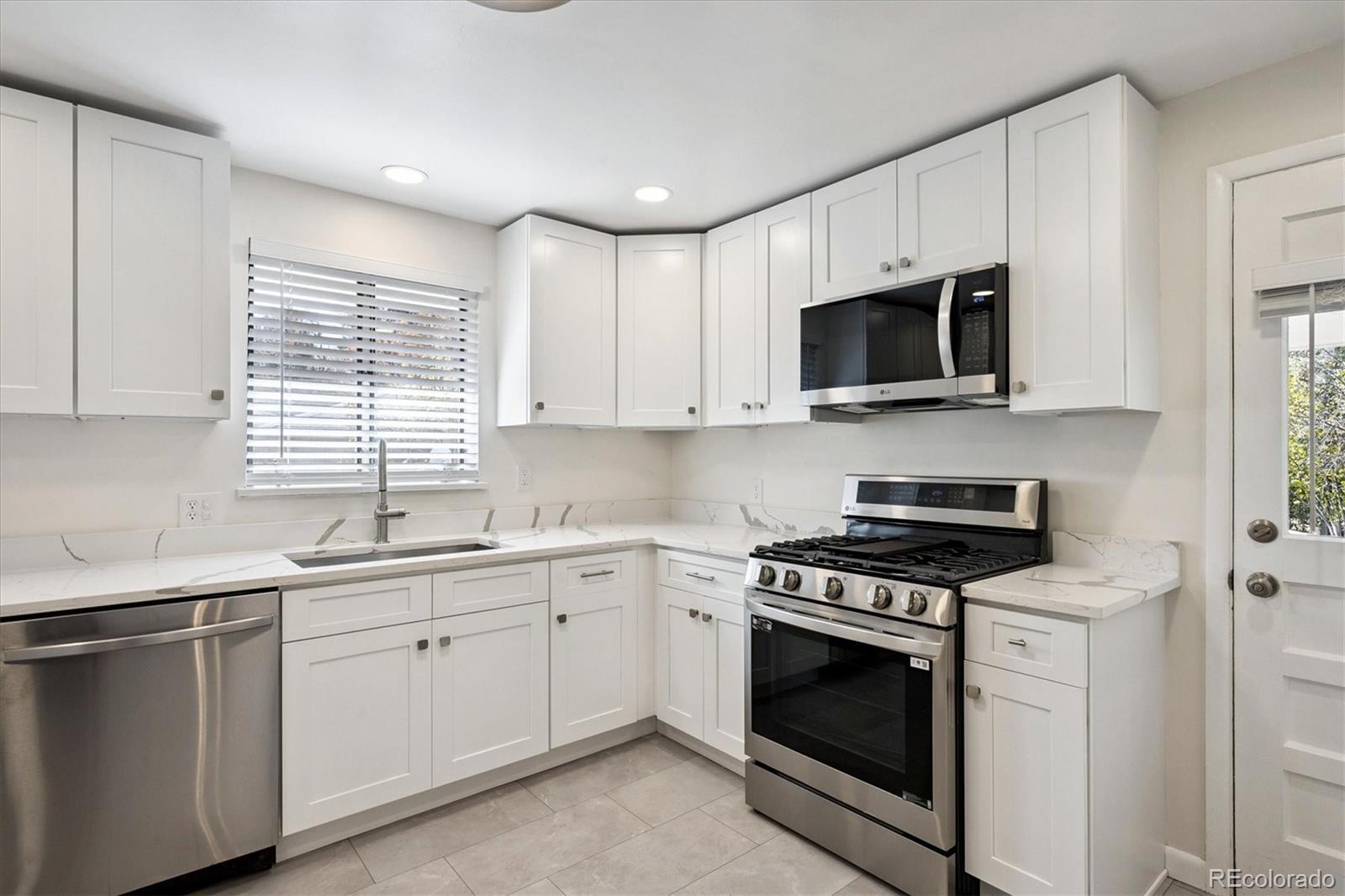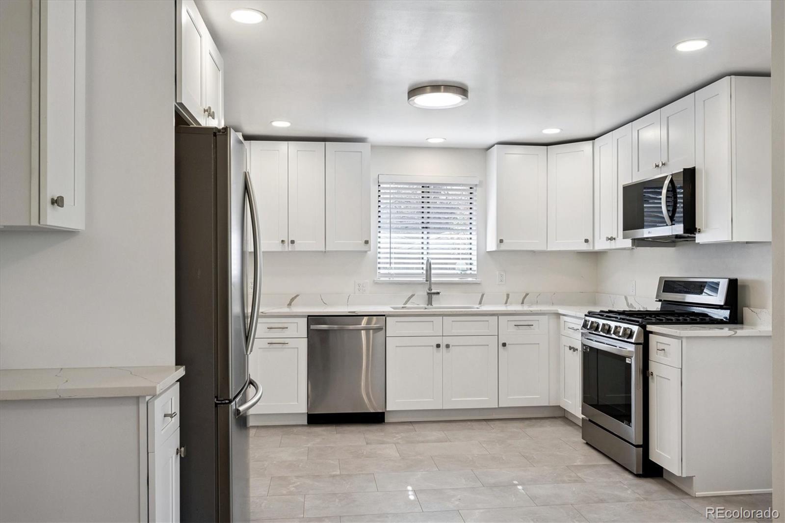 Completely remodeled rare mid-century brick ranch. Open floor plan, high ceilings, light and bright throughout. Original refinished hardwood floors throughout the main level. New interior and extertior paint. Updated lighting, plumbing and hardware fixtures througout. Enter through the main front porch area to the large living room with new can lighting, coved ceilings & highlighted by a floor to ceiling brick fireplace. Well situated dining room with slider door access to the brand new oversized concrete covered patio perfect for year round outdoor entertainment. Brand new kitchen with new soft closing cabinets and pantry, slab quartz countertops, SS appliances (gas stove) & new flooring. Two good sized secondary bedrooms, updated full bathroom with new flooring, subway tiled bath/tub surround, glass block window, new vanity with quartz countertop and all new bath hardware. Linen closet with laundry chute! Large primary bedroom with remodeld 1/2 bath en-suite. Walk down the well positioned staircase into the basement with tall ceilings throughout & into a large great room/game room area with new LVP flooring and a floor to ceiling bricked fireplace. Opposite this room is another large great room with all new can lighting. Utility room with lots of storage space and a walk in laundry room that includes a storage closet, utility sink, washer & dryer. Updated bathroom with new vanity & fixtures, walk in shower with new floor & new tiled poured shower pan and shower surround wall tile. Large bedroom (window, but not eggress). Attached garage. Solid systems including new boiler, radon mitigation system, good roof, solid electrical and plumbing. Professionally landscaped with front and back sprinklers/drip lines, fenced in yard, flagstone patio area, mature plants & trees, brand new concrete driveway, back patio and sidewalks. Close to everything including schools, parks, walking and biking trails, Cherry Creek, Downtown and major highways & throughfares plus much more