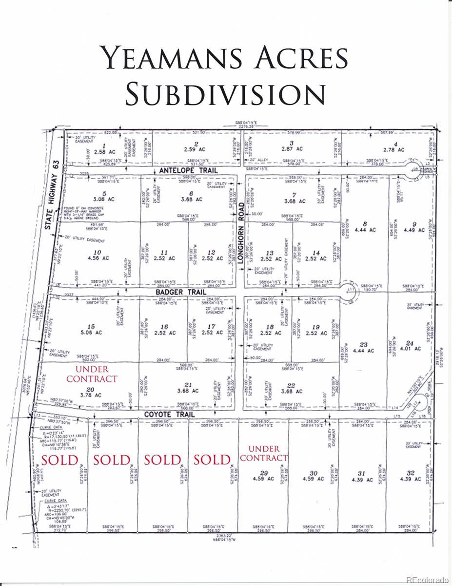 Akron’s newest subdivision, Yeamans Acres, combines the country living you long for with the convenience of municipal services that the Town of Akron can provide. These nearly five-acre lots are served with municipal water and trash services, and have unpaved streets that will be maintained by the Town of Akron. This is the perfect place to build the home you’ve always wanted. If owning a few head of livestock has always been your dream – here’s your chance. The Ranchette zoning allows for one animal unit per acre, so this is the perfect opportunity to have a 4-H or FFA project. Located less than a mile from the Washington County Golf Club and the Akron fishing pond makes it easy to enjoy these recreation amenities at the drop of a hat. Akron Schools have a reputation for academic excellence, with attentive, caring staff and administration who made your child’s school experience something that just can’t be duplicated in larger school districts. Akron is located 110 miles northeast of Denver in Washington County, an easy drive via I-76 and US Highway 34. The Town was founded in 1882 when the railroad expanded westward through what is now Akron. The railway remains a vital part of our community, but is joined by one of the finest general aviation airports in the region, the Colorado Plains Regional Airport. Washington County has a largely agricultural-based economy. Wheat and cattle are the backbone of not only the economy, but also the traditional values and rural lifestyle that continue to define the community. These lots are an empty canvas. Take a look at what’s available and start making your dreams a reality.