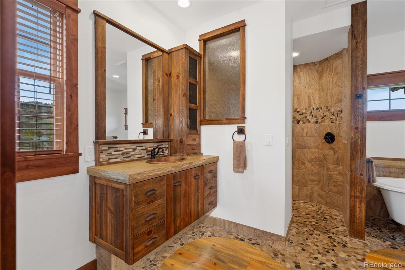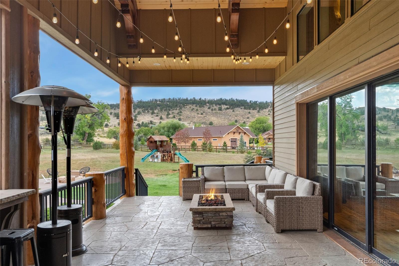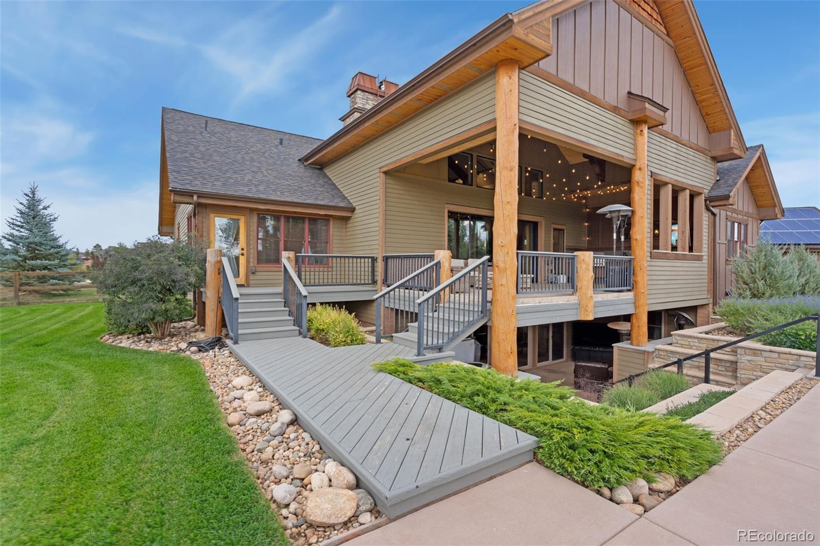 Welcome to this stunning one-of-a-kind custom 4 bed/5 bath mountain home, where every detail was hand-crafted by a local cabinet maker. Nestled on 2.75 acres in a peaceful cul-de-sac, this residence offers lush pastures and breathtaking mountain views. (Horses welcome!) All bedrooms feature en-suite baths, and the design blends rustic elegance with modern comfort. Step inside to soaring vaulted ceilings, custom wood beams, and striking wide-plank floors. A floor-to-ceiling stacked stone fireplace anchors the living room, while the gourmet kitchen impresses with a professional gas range, center island with board countertop, and tap-to-open cabinetry. The main-level primary suite is a true retreat with a private deck, spa-like 5-piece bath featuring pebble stone and wood accents, free-standing tub, electric fireplace, and dreamy walk-in closet with washer/dryer. Upstairs offers a charming bedroom with an attached sitting room/playroom and en-suite bath. The finished basement provides an entertainer’s paradise with a spacious family room (currently a gym), walkout doors to spa, custom full bar, luxury home theater, wine cellar, two large bedrooms with en-suite bathrooms, bonus room, and half bath. Outdoor living shines with a covered patio, fire pit, hot tub, playground, and open space for gatherings. A peaceful creek adds to the serene setting, while solar panels keep energy costs low. Recent updates in 2024 include landscaping, fencing, asphalt driveway, irrigation, fire pit, concrete, brick patio, appliances, carpeting, refinished porches, and full interior/exterior painting. The oversized 4 car garage also has an attached attic space for tons of storage or workspace. Move-in ready, this exceptional home also offers negotiable furnishings as sellers are relocating overseas.