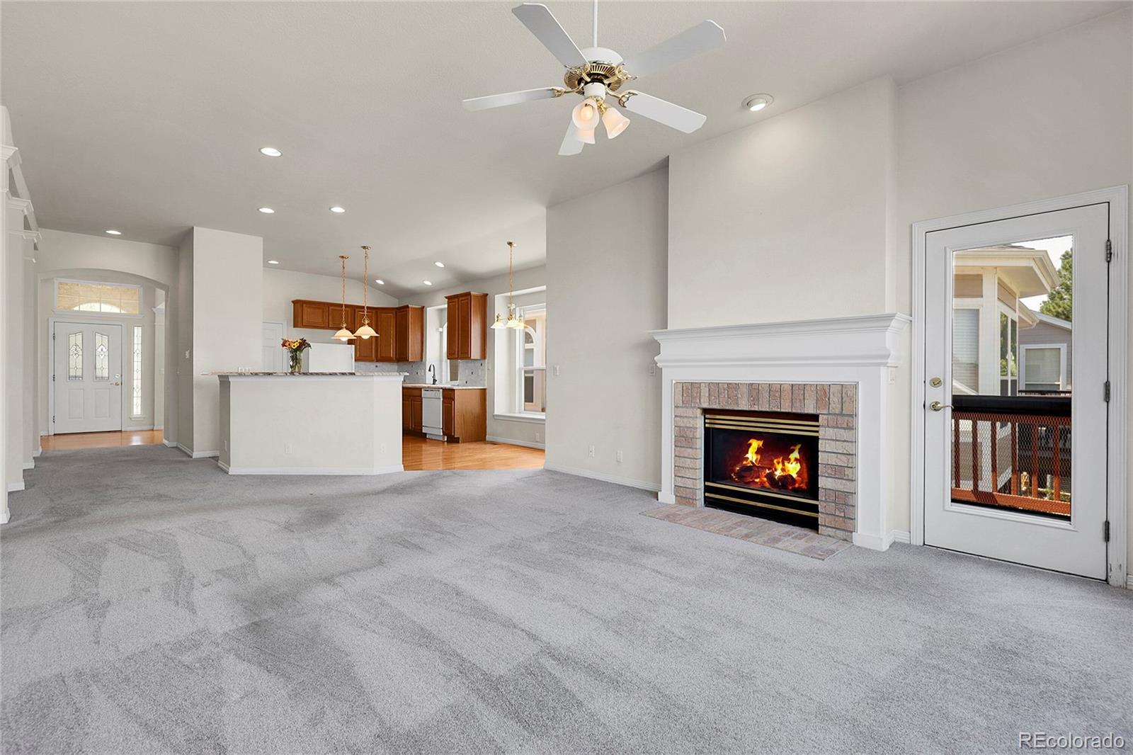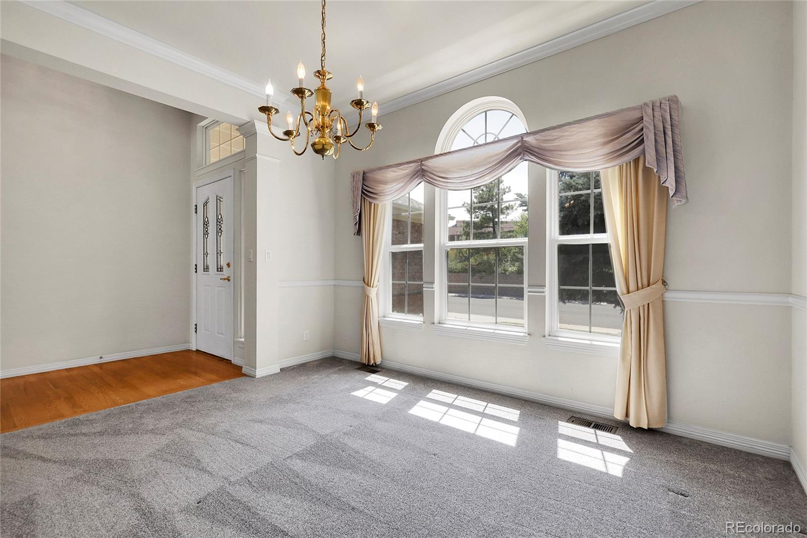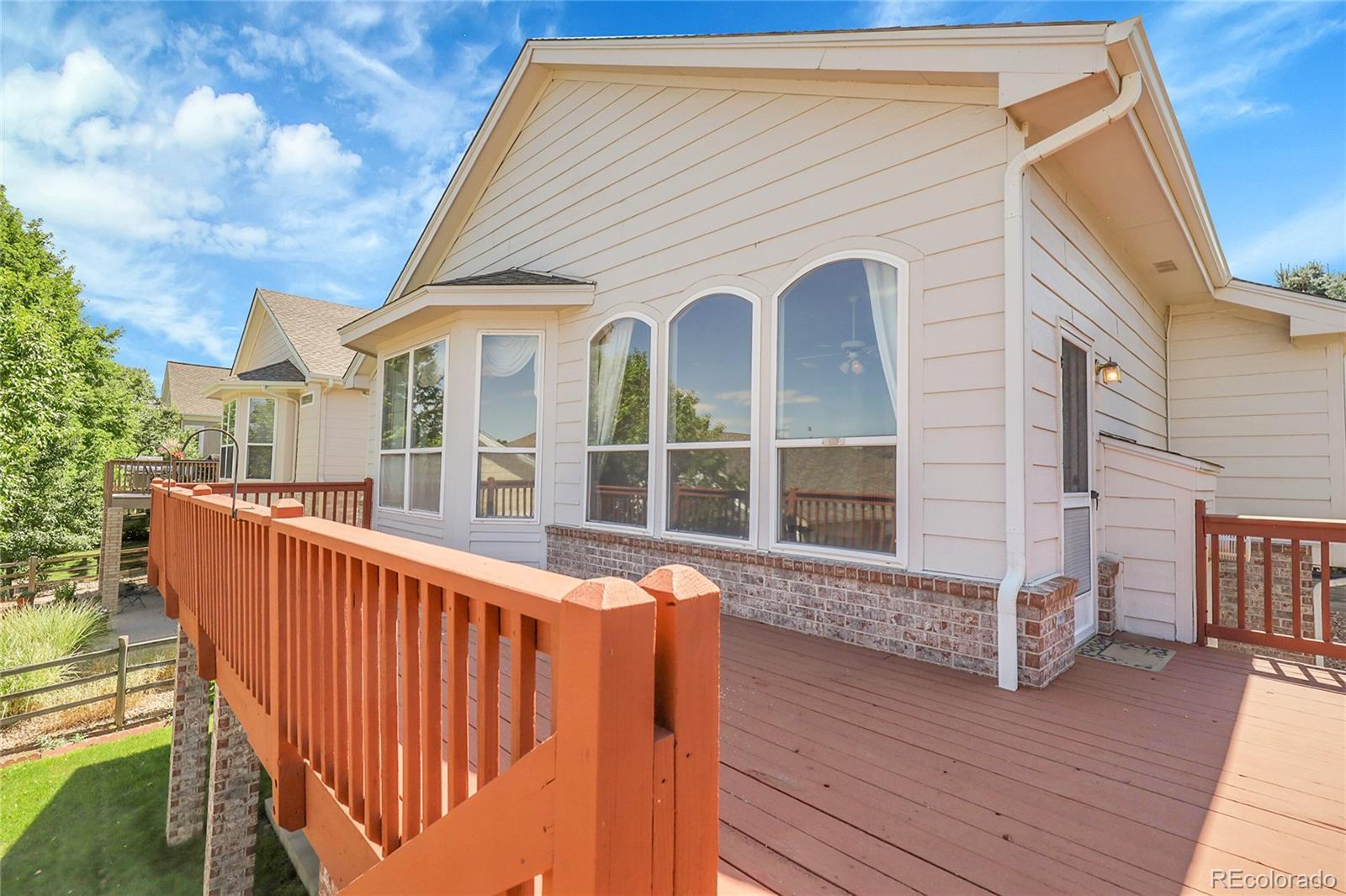 Rare and desirable brick ranch-style home with a walk-out basement in the well-maintained Fairways of South Suburban community. This special neighborhood offers residents access to a swimming pool and tennis courts, all in a prime location just off Colorado Boulevard between Dry Creek and County Line Road. Shopping, Downtown Denver, the Denver Tech Center, and the foothills are all within easy reach in addition to South Suburban Golf Course adjacent to the north side of the neighborhood and the South Suburban rec center about a 5 minute drive away.. Step through the front door into a welcoming foyer with hardwood floors. To the left, the formal dining room with crown molding could easily serve as an office or flexible living space. The home is bright and sunny throughout with abundant natural light streaming into the living room and primary suite.The spacious kitchen features granite countertops, a tile backsplash, white appliances, a breakfast bar, and an island with an electric cooktop. There’s also a cozy eating area that opens to the living room with soaring 10-foot ceilings and a wall of windows. From here, step out onto the expansive deck that spans nearly the full width of the home—perfect for relaxing or entertaining.The main floor primary suite includes a four-piece bath and a walk-in closet. Two additional bedrooms and a full bath are located on the opposite side of the foyer, along with a main floor laundry (washer and dryer included) with direct access to the garage.The lower level, finished with permits through the City of Centennial, offers high 8.5-foot ceilings and incredible flexibility. While there’s no carpet or LVP installed, the space is fully drywalled, trimmed, and painted, ready for the new owner’s personal touch. It includes a large family room, a bedroom, a 3/4 bath, a workshop, an HVAC room, and a versatile flex space.