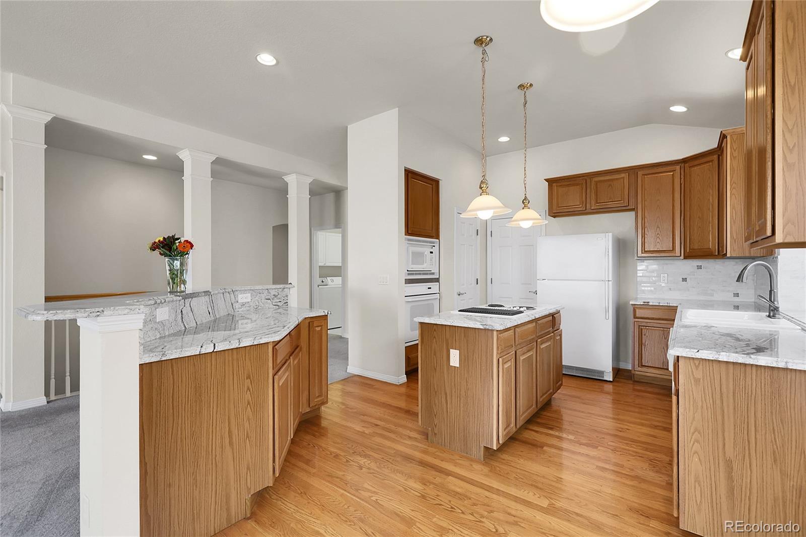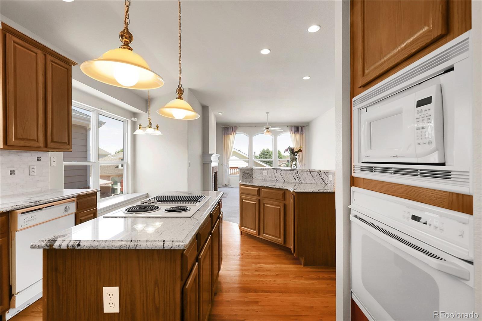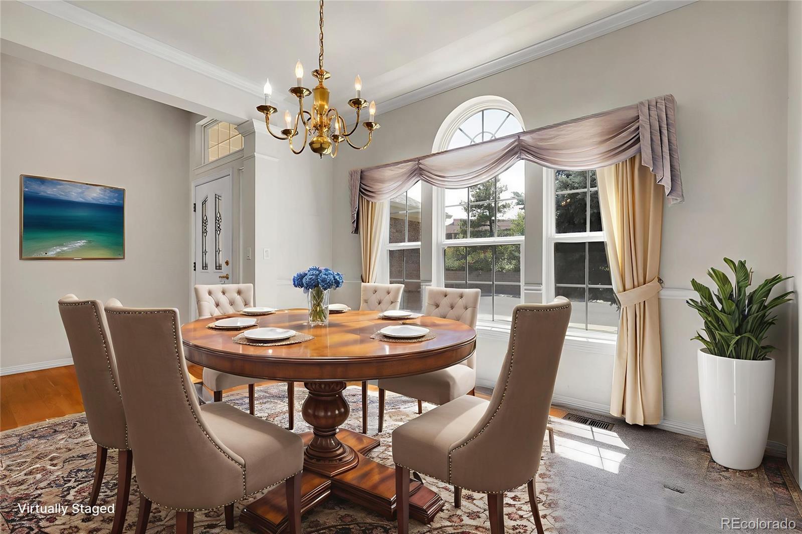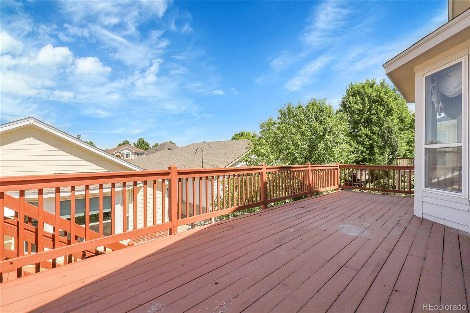Rare and desirable brick ranch-style home with a walk-out basement in the well-maintained Fairways of South Suburban community. This special neighborhood offers residents access to a swimming pool and tennis courts, all in a prime location just off Colorado Boulevard between Dry Creek and County Line Road. Shopping, Downtown Denver, the Denver Tech Center, and the foothills are all within easy reach in addition to South Suburban Golf Course adjacent to the north side of the neighborhood and the South Suburban rec center about a 5 minute drive away.. Step through the front door into a welcoming foyer with hardwood floors. To the left, the formal dining room with crown molding could easily serve as an office or flexible living space. The home is bright and sunny throughout with abundant natural light streaming into the living room and primary suite.The spacious kitchen features granite countertops, a tile backsplash, white appliances, a breakfast bar, and an island with an electric cooktop. There’s also a cozy eating area that opens to the living room with soaring 10-foot ceilings and a wall of windows. From here, step out onto the expansive deck that spans nearly the full width of the home—perfect for relaxing or entertaining.The main floor primary suite includes a four-piece bath and a walk-in closet. Two additional bedrooms and a full bath are located on the opposite side of the foyer, along with a main floor laundry (washer and dryer included) with direct access to the garage.The lower level, finished with permits through the City of Centennial, offers high 8.5-foot ceilings and incredible flexibility. While there’s no carpet or LVP installed, the space is fully drywalled, trimmed, and painted, ready for the new owner’s personal touch. It includes a large family room, a bedroom, a 3/4 bath, a workshop, an HVAC room, and a versatile flex space.
