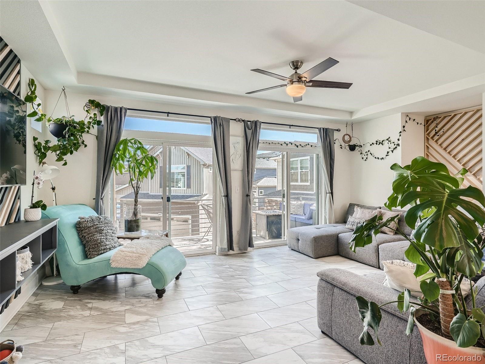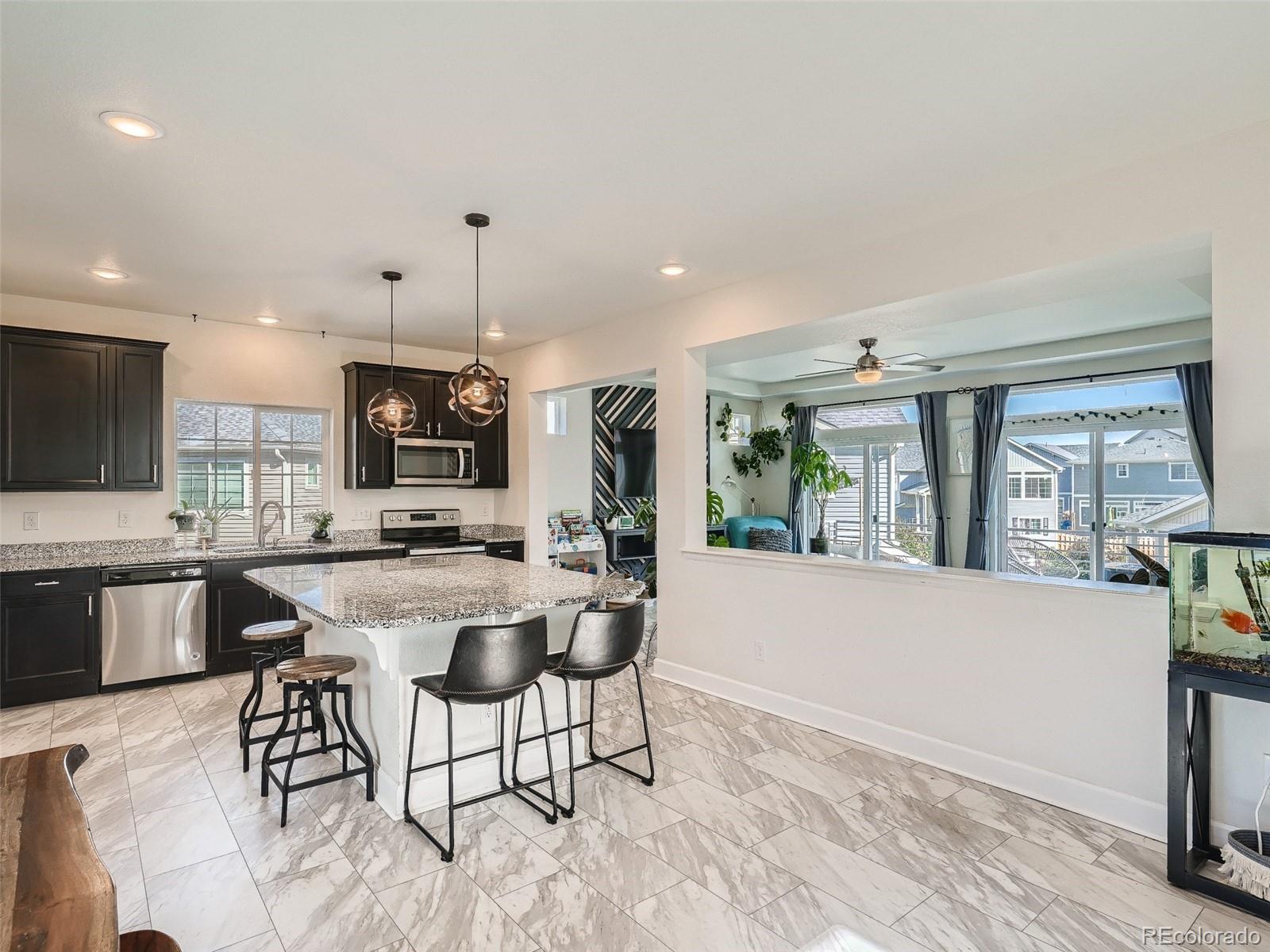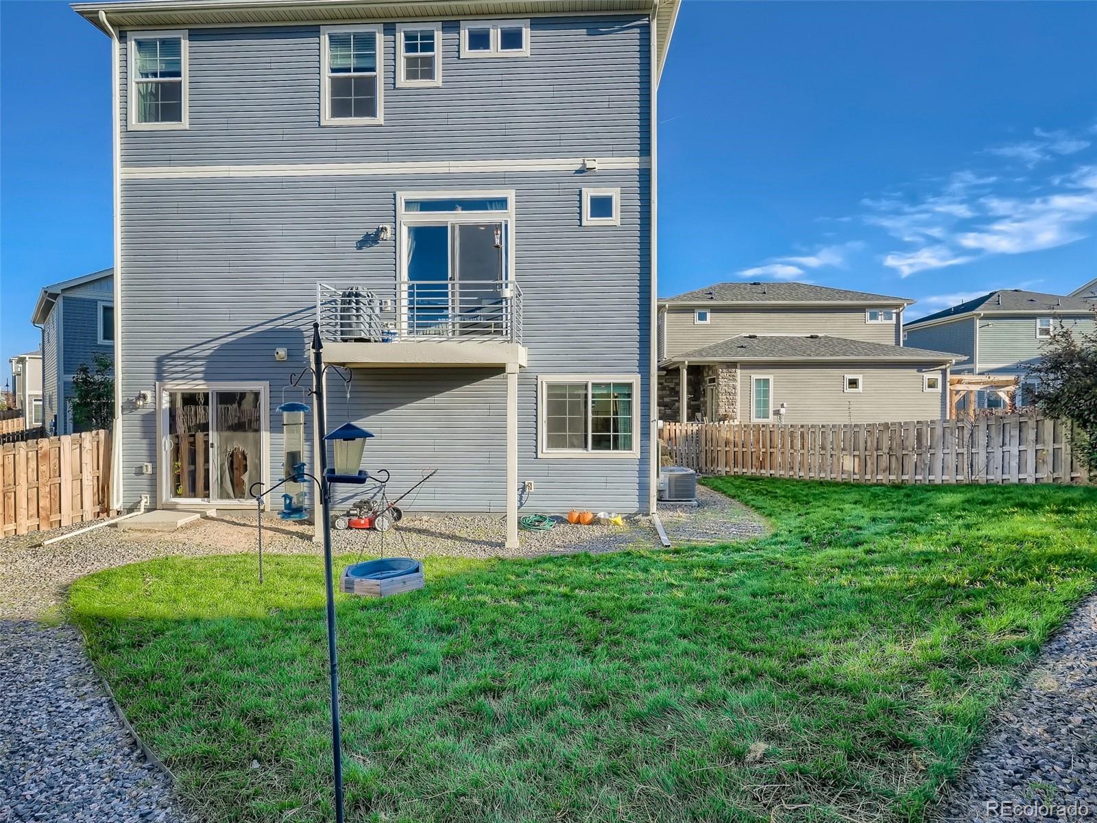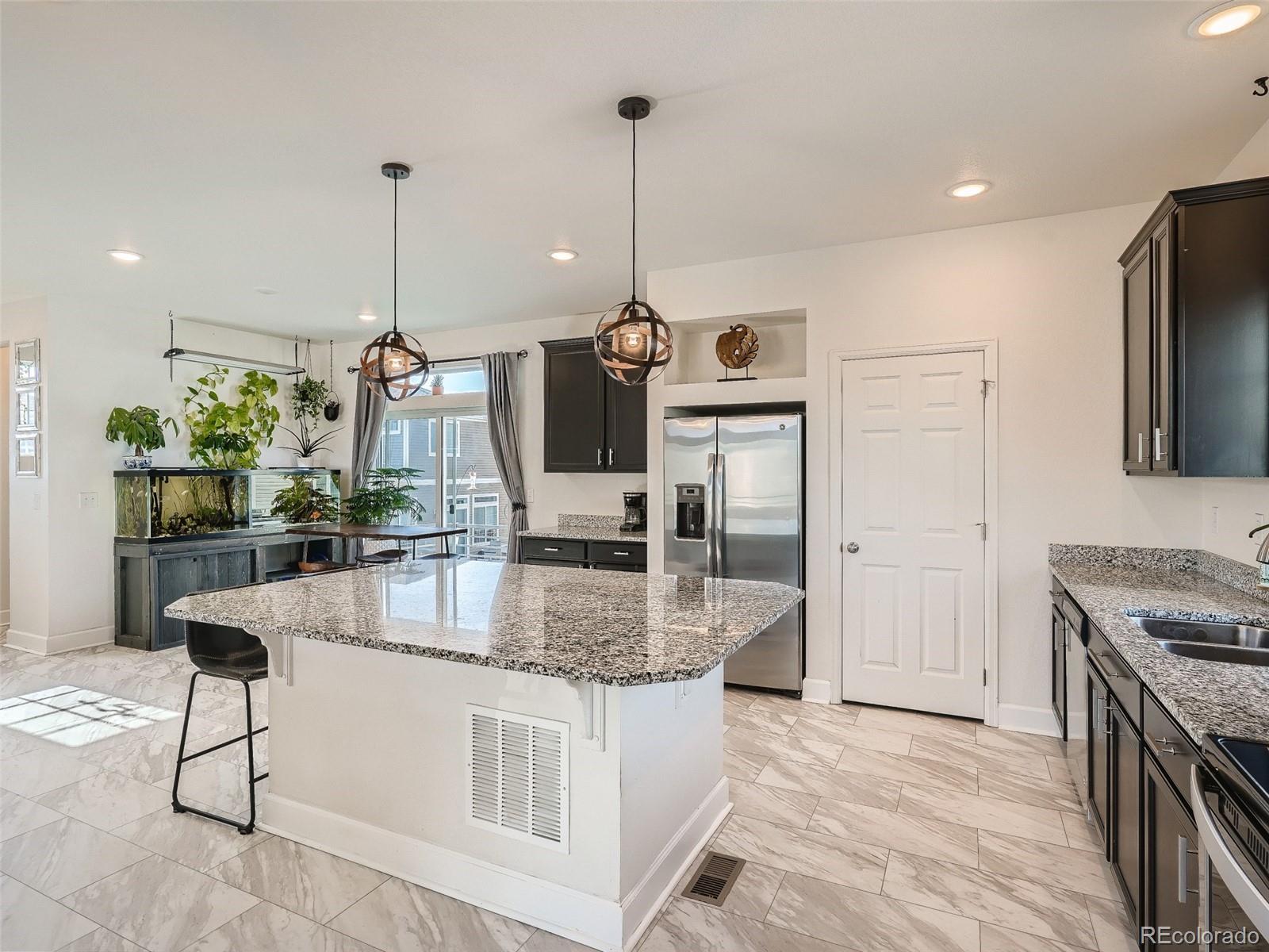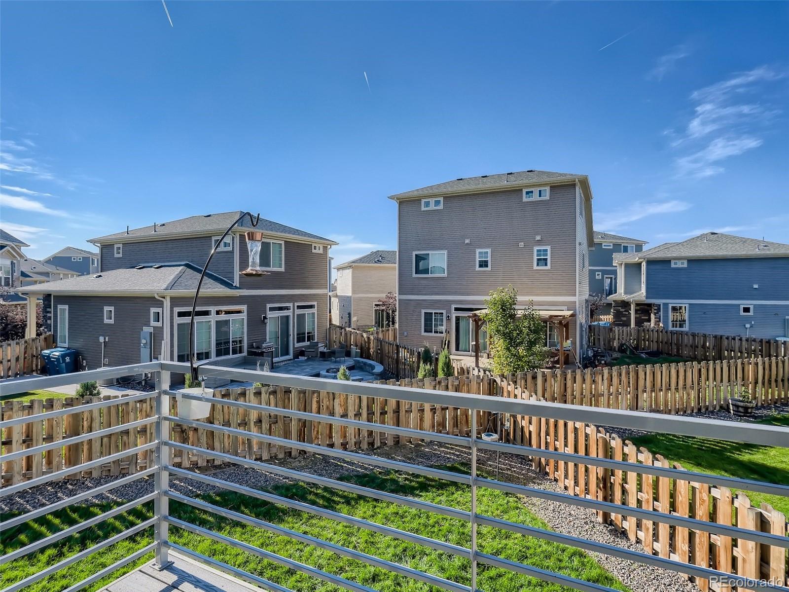 Good vibes all around in this bright, open and airy home! The main floor features an open floor plan with high ceilings, 2 balcony's and loads of natural light. The kitchen is truly the heart of this home with a HUGE kitchen island with plenty of room for 6 stools, coffee bar and pantry. Connected to the kitchen is the dining area with sliding glass doors out to a patio, perfect for grilling. Just on the other side of the kitchen is the living room with custom woodwork and a full wall of sliding glass doors leading out to a large patio ready for all the entertaining! Upstairs you will find a beautiful primary bedroom and en suite bathroom with double vanity, glass enclosed shower and walk in closet. Two more bedrooms, a full bathroom and convenient laundry room round out the top floor of this stunning home. It doesn't stop there, the bright and open basement has plenty of room for a second living area as well as extra flex space and leads right out to the large backyard through sliding glass doors. Many updates throughout including luxury tile floor on the main level, luxury vinyl plank flooring in the basement, custom woodwork features in the living room, brand new carpet upstairs, sliding barn door to primary bath and new sod in the backyard. The Adonea subdivision offers multiple playgrounds (one just a block away), a community center, basketball courts and pool. Close proximity to Buckley Air Force Base. Best price in the neighborhood!