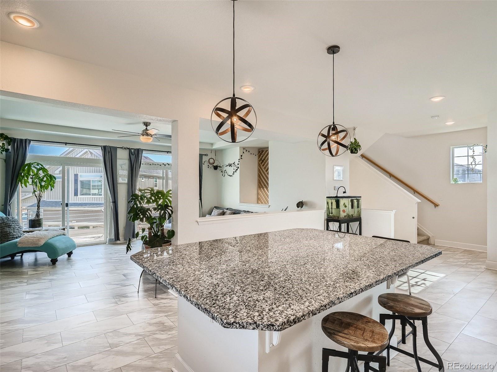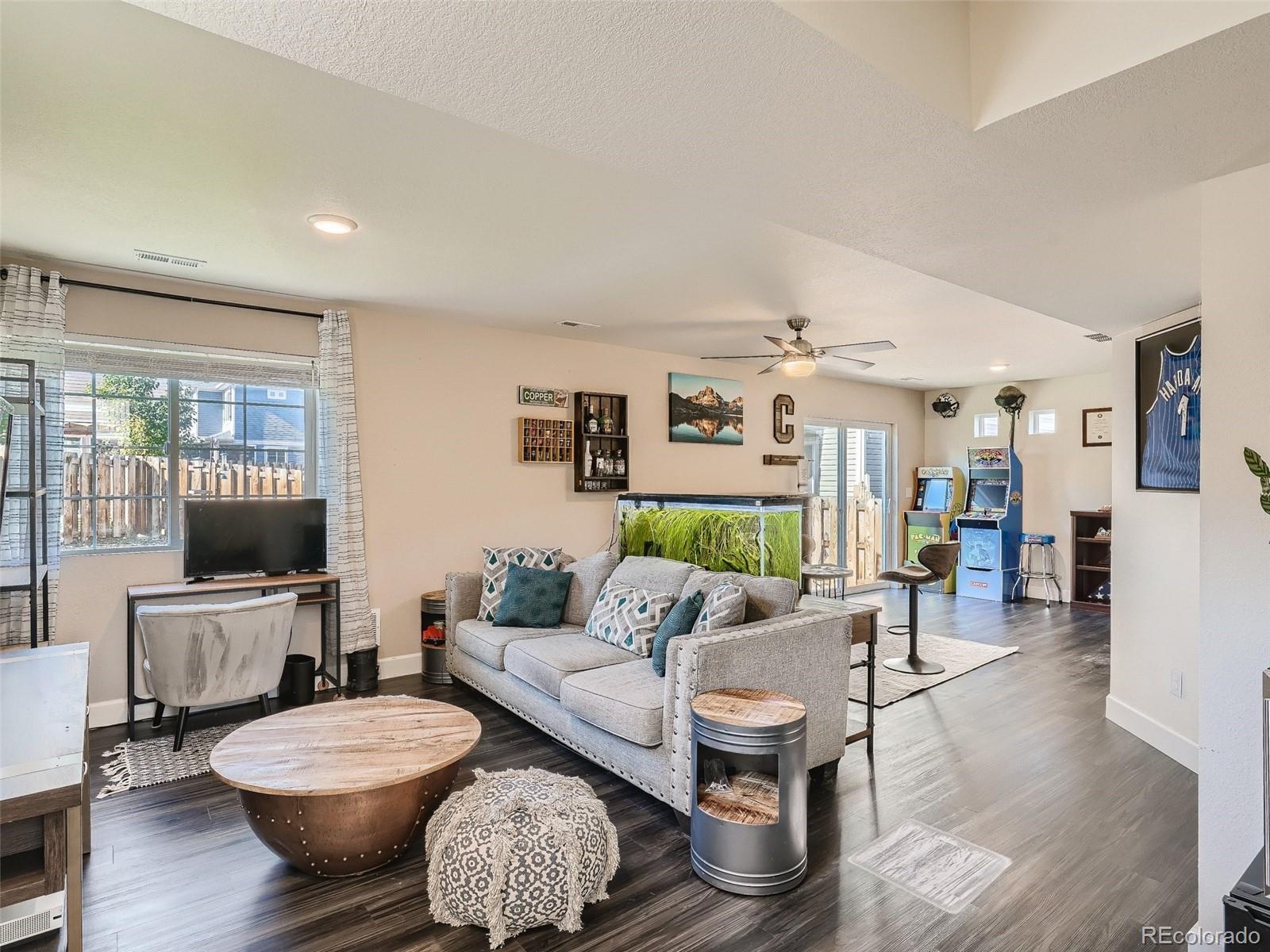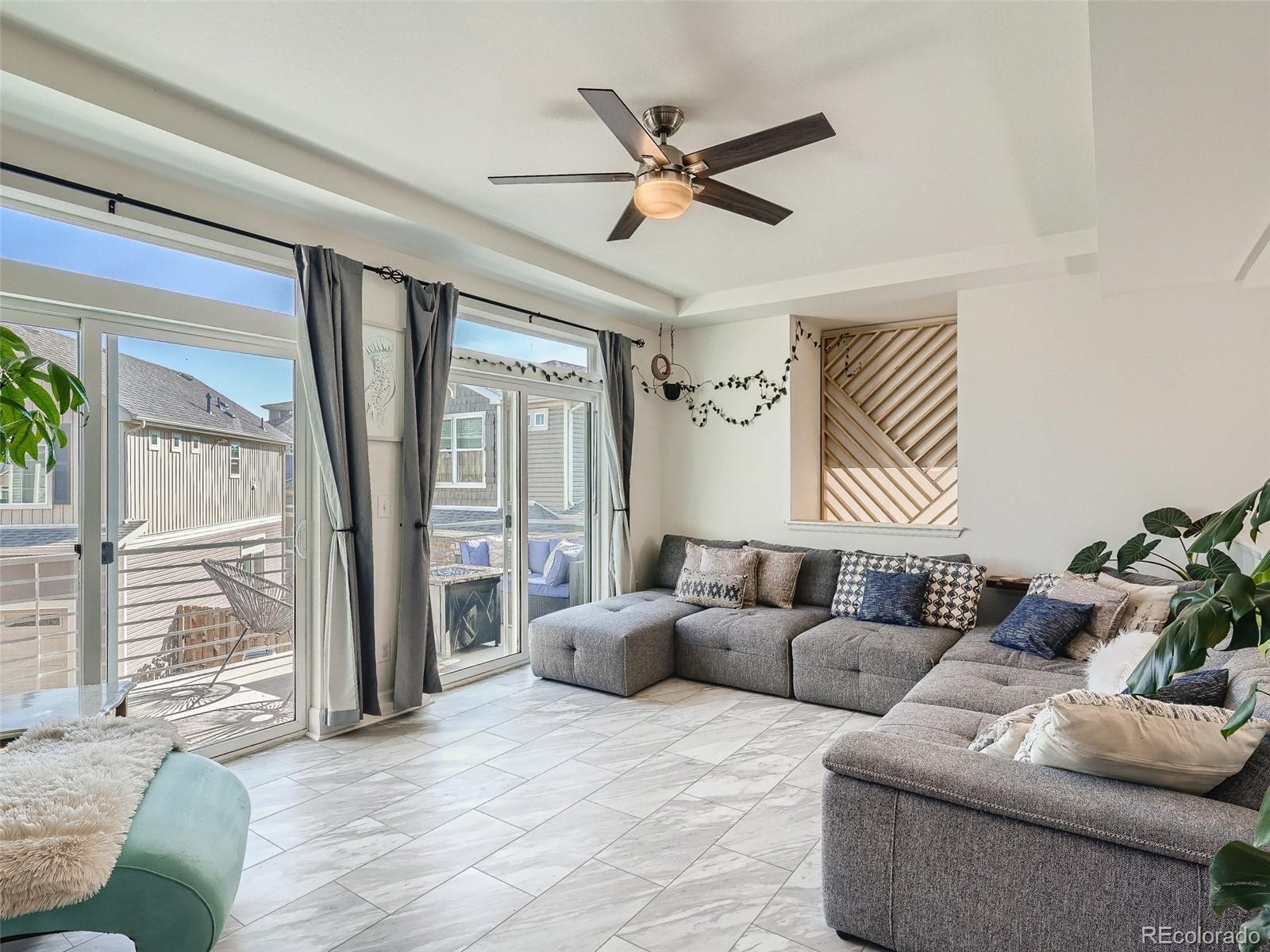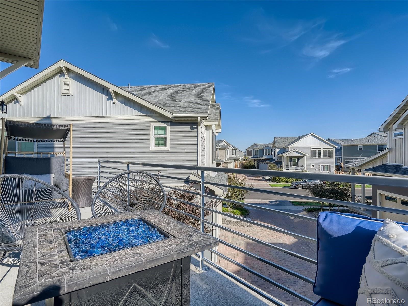 Good vibes all around in this bright, open and airy home! The main floor features an open floor plan with high ceilings, 2 balcony's and loads of natural light. The kitchen is truly the heart of this home with a HUGE kitchen island with plenty of room for 6 stools, coffee bar and pantry. Connected to the kitchen is the dining area with sliding glass doors out to a patio, perfect for grilling. Just on the other side of the kitchen is the living room with custom woodwork and a full wall of sliding glass doors leading out to a large patio ready for all the entertaining! Upstairs you will find a beautiful primary bedroom and en suite bathroom with double vanity, glass enclosed shower and walk in closet. Two more bedrooms, a full bathroom and convenient laundry room round out the top floor of this stunning home. It doesn't stop there, the bright and open basement has plenty of room for a second living area as well as extra flex space and leads right out to the large backyard through sliding glass doors. Many updates throughout including luxury tile floor on the main level, luxury vinyl plank flooring in the basement, custom woodwork features in the living room, brand new carpet upstairs, sliding barn door to primary bath and new sod in the backyard. The Adonea subdivision offers multiple playgrounds (one just a block away), a community center, basketball courts and pool. Close proximity to Buckley Air Force Base. Best price in the neighborhood!