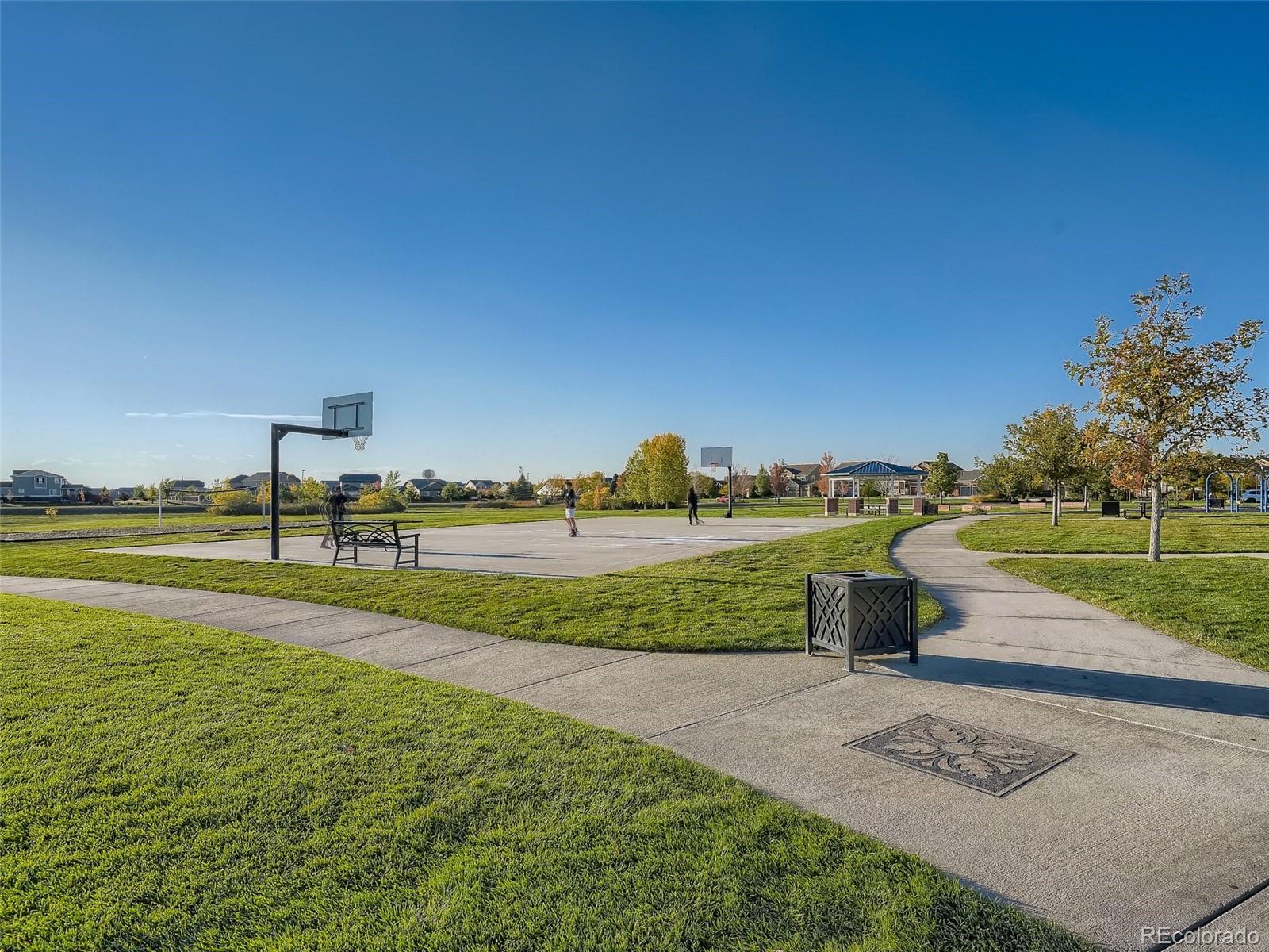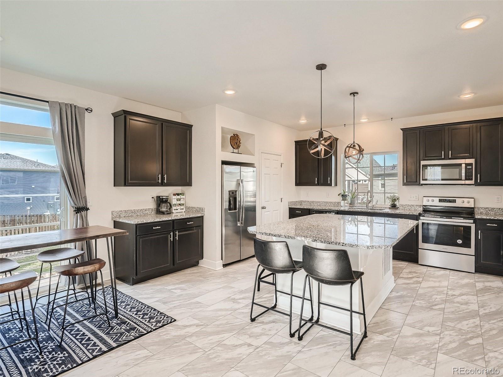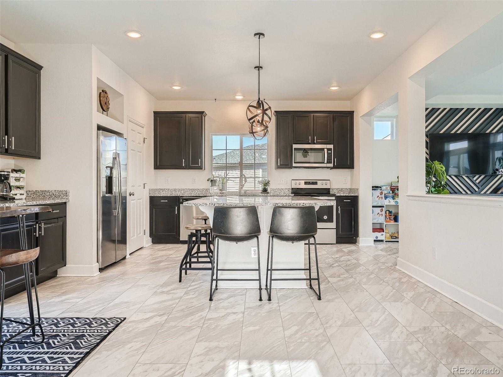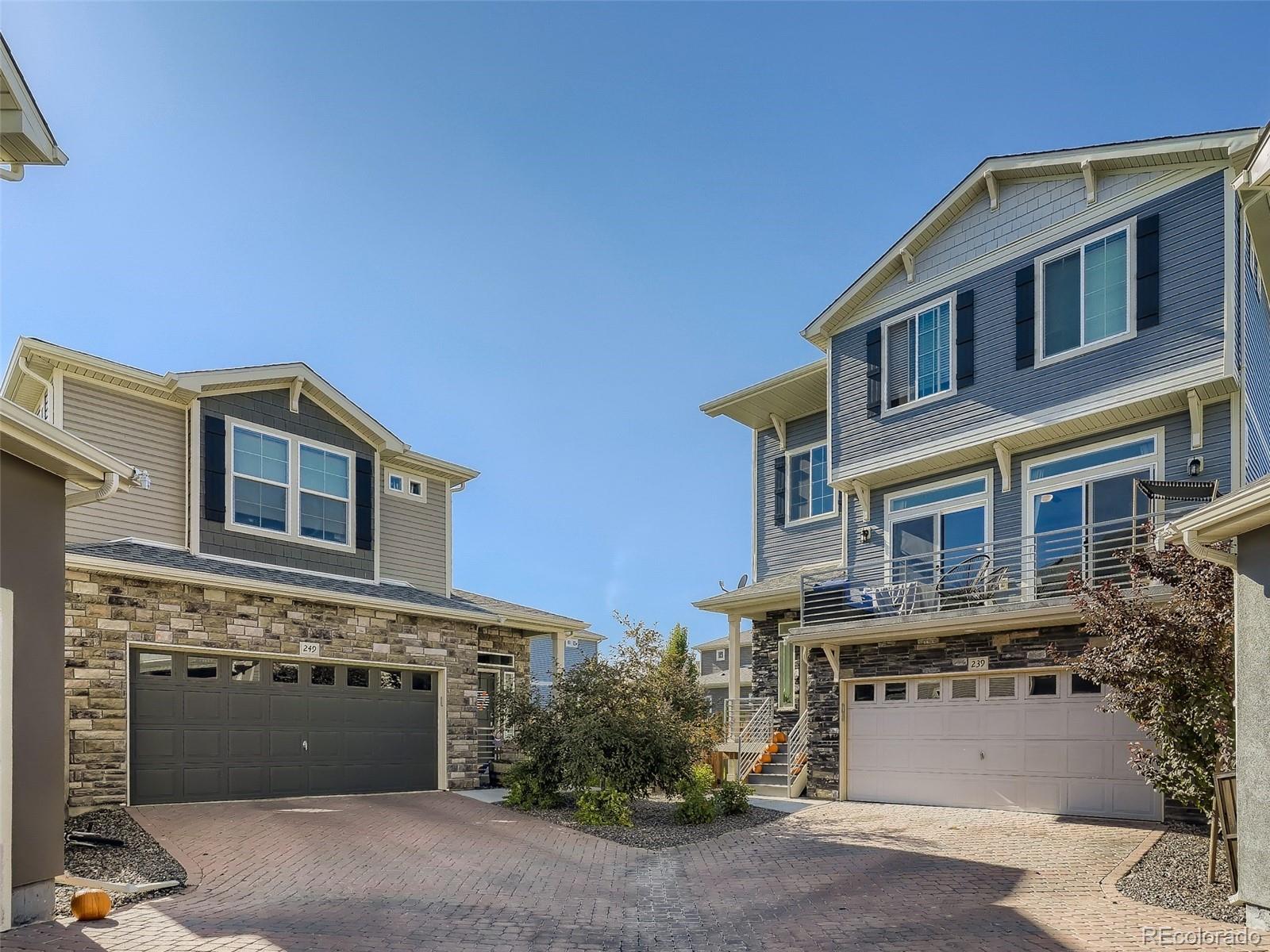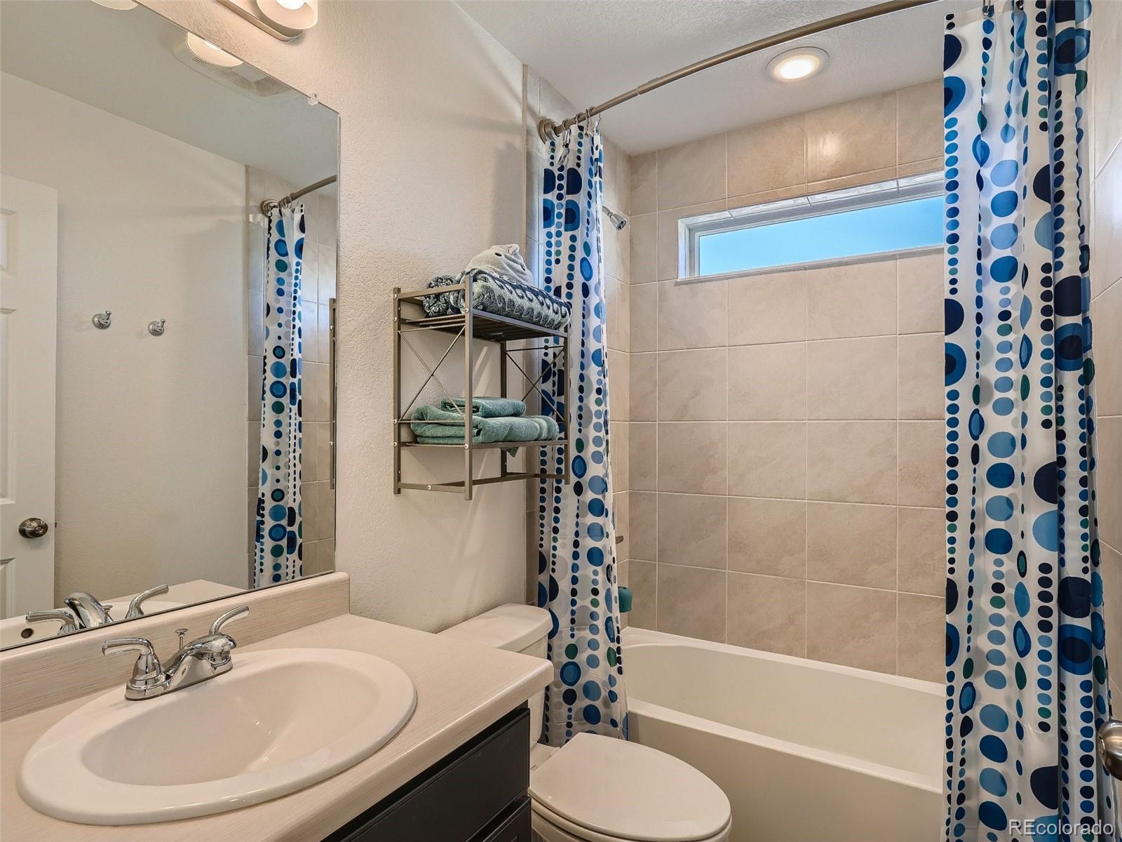 Good vibes all around in this bright, open and airy home! The main floor features an open floor plan with high ceilings, 2 balcony's and loads of natural light. The kitchen is truly the heart of this home with a HUGE kitchen island with plenty of room for 6 stools, coffee bar and pantry. Connected to the kitchen is the dining area with sliding glass doors out to a patio, perfect for grilling. Just on the other side of the kitchen is the living room with custom woodwork and a full wall of sliding glass doors leading out to a large patio ready for all the entertaining! Upstairs you will find a beautiful primary bedroom and en suite bathroom with double vanity, glass enclosed shower and walk in closet. Two more bedrooms, a full bathroom and convenient laundry room round out the top floor of this stunning home. It doesn't stop there, the bright and open basement has plenty of room for a second living area as well as extra flex space and leads right out to the large backyard through sliding glass doors. Many updates throughout including luxury tile floor on the main level, luxury vinyl plank flooring in the basement, custom woodwork features in the living room, brand new carpet upstairs, sliding barn door to primary bath and new sod in the backyard. The Adonea subdivision offers multiple playgrounds (one just a block away), a community center, basketball courts and pool. Close proximity to Buckley Air Force Base. Best price in the neighborhood!