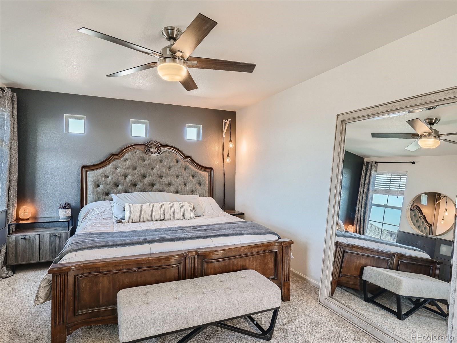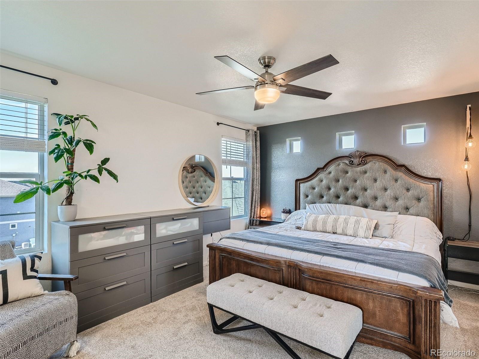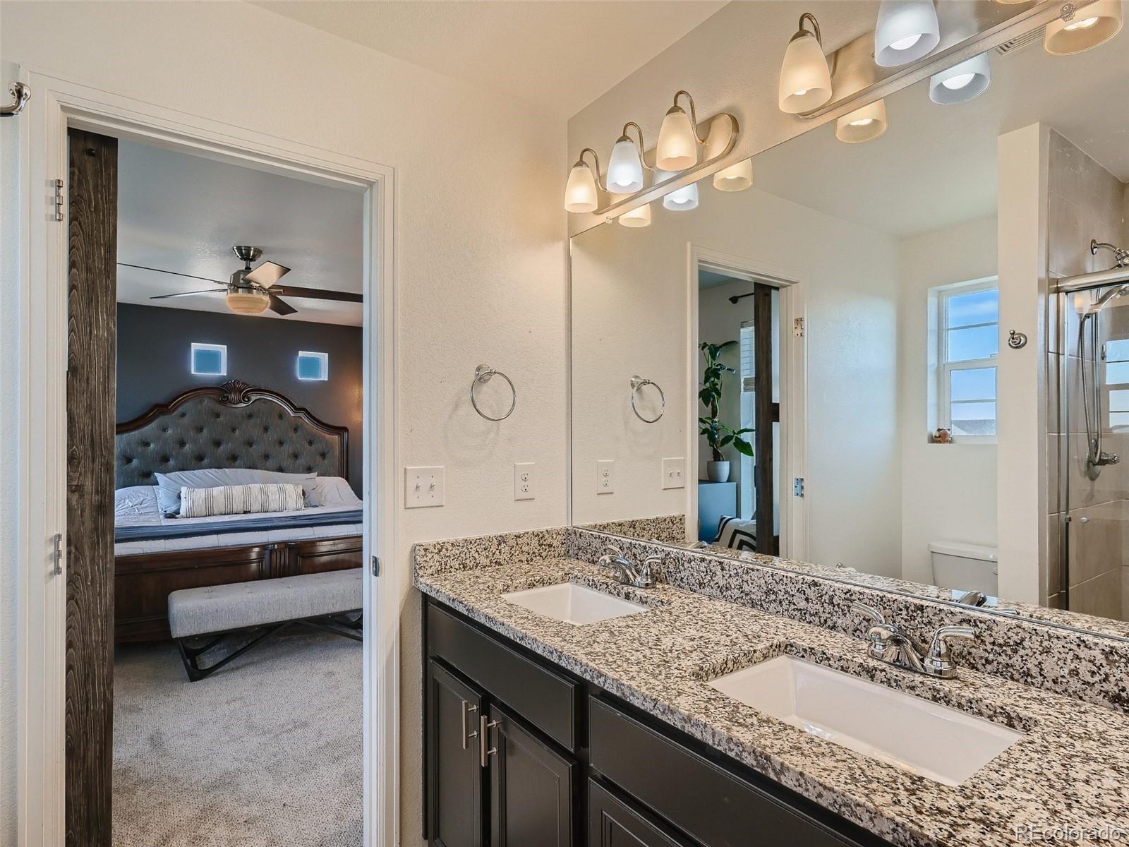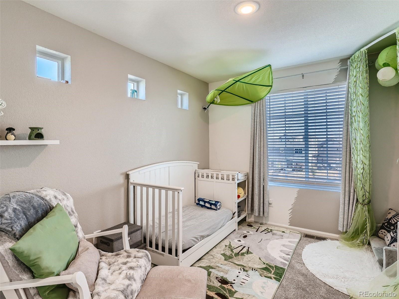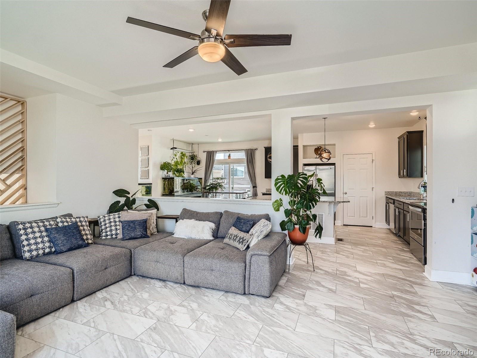 Good vibes all around in this bright, open and airy home! The main floor features an open floor plan with high ceilings, 2 balcony's and loads of natural light. The kitchen is truly the heart of this home with a HUGE kitchen island with plenty of room for 6 stools, coffee bar and pantry. Connected to the kitchen is the dining area with sliding glass doors out to a patio, perfect for grilling. Just on the other side of the kitchen is the living room with custom woodwork and a full wall of sliding glass doors leading out to a large patio ready for all the entertaining! Upstairs you will find a beautiful primary bedroom and en suite bathroom with double vanity, glass enclosed shower and walk in closet. Two more bedrooms, a full bathroom and convenient laundry room round out the top floor of this stunning home. It doesn't stop there, the bright and open basement has plenty of room for a second living area as well as extra flex space and leads right out to the large backyard through sliding glass doors. Many updates throughout including luxury tile floor on the main level, luxury vinyl plank flooring in the basement, custom woodwork features in the living room, brand new carpet upstairs, sliding barn door to primary bath and new sod in the backyard. The Adonea subdivision offers multiple playgrounds (one just a block away), a community center, basketball courts and pool. Close proximity to Buckley Air Force Base. Best price in the neighborhood!