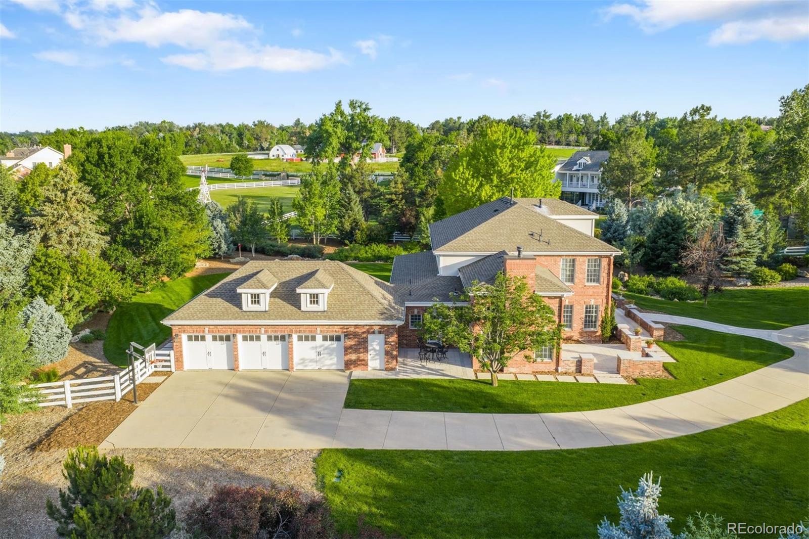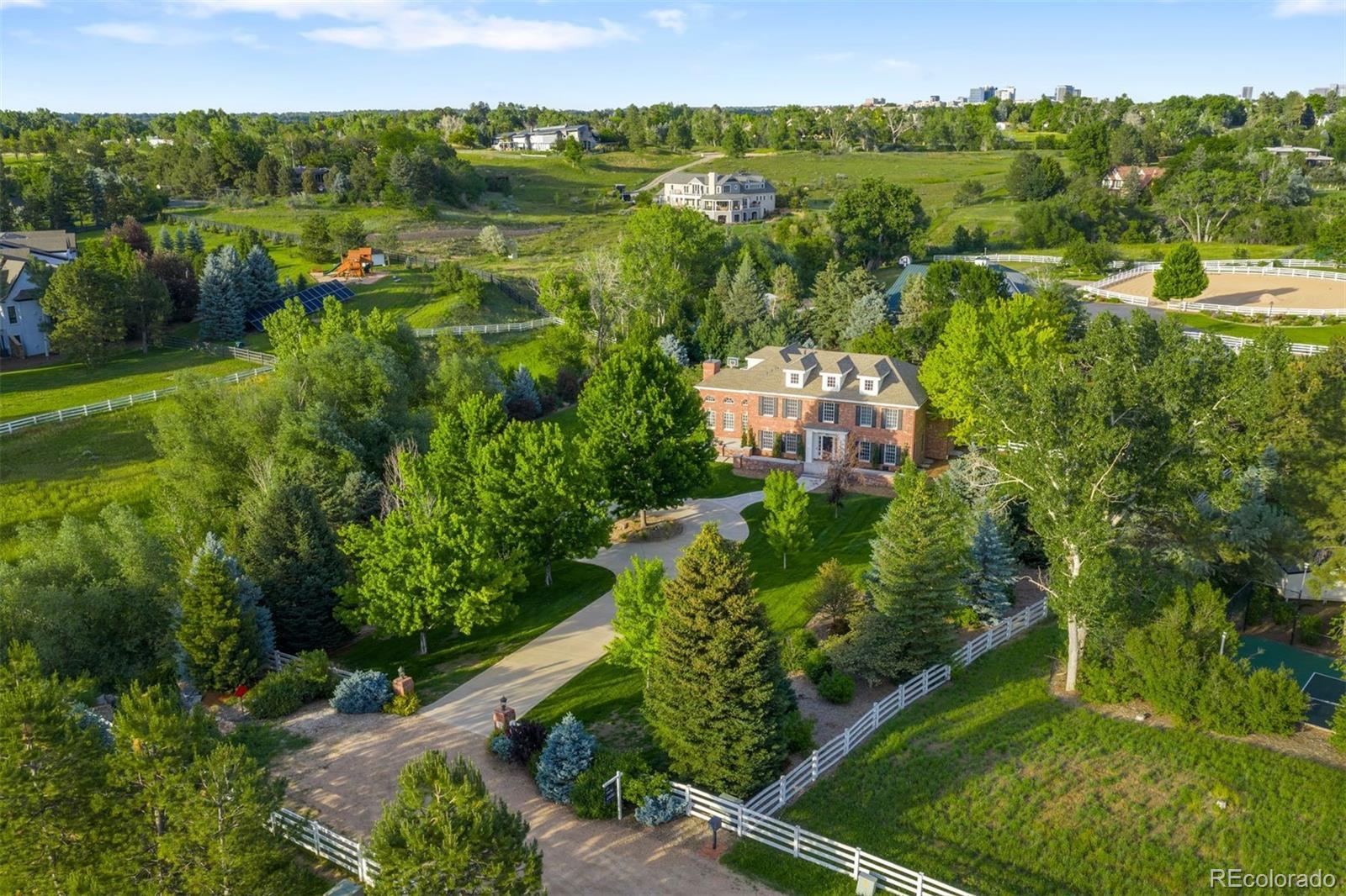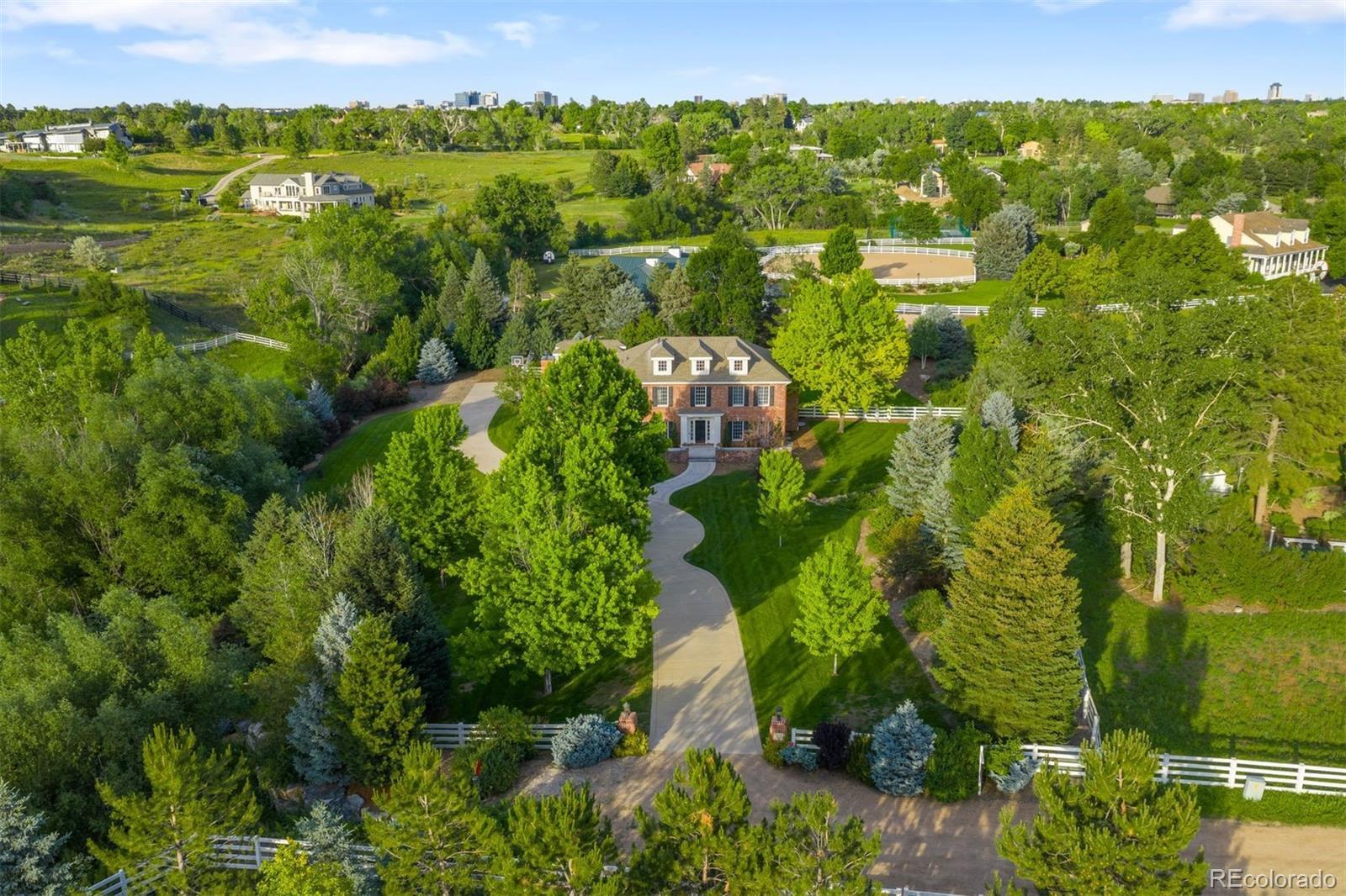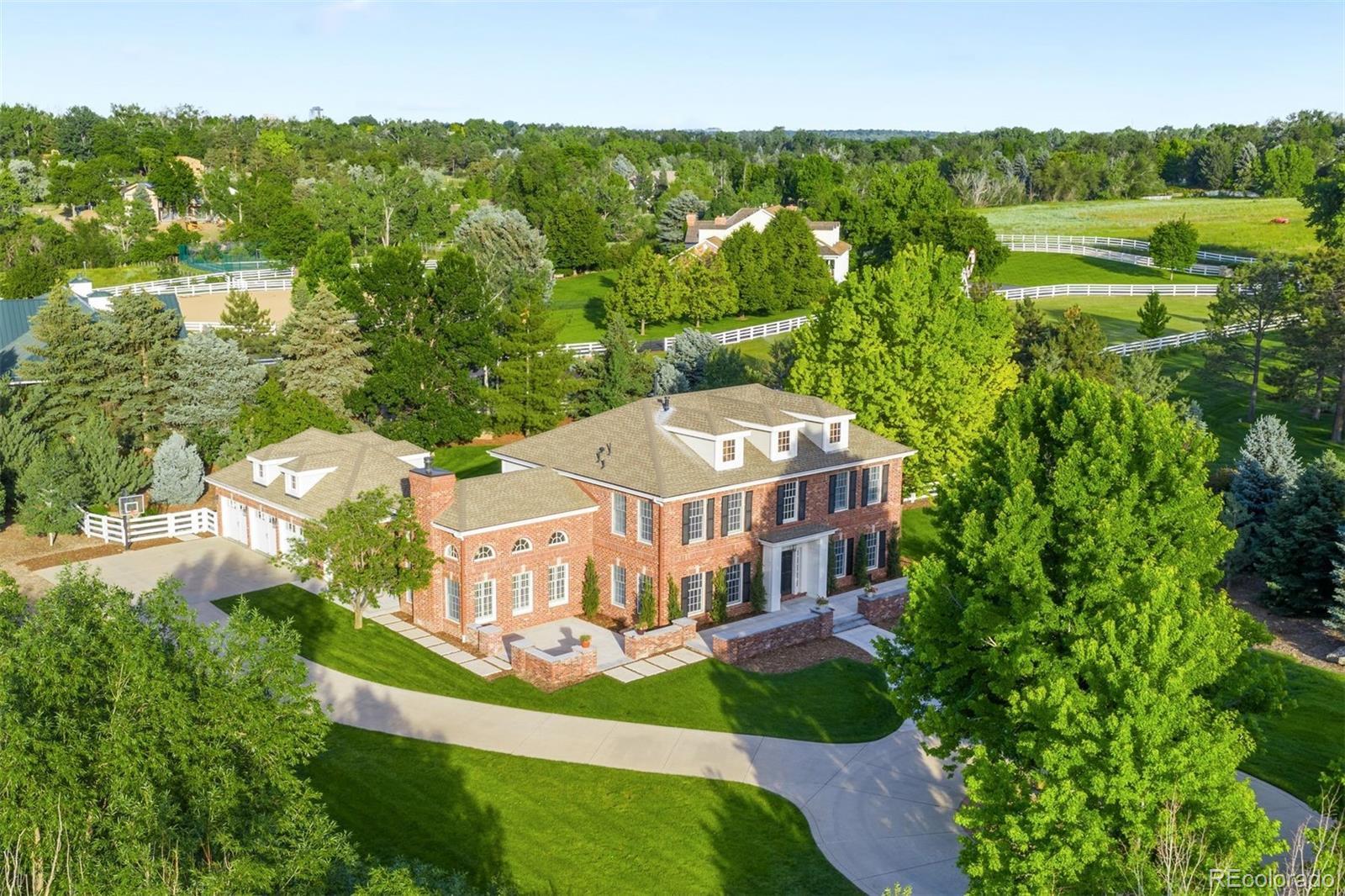Set on a secluded 2.32-acre lot in the heart of Greenwood Village, this refined Kentucky-farmhouse estate offers quiet elegance, functional design, and rare outdoor serenity. Nestled at the end of a private road and framed by mature trees, Little Dry Creek, and neighboring equestrian properties, this residence invites a sense of retreat without sacrificing proximity to DTC, Cherry Creek, or the High Line Canal. Timeless architecture reveals itself immediately in the grand foyer, where arched doorways, hardwood floors, and classic crown molding set a sophisticated tone. The formal living and dining rooms provide ideal settings for entertaining, while the chef’s kitchen is outfitted with quartzite counters, high-end appliances, and a generous eat-in area for everyday gathering. The adjoining family room features soaring ceilings, a gas fireplace, and natural flagstone floors bathed in light -- an inviting space with a strong connection to the outdoors. A main-level primary suite offers sanctuary, complete with luxurious finishes and private views. The study, with custom built-ins, is thoughtfully placed for remote work or quiet reflection. Upstairs, four bedrooms paired by Jack-and-Jill baths alongside a large recreational room offer both space and flexibility. A spacious mudroom and 3-car garage enhance day-to-day functionality. Step outside to discover expansive lawns, all new hardscaping, and a covered patio perfect for peaceful mornings or evenings with friends. With privacy, beauty, and balance, this home represents a rare opportunity to experience country-style living within reach of Denver’s most dynamic amenities.