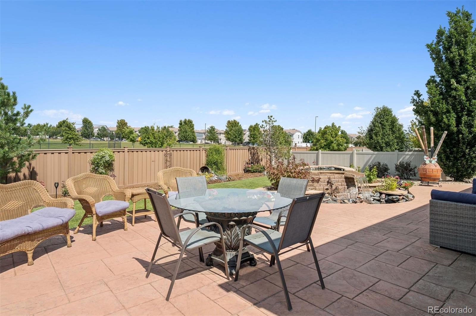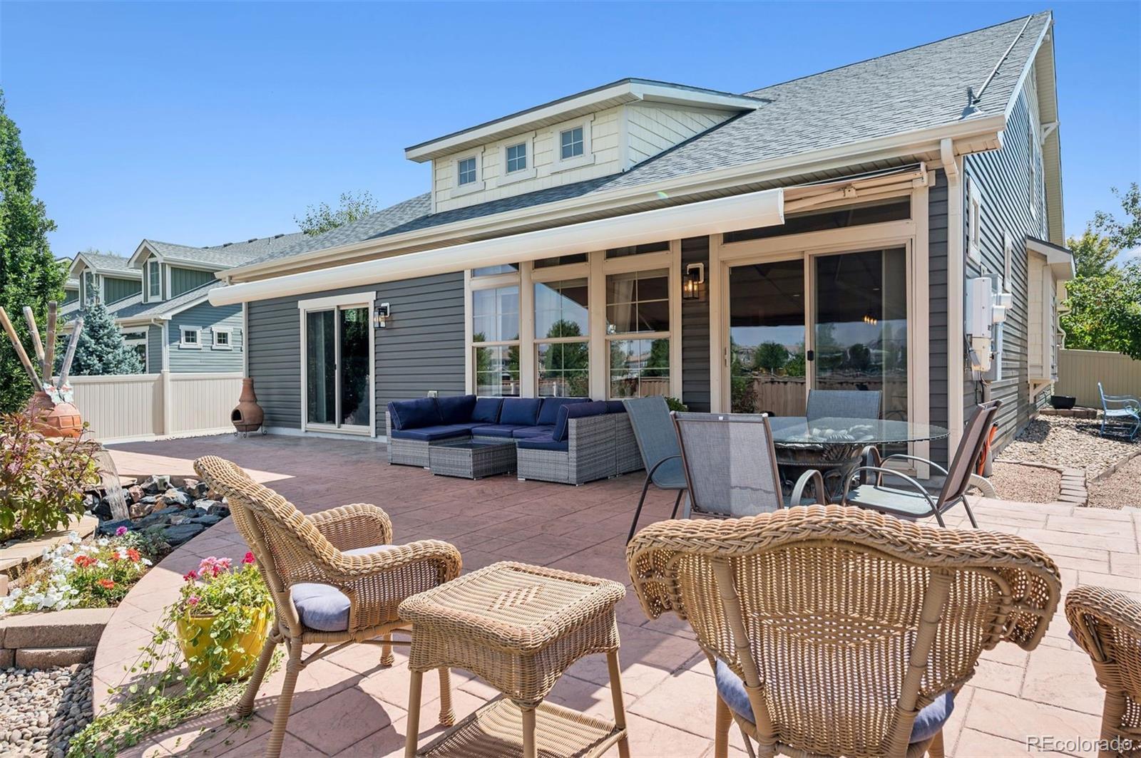 This spectacular home located in the Exclusive 55+ Fairway Villas is meticulously maintained with main floor living and an additional upper level. An Open Concept floor plan flows nicely from the foyer to the rear patio, conveniently combining the Kitchen, Dining area, and Family room, for everyday living and entertaining. The Kitchen is a cook’s dream with high attention to detail and an Island of substantial size including storage - perfect for baking or entertaining. The Kitchen includes exceptional stainless appliances, beautiful warm wood cabinetry, lovely double sink, pantry, and room for everyone. The dining area is centrally located and eases into the spacious family room filled with natural light, views of the rear yard and access to the immense rear patio. The generously sized Primary Bedroom is located off of the family room and features a reading nook, fantastic Spa-like bath, spacious walk-in closet, and access to the rear patio/yard. A huge shower highlights the Primary Bath! Also on the main floor are a Second bedroom, a full bath, and a Laundry room containing cabinetry and a separate storage area. Additionally, there is an upper level with a roomy loft and Third bedroom with an ensuite full sized bath. The spacious 3 car garage has epoxy flooring and storage. Professional landscaping provides amazing curb appeal and an oasis-like rear yard and low-maintenance beauty. There are two outdoor living spaces with a covered front patio and an expansive rear patio. The rear yard has an attractive and calming water feature, turf, serene side yard, concrete sidewalk for easy/safe access, storage shed, and an electric retractable awning offering extra shade, full privacy fence w/gate. Solar power keeps year round electricity costs low. Located close to everything and in a metro district w/ No separate Hoa fee. The community supplies access to the clubhouse, fitness center, pools, golf course, shared garden, extensive walking/biking paths, parks and more.