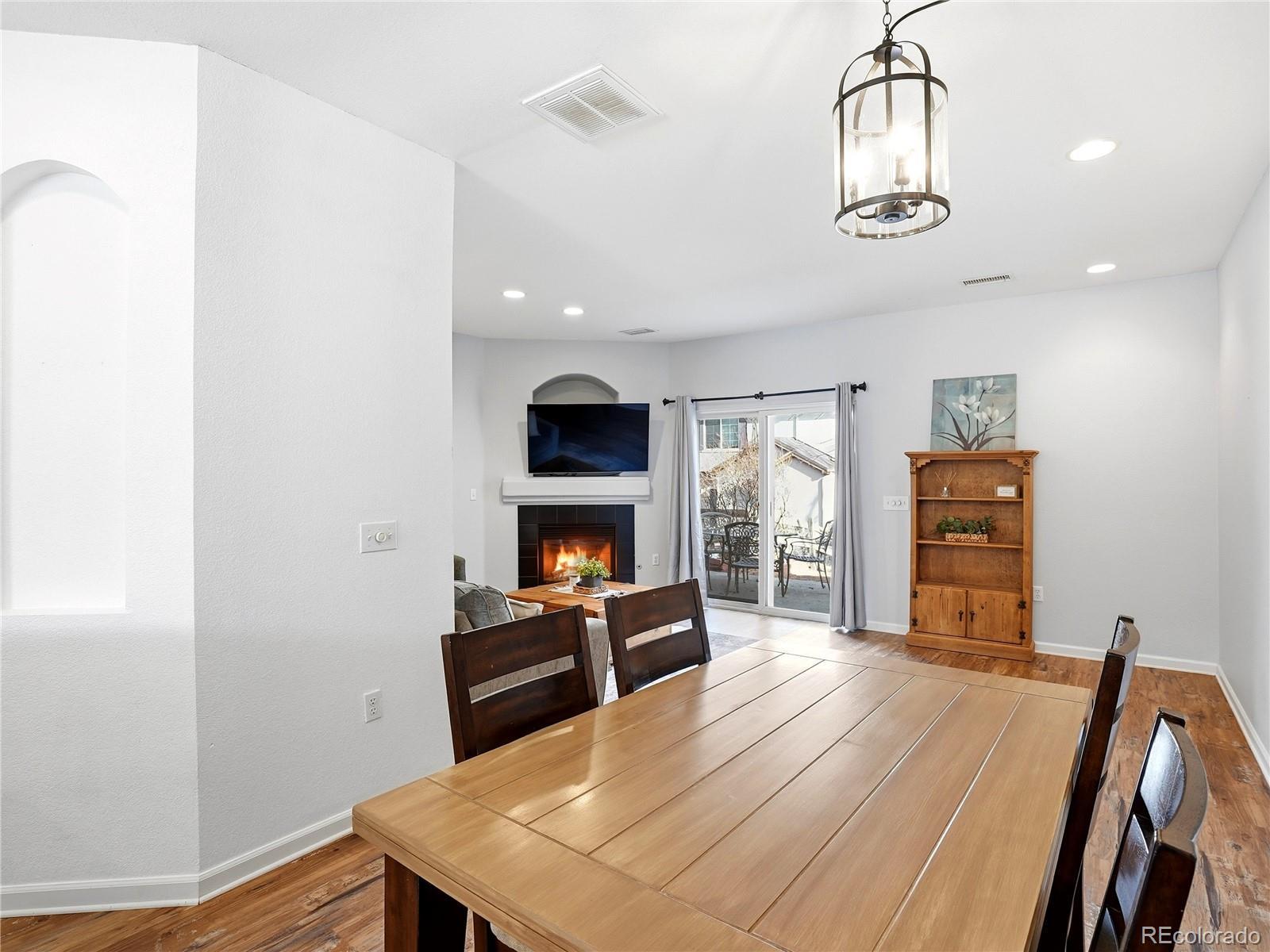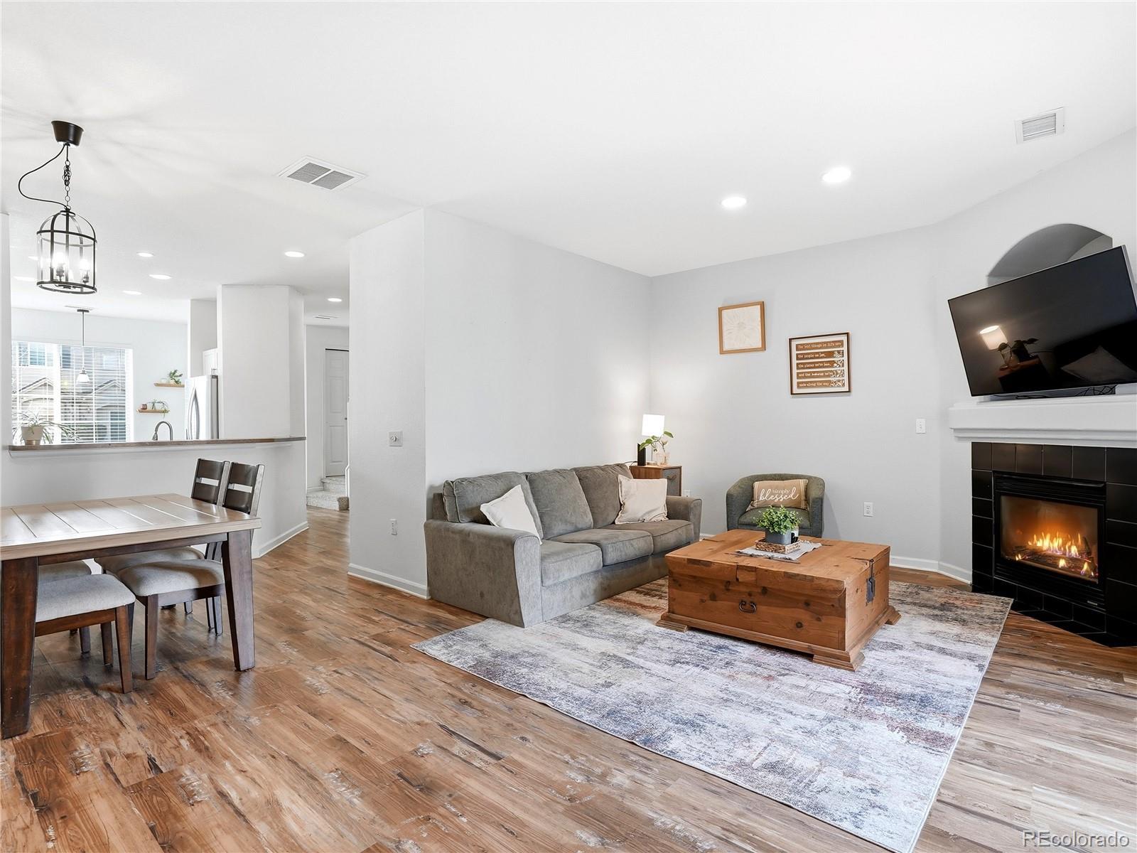This two-story townhome offers a comfortable, well-designed layout with practical updates and spaces that feel easy to live in—without the need for major projects. The main level brings together the kitchen, dining area, and living room in a connected but clearly defined arrangement that works naturally for everyday routines. The kitchen sits at the front of the home and features white cabinetry, stainless steel appliances including a newer dishwasher, built-in microwave, and full-size refrigerator, along with pantry storage, ample counter space, and a raised bar for casual seating. Updated flooring runs throughout the main level, and a conveniently located half bath sits just off the living area. From the kitchen, the space flows directly into the living room, where a gas fireplace and recessed lighting anchor the room and create a comfortable place to unwind. Sliding glass doors bring in natural light and open to the fenced backyard, making indoor and outdoor use feel seamless. Upstairs, all bedrooms are located on one level along with the laundry and a linen closet. The primary bedroom feels open and inviting with vaulted ceilings, a decorative chandelier, a large walk-in closet, and an en-suite bathroom. The bathroom also offers hallway access, allowing it to conveniently serve the additional bedrooms. Outside, the fenced backyard includes a concrete patio with space for seating, grilling, or easy get-togethers, along with room for light gardening. An attached enclosed storage area provides useful space for bikes, tools, and seasonal items. Two reserved parking spaces are located directly in front of the home.