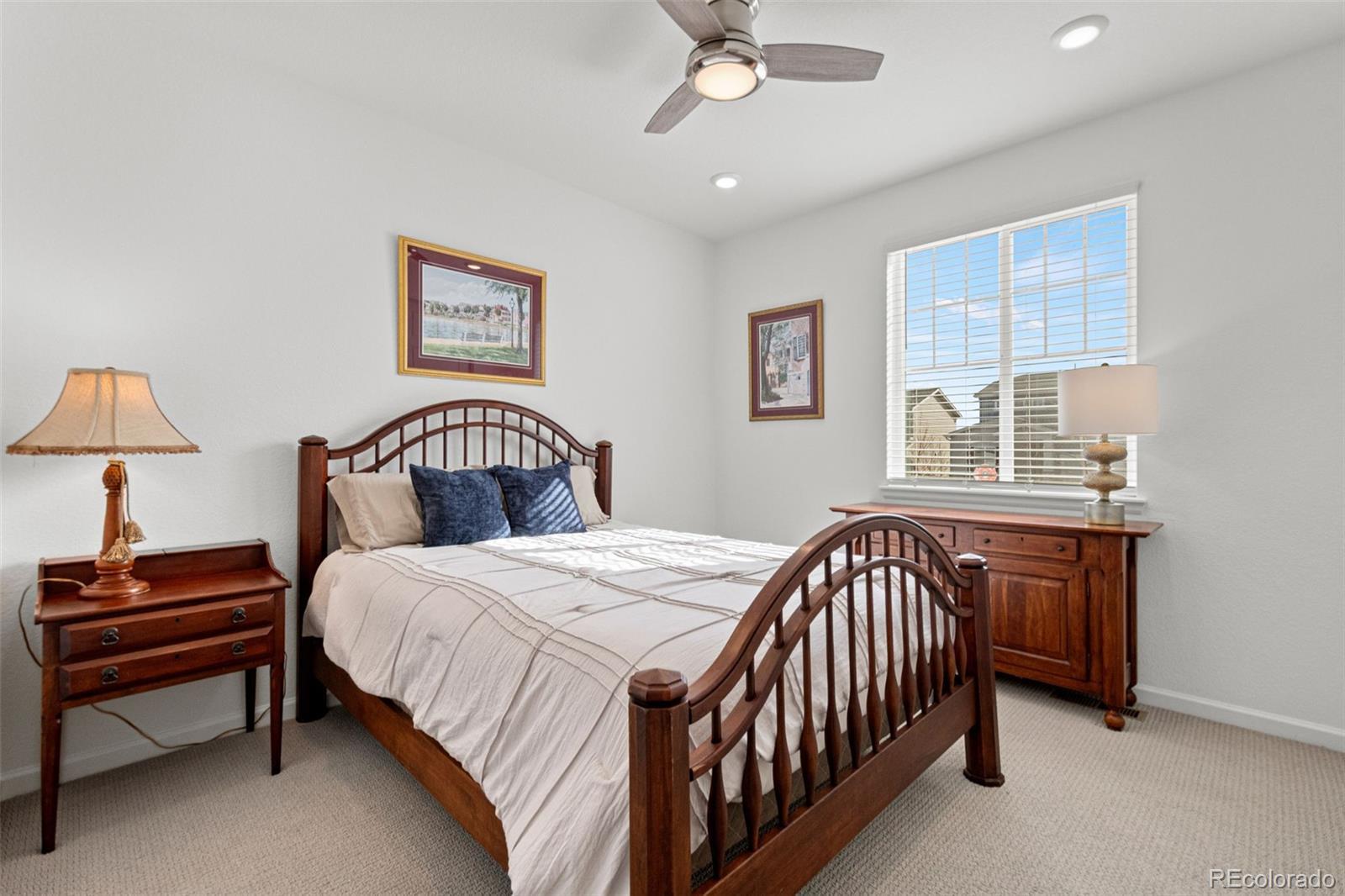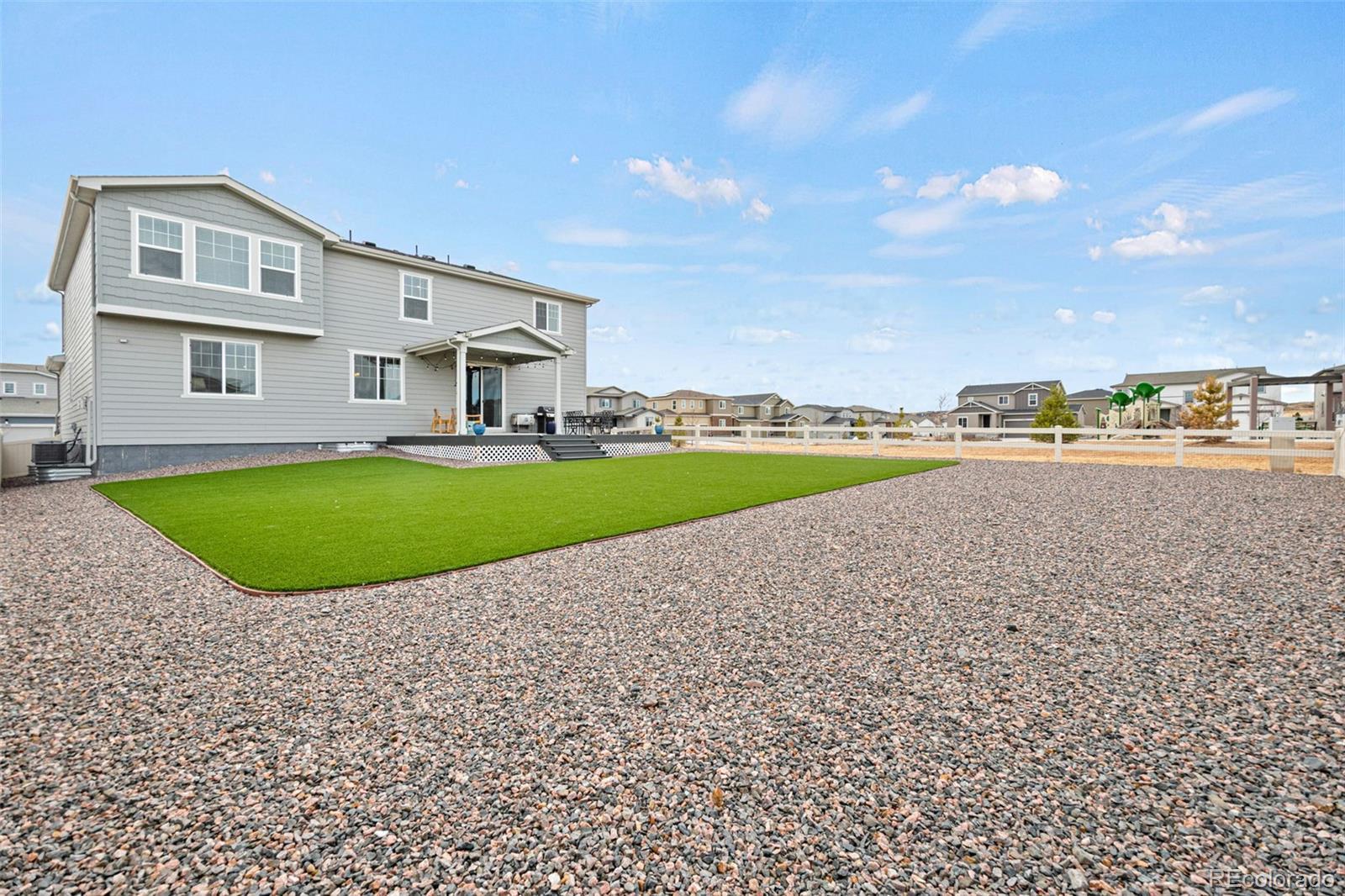 Welcome to this 5-bedroom, 4-bathroom home in Parker, located in the sought-after Anthology North community. This stunning 2-story home offers an inviting, bright, open floorplan and is move-in ready. The main floor features an abundance of natural light, a living room with a gas fireplace featuring a tile surround, and a spacious eat-in kitchen with a large center island, stainless steel appliances, quartz countertops, gas stove, tile backsplash, and walk-in pantry. The kitchen opens directly to the extended covered patio, making it ideal for indoor-outdoor entertaining. The dining room is open to and adjacent to the kitchen, creating a seamless and functional layout. Also on the main level is a guest bedroom and private office, both served by a convenient 3/4 bathroom with a walk-in shower, perfect for guests and everyday use. The upper level includes four bedrooms located on one level, including the primary suite with a 5-piece bath and walk-in closet. Two bedrooms share a Jack-and-Jill bathroom, while a separate 3/4 bath serves the loft and adjacent bedroom. The large laundry room is also on this floor and includes cabinetry and a utility sink. The unfinished basement is plumbed for a future bathroom and ready for customization. Recent improvements and features include a fully fenced and landscaped backyard, extended covered patio with composite decking, professionally installed turf for low-maintenance living, new carpet throughout the upstairs, ceiling fans, and window blinds throughout the home. Located in Anthology North, this home offers a balance of privacy, open space, and connection. With a neighborhood park just steps away, scenic trails, community activities, a community pool and clubhouse, and convenient access to shopping, dining, and everyday amenities, this location delivers an exceptional Parker lifestyle. Don’t miss this amazing opportunity to own a “LIKE NEW” home without the long wait and frustrations of a new build.