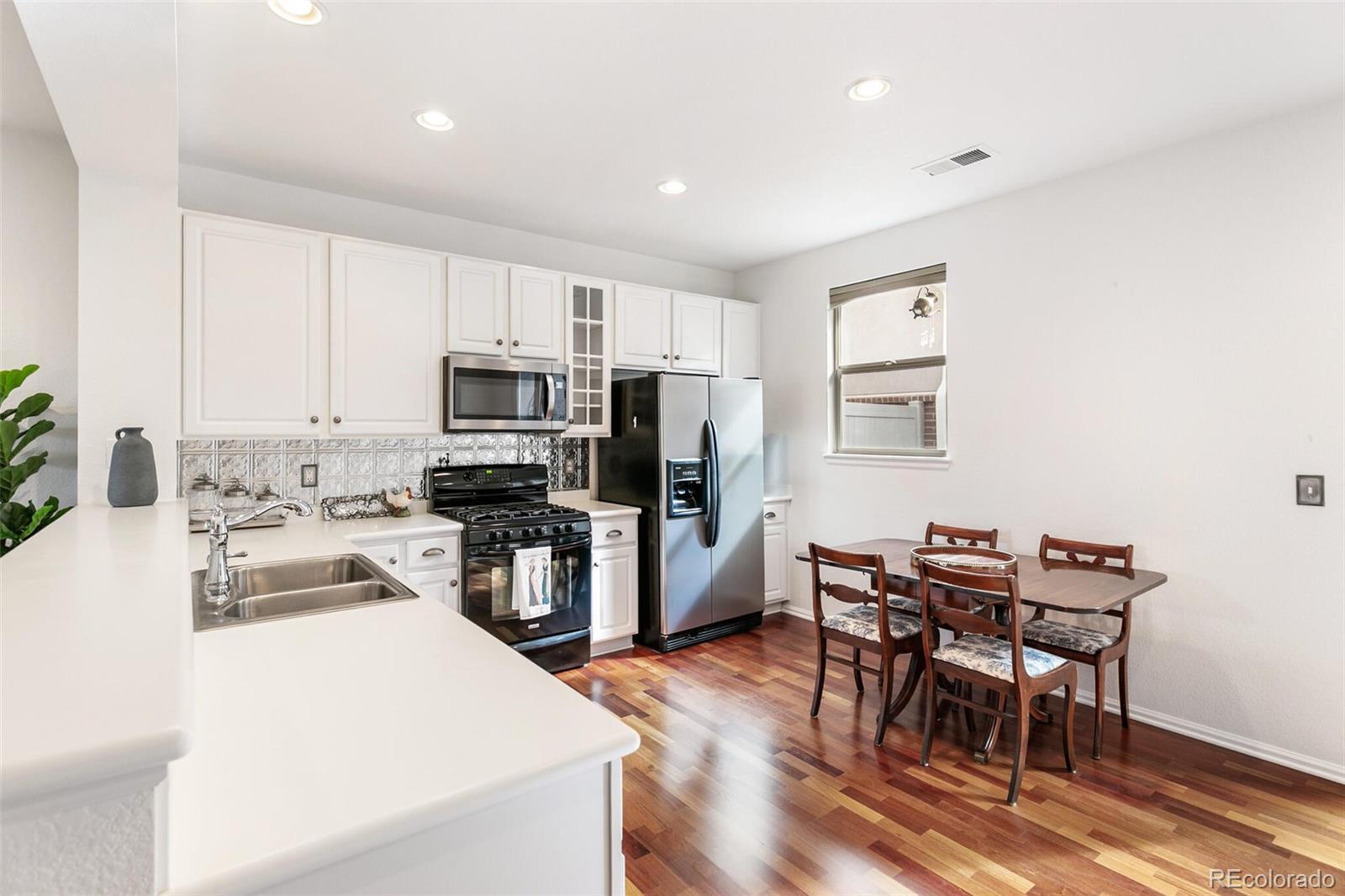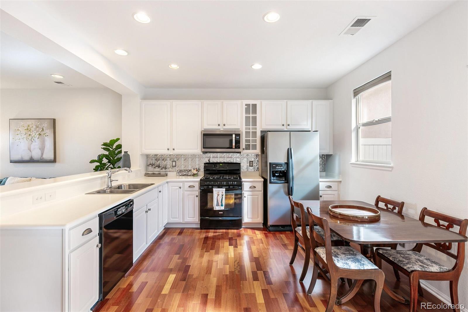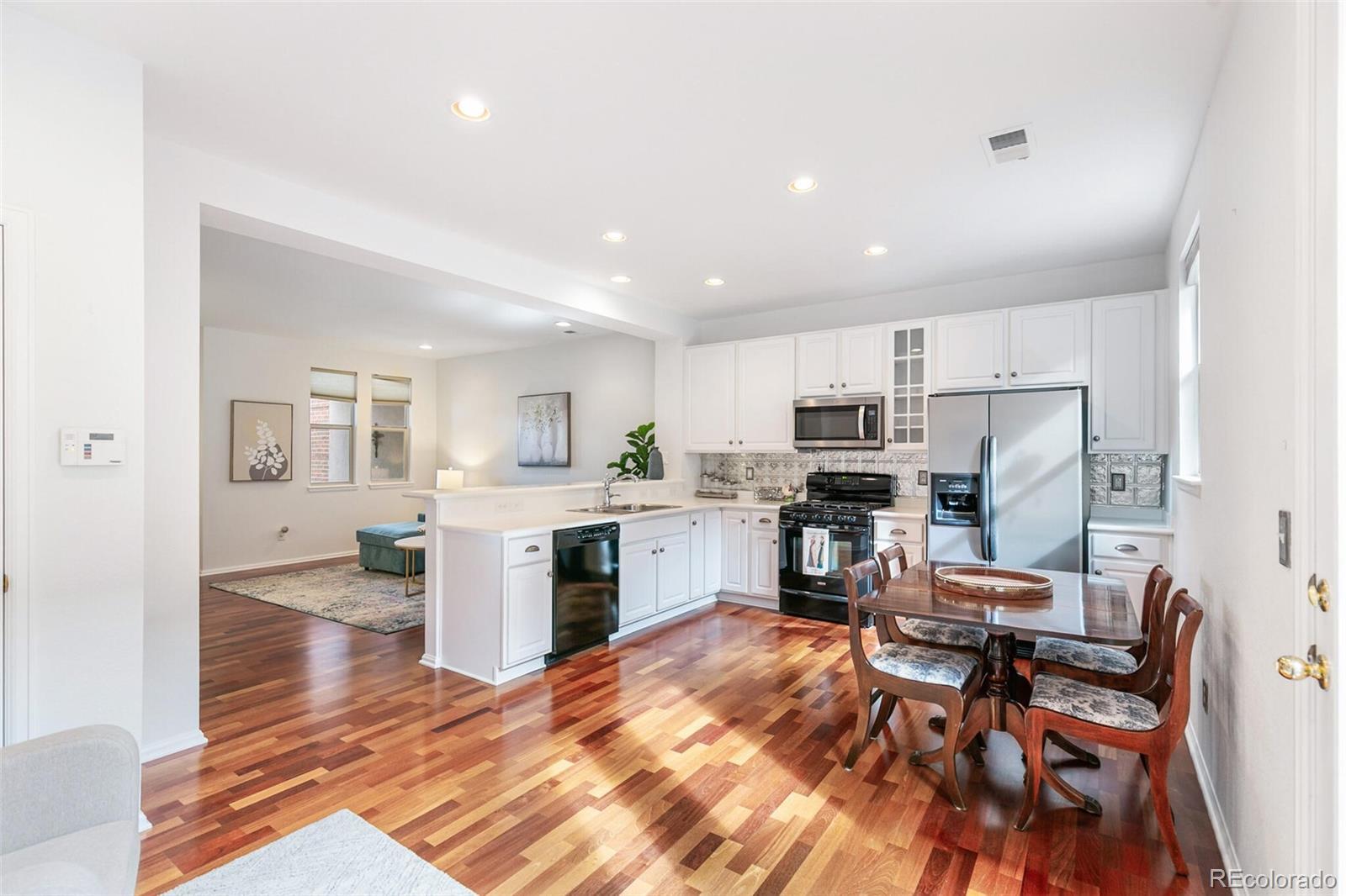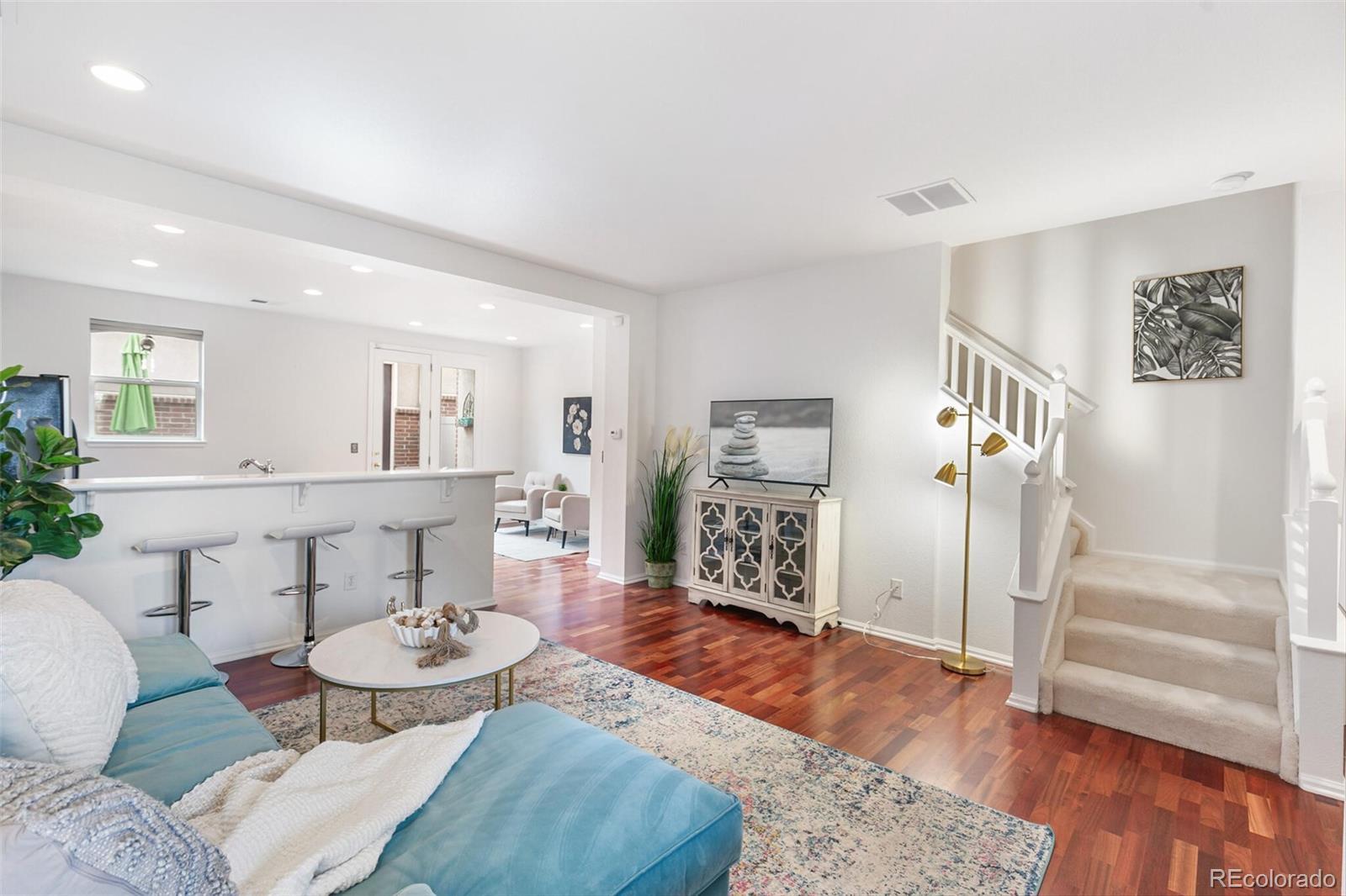 Chic contemporary townhome in a super convenient location! Brownstone vibes and fantastic curb appeal welcome you with steps up to a wide covered front porch. Step inside to an open and inviting living space that flows into the large kitchen, perfect for day-to-day life and entertaining friends and family! Quality far surpasses new construction—cherry hardwood floors and a spacious floorplan not seen in new builds! Fresh white paint throughout, nothing to do here but move in! Kitchen is efficient with tons of counterspace and storage, plus an eat-in bar and space for your kitchen table, and plenty of room to lounge! Step out the back door from the kitchen for another year-round usable outdoor space with southern exposure and space to grill and chill. Main floor powder room for added convenience. Upstairs, you will find 3 bedrooms, 2 full bathrooms, and a laundry closet. The primary suite is spacious with a walk-in closet, Juliet balcony, and en-suite full bathroom. Each bedroom is nicely sized with good closet space. Laundry closet with included washer and dryer upstairs. LARGE 2-car detached garage with alley—room to back out of your garage! Fantastic location with walkability to Centennial Center Park and many conveniences. Coffee shops, restaurants, retail, and gyms abound within a 1-mile radius. Cherry Creek Park to the north has endless opportunities to enjoy the Colorado outdoors with trails, vistas, and an off-leash dog park. Quick 10-minute commute to the Denver Tech Center! Highly desirable Cherry Creek Schools. Make this one yours today!