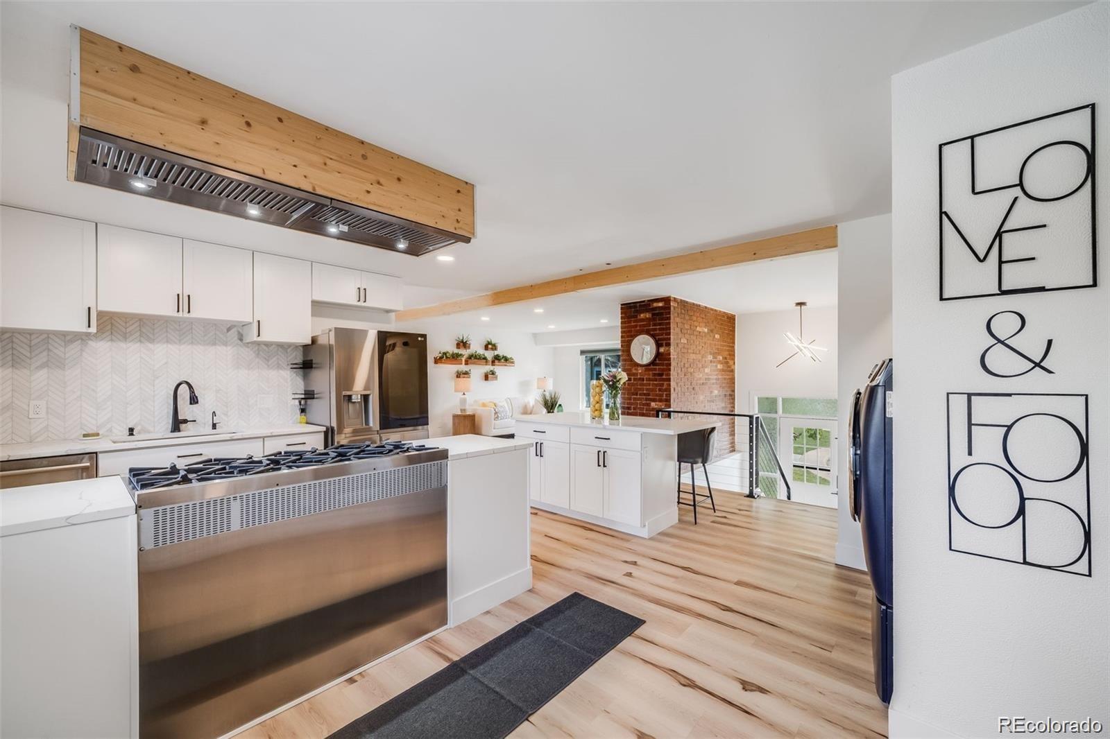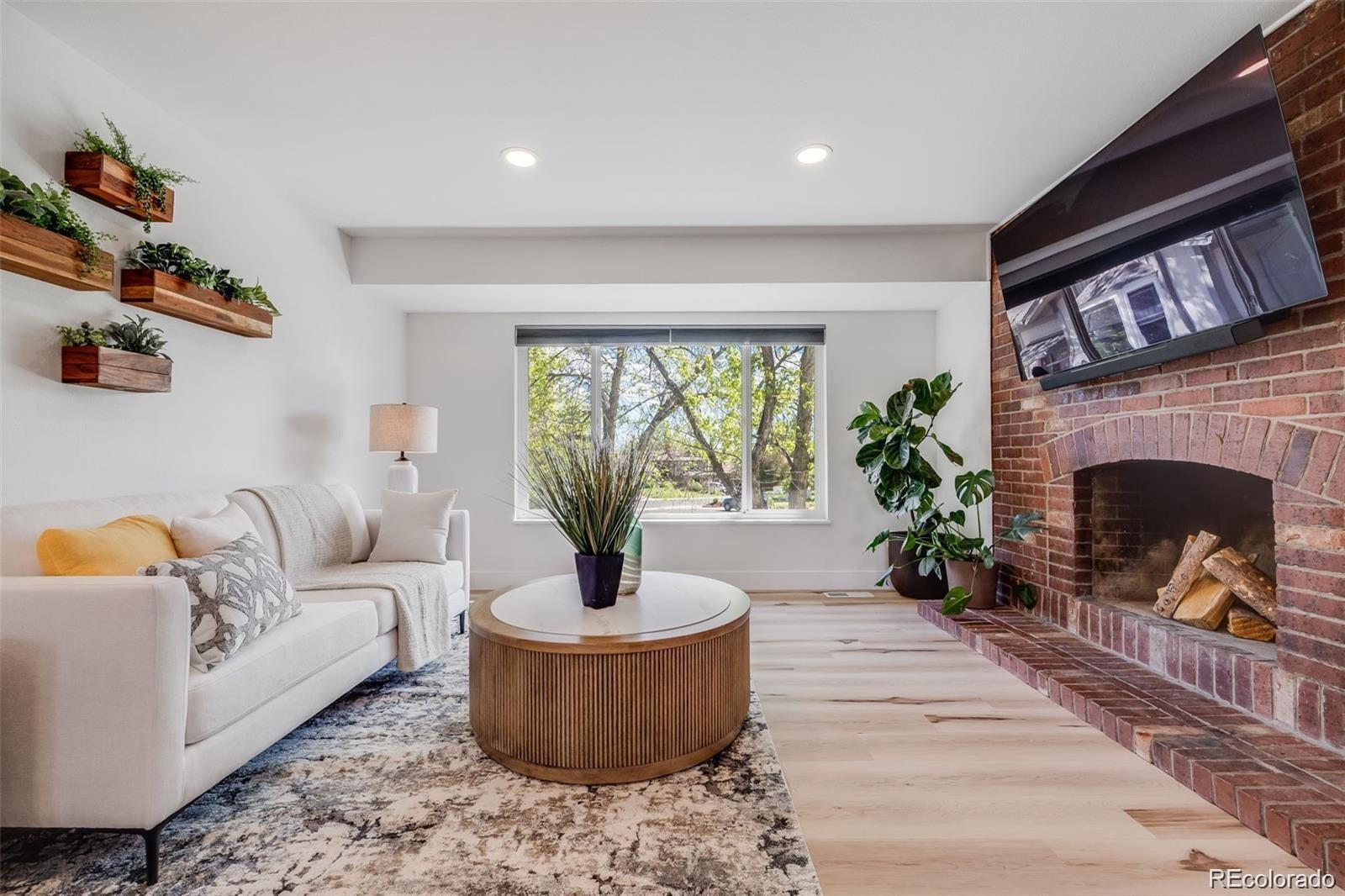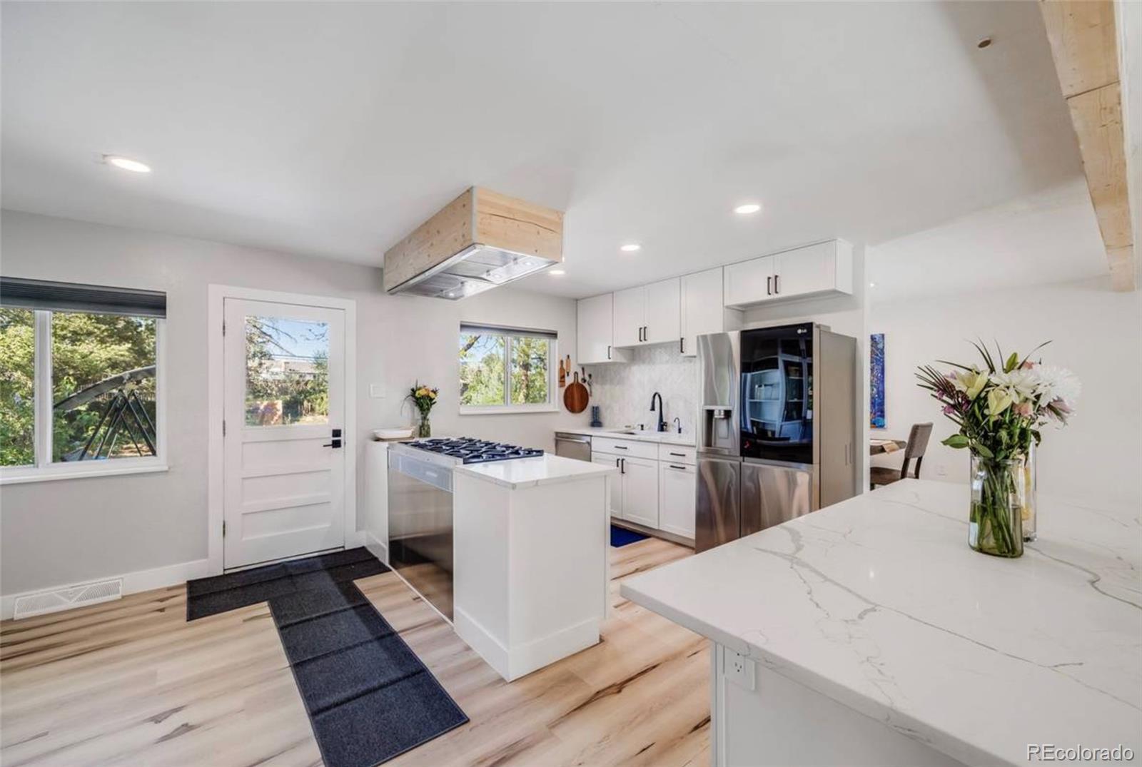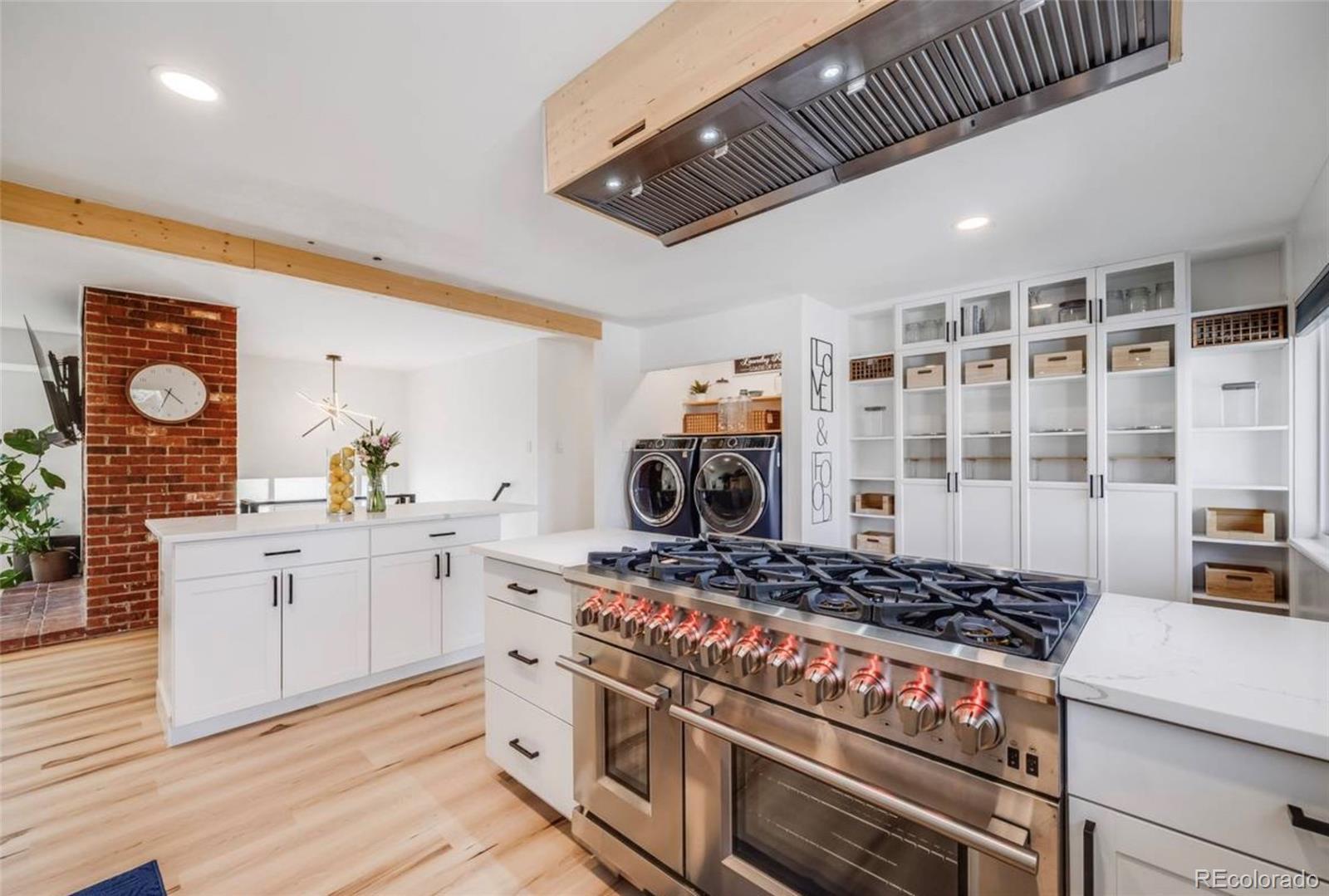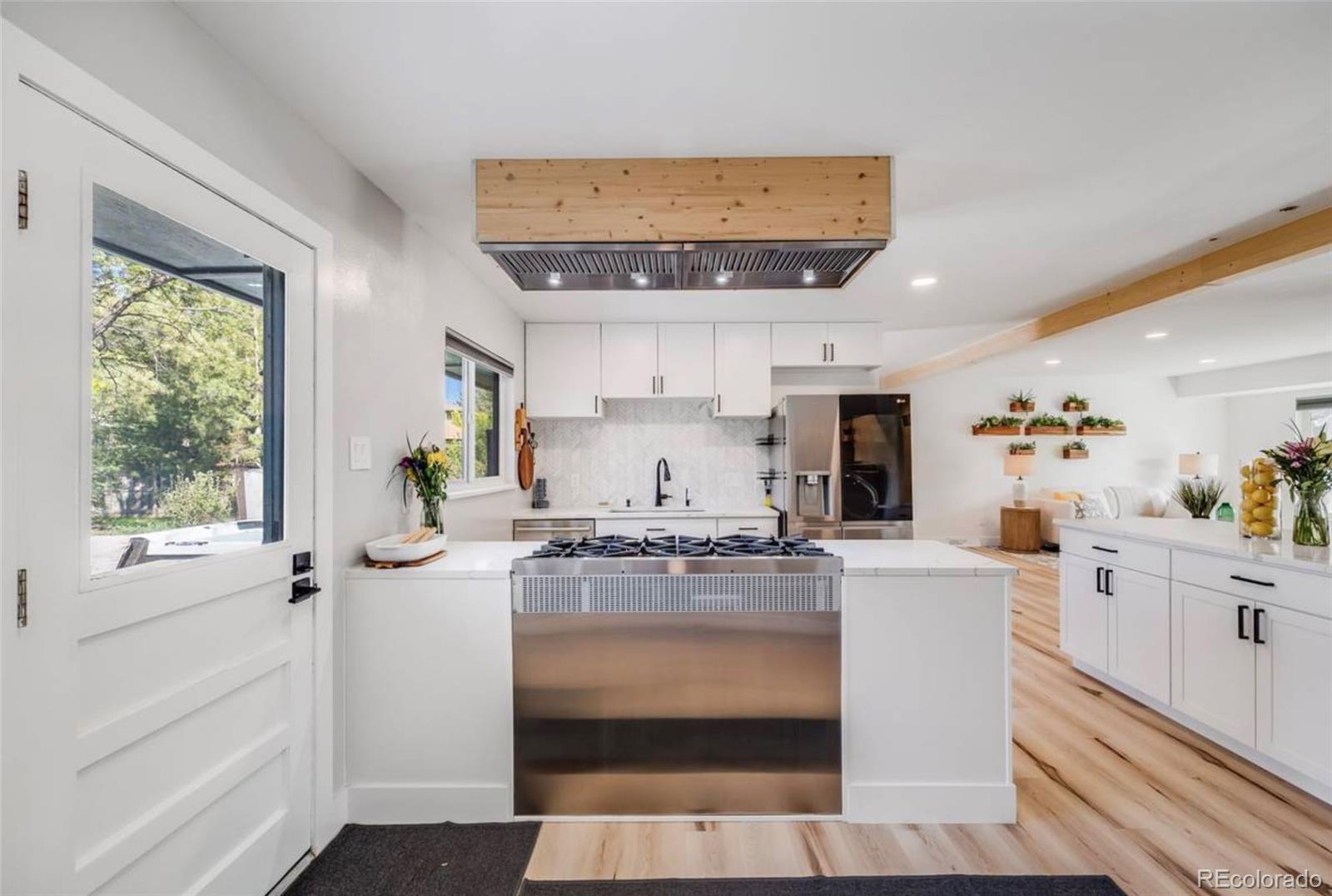 Discover your perfect blend of style, space, and comfort in a beautifully reimagined home tucked away on a sprawling oversized lot at the end of a quiet cul-de-sac. Every detail of this residence showcases craftsmanship and character, from exposed brick accents and custom wood beams to sunlight streaming through each thoughtfully designed space. The centerpiece of the home is an exceptional chef’s kitchen, equipped with a 48” professional gas range featuring dual ovens and a built-in rotisserie, sleek quartz countertops, and elegant open shelving that marries form and function. The attention to design and quality shines through in every finish, creating a truly one-of-a-kind living experience. Cozy up by one of the home’s two wood-burning fireplaces, or enjoy year-round comfort with the whole-house humidifier. Upstairs offers spacious and peaceful bedrooms, while the finished basement provides flexible space ideal for a home office, gym, or guest retreat and already plumbed for a bathroom. Step outside into a backyard built for entertaining, where mature trees, multiple patios, a dance floor, and a hot tub invite you to relax and celebrate life outdoors. A rolling back gate adds convenience with room to park a boat, RV, or additional vehicles on-site. The oversized backyard feels secluded and serene, offering a sense of privacy rarely found in the city. With Denver zoning that may allow for an Accessory Dwelling Unit (buyer/buyer’s agent to verify). Located near Bible Park, restaurants, shopping and easy access to I25. This home delivers the ideal balance of charm, modern amenities, and everyday convenience—truly a place you’ll fall in love with the moment you arrive.