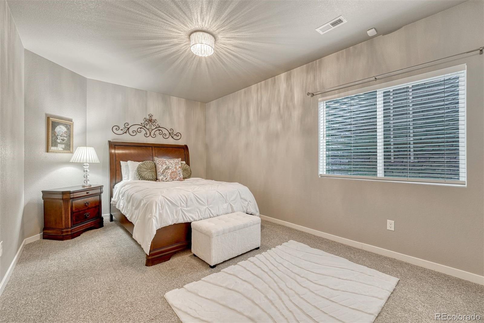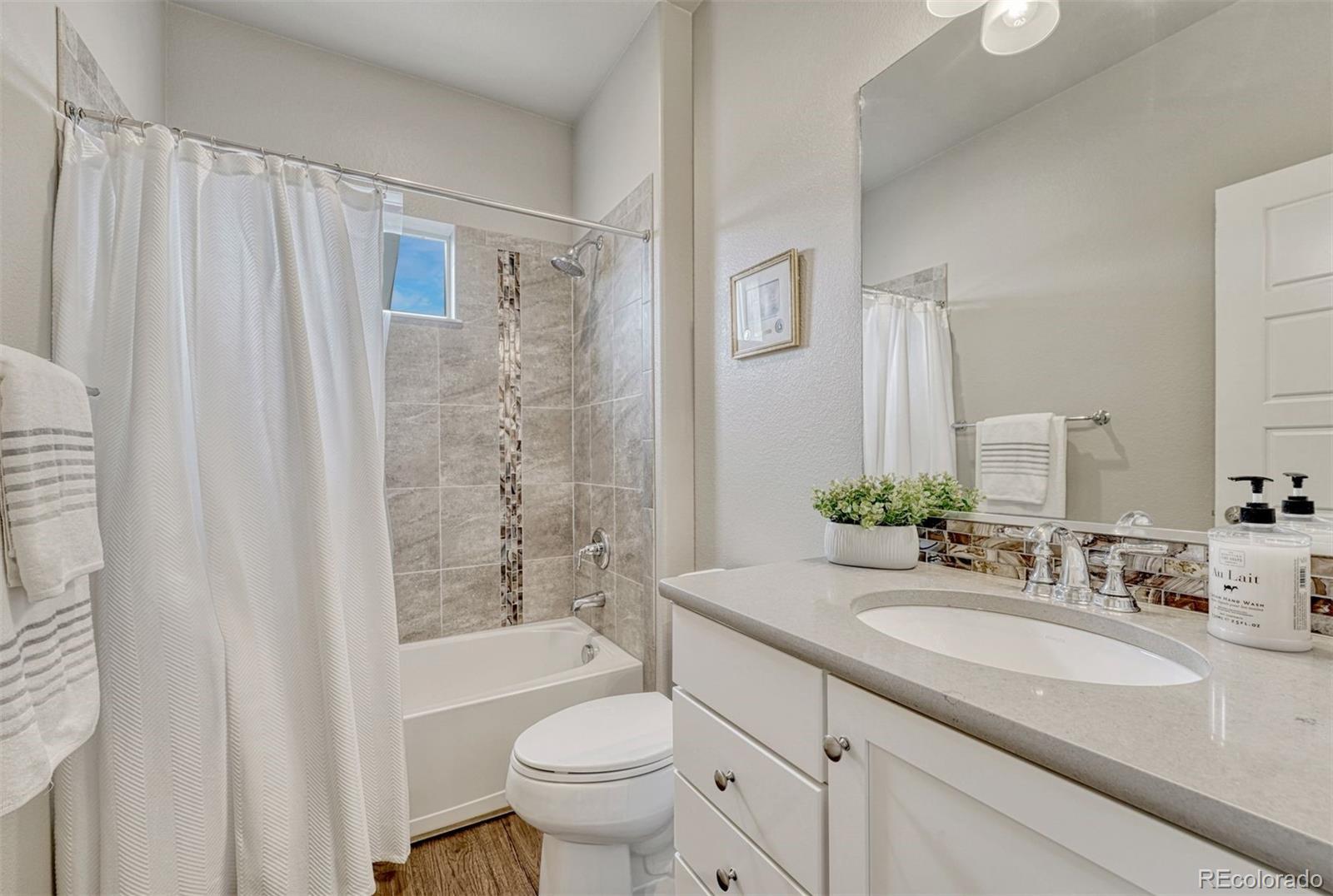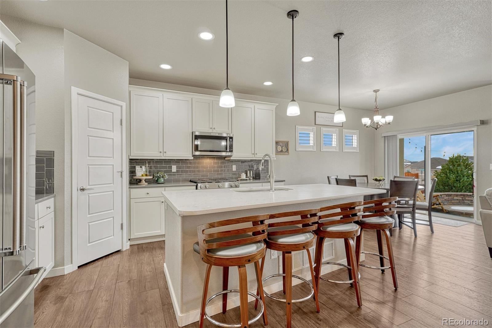 Step into this beautifully maintained home designed for easy living and effortless entertaining. Soaring ceilings and abundant natural light welcome you, showcasing an open-concept layout accented by extensive hardwood floors throughout the main level. The stunning kitchen is the heart of the home, featuring quartz countertops, stainless steel appliances, 42" antique white maple cabinetry, a blue-gray designer backsplash, and a large island with seating for four—perfectly positioned to overlook the living and dining spaces. Sliding glass doors open to a low-maintenance backyard retreat with premium artificial turf, a custom sandpit, shade sails, string lights, hot tub, and a cozy fire pit—ideal for year-round enjoyment without the upkeep. Unwind indoors by the living room fireplace, then retreat to the spacious primary suite with room for a king-size bed and a luxurious ensuite featuring dual quartz vanities, an oversized soaking tub, a separate shower, and a walk-in closet. The finished basement adds even more living space with 9-foot ceilings, two generous bedrooms—each with walk-in closets—and a flexible recreation area perfect for a media room or game space. Ideally located within walking distance to restaurants, parks, schools, fitness centers, and the Sand Creek trail system, this exceptional home offers comfort, style, and convenience in a vibrant neighborhood.