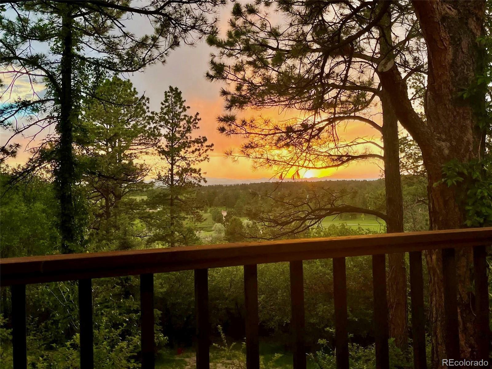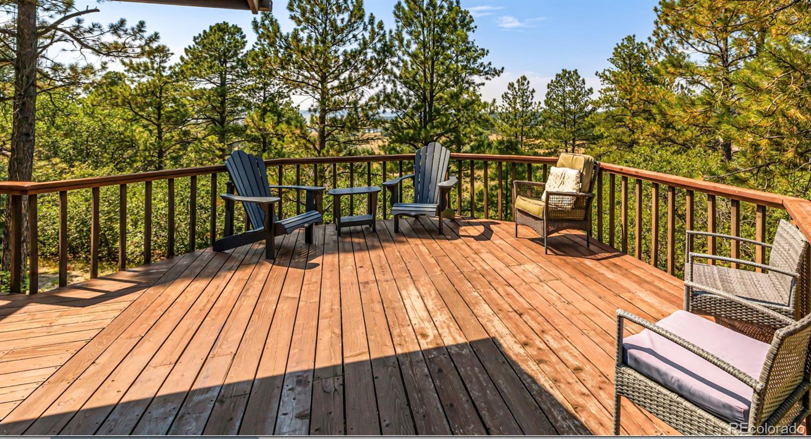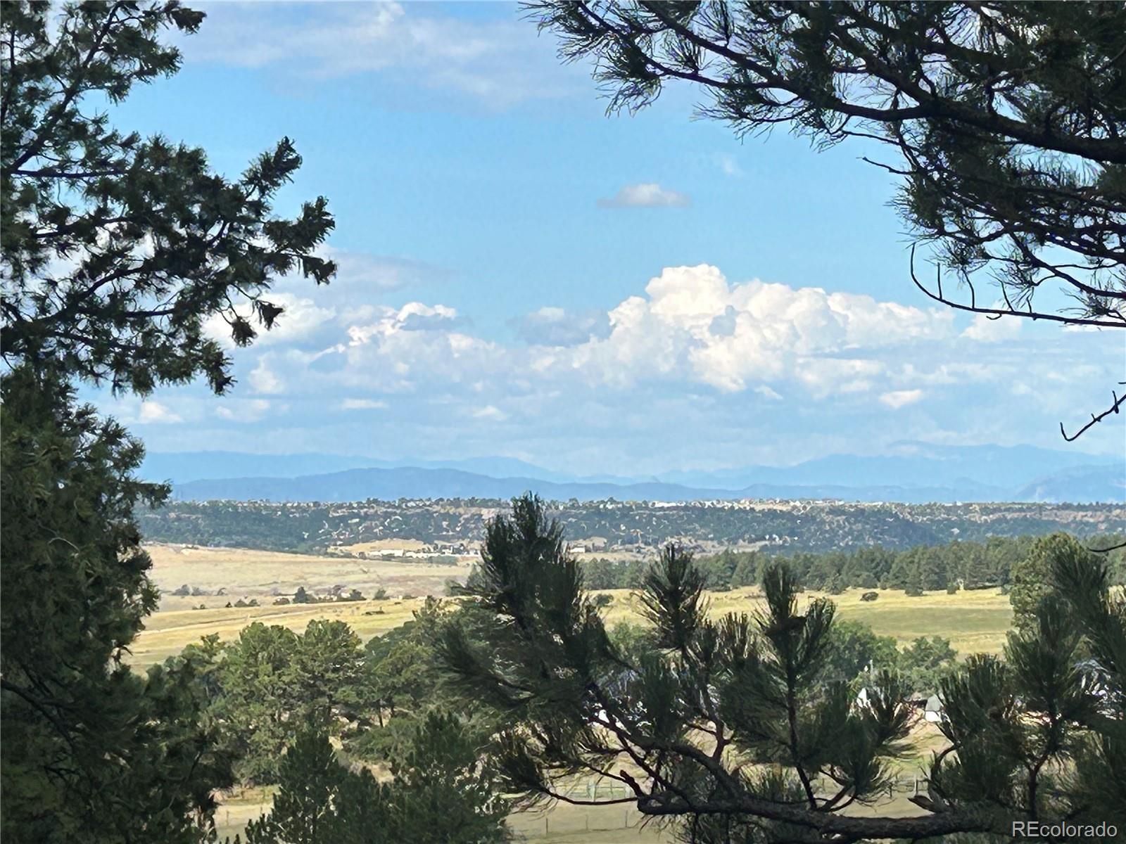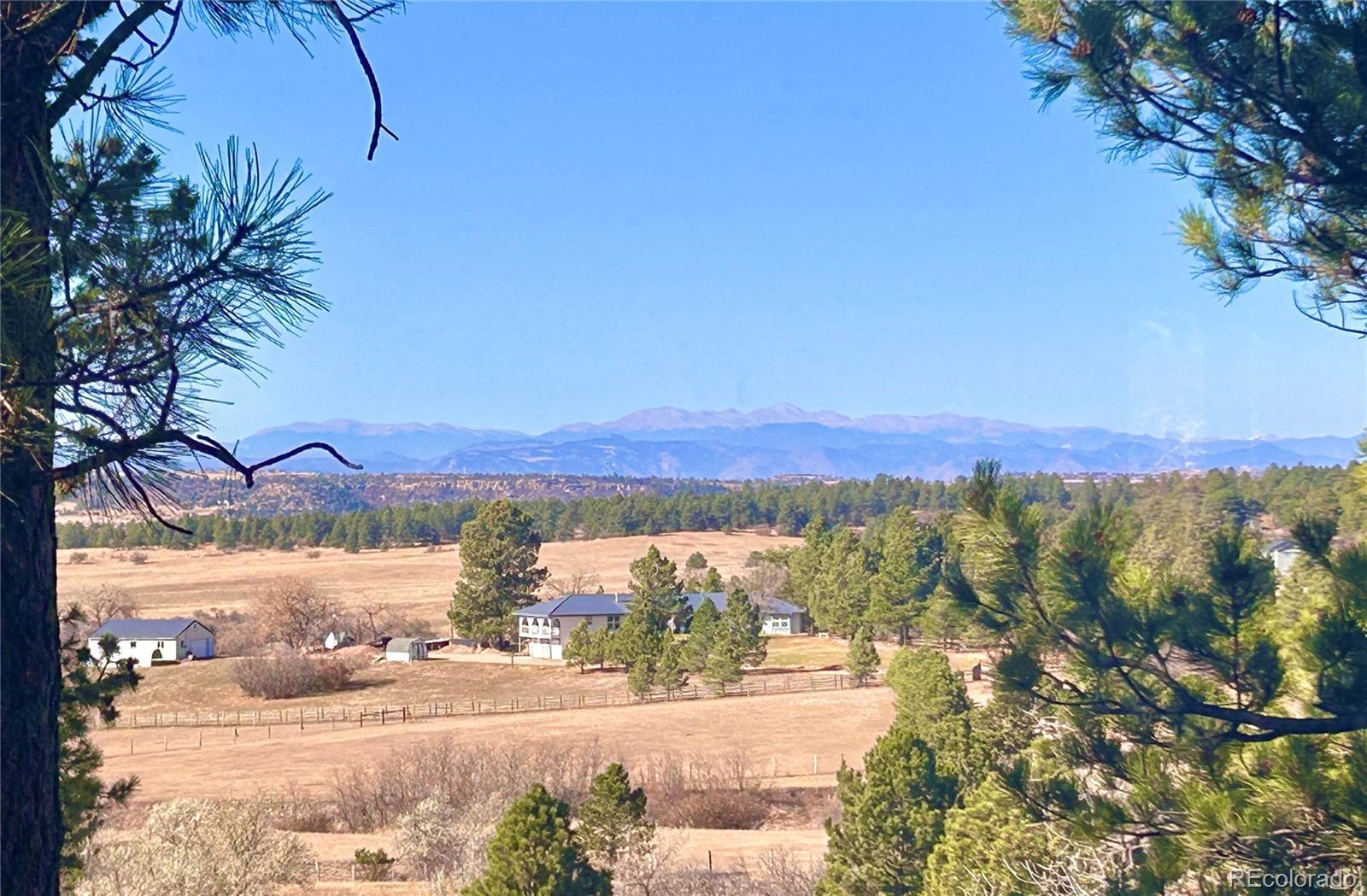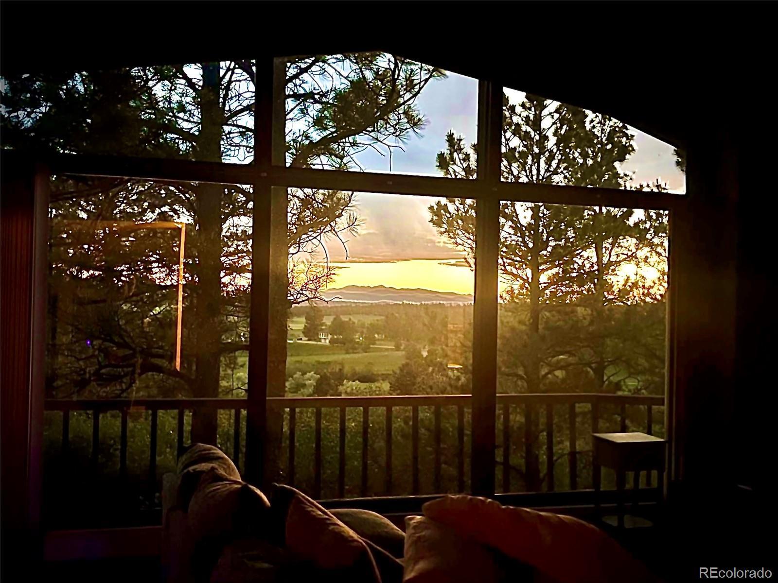 Welcome to this exceptional custom home tucked away in the rolling hills of Franktown. Perfectly positioned on a serene, tree-lined lot, this residence combines Colorado’s natural beauty with refined living. New Paint, Flooring, lighting, septic, and more! Step inside to soaring wood planked vaulted ceilings, expansive floor to ceiling windows, creating a light-filled open floor plan designed for both everyday living and entertaining. The chef’s kitchen boasts custom modern cabinetry, and a generous island that flows seamlessly into the great room with a dramatic stone fireplace. The home offers multiple living areas including a formal dining room, great room, private office, and a finished basement with media and recreation spaces and even has room for a workshop. The luxurious primary suite is a private retreat featuring a spa-inspired bath, sitting area, and access to private and peaceful outdoor views. Additional bedrooms are spacious, and even has a non conforming bonus room currently being used as an oversized guest room Outdoor living is equally impressive. Enjoy evenings on the expansive wrap around deck featuring mountain views and surrounding countryside. The property’s acreage provides privacy, mature landscaping, and plenty of space for hobbies, exploring, gatherings, or simply enjoying the quiet setting and abundant wildlife. Located in one of Franktown’s most sought-after communities, this home offers the perfect balance of tranquility and convenience—just minutes to Castle Rock, Parker, and easy access to the Denver metro. Highlights: Custom design with open concept living and dramatic windows with sunset mountain views Barn/shed/workshop with electricity and water Primary suite with spa bath & retreat space indoors and out Finished basement with entertainment & media rooms Floating MC modern staircase 2 dramatic stone fireplaces T&G wood vaulted ceiling Expansive outdoor living Scenic acreage with privacy and mature trees