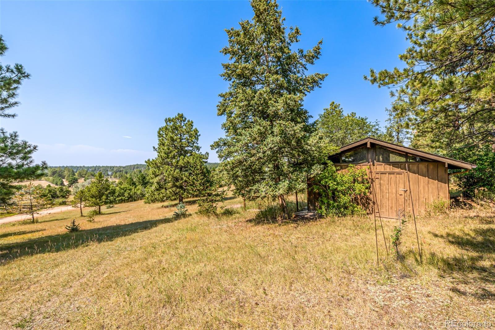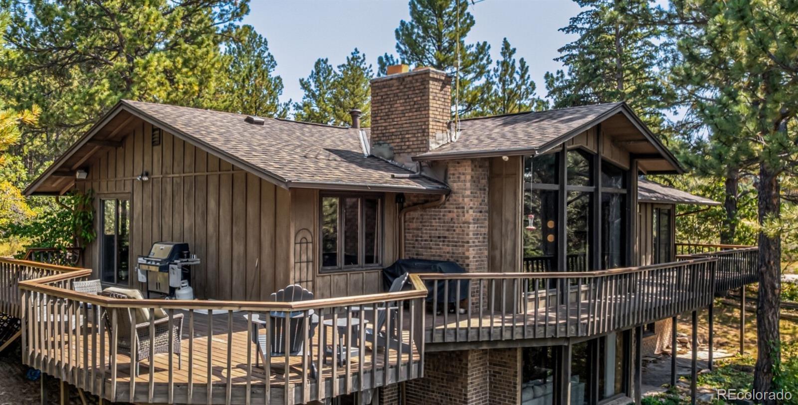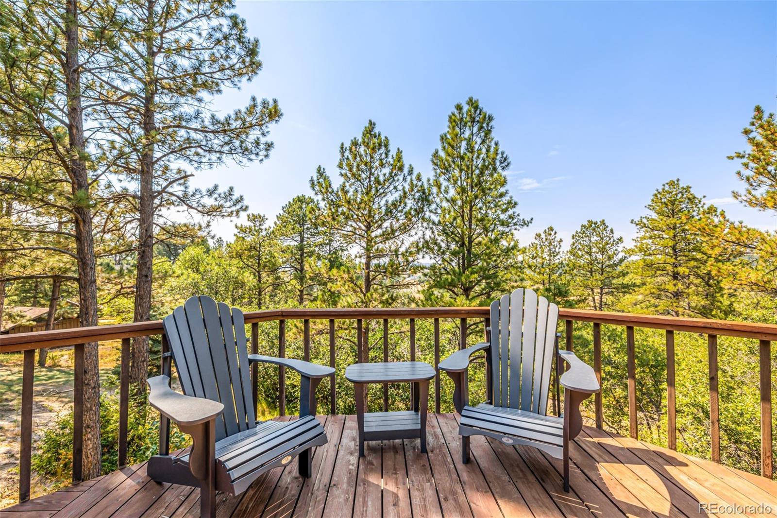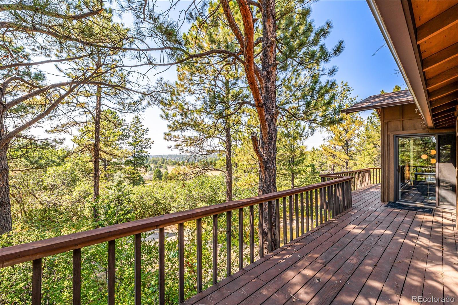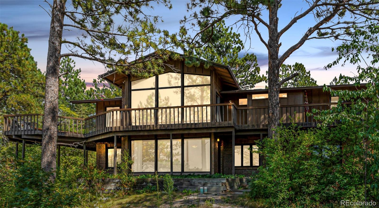 Welcome to this exceptional custom home tucked away in the rolling hills of Franktown. Perfectly positioned on a serene, tree-lined lot, this residence combines Colorado’s natural beauty with refined living. New Paint, Flooring, lighting, septic, and more! Step inside to soaring wood planked vaulted ceilings, expansive floor to ceiling windows, creating a light-filled open floor plan designed for both everyday living and entertaining. The chef’s kitchen boasts custom modern cabinetry, and a generous island that flows seamlessly into the great room with a dramatic stone fireplace. The home offers multiple living areas including a formal dining room, great room, private office, and a finished basement with media and recreation spaces and even has room for a workshop. The luxurious primary suite is a private retreat featuring a spa-inspired bath, sitting area, and access to private and peaceful outdoor views. Additional bedrooms are spacious, and even has a non conforming bonus room currently being used as an oversized guest room Outdoor living is equally impressive. Enjoy evenings on the expansive wrap around deck featuring mountain views and surrounding countryside. The property’s acreage provides privacy, mature landscaping, and plenty of space for hobbies, exploring, gatherings, or simply enjoying the quiet setting and abundant wildlife. Located in one of Franktown’s most sought-after communities, this home offers the perfect balance of tranquility and convenience—just minutes to Castle Rock, Parker, and easy access to the Denver metro. Highlights: Custom design with open concept living and dramatic windows with sunset mountain views Barn/shed/workshop with electricity and water Primary suite with spa bath & retreat space indoors and out Finished basement with entertainment & media rooms Floating MC modern staircase 2 dramatic stone fireplaces T&G wood vaulted ceiling Expansive outdoor living Scenic acreage with privacy and mature trees