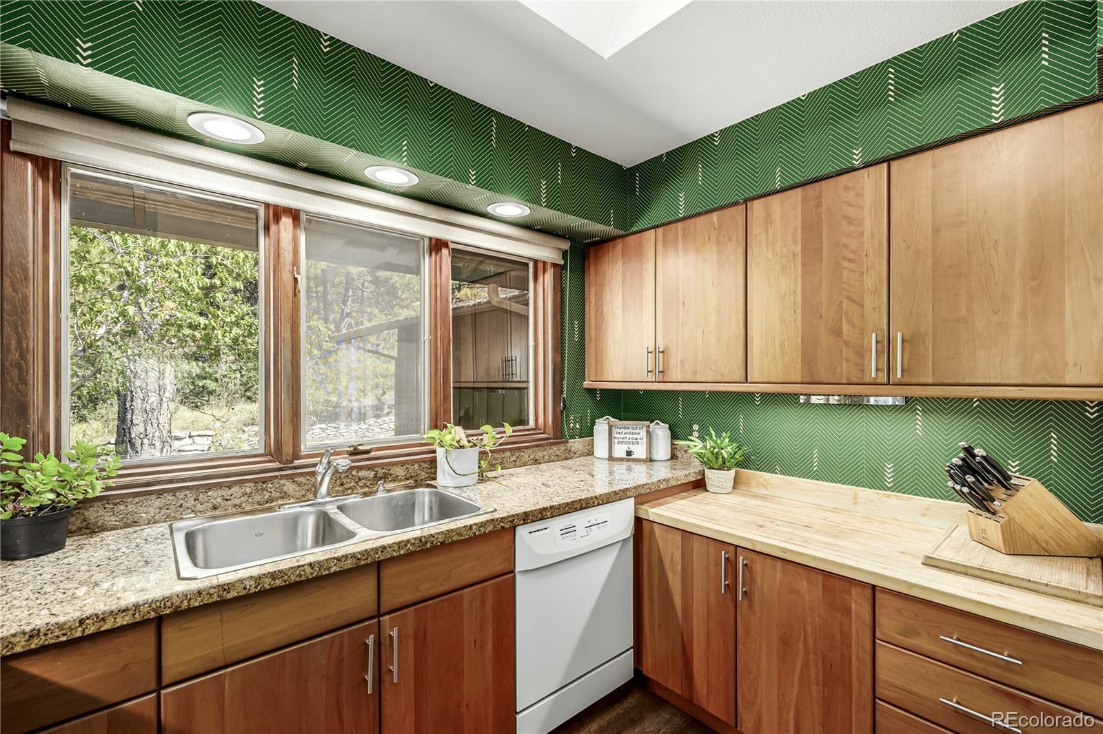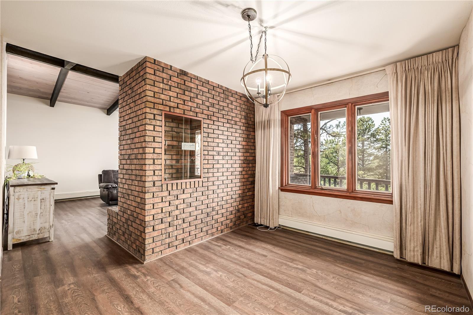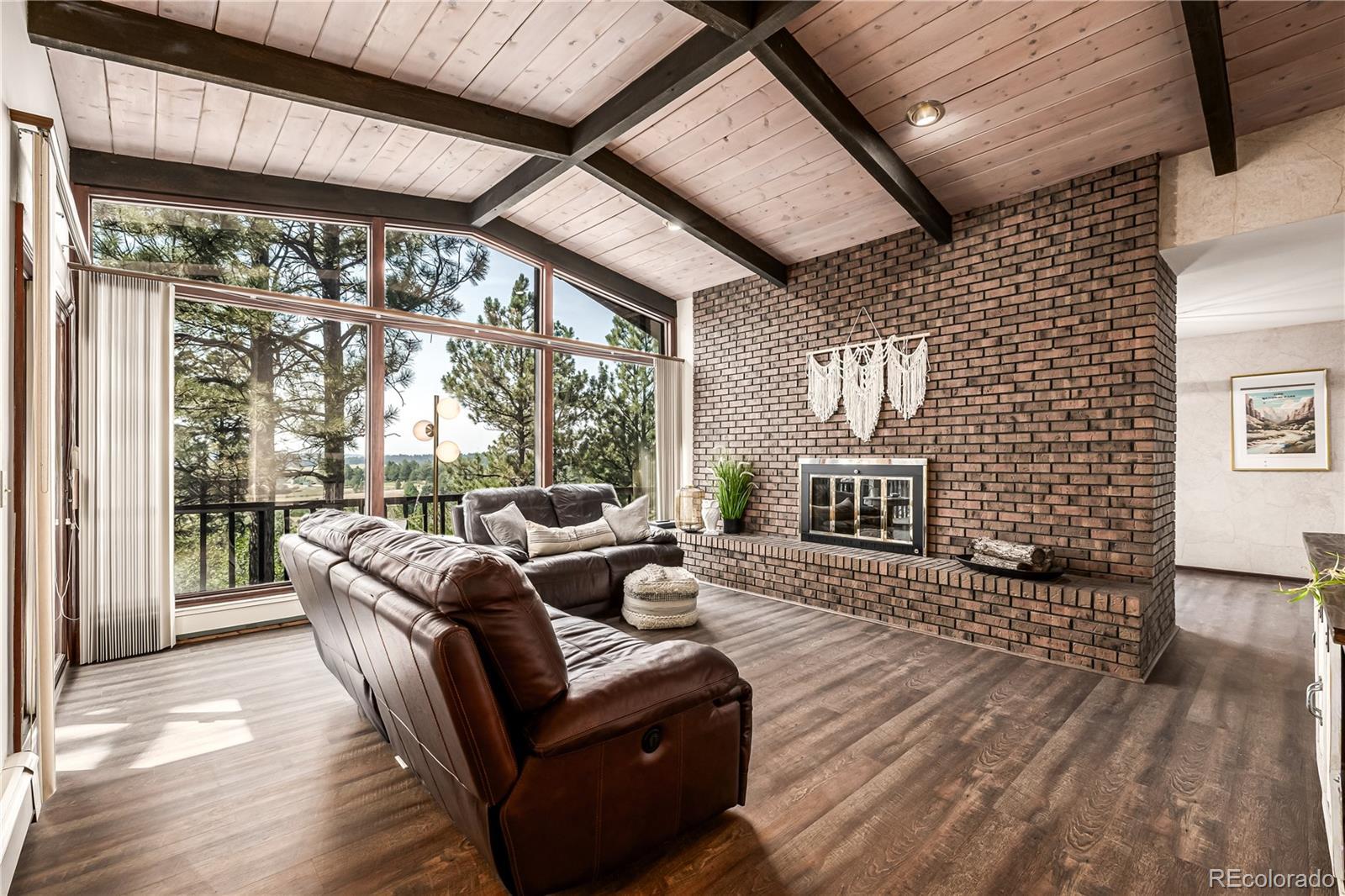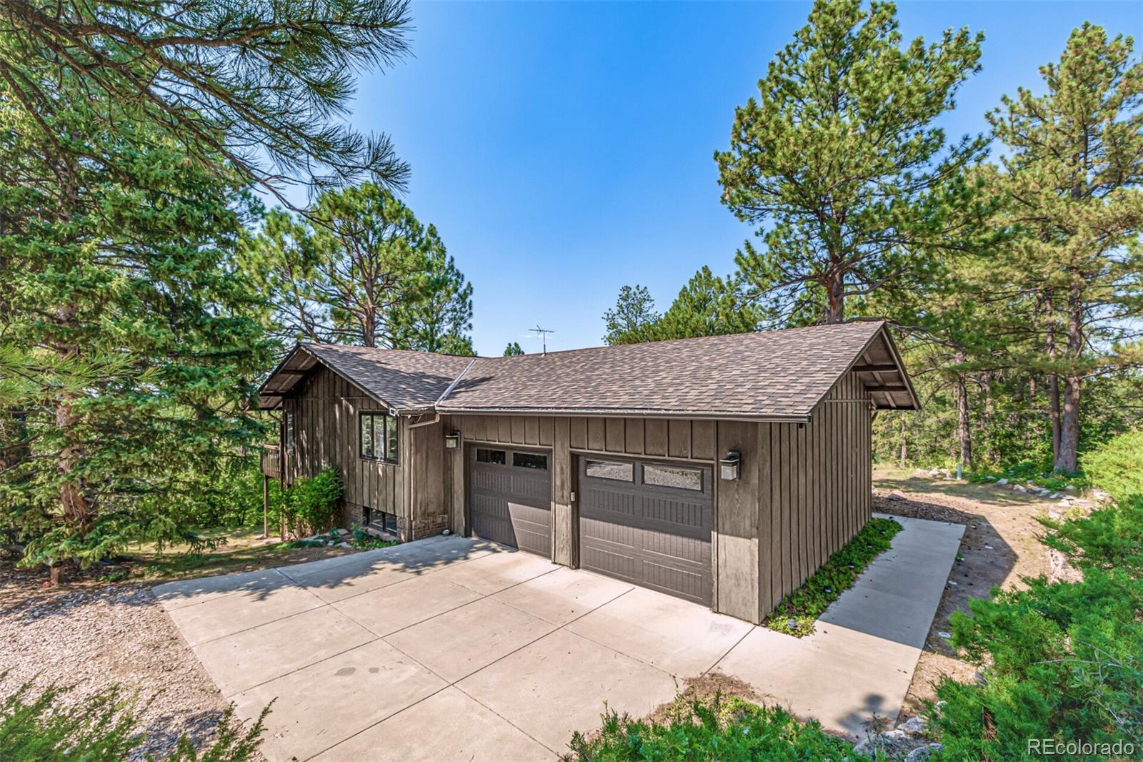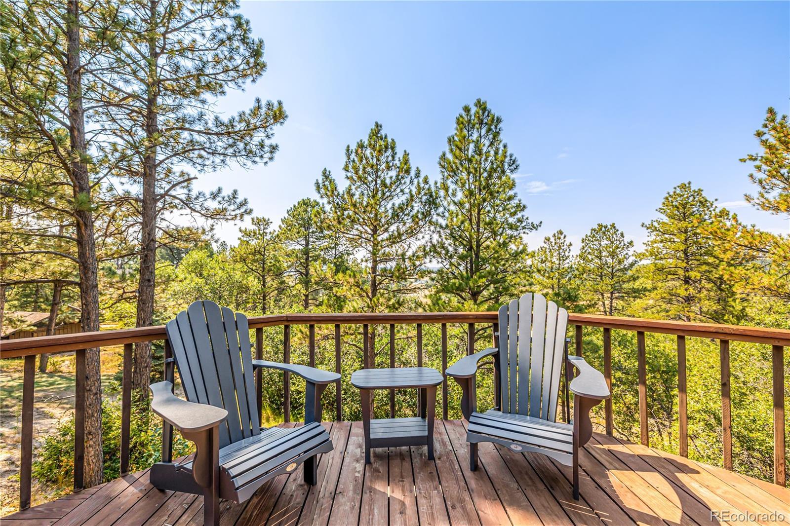 Welcome to this exceptional custom home tucked away in the rolling hills of Franktown. Perfectly positioned on a serene, tree-lined lot, this residence combines Colorado’s natural beauty with refined living. New Paint, Flooring, lighting, septic, and more! Step inside to soaring wood planked vaulted ceilings, expansive floor to ceiling windows, creating a light-filled open floor plan designed for both everyday living and entertaining. The chef’s kitchen boasts custom modern cabinetry, and a generous island that flows seamlessly into the great room with a dramatic stone fireplace. The home offers multiple living areas including a formal dining room, great room, private office, and a finished basement with media and recreation spaces and even has room for a workshop. The luxurious primary suite is a private retreat featuring a spa-inspired bath, sitting area, and access to private and peaceful outdoor views. Additional bedrooms are spacious, and even has a non conforming bonus room currently being used as an oversized guest room Outdoor living is equally impressive. Enjoy evenings on the expansive wrap around deck featuring mountain views and surrounding countryside. The property’s acreage provides privacy, mature landscaping, and plenty of space for hobbies, exploring, gatherings, or simply enjoying the quiet setting and abundant wildlife. Located in one of Franktown’s most sought-after communities, this home offers the perfect balance of tranquility and convenience—just minutes to Castle Rock, Parker, and easy access to the Denver metro. Highlights: Custom design with open concept living and dramatic windows with sunset mountain views Barn/shed/workshop with electricity and water Primary suite with spa bath & retreat space indoors and out Finished basement with entertainment & media rooms Floating MC modern staircase 2 dramatic stone fireplaces T&G wood vaulted ceiling Expansive outdoor living Scenic acreage with privacy and mature trees