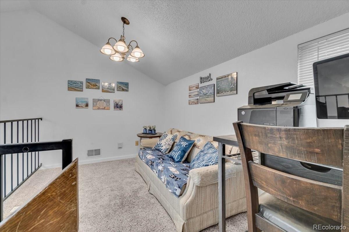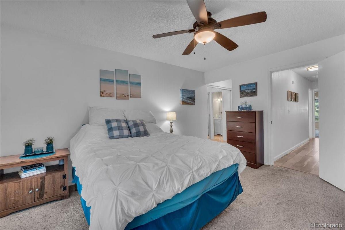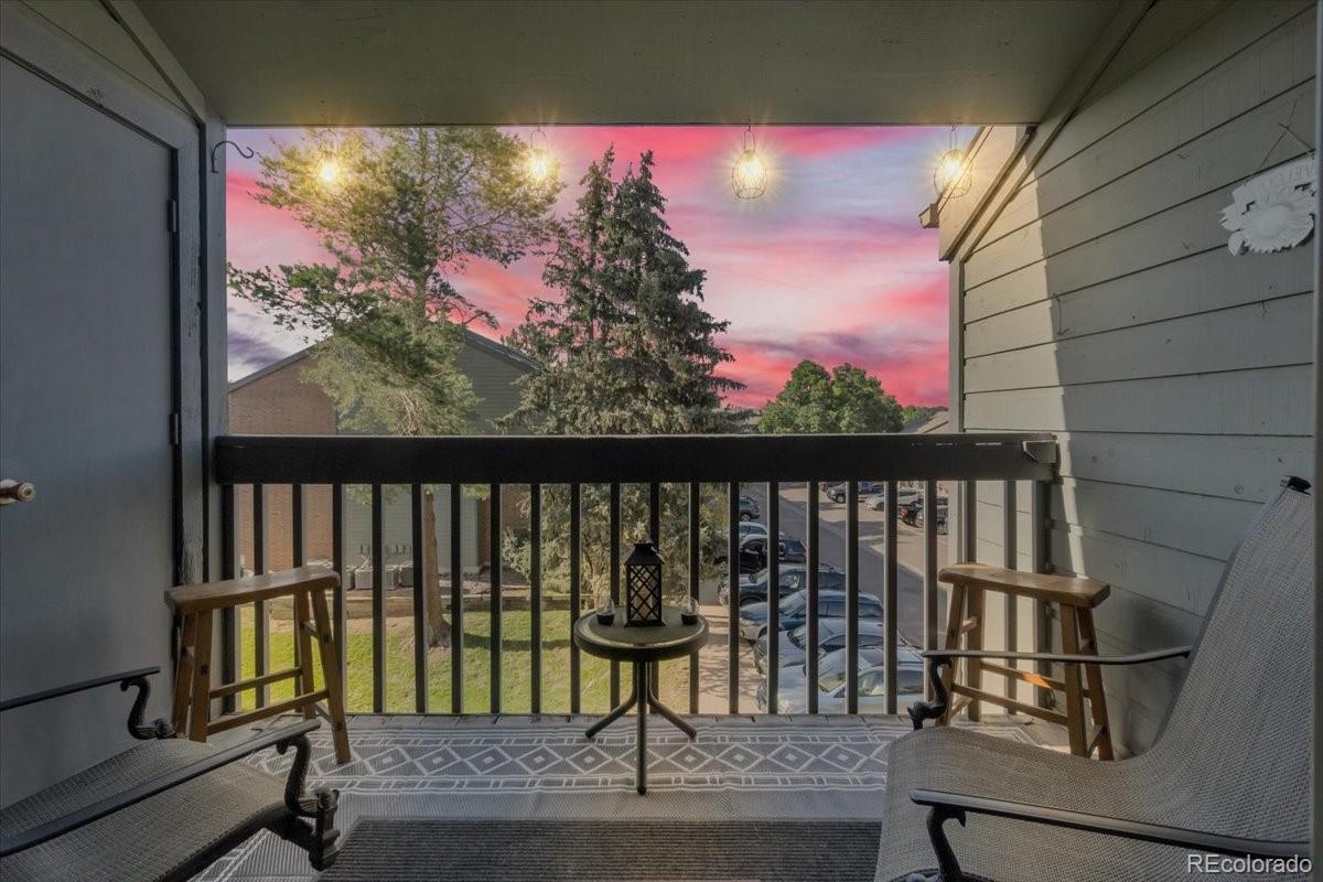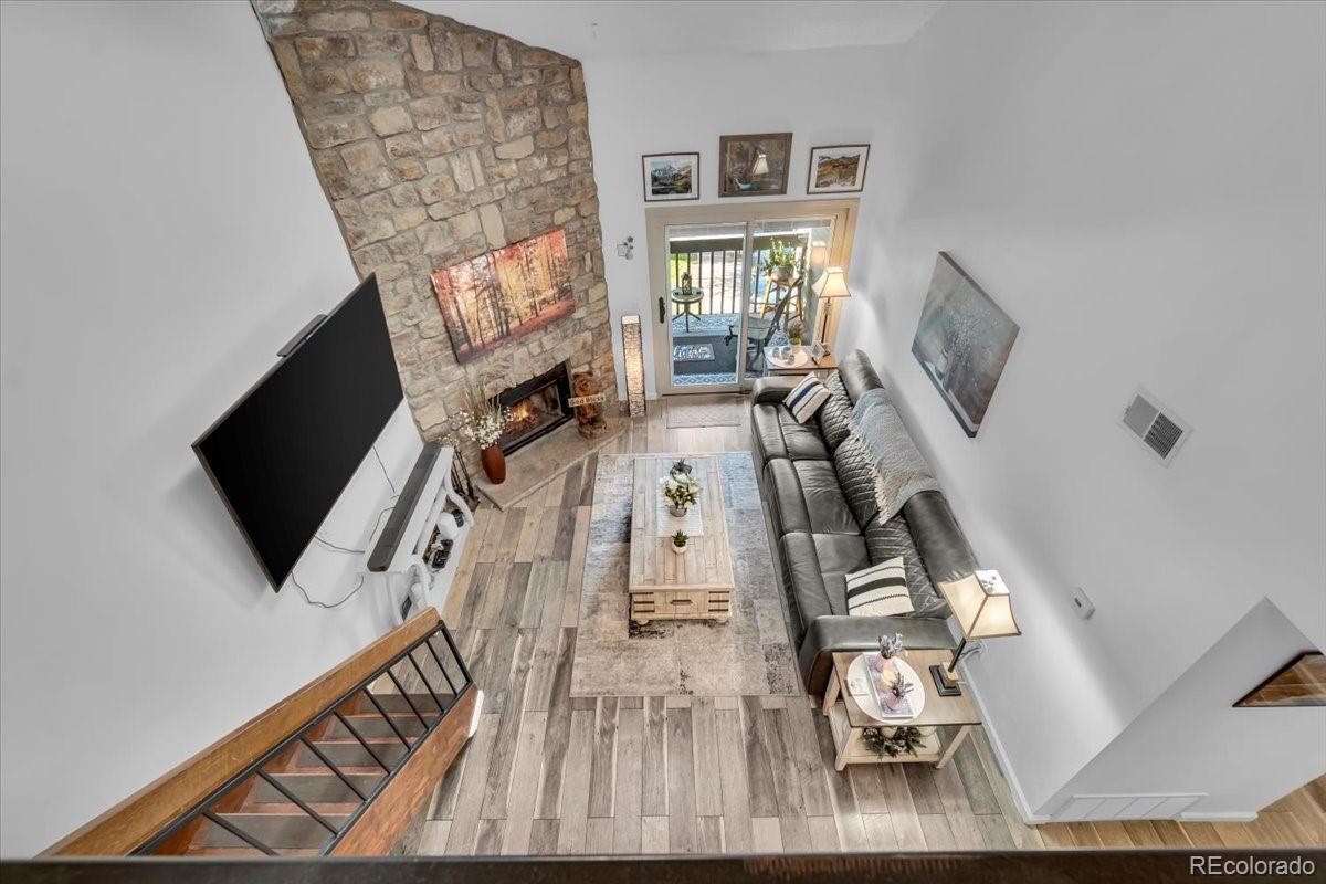 Welcome to this charming top-floor, end-unit condo featuring two spacious bedrooms, two full bathrooms, a loft, and a private balcony with beautiful views, along with a cozy wood-burning fireplace. Enjoy the convenience of a designated parking space. This home boasts an open-concept layout, flooded with natural light from the skylight. The living room’s vaulted ceiling, highlighted by a striking floor-to-ceiling stone wall surrounding the wood-burning fireplace, creates a bright and inviting atmosphere. The primary bedroom offers ample space with double closets, a ceiling fan, and a full ensuite bathroom. The versatile loft area is perfect for a playroom, office, craft room, or gaming space. The second full bathroom is conveniently located in the hallway. With easy access to Highway 285, the Denver Tech Center, and the mountains, this condo offers both comfort and convenience.