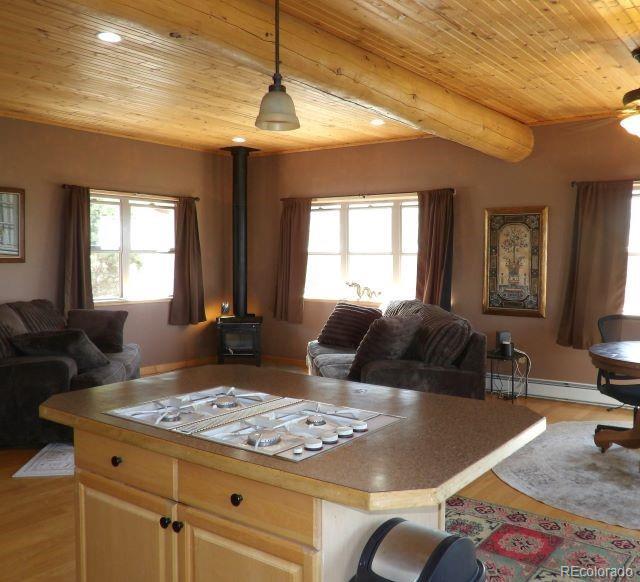 Charming 4 bedroom/2 .5 bath home that was once used as a residence, and walk out downstairs, as a BNB. The downstairs with its private entrance, 3 bedrooms, 1 bath, has a nice living space, and laundry. This unit had a good rental history when it was being used as a BNB on the lower level. The upstairs features a large main bedroom with en suite full bath. The living area, kitchen features an island eating space, and lots of windows. Walk out onto the back covered porch, and the views go on for miles over the tops of trees. This quiet location is a mere minutes walking distance from some of the Spiritual retreats. This Dark Sky Community offers incredible sky watching, and the back deck is a perfect place to set up your telescope. The southwestern style of the exterior has great curb appeal. The Sangre De Cristos rise up in the front, and the valley pans out from the back. The main living area features a wood stove for cozy winter nights. The open island kitchen has ample counter space for the avid chef. Minutes to town, and amenities. 40 minutes to 1 hour to major hot spring resorts. Skiing at Monarch close enough for a day trip. Your dues include snow plowing, and road maintenance to your driveway, and free golf and tennis. There is high speed internet, and 911 serivice. This seller will go VA, FHA.