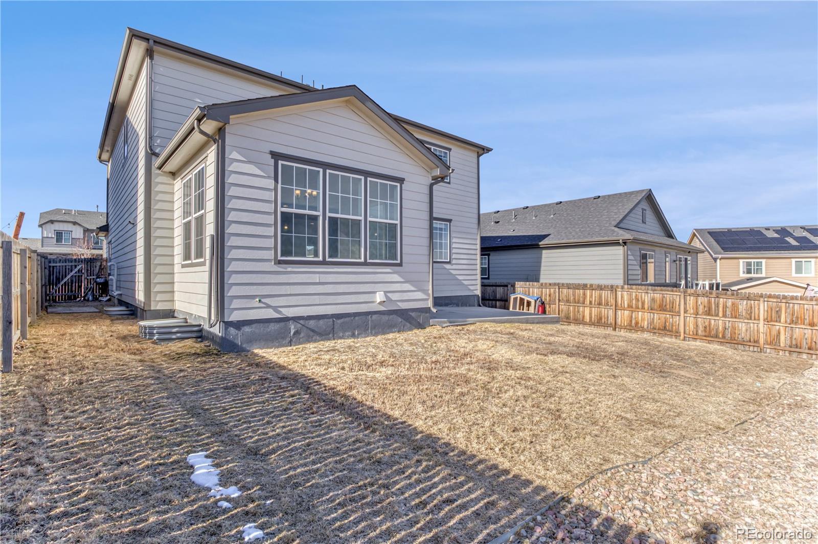 Located in Serenity Ridge within the highly sought-after Cherry Creek School District, stands this stunning 5-bedroom, 4-bath home. Showcasing mountain views from the second floor and serene views of the Aurora Reservoir, this home offers space, style, and modern efficiency. The open-concept layout features soaring ceilings and abundant natural light. The gourmet kitchen is equipped with white cabinetry, stainless steel appliances, a built-in gas stove, and an oversized island ideal for entertaining. A main-level office and cozy gas fireplace add comfort and functionality. Upstairs includes spacious bedrooms and a versatile loft, while the finished basement offers a large recreation area, additional bedroom, and full bath—perfect for guests or multi-generational living. Fully paid-off solar panels and dual HVAC systems ensure energy efficiency and year-round comfort. Conveniently located near Southlands Mall and E-470 for easy access to shopping, dining, and commuting.