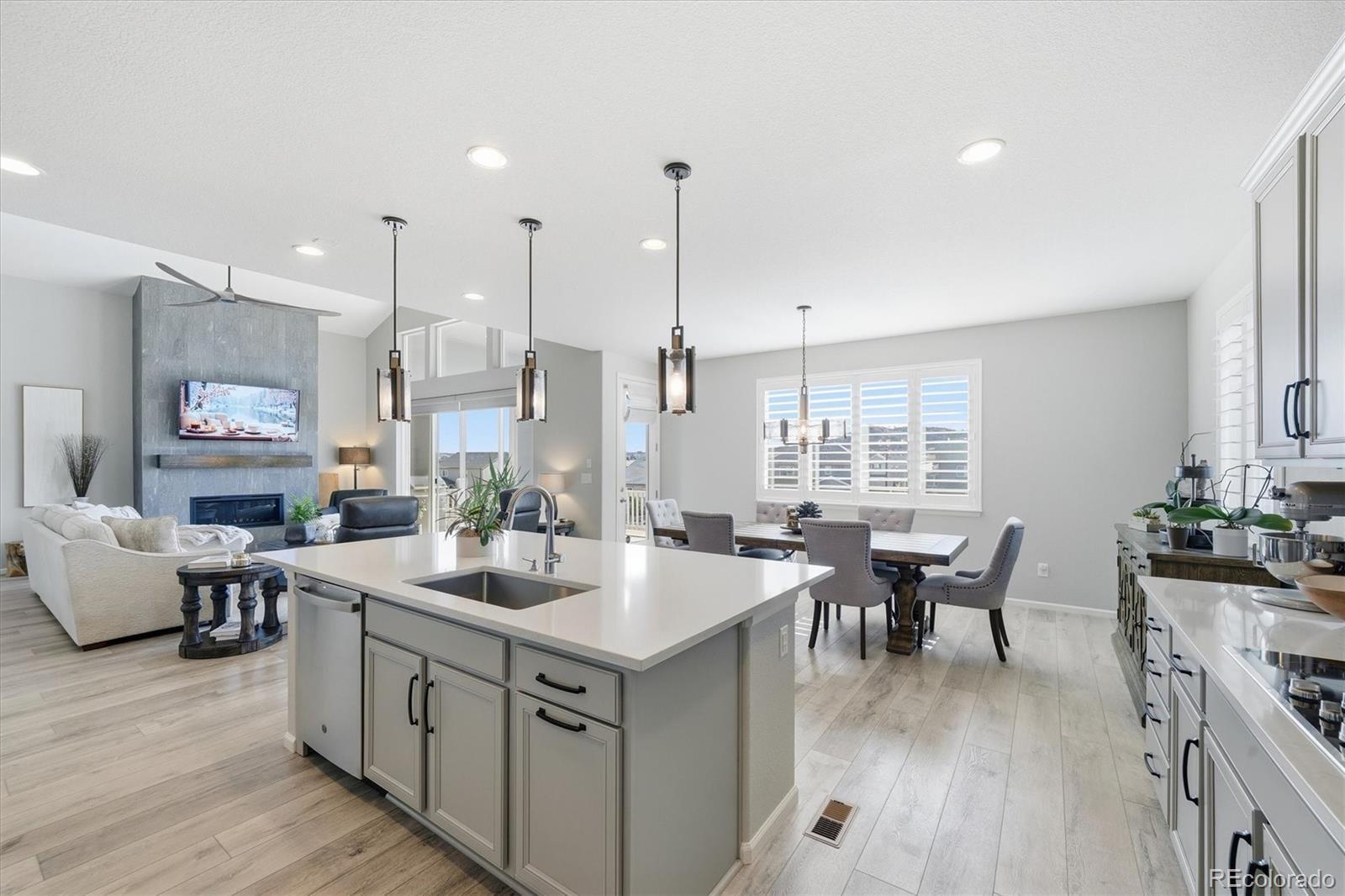 Welcome home to this stunning Melody floor plan in the highly sought-after Cobblestone Ranch community! Enjoy the perfect blend of peaceful country living with convenient access to Parker and Castle Rock!*** Be sure to check out the drone video!***This beautifully appointed ranch-style home sits up on the ridge offering year round views of the bluffs and breathtaking Colorado skies! Step inside to discover luxury vinyl plank flooring, custom lighting and designer finishes thoughout! Just off the main hallway, you’ll find a well-appointed three-quarter bath with extra cabinetry, a spacious guest bedroom and a secondary bedroom or private office! The primary suite is a true retreat, featuring a spa-inspired en suite bathroom with custom tile shower and dual vanities! The heart of the home is the expansive great room with soaring ceilings, plantation shutters, and a dramatic floor-to-ceiling stone tile gas fireplace. The space flows seamlessly into the gourmet kitchen, complete with a large center island, GE Profile appliances, double ovens, ceramic cooktop, instant hot water, and a spacious walk-in pantry. The adjacent oversized dining/eat-in area is perfect for gatherings and entertaining! The finished basement expands your living space with a fully equipped kitchenette, large game and entertainment area, fourth bedroom with three-quarter bath, and a fifth flex room perfect for a gym or music room! Additional highlights include a newer roof, 8-foot doors and a mudroom with utility sink and washer/dryer. Step outside to enjoy the beautifully designed yard featuring turf, drip lines, zero-scaped landscaping, and a large covered patio! Car enthusiasts and hobbyists will love the incredible fully finished and insulated garage w/ 9' doors, offering space for 4 vehicles and can accomodate an RV or boat, plus its own A/C and heating unit, subpanel, and 220V outlet! This home truly has it all — space, upgrades, views and location! This gem is waiting for you!