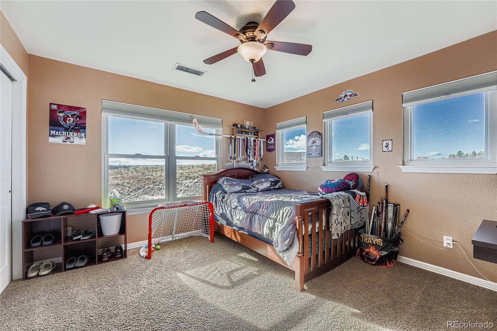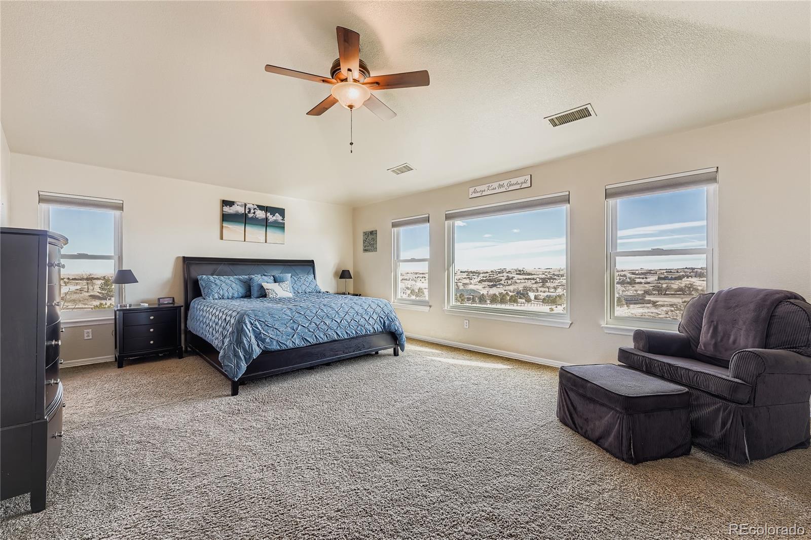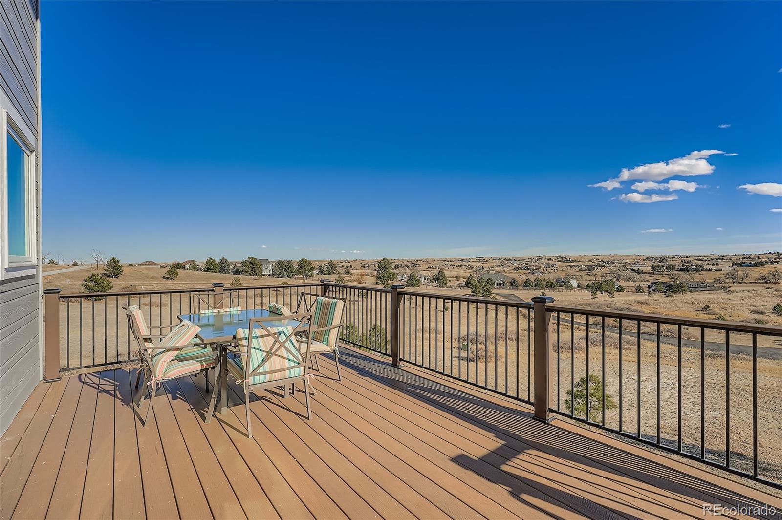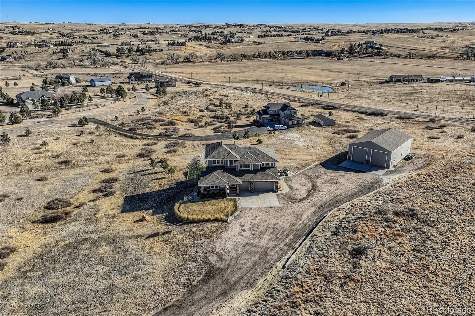 Perfectly positioned on 5 acres in the sought after Elkhorn Ranch community, this exceptional property offers an ideal blend of privacy, space, and convenience with easy access to E470. The kitchen is designed for both everyday living and entertaining, featuring a four burner gas cooktop, double ovens, center island with seating, electric blinds, and peaceful views from the kitchen windows. The family room features soaring ceilings, a wall of windows, and a cozy gas fireplace, filling the space with natural light and bringing the Colorado landscape right inside. A main floor bedroom offers flexible use and is ideal for a home office or guest space. Upstairs, the spacious primary suite features a sitting area with peaceful views and a beautifully remodeled ensuite bathroom with soaking tub, multi head shower, and dual walk-in closets. The primary bedroom also features electric blinds. The partially finished walkout basement provides excellent flexibility, with a dedicated flex room currently used as a gym and additional space ready to customize to your needs. Outside, enjoy wide open skies from the deck and plenty of room to spread out on the land. The property includes an attached three car garage plus an impressive detached 60 x 40 workshop, ideal for RVs, boats, toys, or hobby use. Recent upgrades include new windows and blinds throughout, updated light fixtures, a remodeled primary bathroom, new deck and patio, both air conditioning units replaced in 2021, new roof and exterior paint completed in 2023, a new water heater in 2025, basement furnace replaced in 2023, and a private putting green. The home has been pre-inspected and a comprehensive HOA Summary report is being provided.