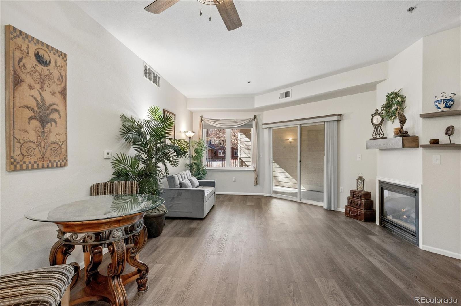 Presenting a move-in ready ground floor condominium in Centennial at Riverwalk, located within a secure 55+ community offering underground parking and storage. This two-bedroom, two-bath residence has undergone comprehensive updates over the past three years, featuring new LVP flooring, fresh carpeting in both bedrooms, upgraded lighting throughout, painted kitchen cabinets, quartz countertops, modern stainless steel appliances, and a stainless steel undermount sink with a contemporary faucet. The primary bathroom is equipped with a new walk-in shower and quartz countertops, while the spacious primary bedroom includes a walk-in closet. The second bedroom offers versatility as either a guest suite or office space. The living room is enhanced by a cozy gas fireplace and a new mantle; ceiling fans are installed in both the living area and primary bedroom. Additional amenities include a laundry area with newer stackable washer and dryer plus a newly built pantry/storage cabinet. The oversized patio provides ample space for outdoor furnishings. HOA fee includes heat and basic cable in this building. Residents benefit from elevator access in the underground parking garage; parking space number 53 is assigned and features an adjacent storage cage. Experience convenient "lock and leave" living at Centennial at Riverwalk. Prospective owners are invited to visit the neighboring 12,000-square-foot clubhouse, which boasts a fitness center, library, billiards tables, outdoor pool, hot tub, and sauna.