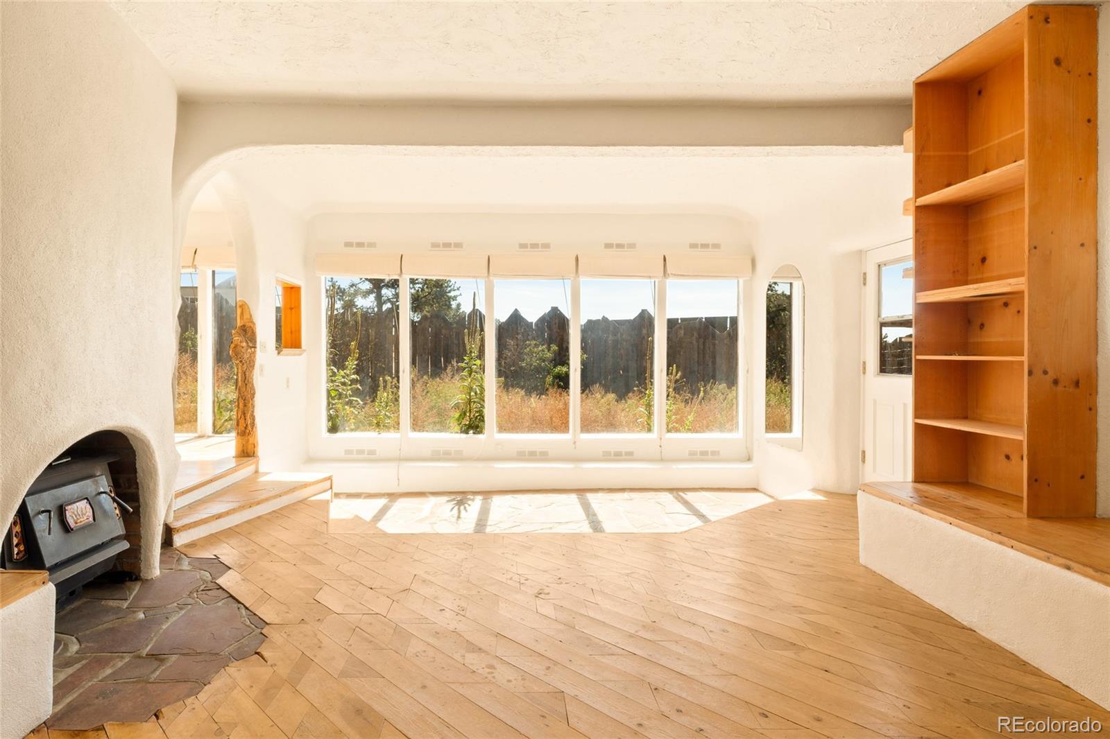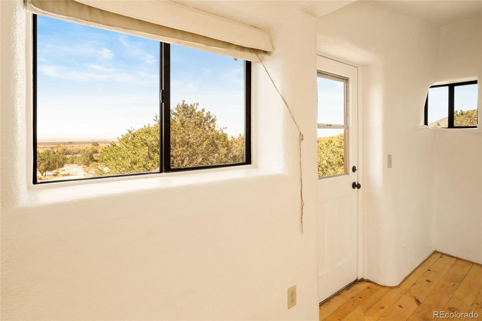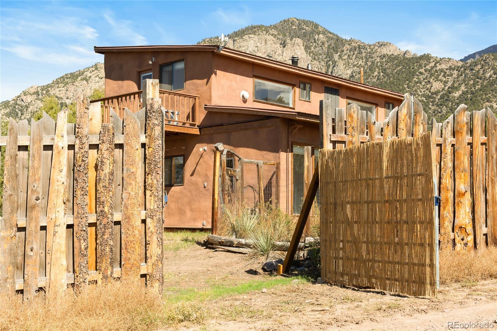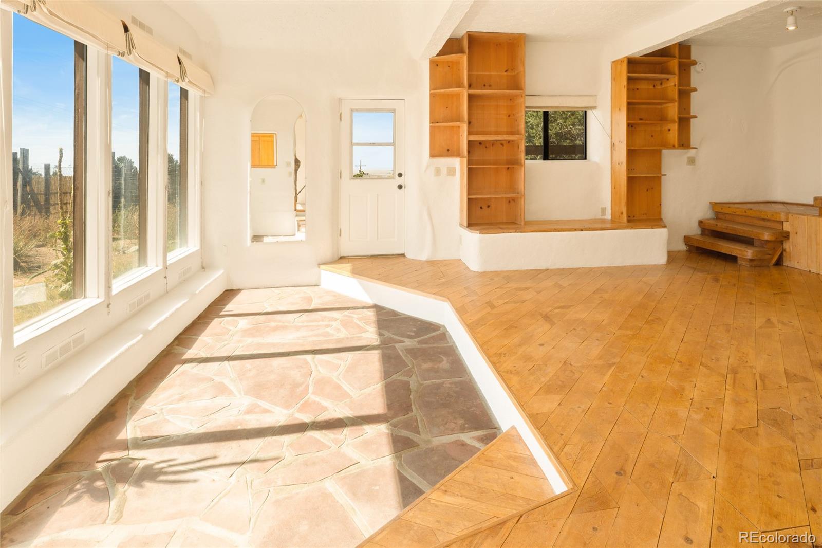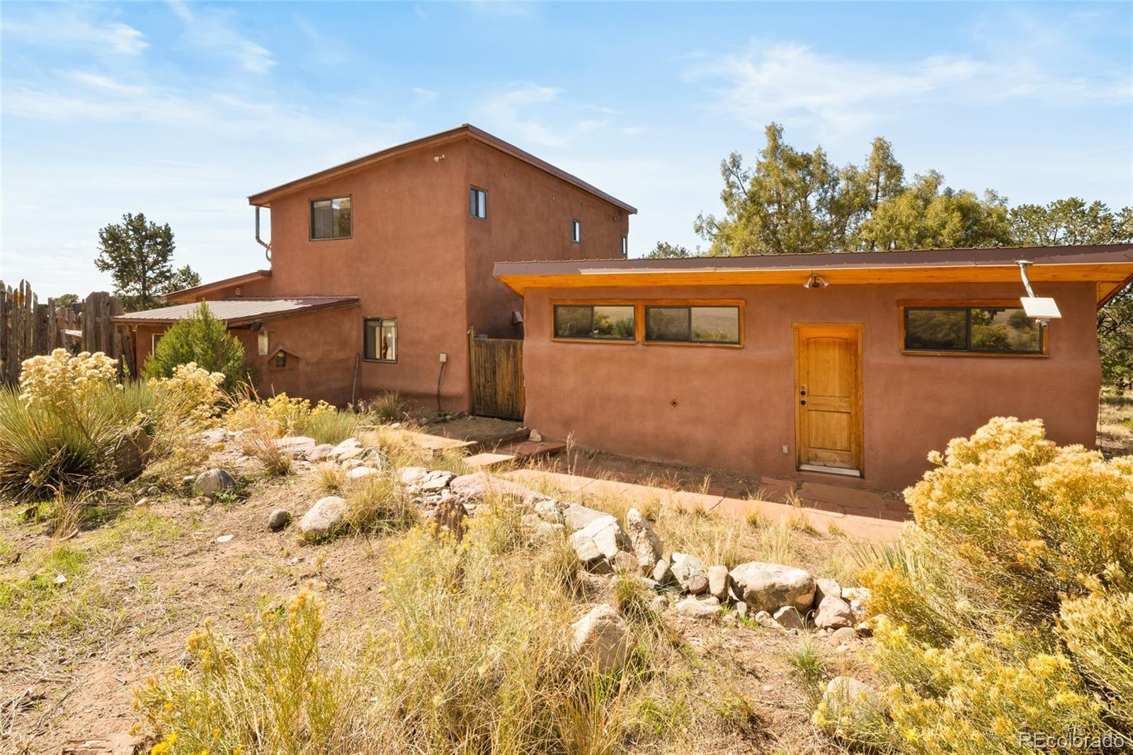 Situated on a beautiful .98 acre treed parcel in the Town of Crestone, this 2 bed/1.5 ba light filled home is Priced to Sell! Lovingly built by local artist Roy Gould, his craftsmanship is displayed in beautiful and meticulously designed wood floors gracing both upstairs and down, while unique sculpted wall elements peek out whimsically throughout the space. Downstairs features an enclosed mudroom, a spacious kitchen with attached laundry closet (and a new dryer), full bath with new toilet. The Sun Room's slate floor, floor drain and huge south facing windows make is a perfect space to grow plants all year, and provide ample passive solar gain in the winter to help heat the house. The living room includes multiple built in features around the wood stove, back stairs and floor for storage, and air ducts are ingeniously placed throughout this space into the second floor to encourage air flow and heat exchange. Upstairs, the first bedroom doubled as an art studio, so a large wash basin is tucked in the corner to wash any size brush or art implement. The attached balcony is planked with synthetic wood for years of sustained use, and faces the valley and expansive skies, as well as the gardens below. The second bedroom includes both a sink and a water closet in the space, and beautiful mountain views from the perimeter windows. A small detached studio provides two additional rooms for storage or art-creation, and double as a water storage/pump house. Huge outdoor areas for gardening, and the majority of the lot remains untouched, perfect for further expansion or a garage/shop. Walk two blocks for groceries, the hardware store, and shops. Across the street from the Crestone Charter School, and a 5 minute drive to the trailhead for stunning mountain hikes. Come discover the beautiful and secluded town of Crestone for your mountain retreat! Check out the Matterport tour or schedule a tour in person to experience the house today!