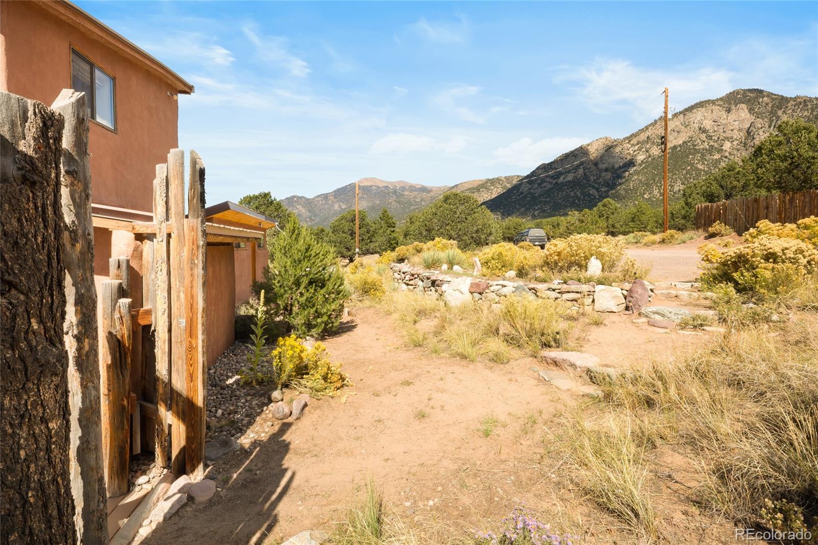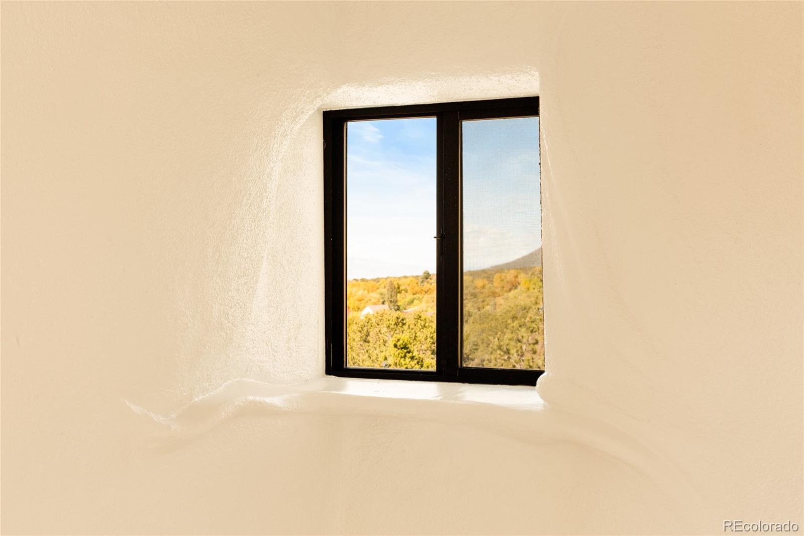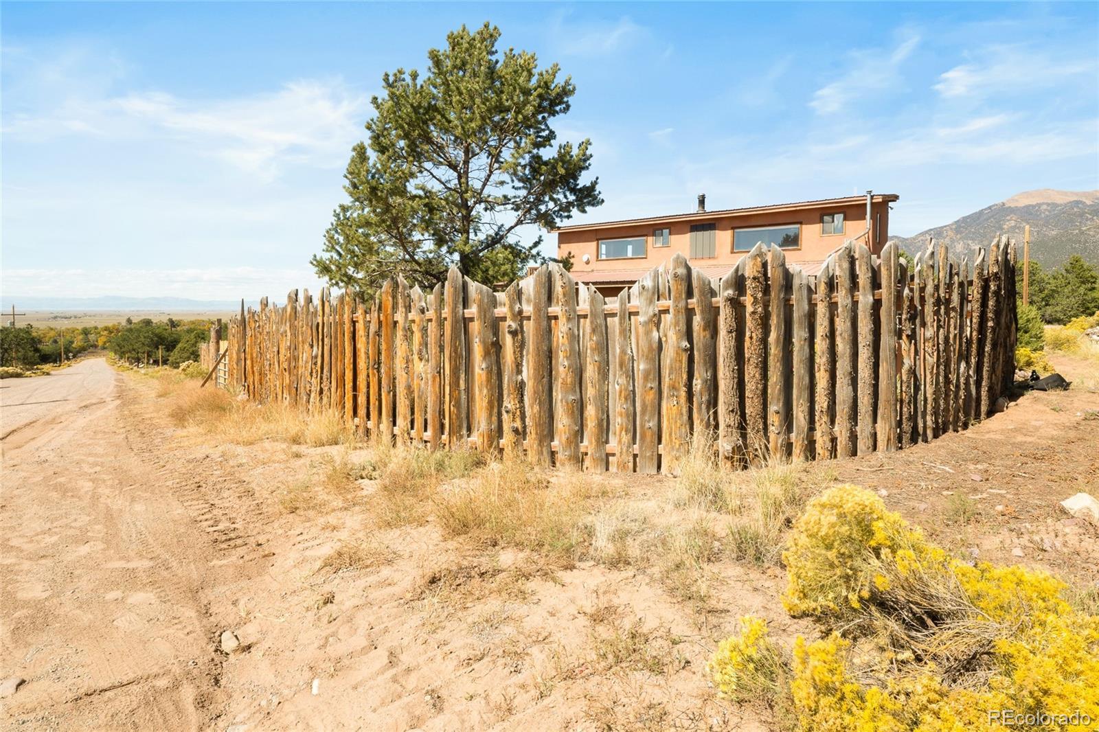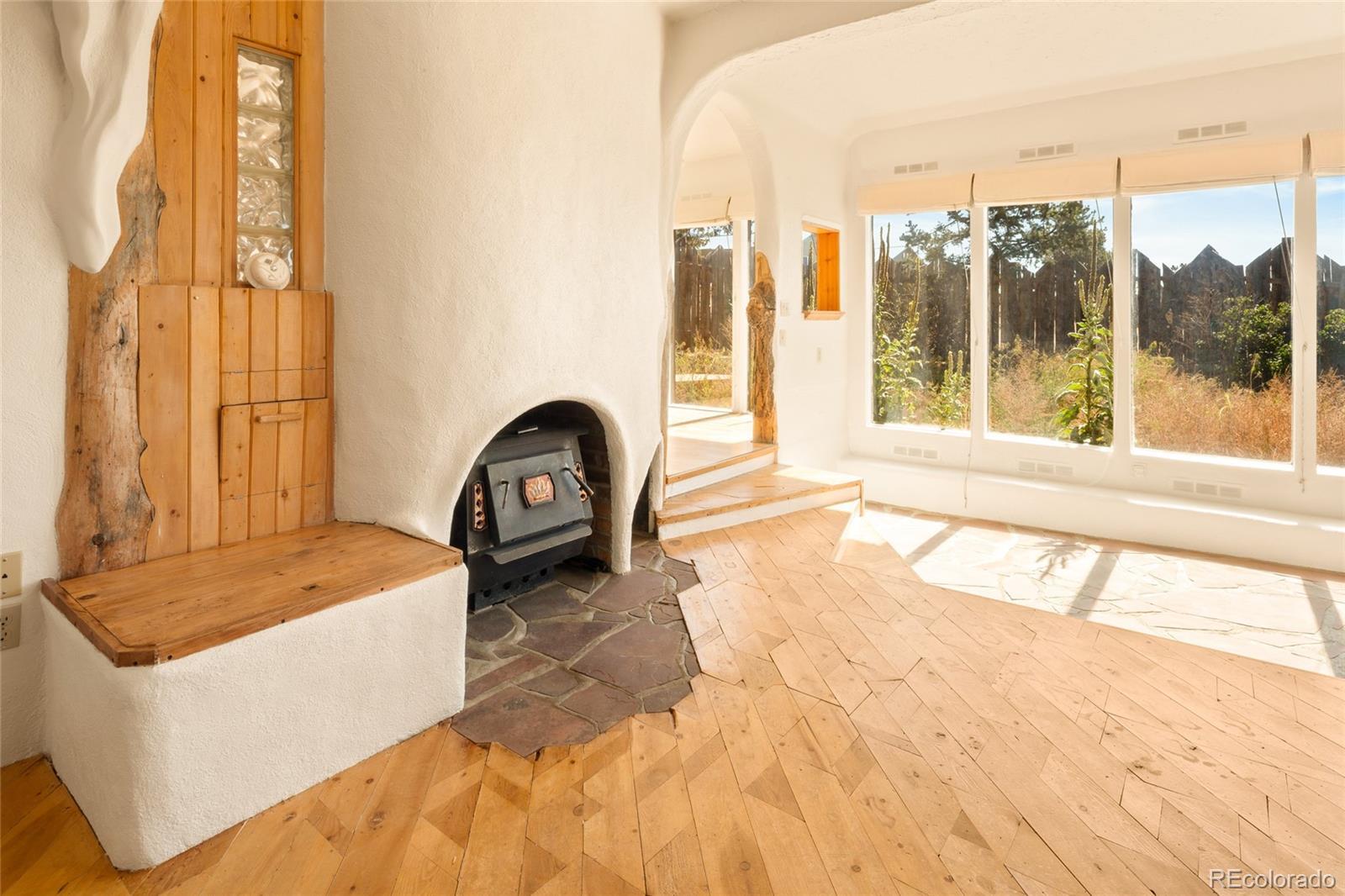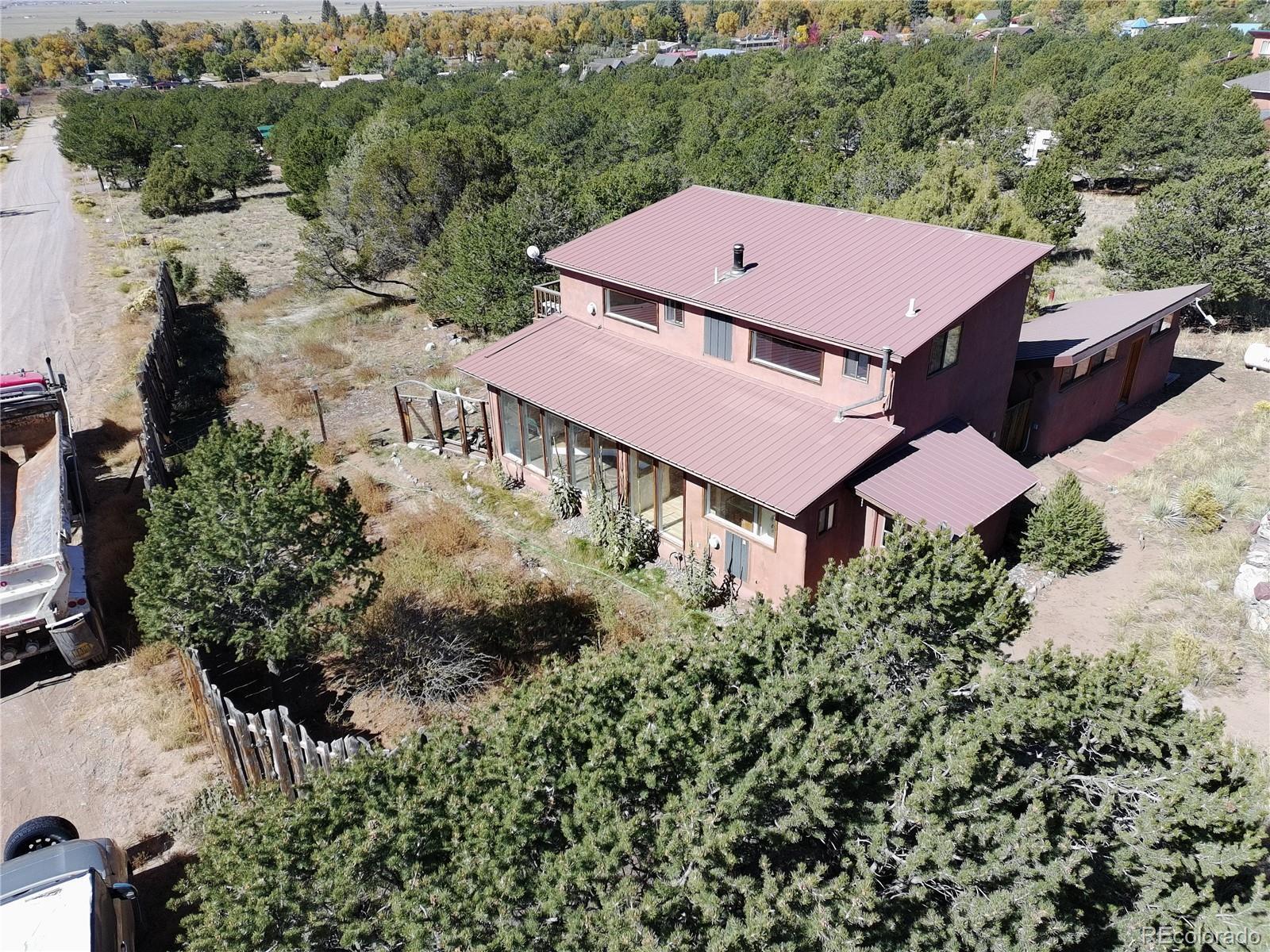 Situated on a beautiful .98 acre treed parcel in the Town of Crestone, this 2 bed/1.5 ba light filled home is Priced to Sell! Lovingly built by local artist Roy Gould, his craftsmanship is displayed in beautiful and meticulously designed wood floors gracing both upstairs and down, while unique sculpted wall elements peek out whimsically throughout the space. Downstairs features an enclosed mudroom, a spacious kitchen with attached laundry closet (and a new dryer), full bath with new toilet. The Sun Room's slate floor, floor drain and huge south facing windows make is a perfect space to grow plants all year, and provide ample passive solar gain in the winter to help heat the house. The living room includes multiple built in features around the wood stove, back stairs and floor for storage, and air ducts are ingeniously placed throughout this space into the second floor to encourage air flow and heat exchange. Upstairs, the first bedroom doubled as an art studio, so a large wash basin is tucked in the corner to wash any size brush or art implement. The attached balcony is planked with synthetic wood for years of sustained use, and faces the valley and expansive skies, as well as the gardens below. The second bedroom includes both a sink and a water closet in the space, and beautiful mountain views from the perimeter windows. A small detached studio provides two additional rooms for storage or art-creation, and double as a water storage/pump house. Huge outdoor areas for gardening, and the majority of the lot remains untouched, perfect for further expansion or a garage/shop. Walk two blocks for groceries, the hardware store, and shops. Across the street from the Crestone Charter School, and a 5 minute drive to the trailhead for stunning mountain hikes. Come discover the beautiful and secluded town of Crestone for your mountain retreat! Check out the Matterport tour or schedule a tour in person to experience the house today!