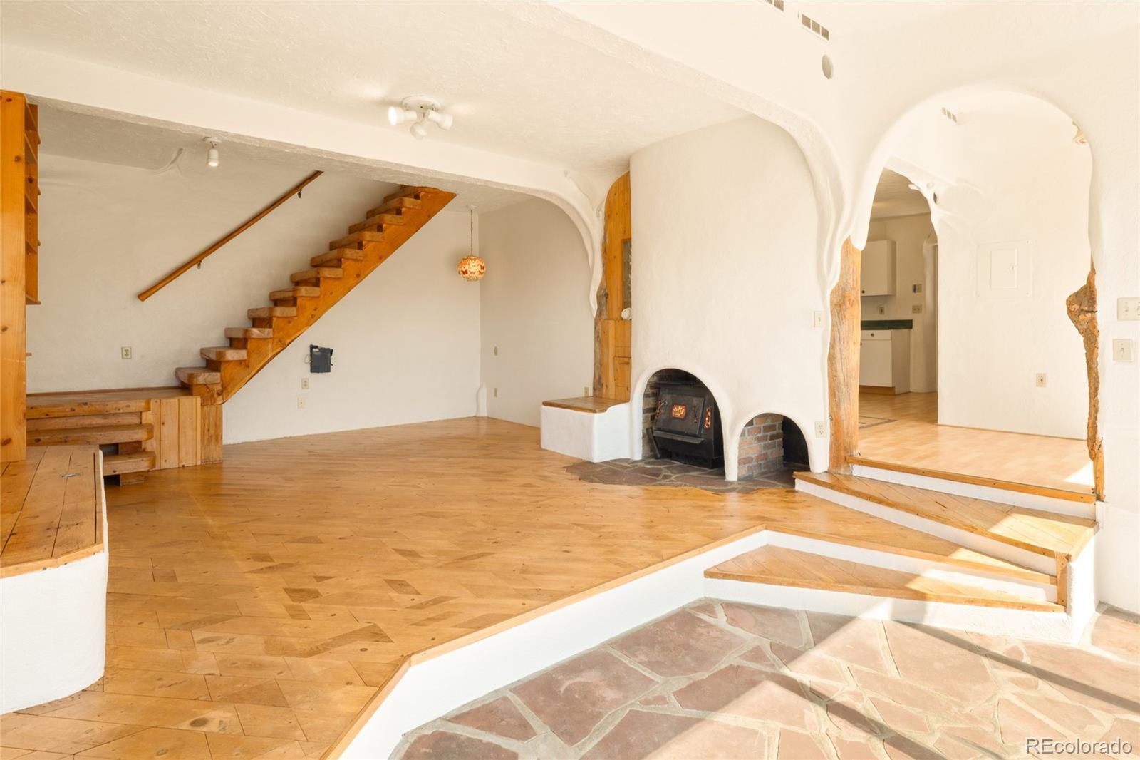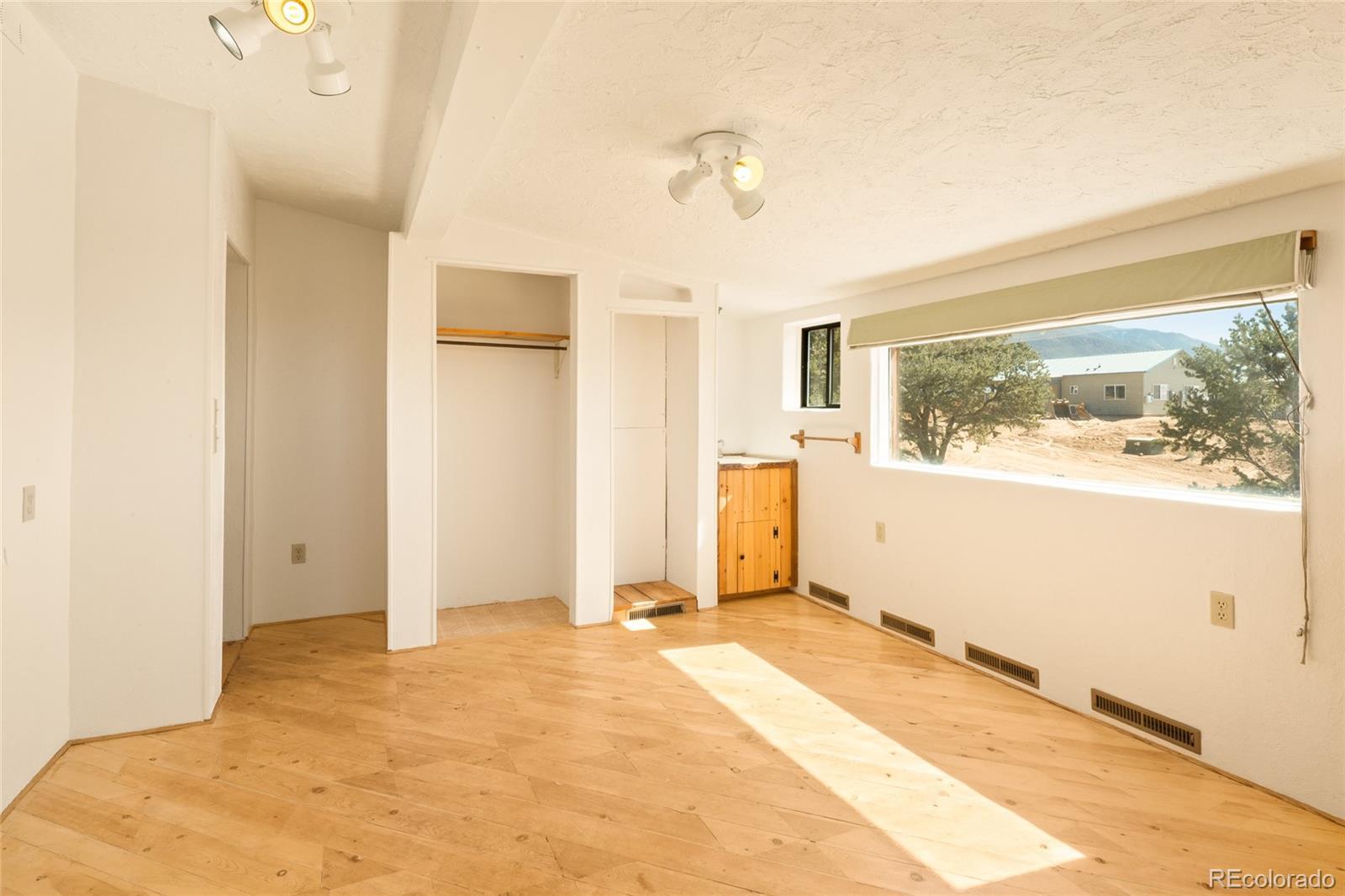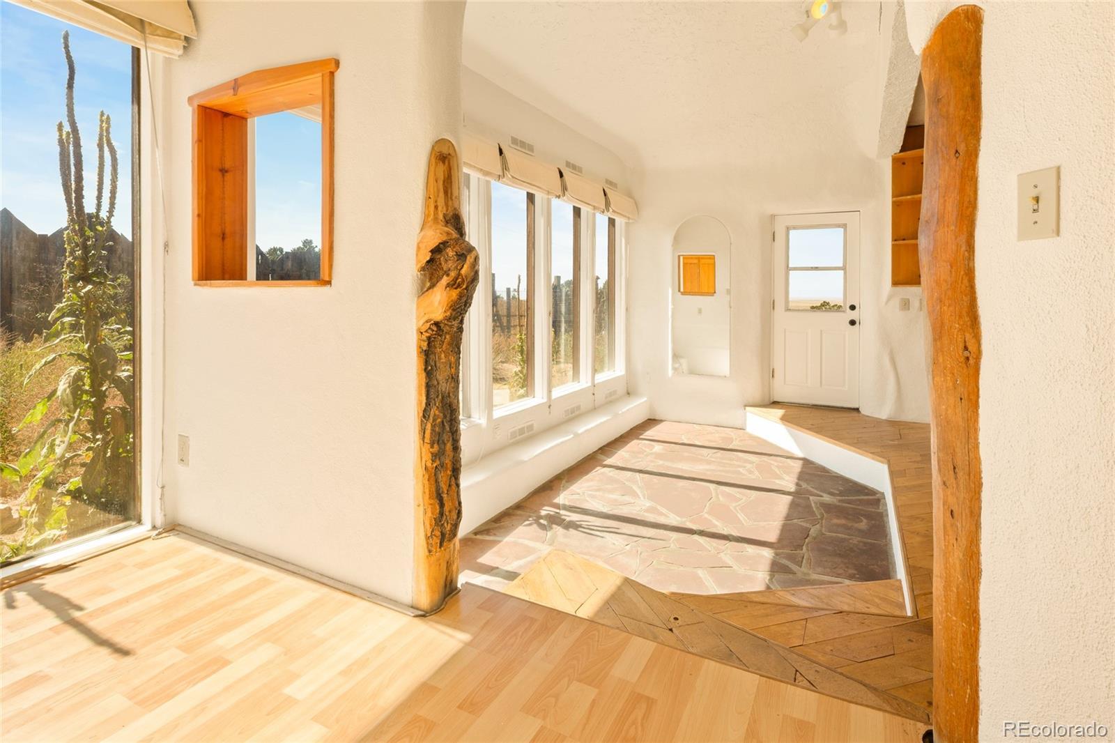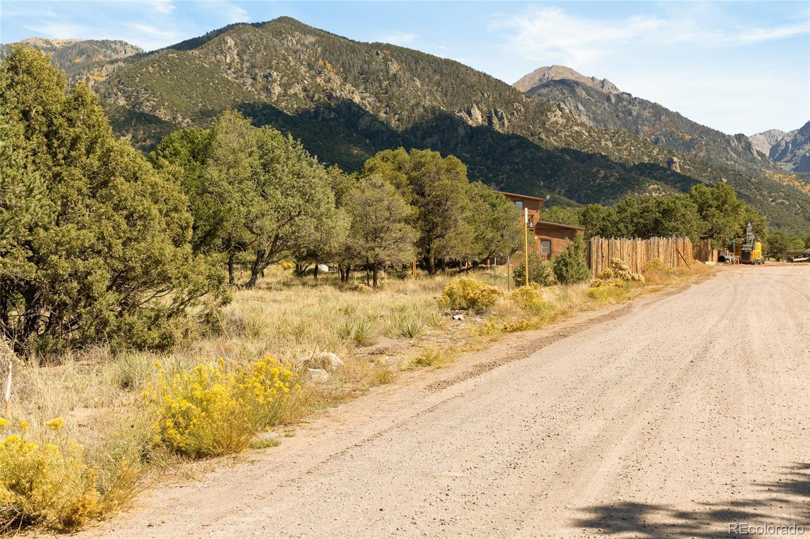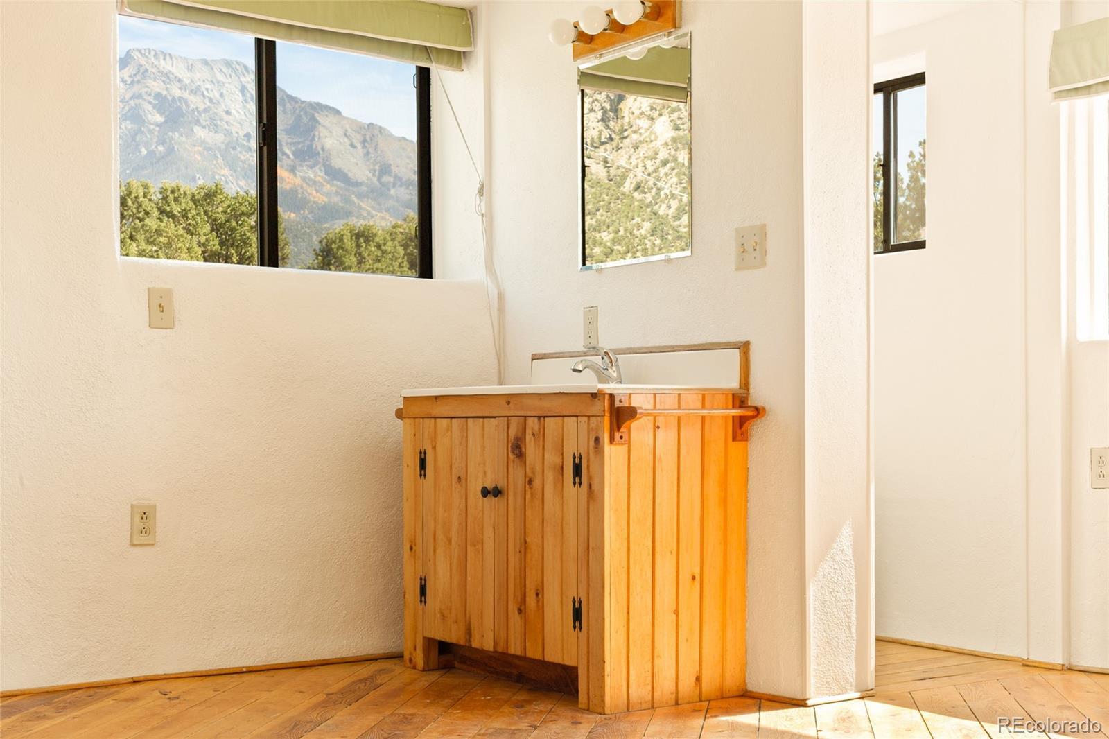 Situated on a beautiful .98 acre treed parcel in the Town of Crestone, this 2 bed/1.5 ba light filled home is Priced to Sell! Lovingly built by local artist Roy Gould, his craftsmanship is displayed in beautiful and meticulously designed wood floors gracing both upstairs and down, while unique sculpted wall elements peek out whimsically throughout the space. Downstairs features an enclosed mudroom, a spacious kitchen with attached laundry closet (and a new dryer), full bath with new toilet. The Sun Room's slate floor, floor drain and huge south facing windows make is a perfect space to grow plants all year, and provide ample passive solar gain in the winter to help heat the house. The living room includes multiple built in features around the wood stove, back stairs and floor for storage, and air ducts are ingeniously placed throughout this space into the second floor to encourage air flow and heat exchange. Upstairs, the first bedroom doubled as an art studio, so a large wash basin is tucked in the corner to wash any size brush or art implement. The attached balcony is planked with synthetic wood for years of sustained use, and faces the valley and expansive skies, as well as the gardens below. The second bedroom includes both a sink and a water closet in the space, and beautiful mountain views from the perimeter windows. A small detached studio provides two additional rooms for storage or art-creation, and double as a water storage/pump house. Huge outdoor areas for gardening, and the majority of the lot remains untouched, perfect for further expansion or a garage/shop. Walk two blocks for groceries, the hardware store, and shops. Across the street from the Crestone Charter School, and a 5 minute drive to the trailhead for stunning mountain hikes. Come discover the beautiful and secluded town of Crestone for your mountain retreat! Check out the Matterport tour or schedule a tour in person to experience the house today!