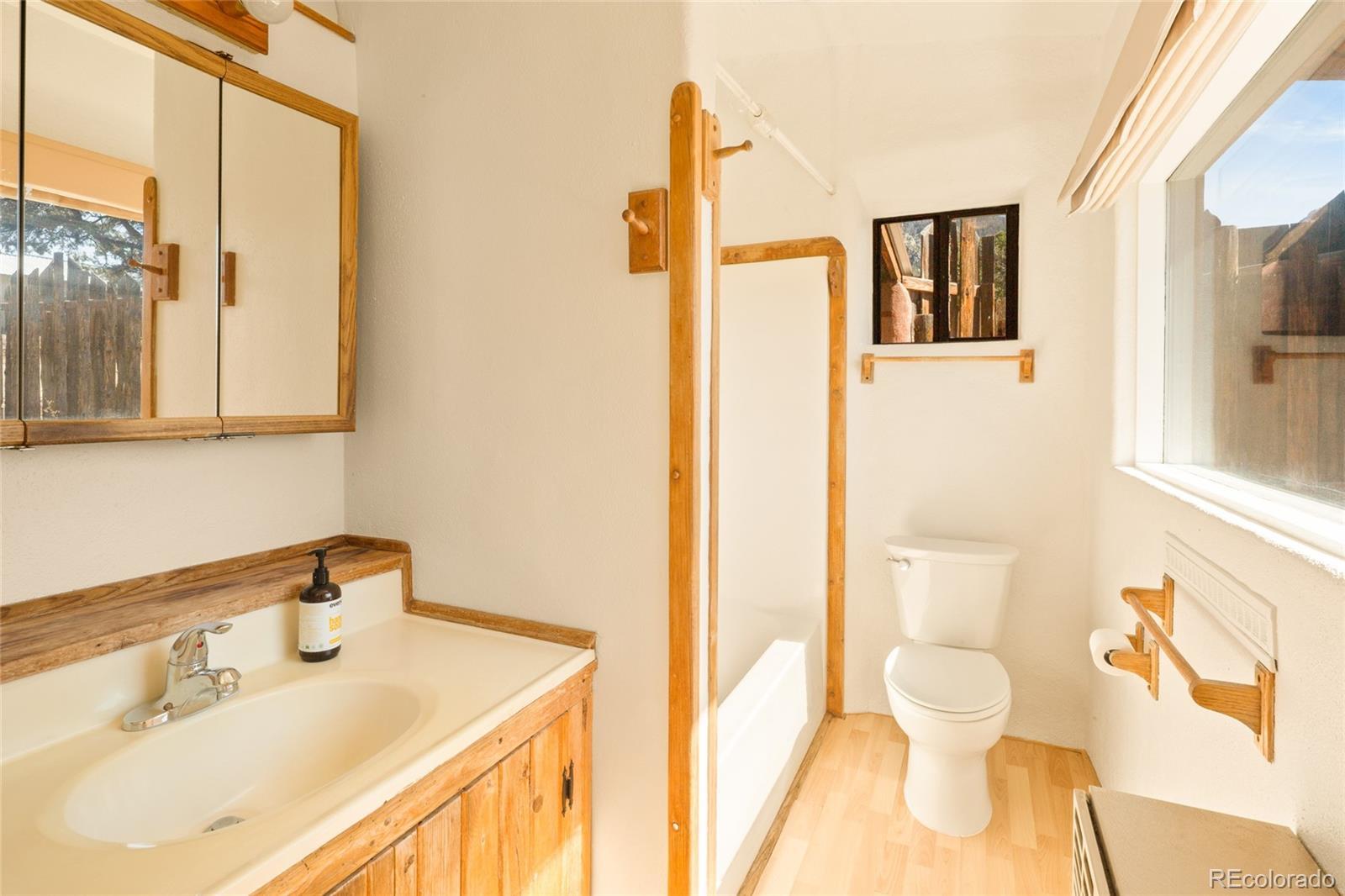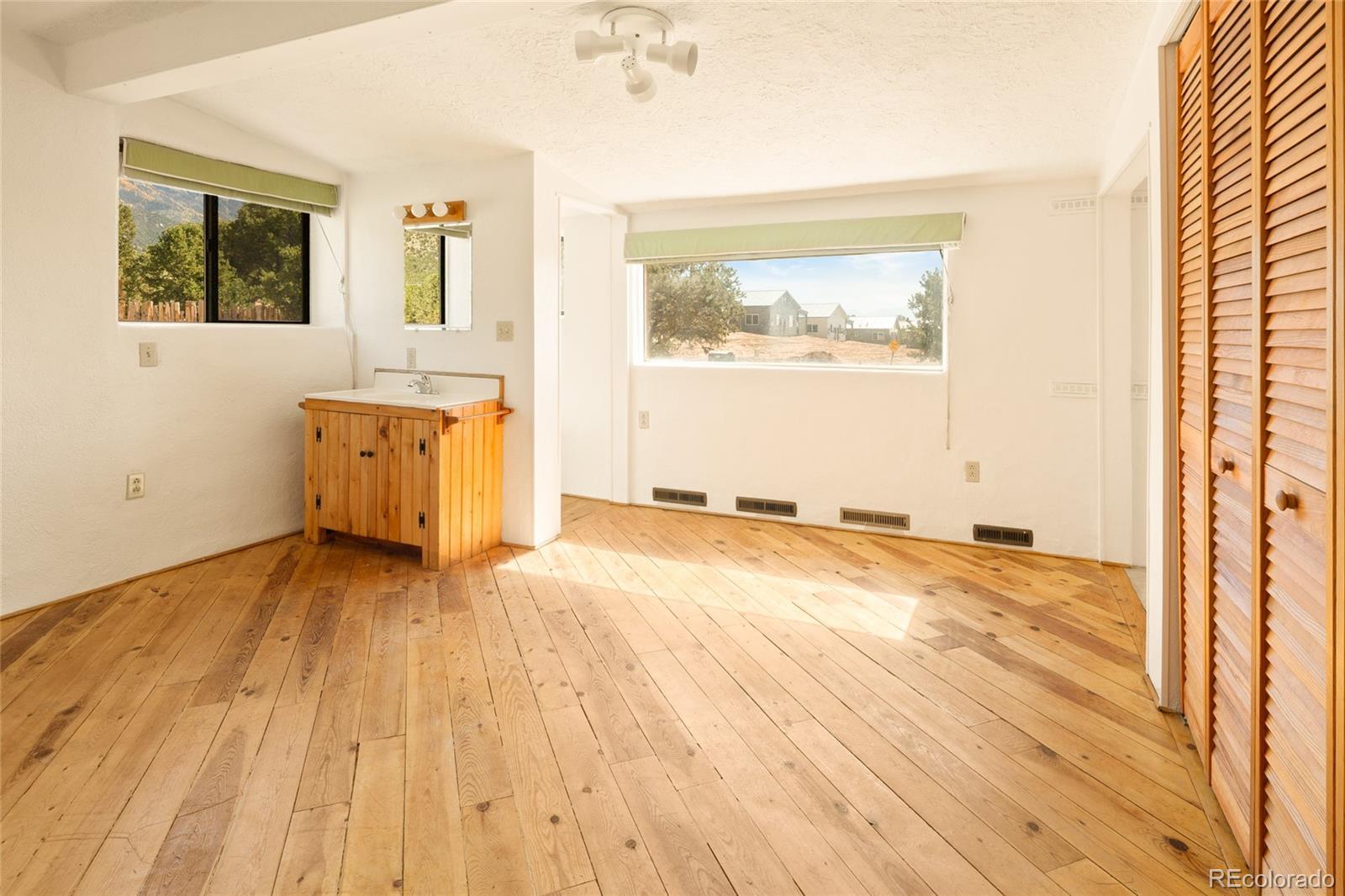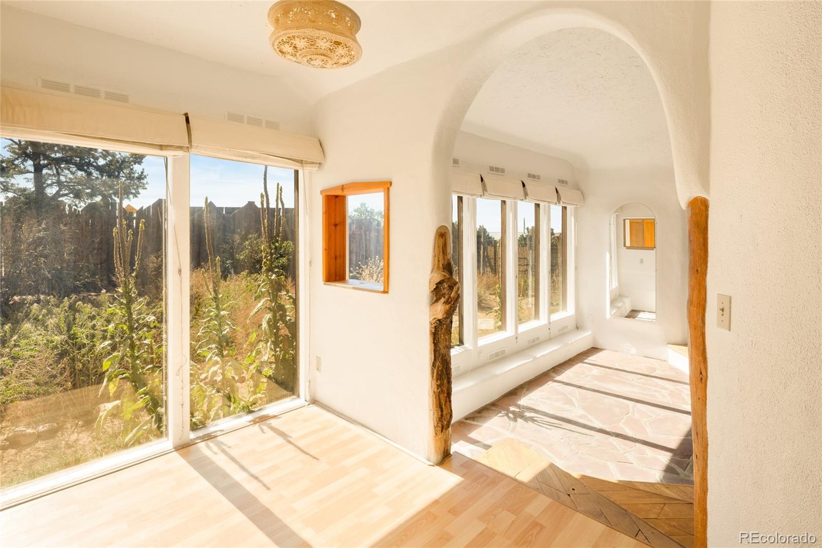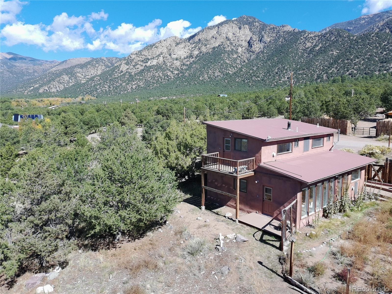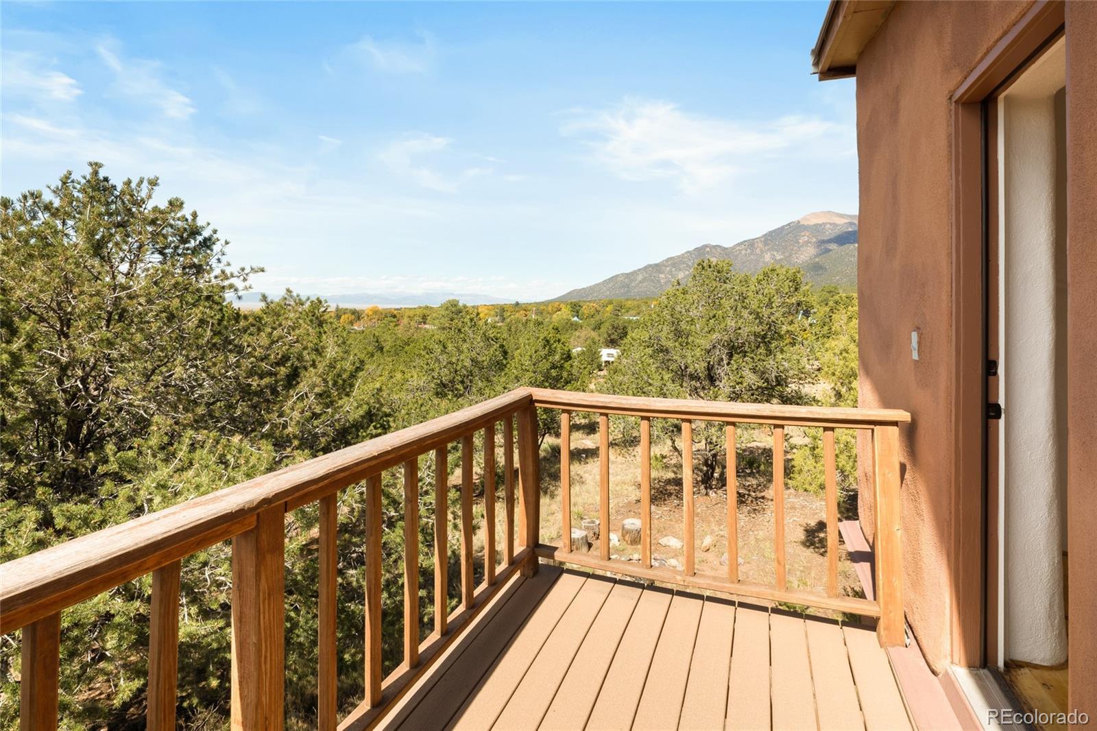 Situated on a beautiful .98 acre treed parcel in the Town of Crestone, this 2 bed/1.5 ba light filled home is Priced to Sell! Lovingly built by local artist Roy Gould, his craftsmanship is displayed in beautiful and meticulously designed wood floors gracing both upstairs and down, while unique sculpted wall elements peek out whimsically throughout the space. Downstairs features an enclosed mudroom, a spacious kitchen with attached laundry closet (and a new dryer), full bath with new toilet. The Sun Room's slate floor, floor drain and huge south facing windows make is a perfect space to grow plants all year, and provide ample passive solar gain in the winter to help heat the house. The living room includes multiple built in features around the wood stove, back stairs and floor for storage, and air ducts are ingeniously placed throughout this space into the second floor to encourage air flow and heat exchange. Upstairs, the first bedroom doubled as an art studio, so a large wash basin is tucked in the corner to wash any size brush or art implement. The attached balcony is planked with synthetic wood for years of sustained use, and faces the valley and expansive skies, as well as the gardens below. The second bedroom includes both a sink and a water closet in the space, and beautiful mountain views from the perimeter windows. A small detached studio provides two additional rooms for storage or art-creation, and double as a water storage/pump house. Huge outdoor areas for gardening, and the majority of the lot remains untouched, perfect for further expansion or a garage/shop. Walk two blocks for groceries, the hardware store, and shops. Across the street from the Crestone Charter School, and a 5 minute drive to the trailhead for stunning mountain hikes. Come discover the beautiful and secluded town of Crestone for your mountain retreat! Check out the Matterport tour or schedule a tour in person to experience the house today!
