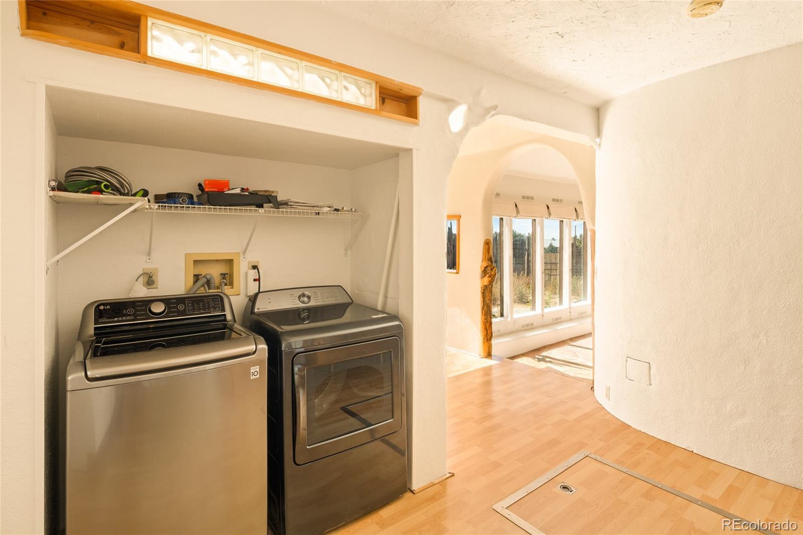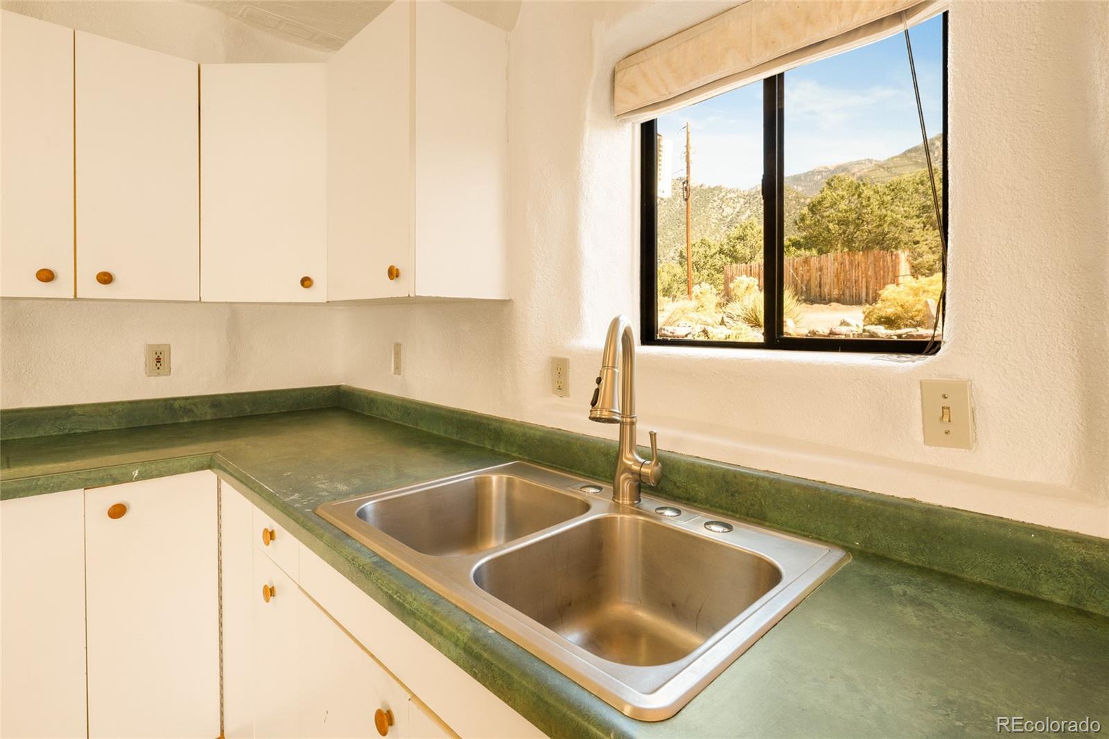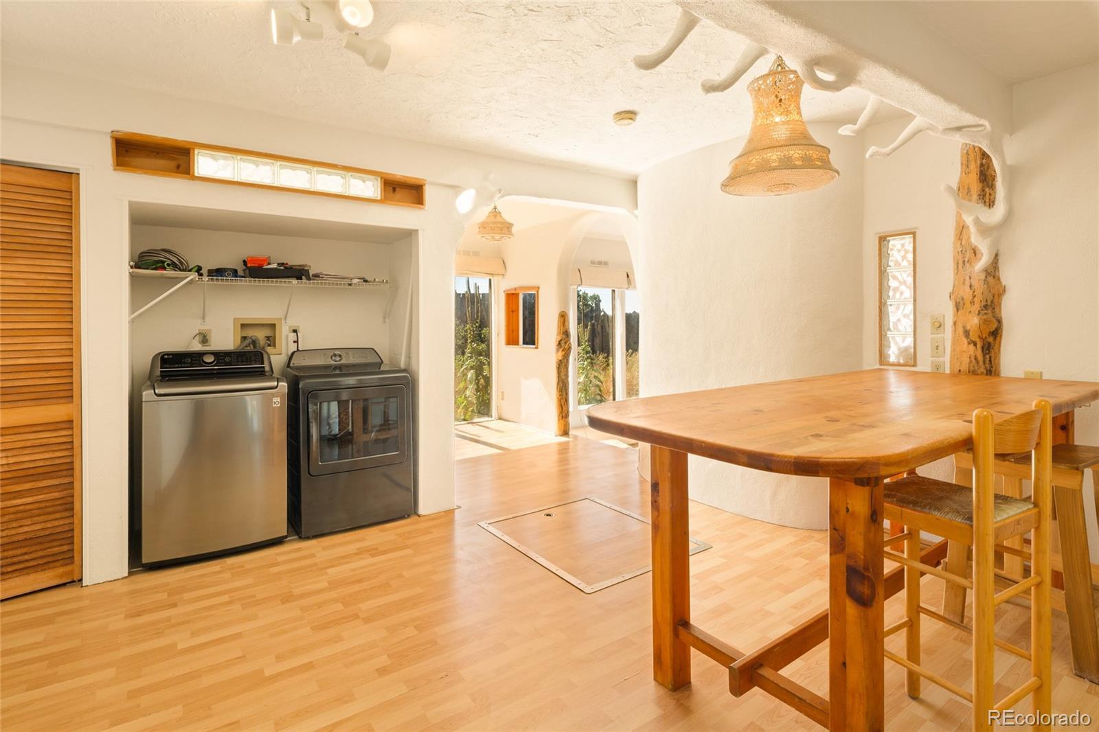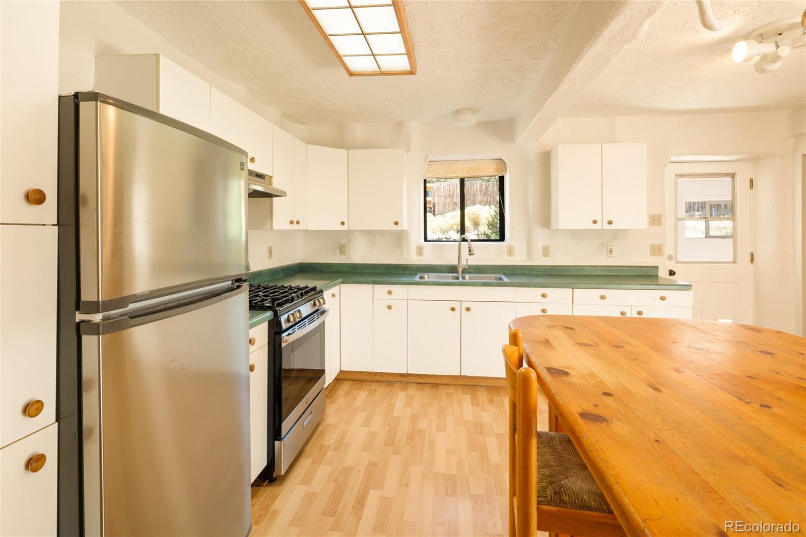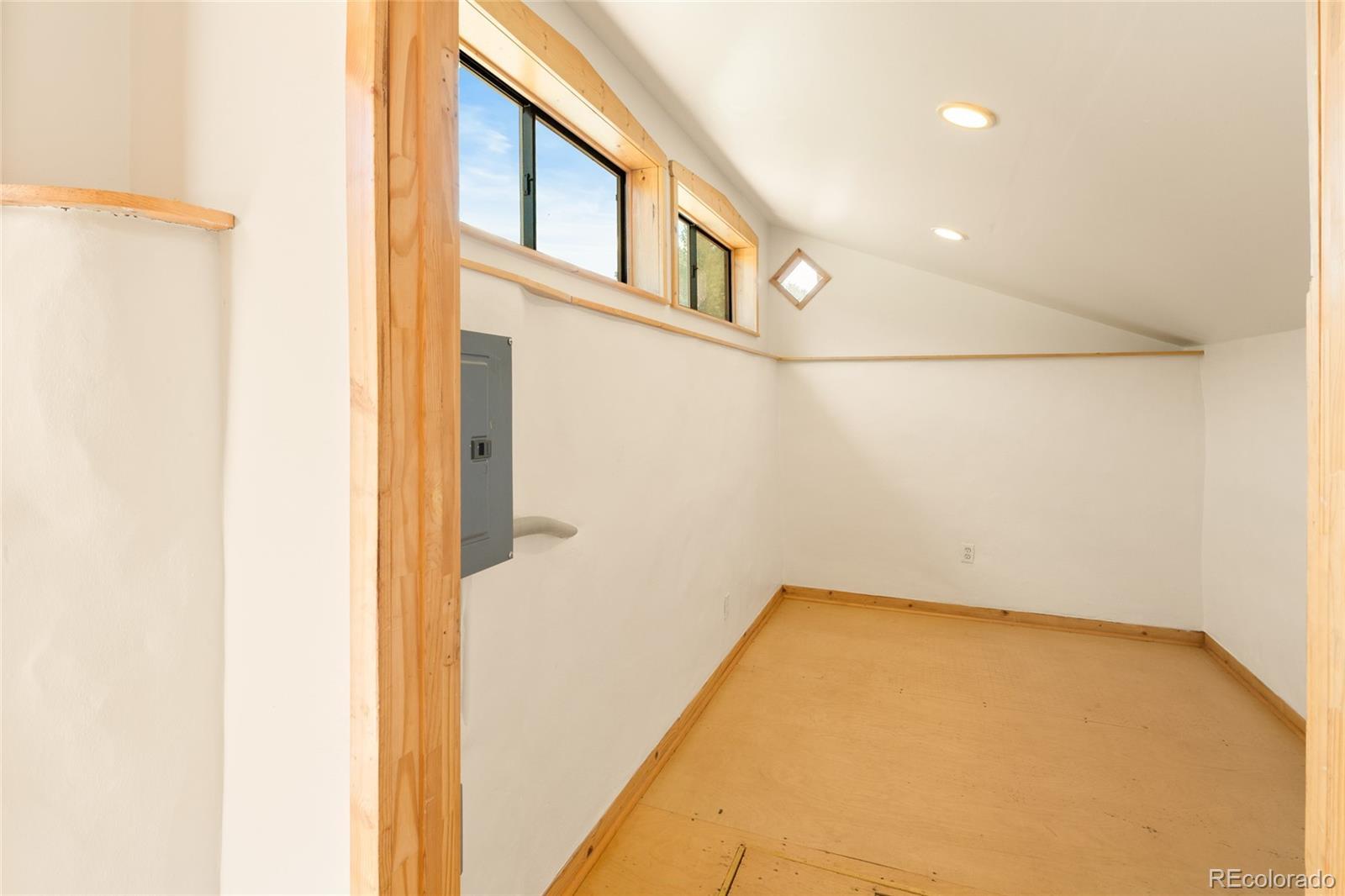 Situated on a beautiful .98 acre treed parcel in the Town of Crestone, this 2 bed/1.5 ba light filled home is Priced to Sell! Lovingly built by local artist Roy Gould, his craftsmanship is displayed in beautiful and meticulously designed wood floors gracing both upstairs and down, while unique sculpted wall elements peek out whimsically throughout the space. Downstairs features an enclosed mudroom, a spacious kitchen with attached laundry closet (and a new dryer), full bath with new toilet. The Sun Room's slate floor, floor drain and huge south facing windows make is a perfect space to grow plants all year, and provide ample passive solar gain in the winter to help heat the house. The living room includes multiple built in features around the wood stove, back stairs and floor for storage, and air ducts are ingeniously placed throughout this space into the second floor to encourage air flow and heat exchange. Upstairs, the first bedroom doubled as an art studio, so a large wash basin is tucked in the corner to wash any size brush or art implement. The attached balcony is planked with synthetic wood for years of sustained use, and faces the valley and expansive skies, as well as the gardens below. The second bedroom includes both a sink and a water closet in the space, and beautiful mountain views from the perimeter windows. A small detached studio provides two additional rooms for storage or art-creation, and double as a water storage/pump house. Huge outdoor areas for gardening, and the majority of the lot remains untouched, perfect for further expansion or a garage/shop. Walk two blocks for groceries, the hardware store, and shops. Across the street from the Crestone Charter School, and a 5 minute drive to the trailhead for stunning mountain hikes. Come discover the beautiful and secluded town of Crestone for your mountain retreat! Check out the Matterport tour or schedule a tour in person to experience the house today!