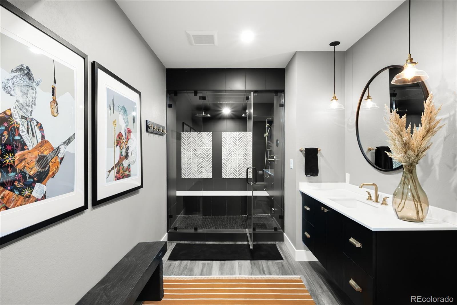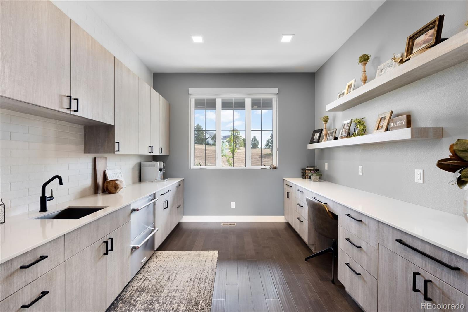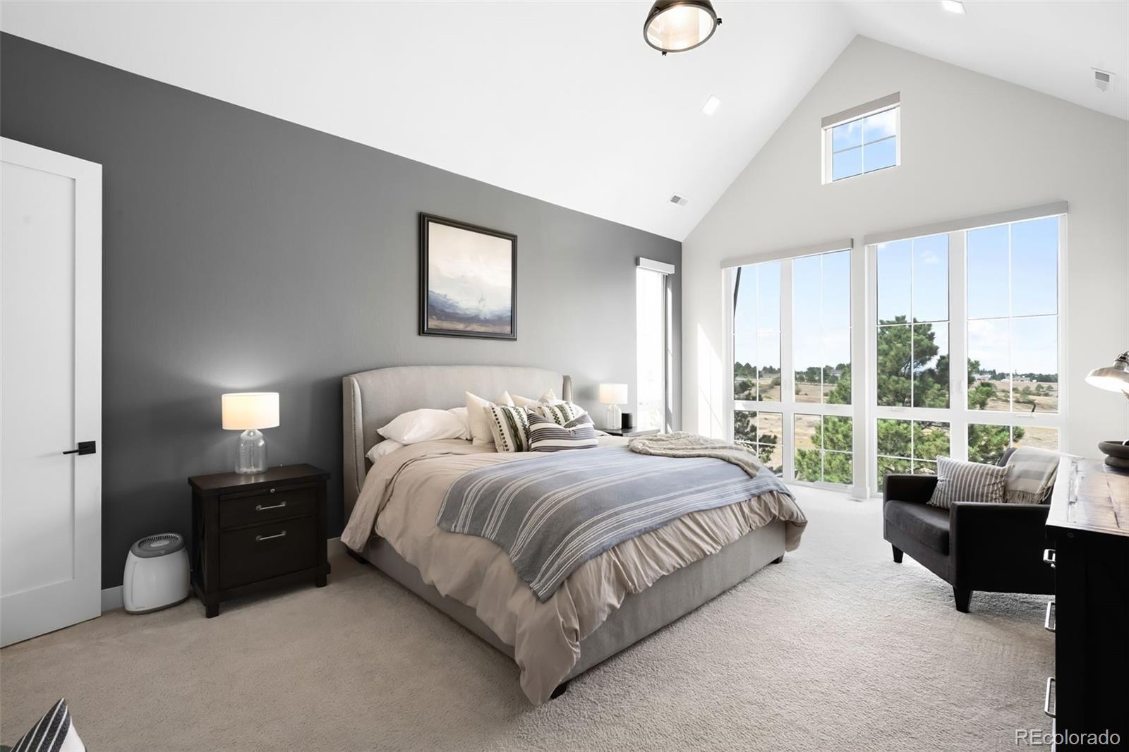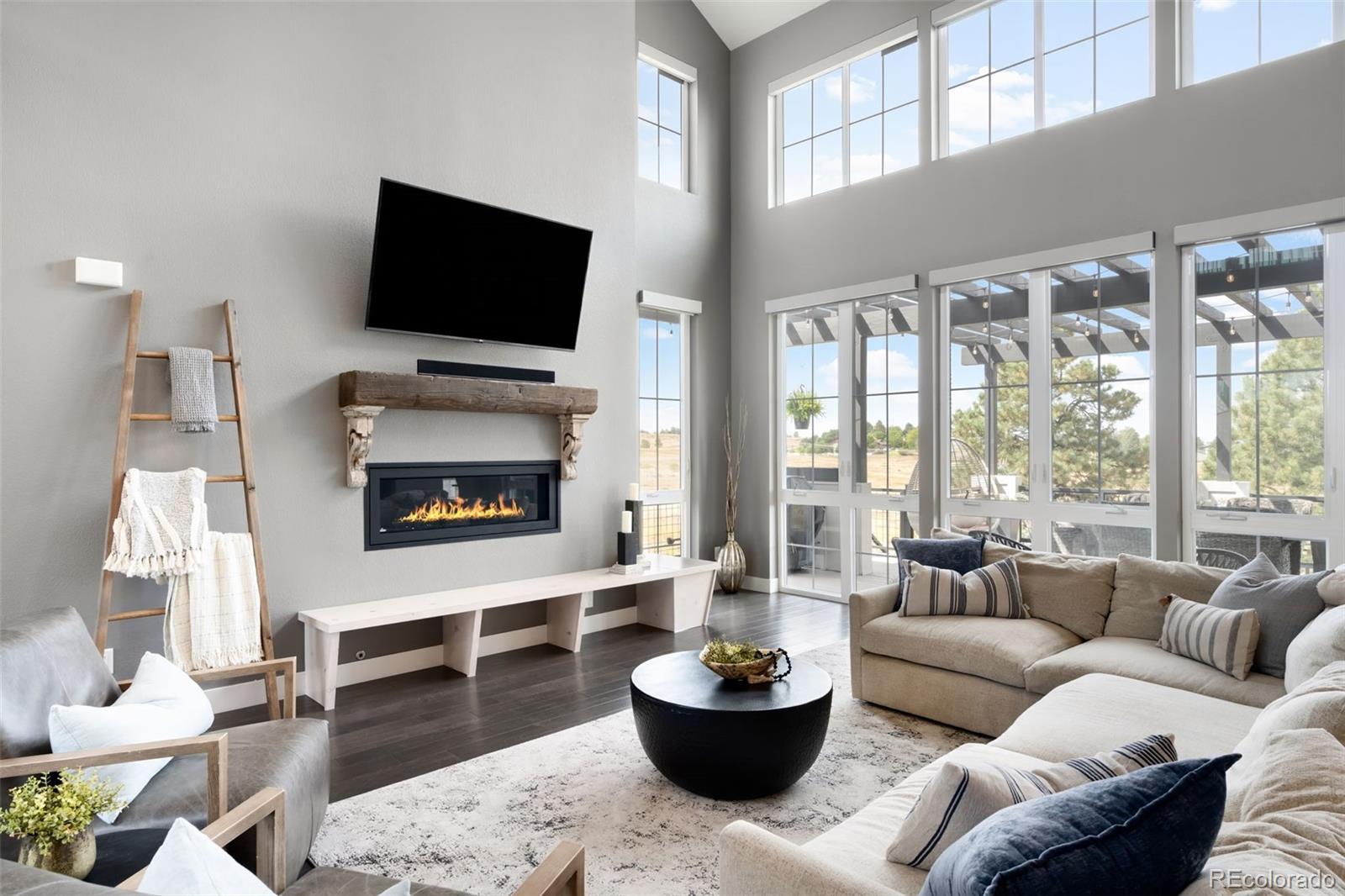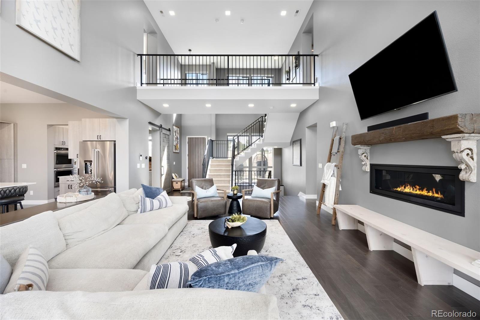 Welcome to 8203 Merryvale Trail – Set on a 1.51-acre, $150K professionally landscaped lot with 20+ new trees, two flagstone patios, and forever-protected open space to the South and West, this modern home offers the rare combination of panoramic mountain VIEWS and modern luxury intention. Inside, a wall of west-facing windows brings the outside in, showcasing sweeping views from EVERY LEVEL- even the basement. At the heart of the home, the chef’s kitchen dazzles with custom cabinetry, premium Brizo fixtures, pot filler, and double dishwashers/ovens. The prep kitchen adds a built-in desk/office, hidden walk-in pantry hid in the cabinets, and additional refrigeration drawers. Sliding glass doors open to a large covered deck with pergola and a gas grill connection. The main floor is designed for flexibility, featuring two bedrooms (one ensuite), a private office, and a transitional mudroom/bench space. Throughout the home, Restoration Hardware lighting, reclaimed wood barn doors, floating shelves, and a custom mantle with vintage corbels add elevated, mindful touches. Upstairs, the primary suite is a retreat with vaulted ceilings, a private patio, automated solar-charged blinds, a spa bath with floating cabinetry, under-cabinet lighting, and a steam shower with dual heads and wands, plus a spacious walk-in closet. The $200K FINISHED BASEMENT IS AN ENTERTAINERS DREAM: a full custom wet bar with JennAir beverage fridge and refrigeration drawers, game room, gym/flex bedroom with built-ins, reclaimed wood shelving, and MOUNTAIN VIEWS. The spa-inspired bath features a luxurious steam shower, while dual storage rooms with built-in shelving ensure everything has its place. Every element of this home was designed with intention—where luxury meets functionality and Colorado’s natural beauty takes center stage. Additional highlights: 70K in Custom Window Treatments, EV Charger 3 Car Garage with Epoxy Floors, New Roof 2022, Dual furnaces/AC, whole house humidifier and more!
