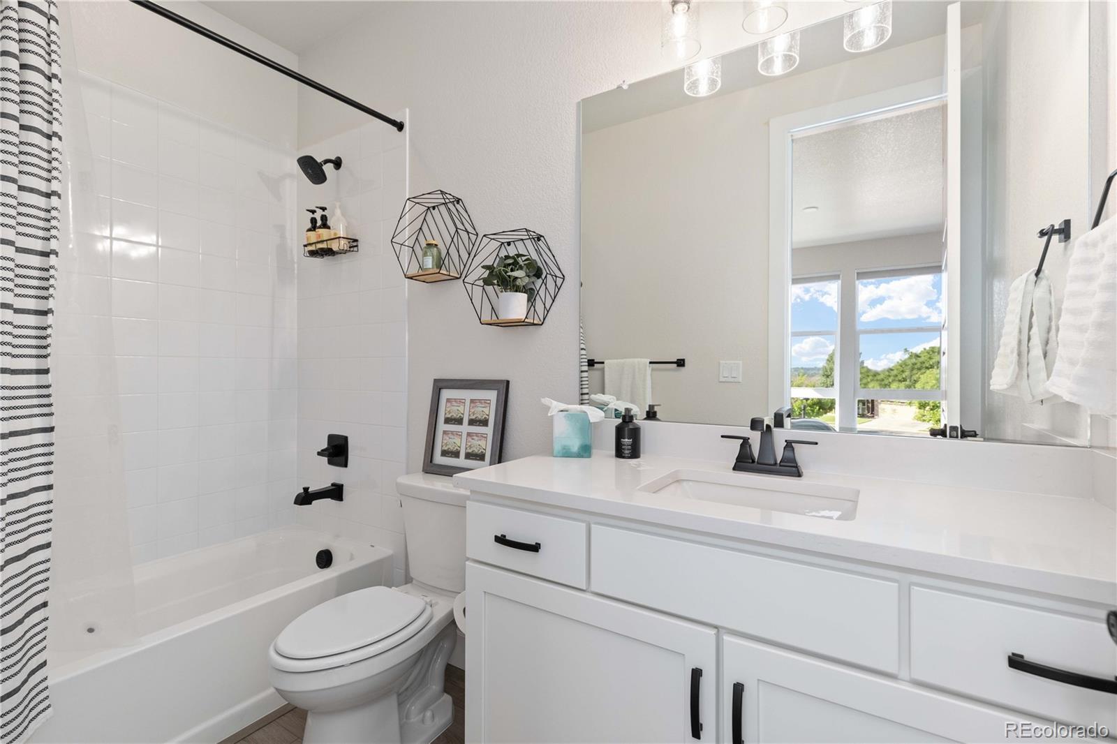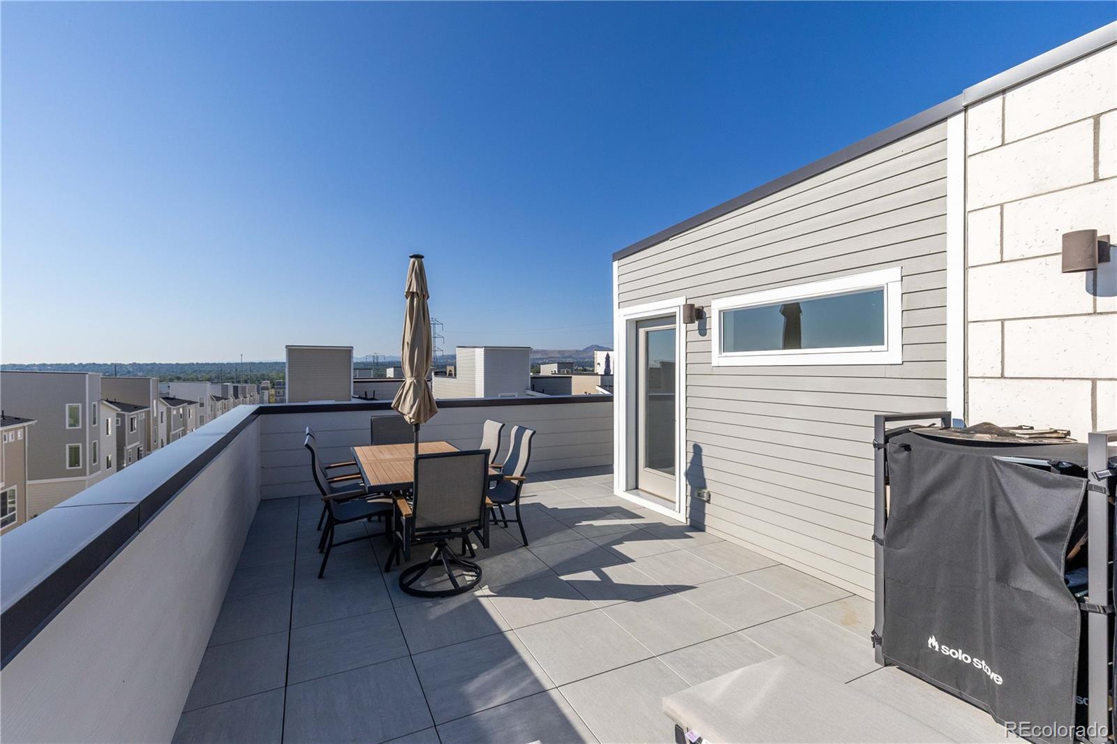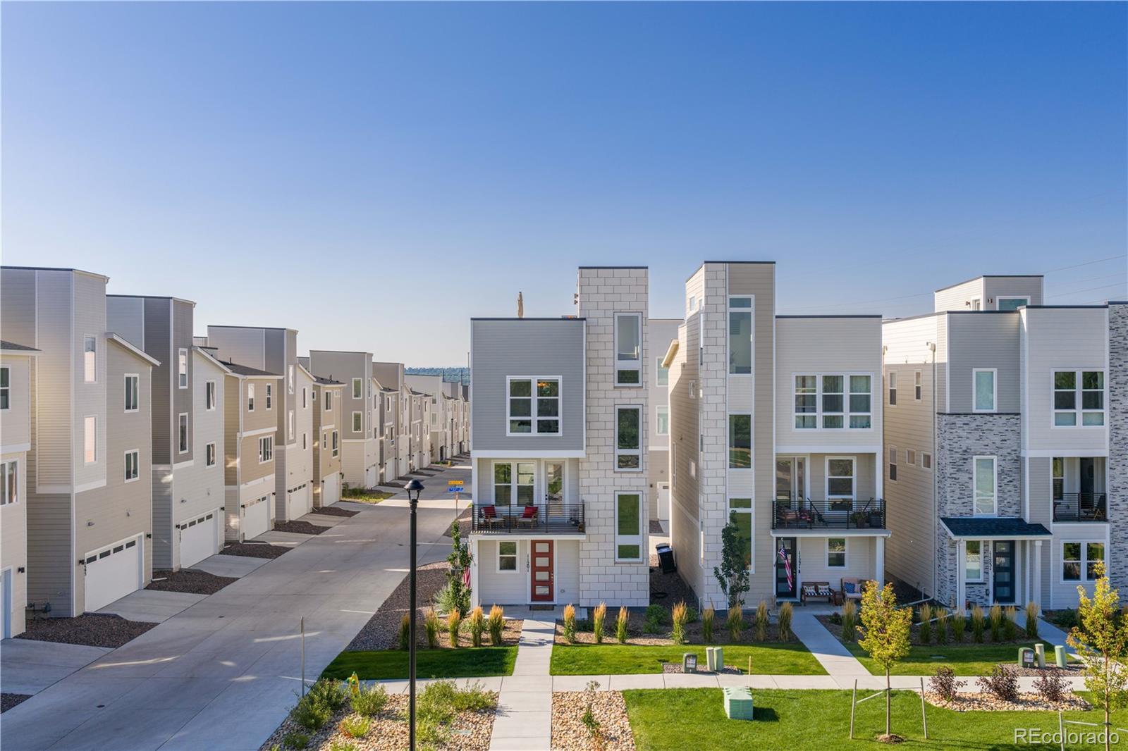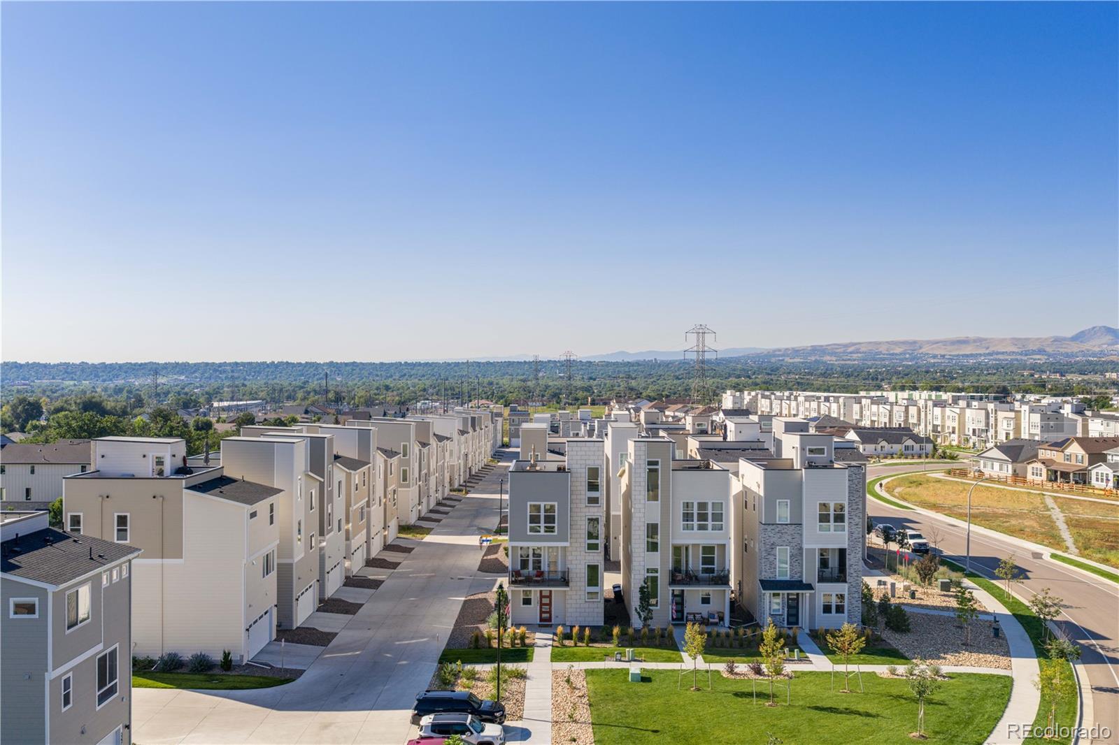 Assumable 5% VA loan! Welcome to this beautiful modern home in Arvada on a corner lot offering multiple levels of stylish and functional living space! The entry level features a dedicated office and access to the attached 2-car garage, complete with electric vehicle charging capability. Upstairs, the open main living area is filled with natural light. The living room opens to a private balcony with stunning mountain views, while the kitchen and dining area boast quartz countertops, a huge island with seating and sink, stainless steel appliances, a walk-in pantry, and a convenient half bath. A built-in desk provides an additional work or study space. On the third level, you’ll find two spacious bedrooms, each with its own en-suite bathroom—perfect for dual primary suites. Enjoy sweeping mountain views from the secondary bedroom, and a large walk-in closet in the primary. The top level is a true highlight: an expansive rooftop terrace with breathtaking panoramic mountain views, the ideal spot to relax or entertain while soaking up the Colorado sunshine. This home stands out with thoughtful upgrades throughout, including blackout custom-fit blinds in the primary and guest bedrooms, tankless water heater with copper piping, and a premium $8,500 appliance package with a high-end refrigerator, washer, and dryer—all included. The unique floor plan features an XL kitchen and a spacious primary bathroom, offering a layout that goes beyond the standard models. Enjoy an amazing community setting with access to the Stenger Sports Complex and Rainbow Bridge Park and Trail just down the street. Conveniently located near Olde Town Arvada’s farmers markets, shopping, and dining, with easy access to I-70 for quick trips to the mountains or downtown Denver, this home offers the perfect blend of modern comfort, stunning views, and unbeatable location! Buyer and Buyers Agent is responsible for verifying all information, measurements, school and HOA/fee/regulations.