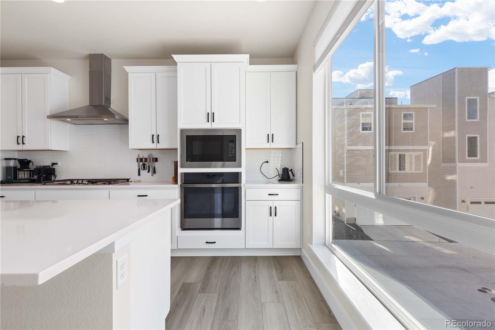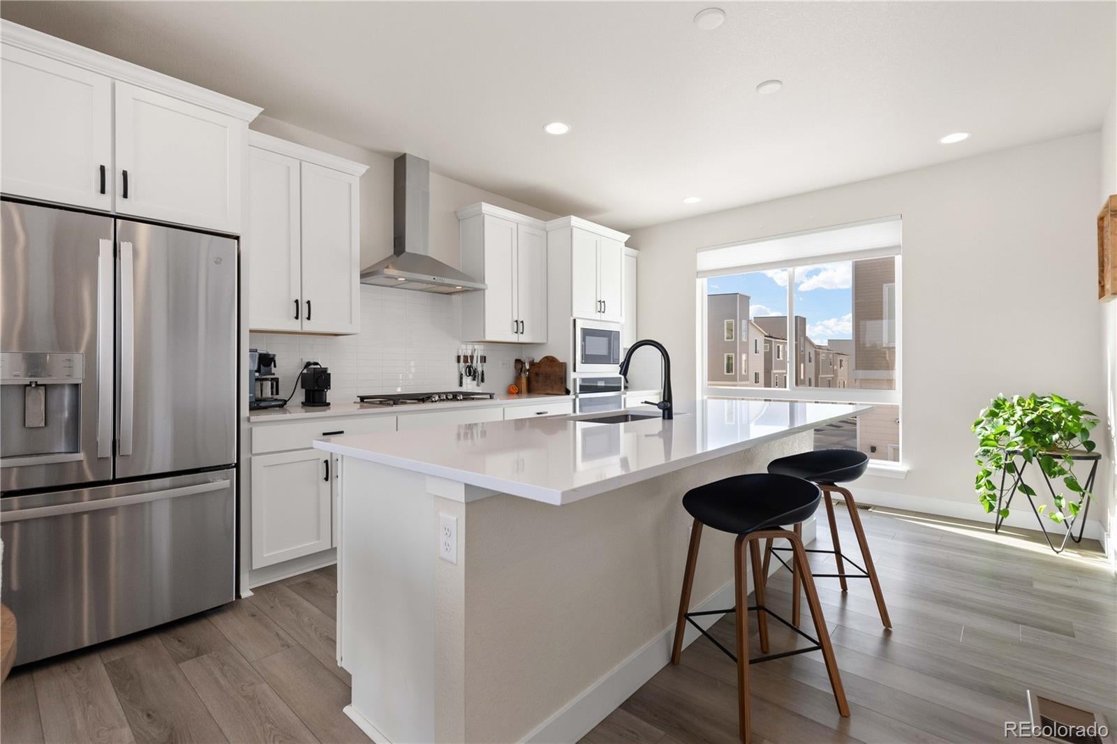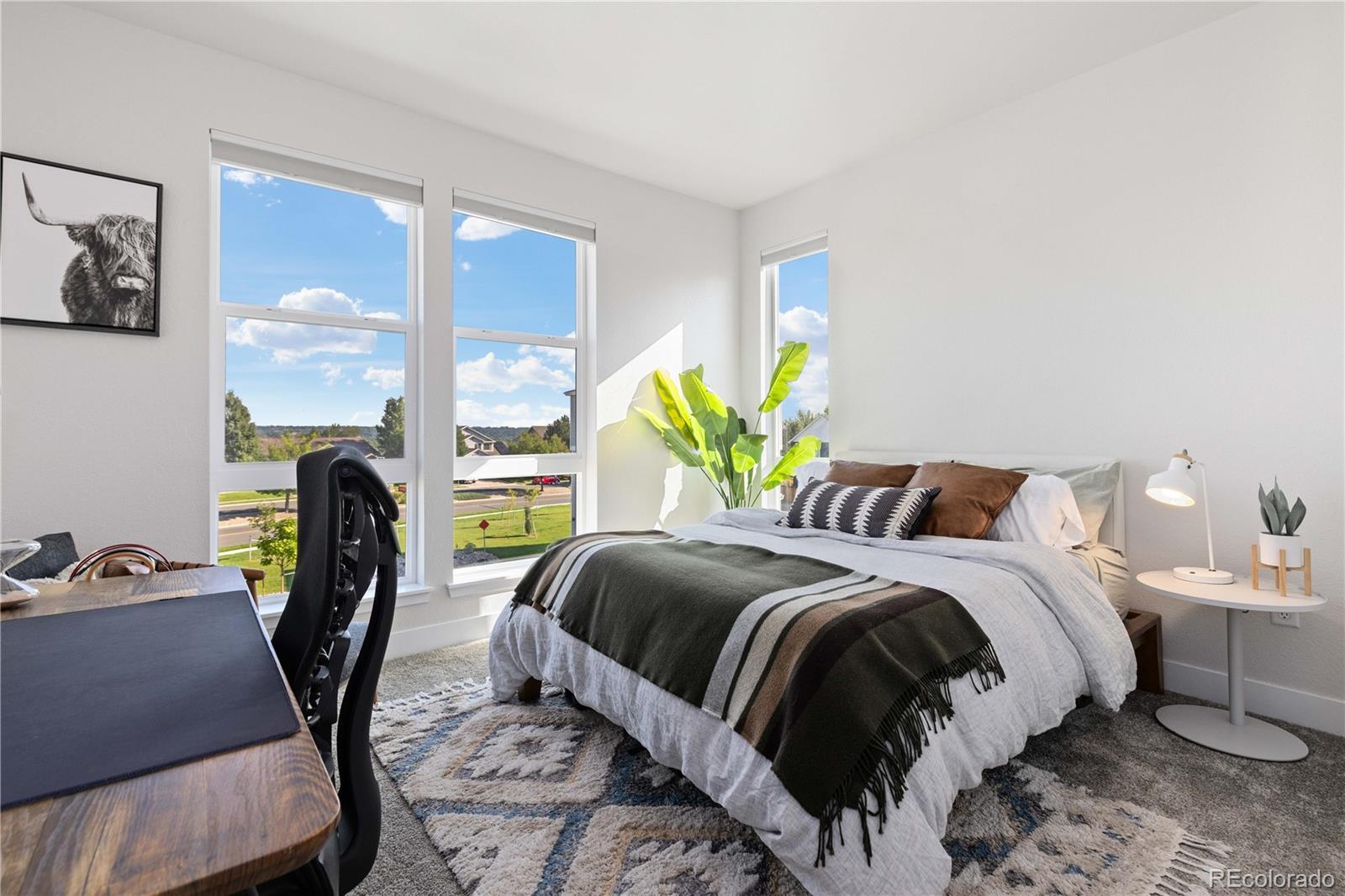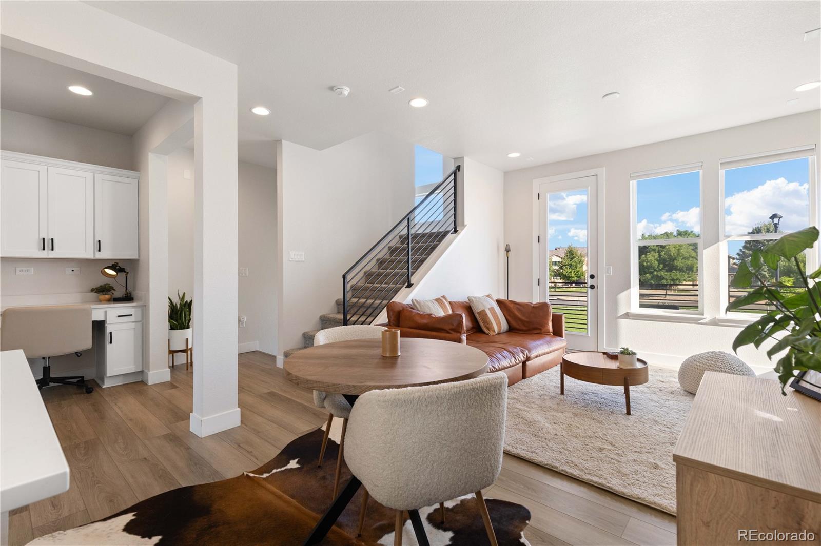 Assumable 5% VA loan! Welcome to this beautiful modern home in Arvada on a corner lot offering multiple levels of stylish and functional living space! The entry level features a dedicated office and access to the attached 2-car garage, complete with electric vehicle charging capability. Upstairs, the open main living area is filled with natural light. The living room opens to a private balcony with stunning mountain views, while the kitchen and dining area boast quartz countertops, a huge island with seating and sink, stainless steel appliances, a walk-in pantry, and a convenient half bath. A built-in desk provides an additional work or study space. On the third level, you’ll find two spacious bedrooms, each with its own en-suite bathroom—perfect for dual primary suites. Enjoy sweeping mountain views from the secondary bedroom, and a large walk-in closet in the primary. The top level is a true highlight: an expansive rooftop terrace with breathtaking panoramic mountain views, the ideal spot to relax or entertain while soaking up the Colorado sunshine. This home stands out with thoughtful upgrades throughout, including blackout custom-fit blinds in the primary and guest bedrooms, tankless water heater with copper piping, and a premium $8,500 appliance package with a high-end refrigerator, washer, and dryer—all included. The unique floor plan features an XL kitchen and a spacious primary bathroom, offering a layout that goes beyond the standard models. Enjoy an amazing community setting with access to the Stenger Sports Complex and Rainbow Bridge Park and Trail just down the street. Conveniently located near Olde Town Arvada’s farmers markets, shopping, and dining, with easy access to I-70 for quick trips to the mountains or downtown Denver, this home offers the perfect blend of modern comfort, stunning views, and unbeatable location! Buyer and Buyers Agent is responsible for verifying all information, measurements, school and HOA/fee/regulations.