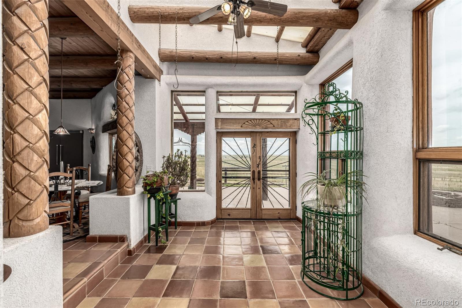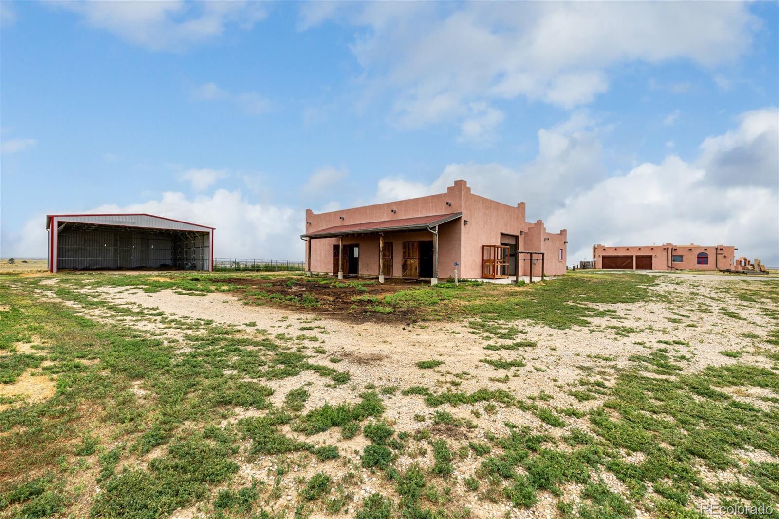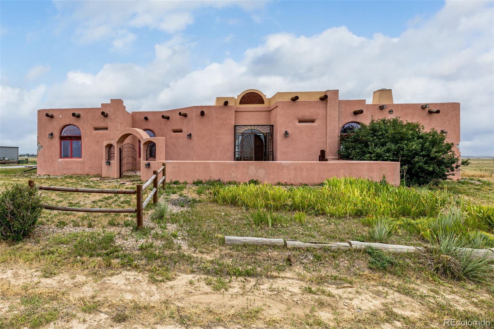 Huge Price Improvement! A Rare Adobe Hacienda East of Denver. Welcome to a one-of-a-kind Adobe Santa Fe Hacienda offering panoramic views of Colorado’s Front Range and the soul of the Wild West. Crafted with sustainable straw bale steel post and beam construction with an enclosed front courtyard. this residence pairs environmental consciousness with timeless beauty. Step inside to find hand-carved wood doors, imported Mexican Terrazzo tiles, authentic vigas beams, stained glass windows, and kiva fireplaces—all woven into three bedrooms and two elegant baths. A detached six-car garage and workshop with oversized aprons includes an additional half bath, perfect for ranch hands. Rustic Sophistication: Unwind around the custom Western-style billiard table (negotiable) or host on the oversized patio as the dramatic landscape stretches endlessly before you. Equestrian Excellence: This property is a haven for horse lovers—featuring three spacious stalls, a tack room, a hay shed, multiple outside hydrants, hitching posts, and sweeping pasture. Whether you're a seasoned rider or simply inspired by frontier living, this retreat welcomes both boots and reins. The Spirit of the Southwest: Immerse yourself in a lifestyle where old world charm meets Colorado serenity. Every detail evokes the romance of adobe architecture and the bold rhythm of country living. This extraordinary retreat offers privacy, peace, and the freedom to roam. New water heater. New water well pressure tank.