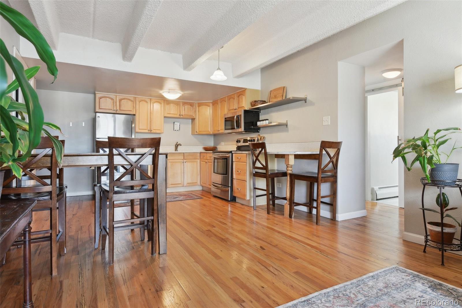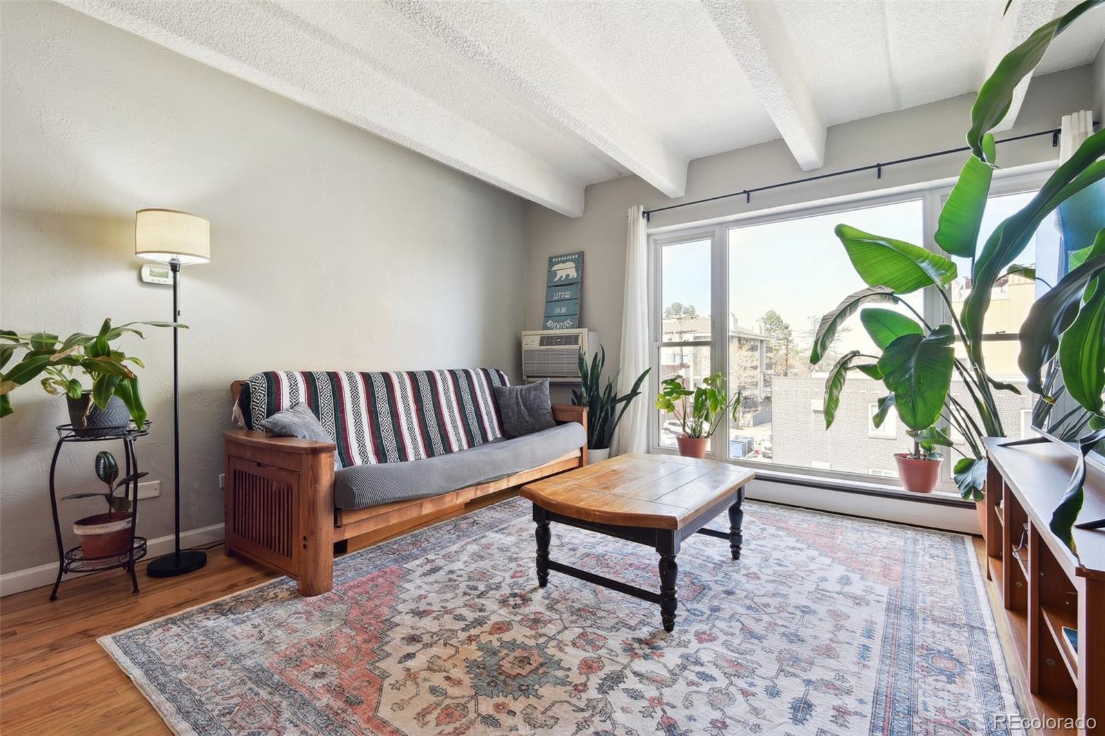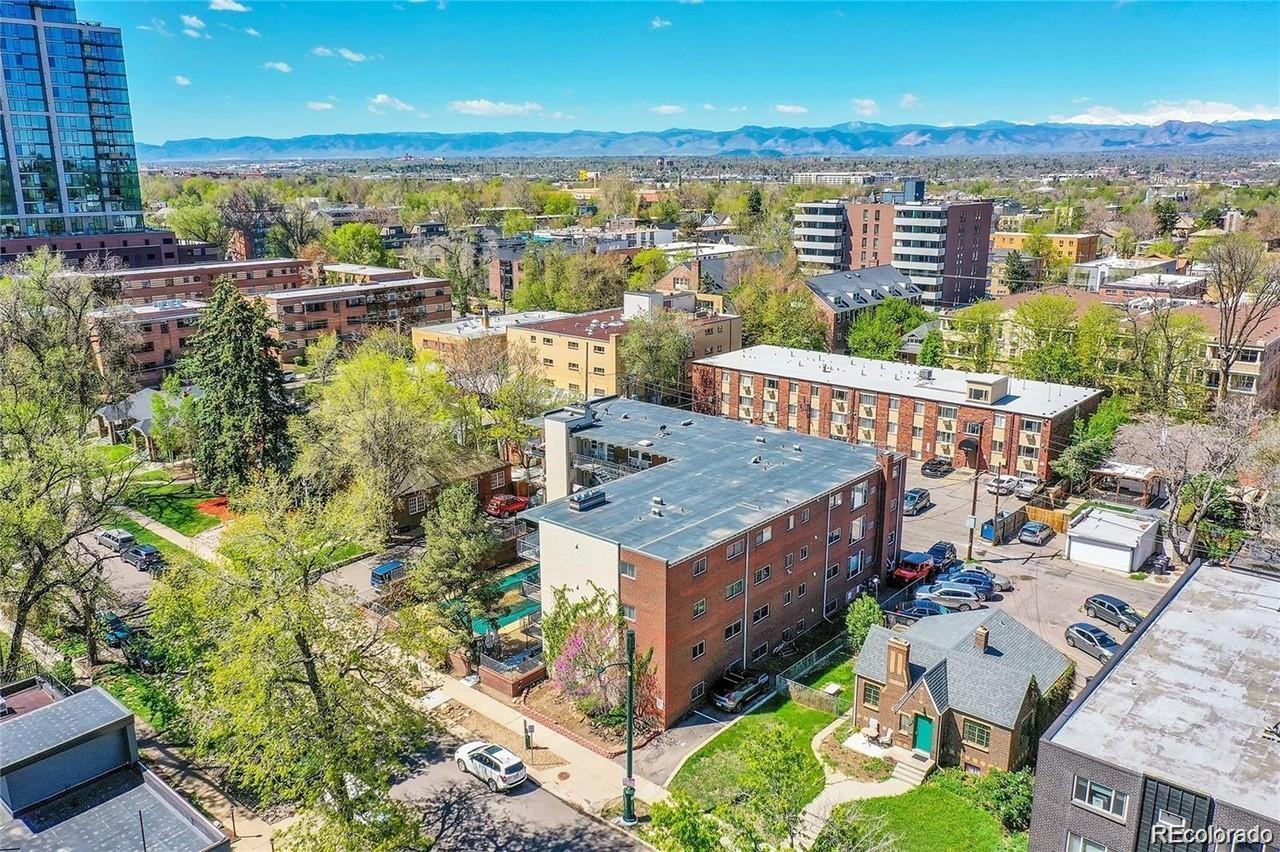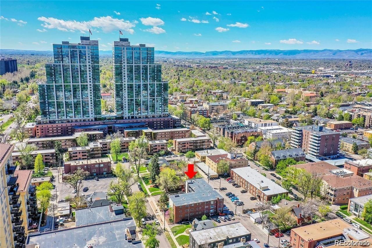 This fantastic top-floor condo in the heart of Denver is move-in ready with two bedrooms, one bathroom, and a bright, open layout. Wood floors flow through the living room and kitchen, and oversized windows fill the space with natural light. The updated kitchen features quartzite countertops with a breakfast bar, a stylish tile backsplash, sleek open shelving, and stainless steel appliances. There’s also space for a dining table. The remodeled bathroom boasts a modern barn door, pedestal sink, and updated tile. Plus, enjoy the convenience of an in-unit washer and dryer. The spacious bedrooms offer large closets, with an additional linen closet for extra storage. Parking is included with an off-street space, and there’s plenty of nearby street parking for guests. Residents also have access to the community pool. Steps from the Cherry Creek bike path, Washington Park, Cherry Creek, and downtown, this home offers great value in a prime location.