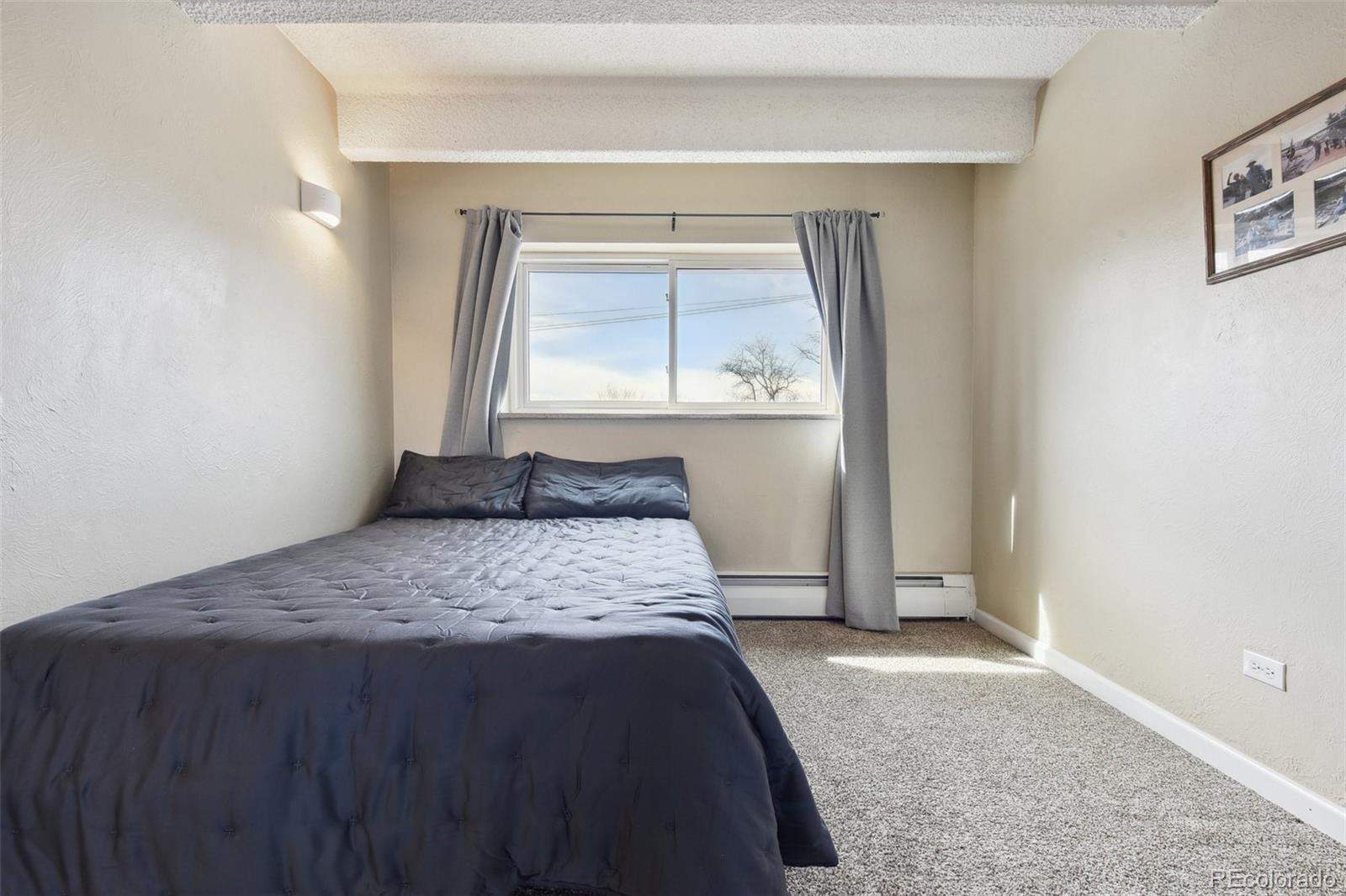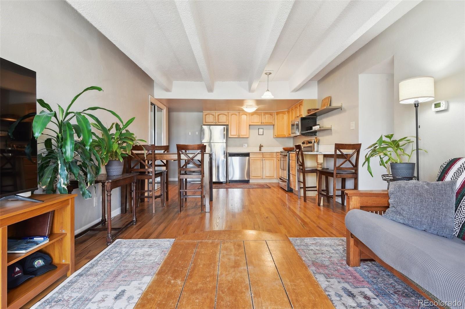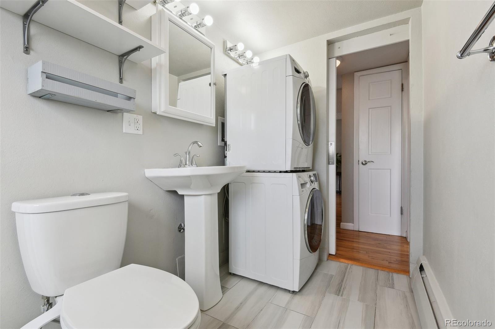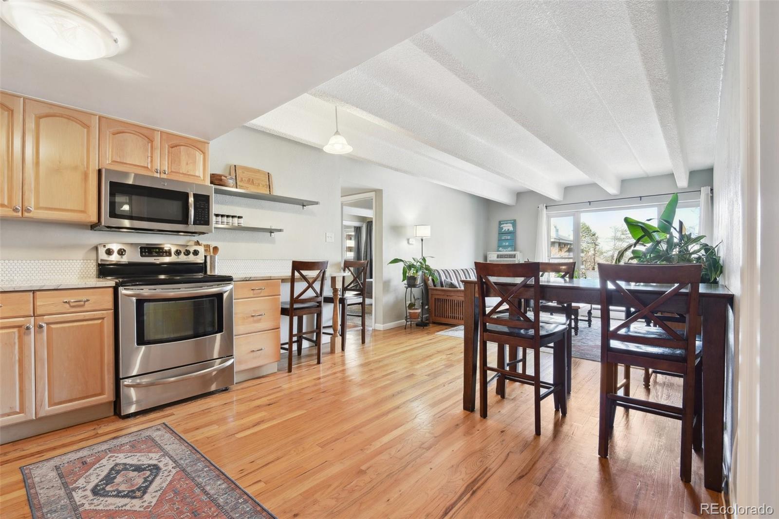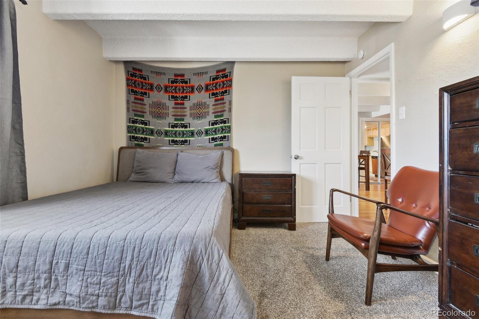 This fantastic top-floor condo in the heart of Denver is move-in ready with two bedrooms, one bathroom, and a bright, open layout. Wood floors flow through the living room and kitchen, and oversized windows fill the space with natural light. The updated kitchen features quartzite countertops with a breakfast bar, a stylish tile backsplash, sleek open shelving, and stainless steel appliances. There’s also space for a dining table. The remodeled bathroom boasts a modern barn door, pedestal sink, and updated tile. Plus, enjoy the convenience of an in-unit washer and dryer. The spacious bedrooms offer large closets, with an additional linen closet for extra storage. Parking is included with an off-street space, and there’s plenty of nearby street parking for guests. Residents also have access to the community pool. Steps from the Cherry Creek bike path, Washington Park, Cherry Creek, and downtown, this home offers great value in a prime location.