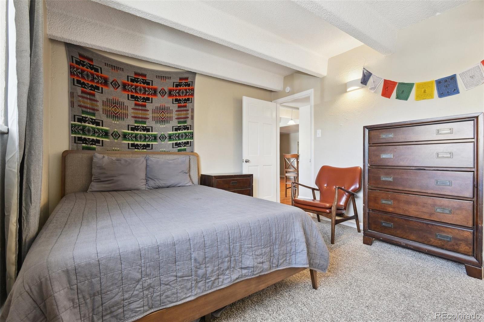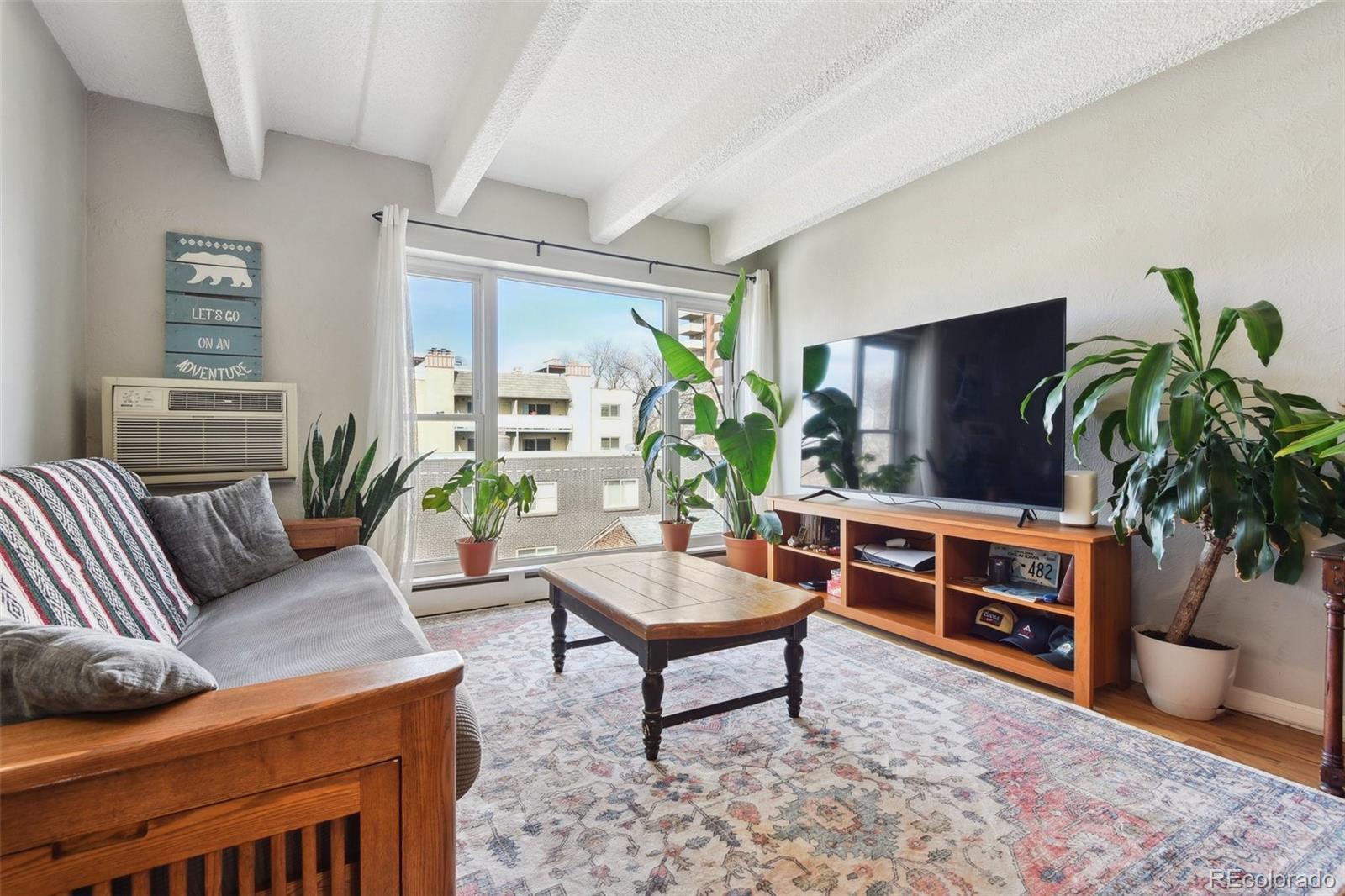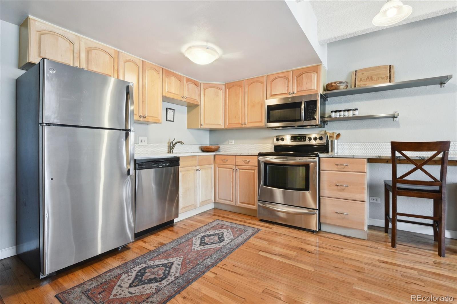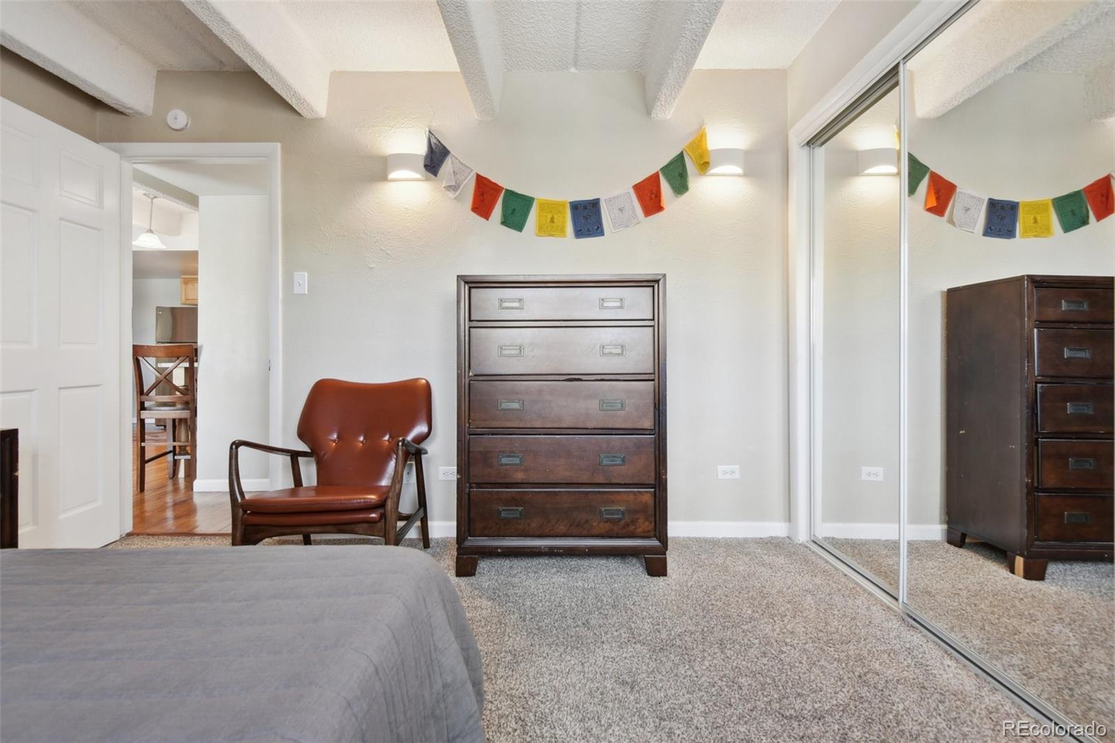 This fantastic top-floor condo in the heart of Denver is move-in ready with two bedrooms, one bathroom, and a bright, open layout. Wood floors flow through the living room and kitchen, and oversized windows fill the space with natural light. The updated kitchen features quartzite countertops with a breakfast bar, a stylish tile backsplash, sleek open shelving, and stainless steel appliances. There’s also space for a dining table. The remodeled bathroom boasts a modern barn door, pedestal sink, and updated tile. Plus, enjoy the convenience of an in-unit washer and dryer. The spacious bedrooms offer large closets, with an additional linen closet for extra storage. Parking is included with an off-street space, and there’s plenty of nearby street parking for guests. Residents also have access to the community pool. Steps from the Cherry Creek bike path, Washington Park, Cherry Creek, and downtown, this home offers great value in a prime location.
