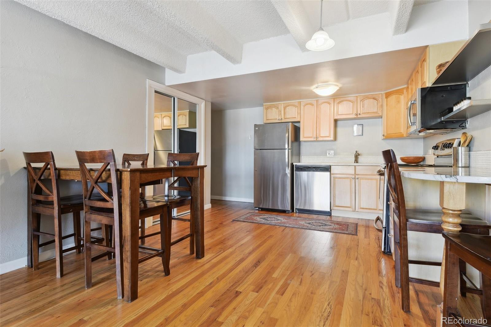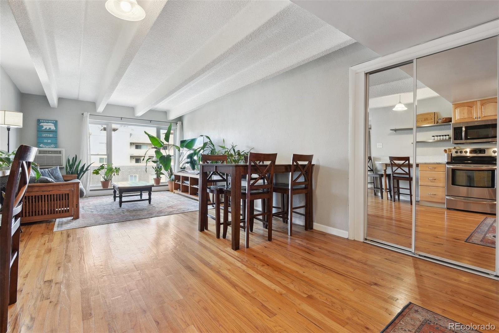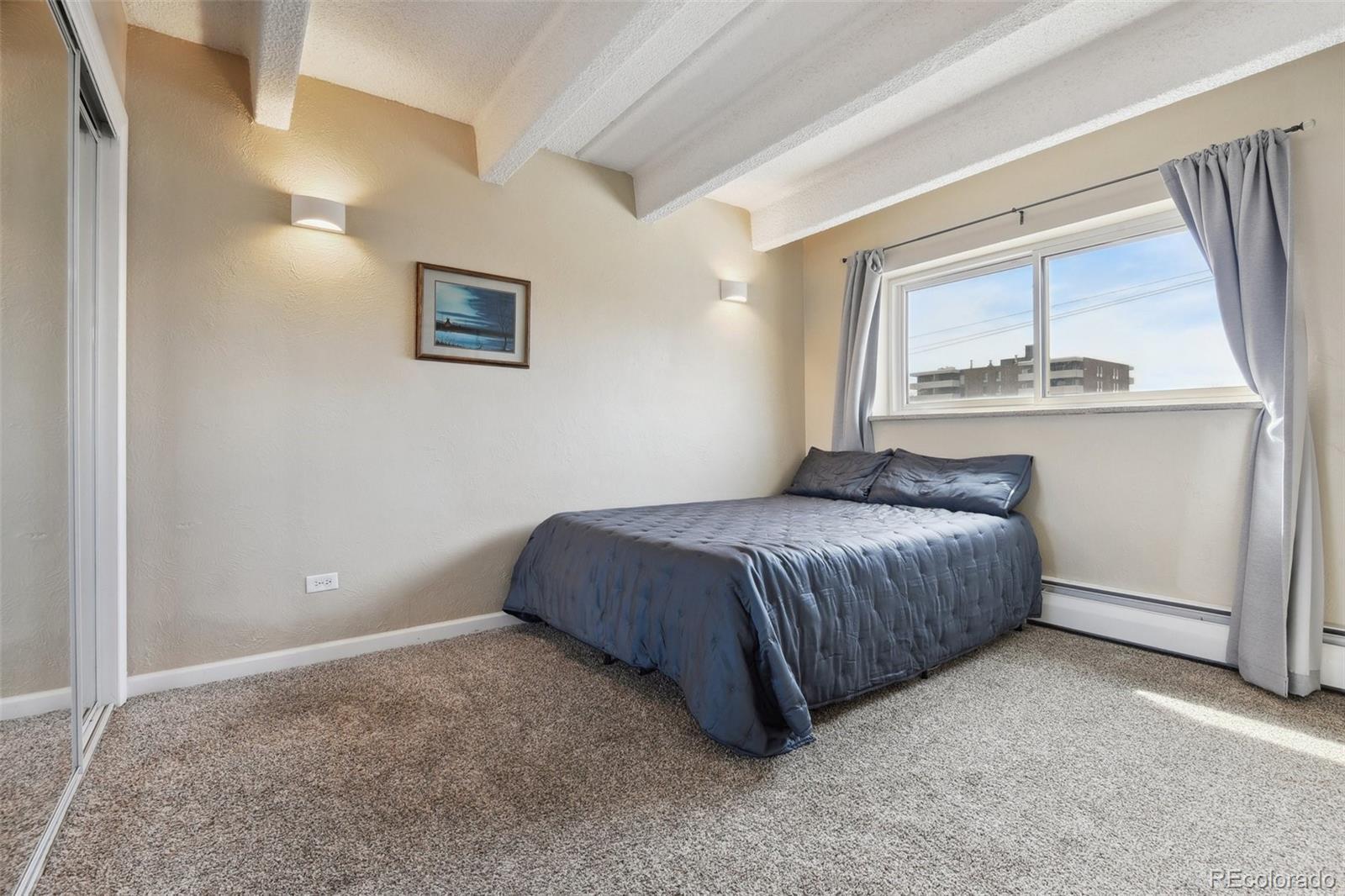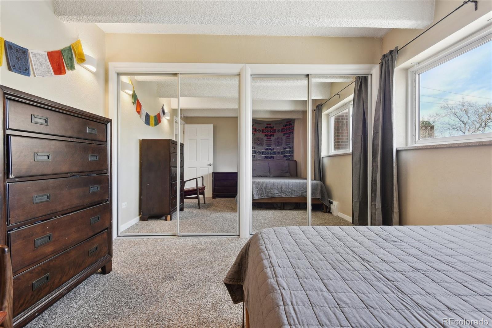 This fantastic top-floor condo in the heart of Denver is move-in ready with two bedrooms, one bathroom, and a bright, open layout. Wood floors flow through the living room and kitchen, and oversized windows fill the space with natural light. The updated kitchen features quartzite countertops with a breakfast bar, a stylish tile backsplash, sleek open shelving, and stainless steel appliances. There’s also space for a dining table. The remodeled bathroom boasts a modern barn door, pedestal sink, and updated tile. Plus, enjoy the convenience of an in-unit washer and dryer. The spacious bedrooms offer large closets, with an additional linen closet for extra storage. Parking is included with an off-street space, and there’s plenty of nearby street parking for guests. Residents also have access to the community pool. Steps from the Cherry Creek bike path, Washington Park, Cherry Creek, and downtown, this home offers great value in a prime location.