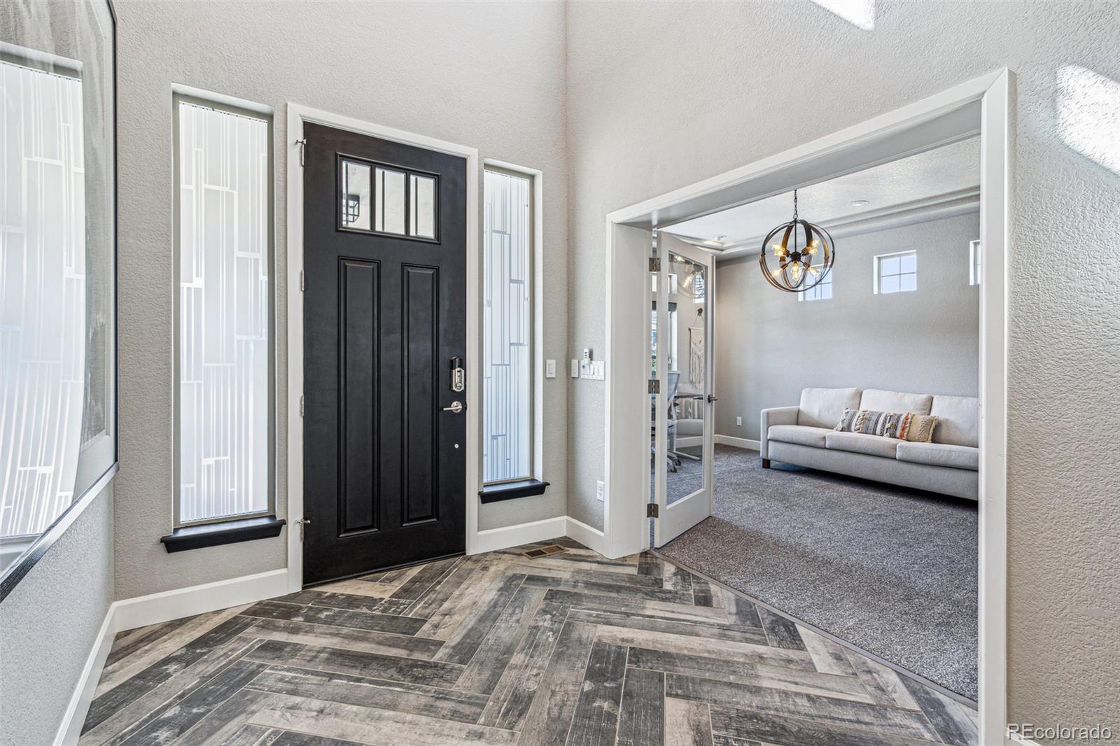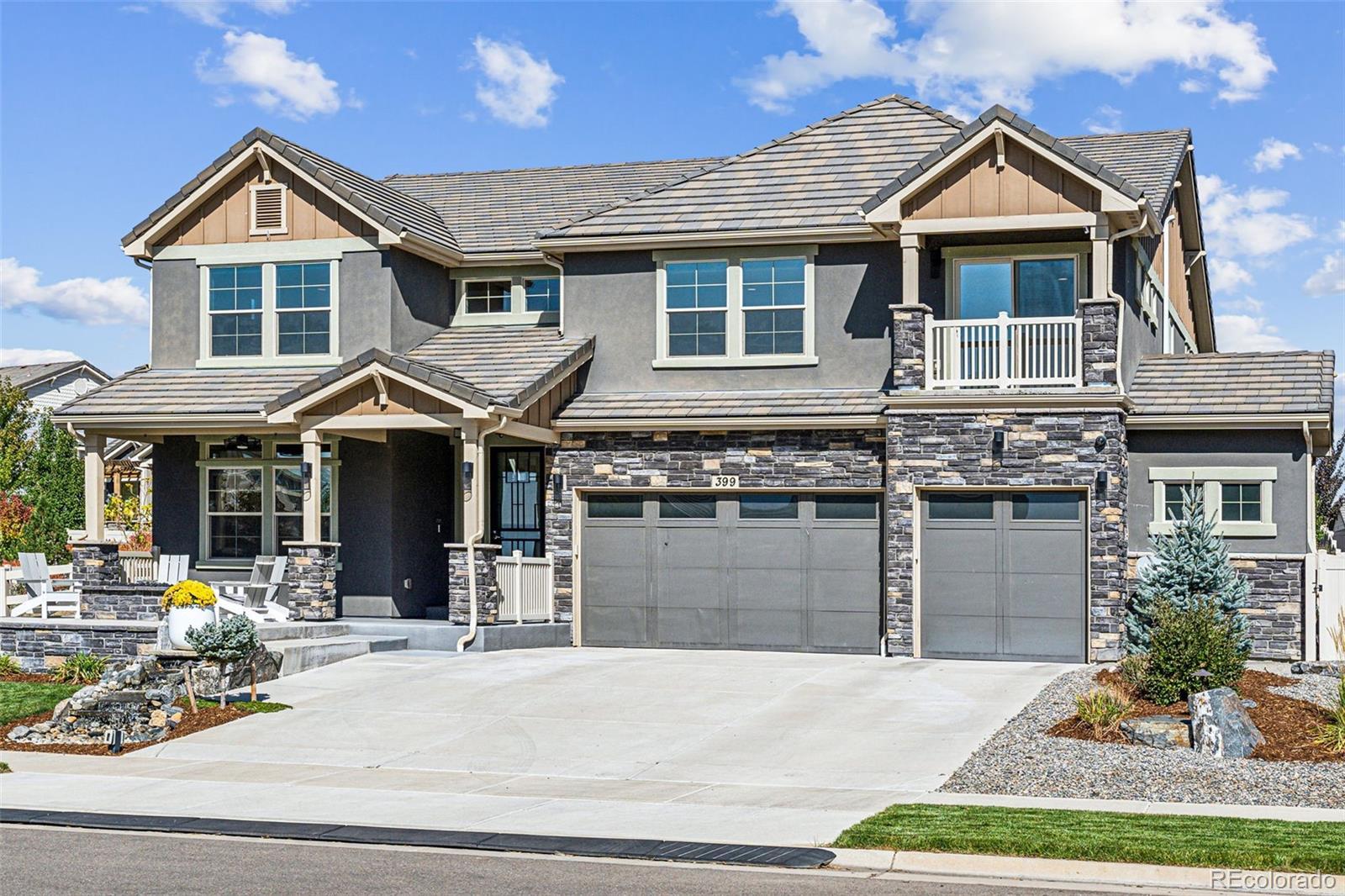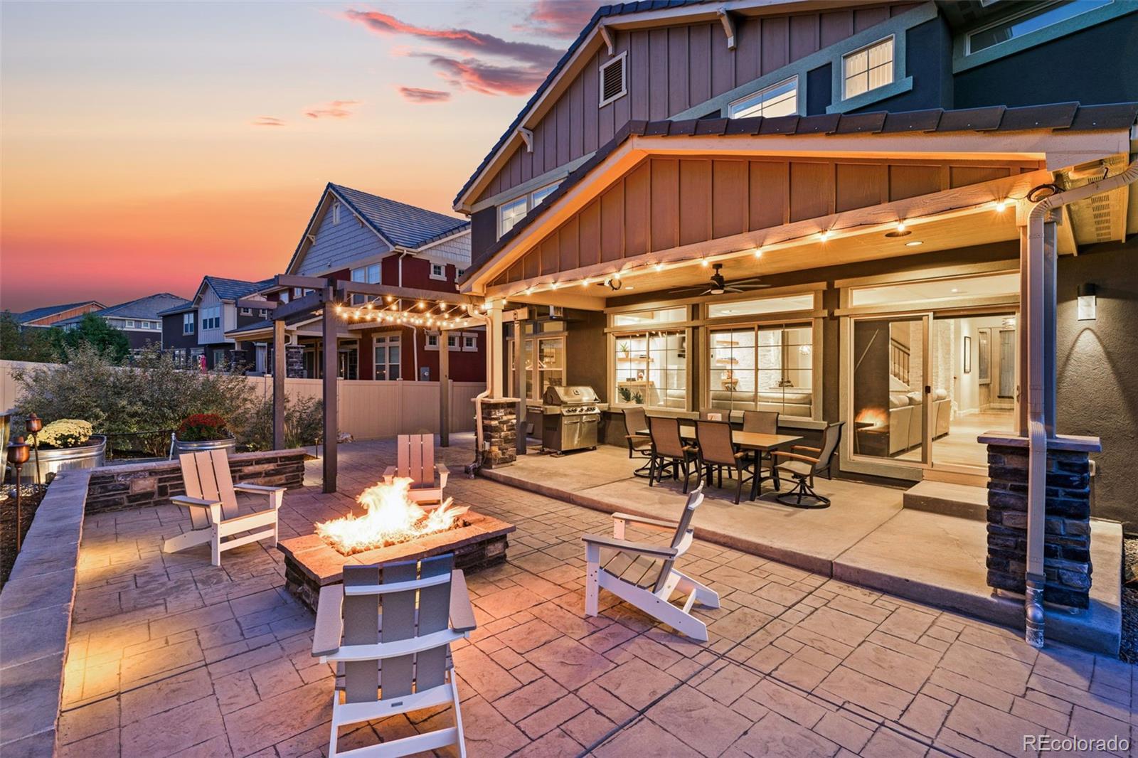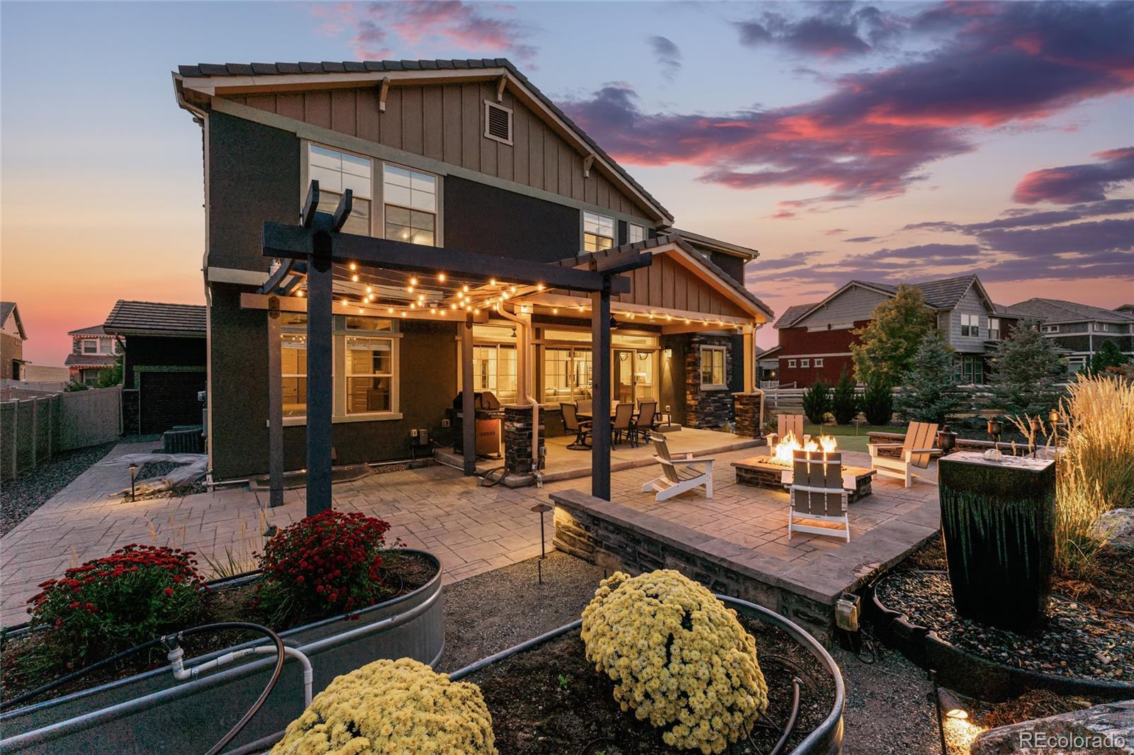 Experience model-home perfection in this stunning residence, ideally situated on a premium, oversized homesite bordered by a tranquil greenbelt and framed by breathtaking mountain views. This home is loaded with high-end builder selections and custom, designer improvements that elevate every space. The floor plan includes four well-appointed bedrooms, an essential main-floor office with French doors and mountain views, and a huge loft with surround sound and an exterior view balcony. A one-of-a-kind custom laundry room and mudroom enhance daily functionality. The sizeable primary suite is a true retreat, boasting a walk-in closet and a luxurious five-piece bath featuring a spa-like walk-through shower with dual shower heads. The heart of the home is the spacious gourmet kitchen, a chef’s dream equipped with top-tier cabinets, under-cabinet lighting, a subway tile backsplash, granite countertops, and a huge island topped with quartz. Premium stainless steel appliances, including double ovens and a five-burner gas cooktop, complete this culinary space. The property’s curb appeal and outdoor amenities are exceptional! Designed for seamless indoor-outdoor enjoyment, the front elevation features a covered porch transitioning to an extended patio with an elegant water feature and a gas fire pit, perfectly positioned to enjoy the tranquil views. Practicality is guaranteed with a three-car oversized garage offering superior storage. The rear yard is a true sanctuary and a dedicated entertainment zone: highlights include an extended covered patio, a stamped concrete patio hosting a second gas fire pit, two beautiful water features, a custom pergola with café lighting, integrated garden planters, and a private putting green. This is more than a home; it's a meticulously crafted lifestyle in the highly desirable Erie Highlands! Enjoy easy access to top-rated schools, charming Briggs Street offers high-end and casual dining, local breweries, and boutique shops.