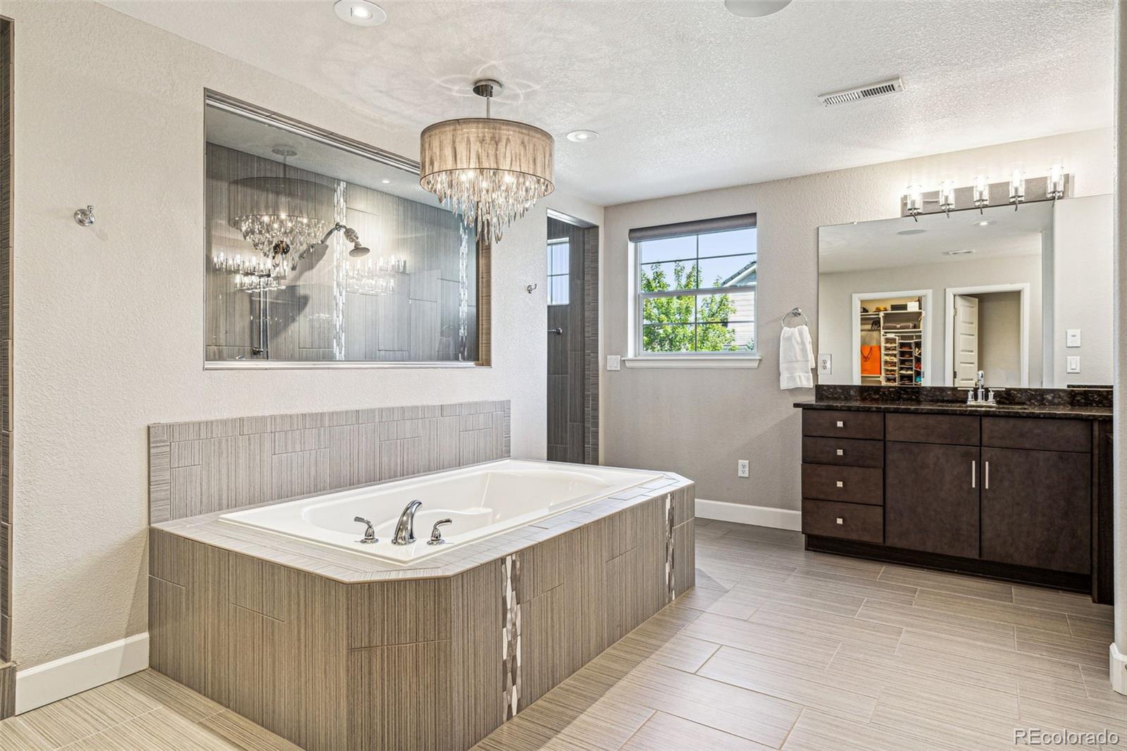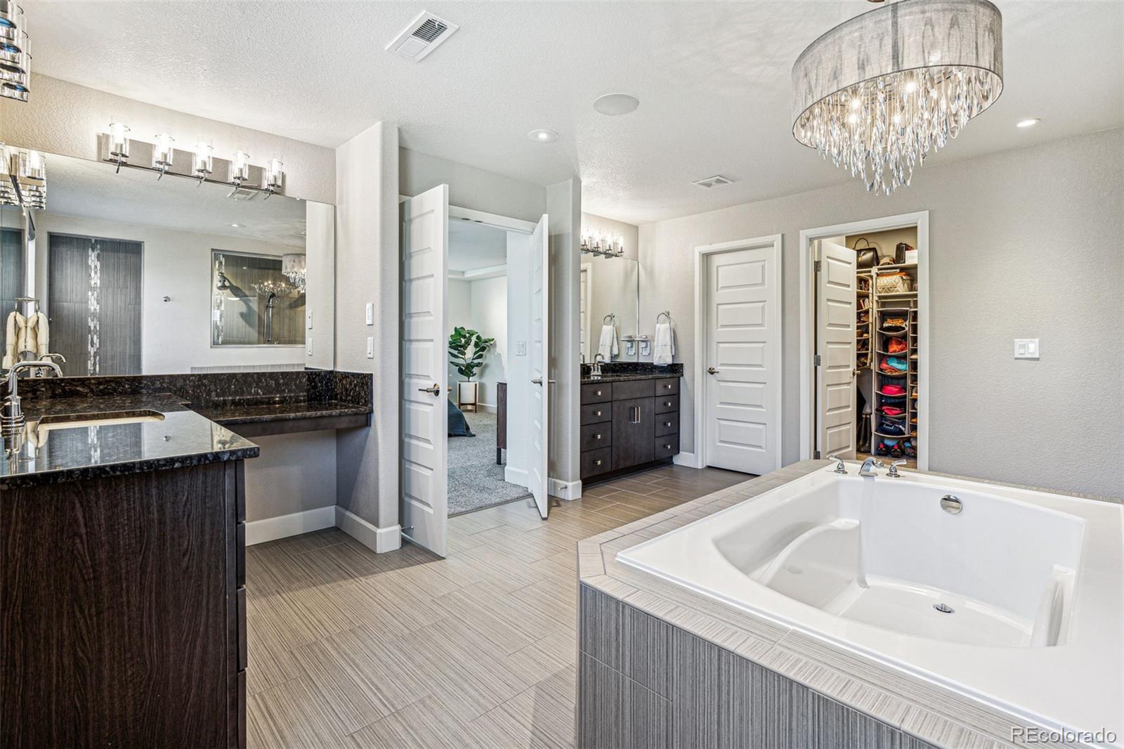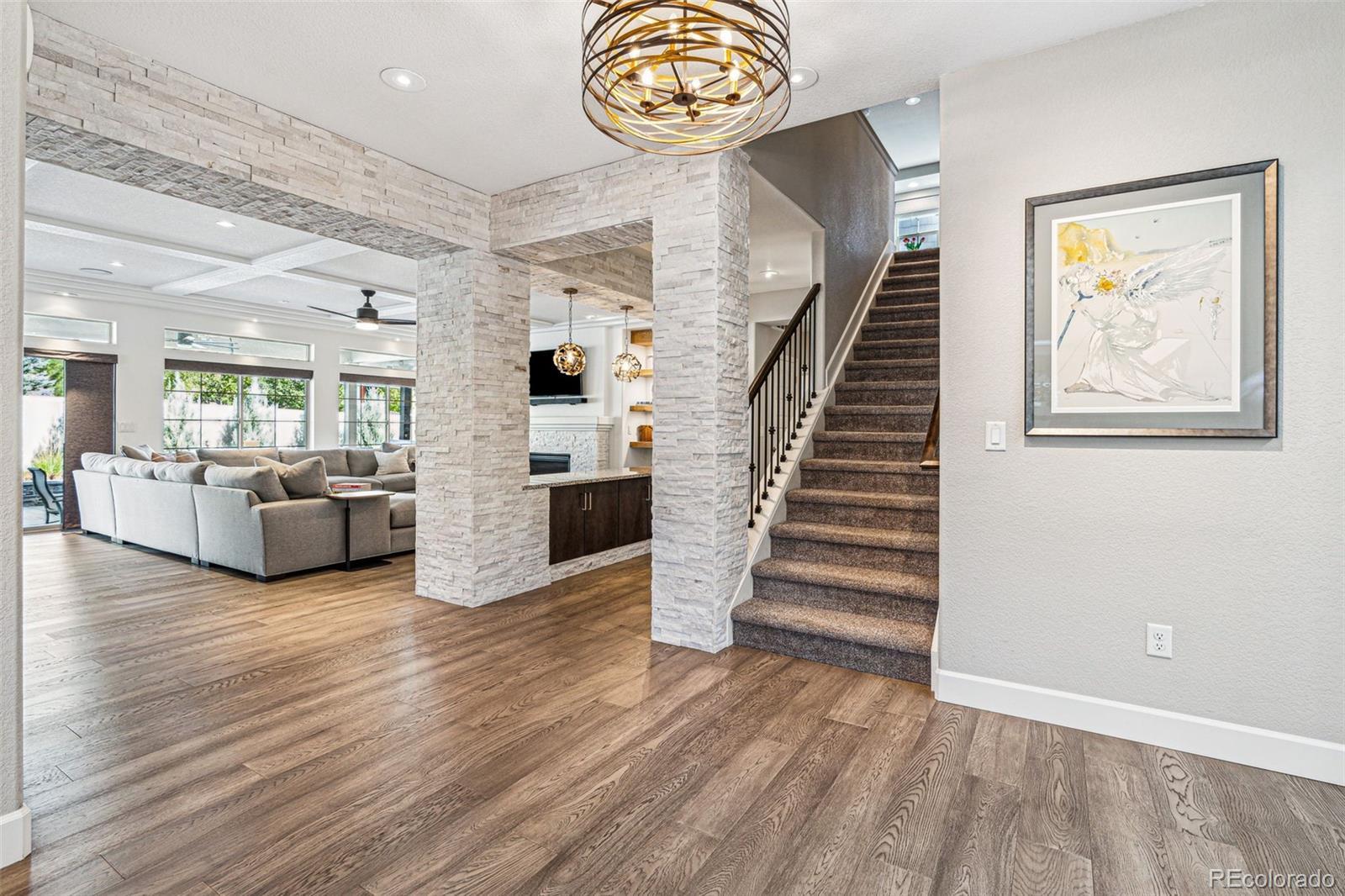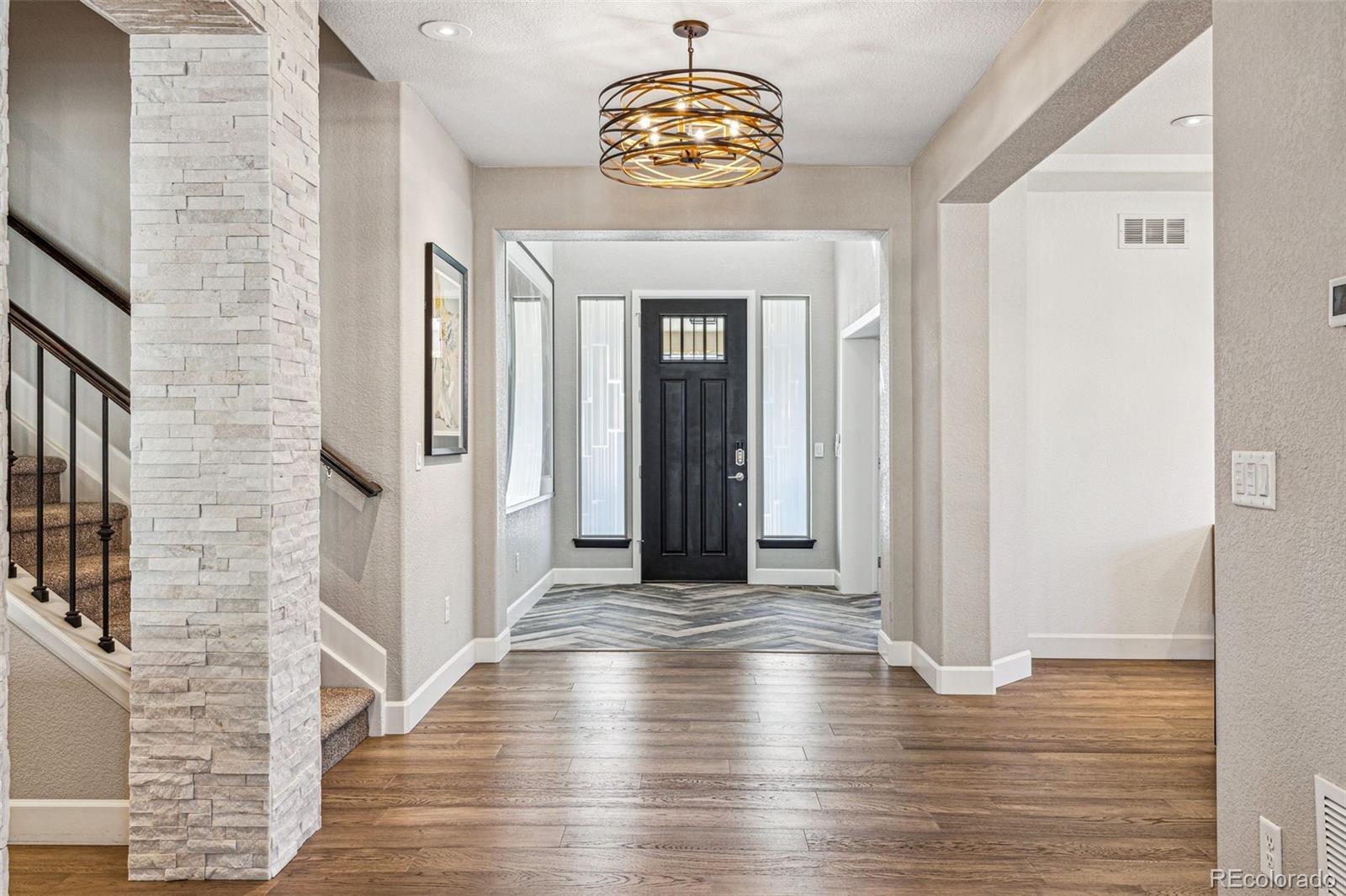 Experience model-home perfection in this stunning residence, ideally situated on a premium, oversized homesite bordered by a tranquil greenbelt and framed by breathtaking mountain views. This home is loaded with high-end builder selections and custom, designer improvements that elevate every space. The floor plan includes four well-appointed bedrooms, an essential main-floor office with French doors and mountain views, and a huge loft with surround sound and an exterior view balcony. A one-of-a-kind custom laundry room and mudroom enhance daily functionality. The sizeable primary suite is a true retreat, boasting a walk-in closet and a luxurious five-piece bath featuring a spa-like walk-through shower with dual shower heads. The heart of the home is the spacious gourmet kitchen, a chef’s dream equipped with top-tier cabinets, under-cabinet lighting, a subway tile backsplash, granite countertops, and a huge island topped with quartz. Premium stainless steel appliances, including double ovens and a five-burner gas cooktop, complete this culinary space. The property’s curb appeal and outdoor amenities are exceptional! Designed for seamless indoor-outdoor enjoyment, the front elevation features a covered porch transitioning to an extended patio with an elegant water feature and a gas fire pit, perfectly positioned to enjoy the tranquil views. Practicality is guaranteed with a three-car oversized garage offering superior storage. The rear yard is a true sanctuary and a dedicated entertainment zone: highlights include an extended covered patio, a stamped concrete patio hosting a second gas fire pit, two beautiful water features, a custom pergola with café lighting, integrated garden planters, and a private putting green. This is more than a home; it's a meticulously crafted lifestyle in the highly desirable Erie Highlands! Enjoy easy access to top-rated schools, charming Briggs Street offers high-end and casual dining, local breweries, and boutique shops.