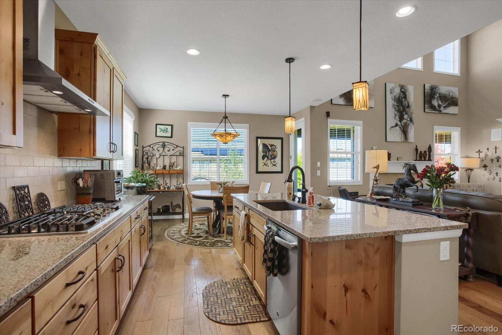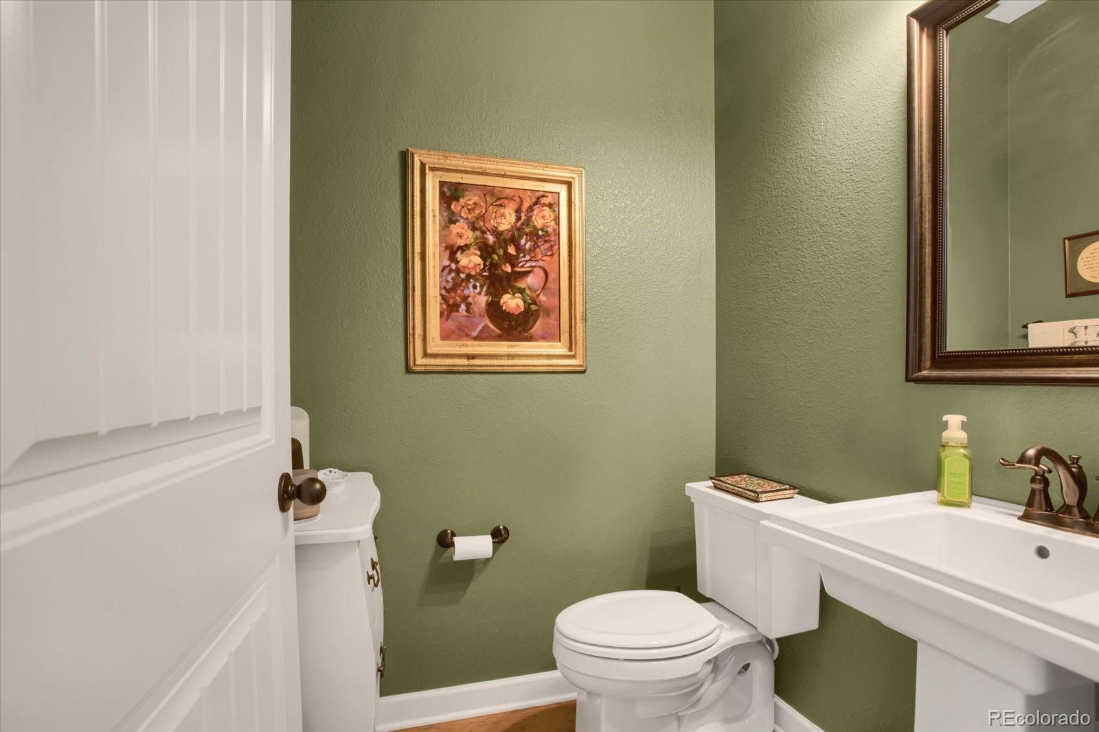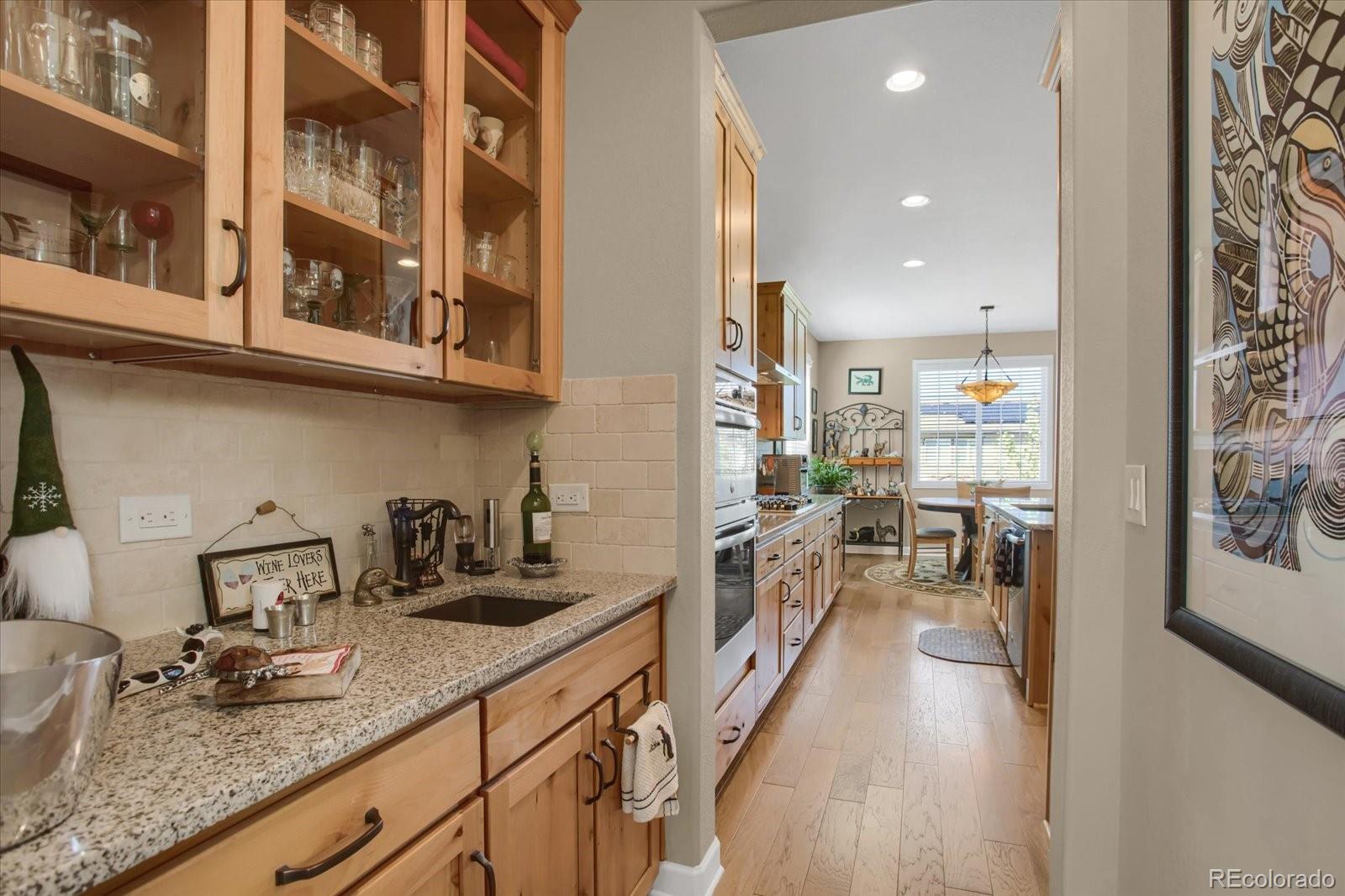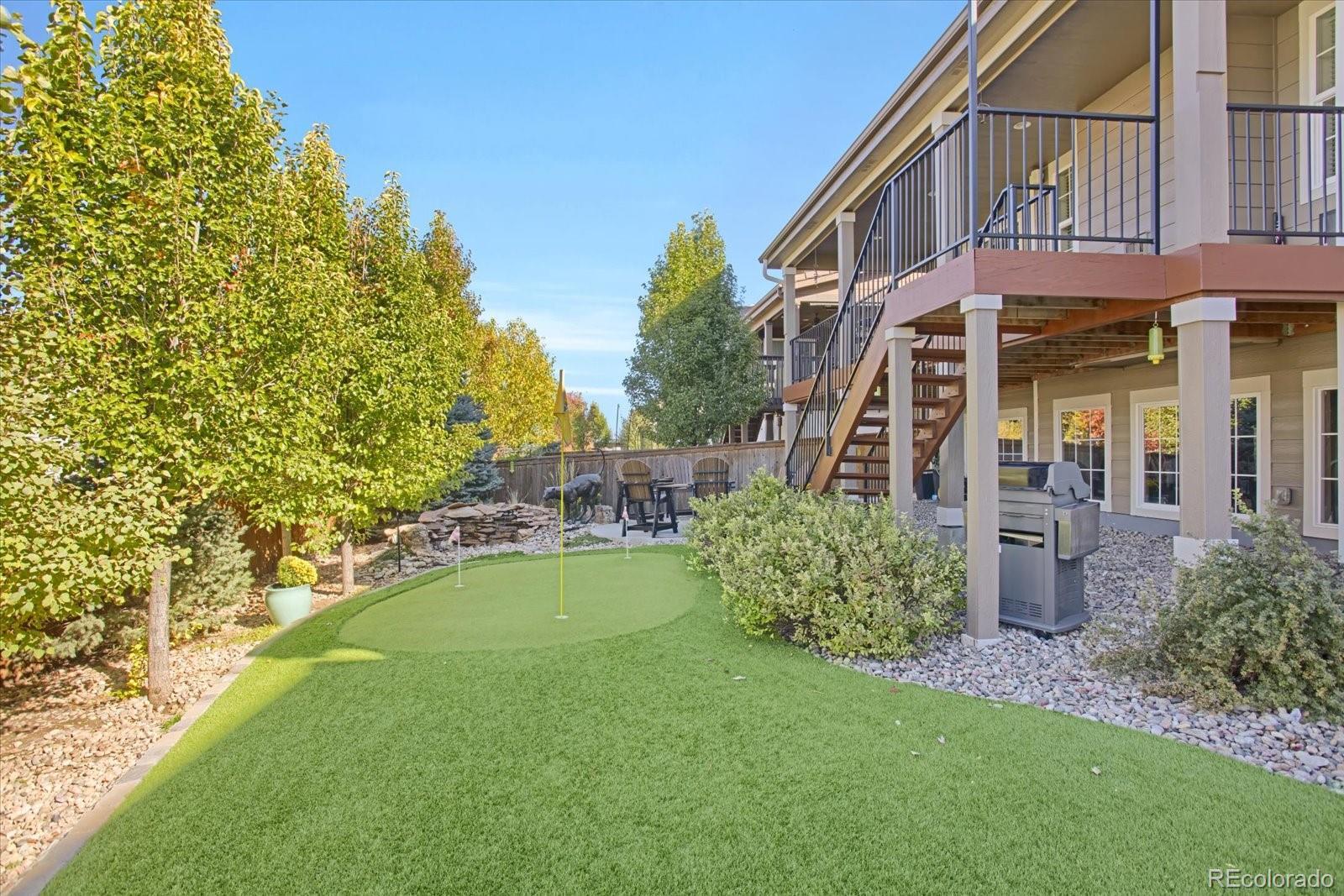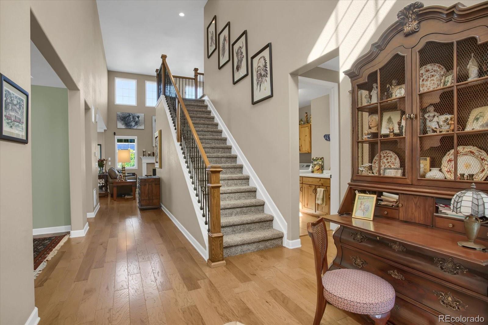 Beautiful home in a fabulous Parker community, Stepping Stone! The home features a main floor primary suite, professionally landscaped yard with putting green and spectacular water fall to create a peaceful oasis on either the deck or lovely patio next to waterfall! New exterior paint and deck was just sanded and stained. In addition to the 3 bedrooms there is a main floor office and loft upstairs, either could be converted to 4th bedroom if needed. Custom shelving/cabinets in great room and primary walk-in closet. Kitchen/great room combo is perfect for entertaining or enjoying time with family. Hickory cabinets, stainless appliances and granite counter tops in the kitchen. Large center island with breakfast bar and eat-in kitchen. Butlers pantry between kitchen and dining room provides additional cabinets and convenience when entertaining. Laundry room conveniently located next to primary bedroom includes upgraded cabinets and deep, utility sink. Open and bright floorplan provides convivence of main level living with benefit of additional bedrooms and loft upstairs if needed. Separate furnace for upstairs allows for greater energy efficiency and temperature control. Hardwood floors flow throughout the main level except for the primary suite. Wonderful community pool, park and clubhouse with in walking distance. Extensive trails through out the neighborhood and connecting to the East-West Regional Trail. The East-West Regional Trail connects Highlands Ranch, Castle Pines, Lone Tree and Parker.