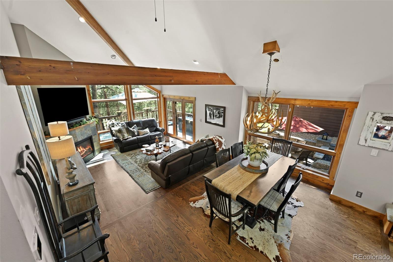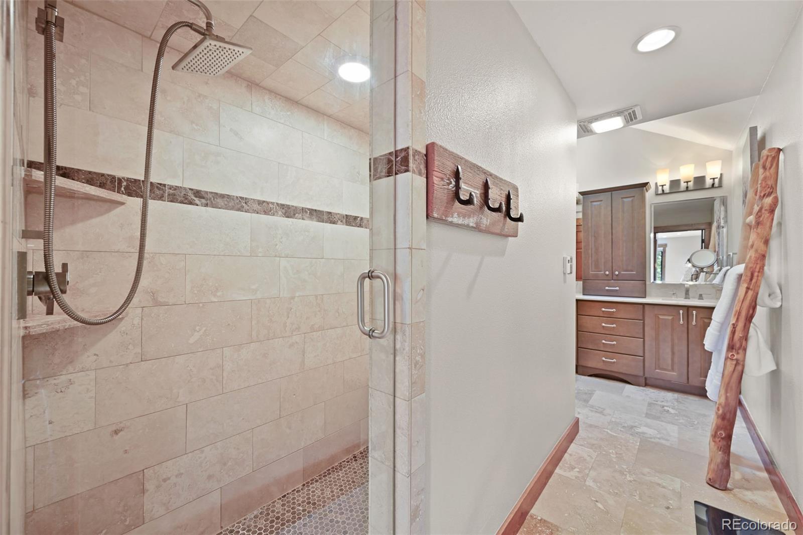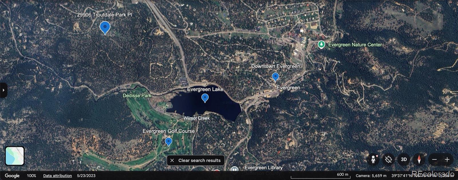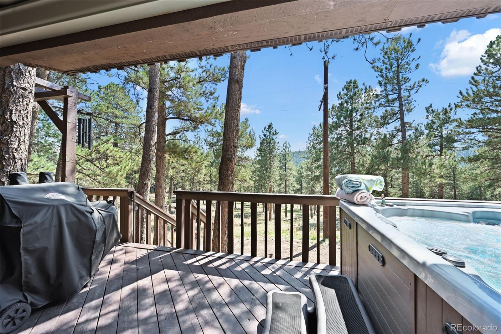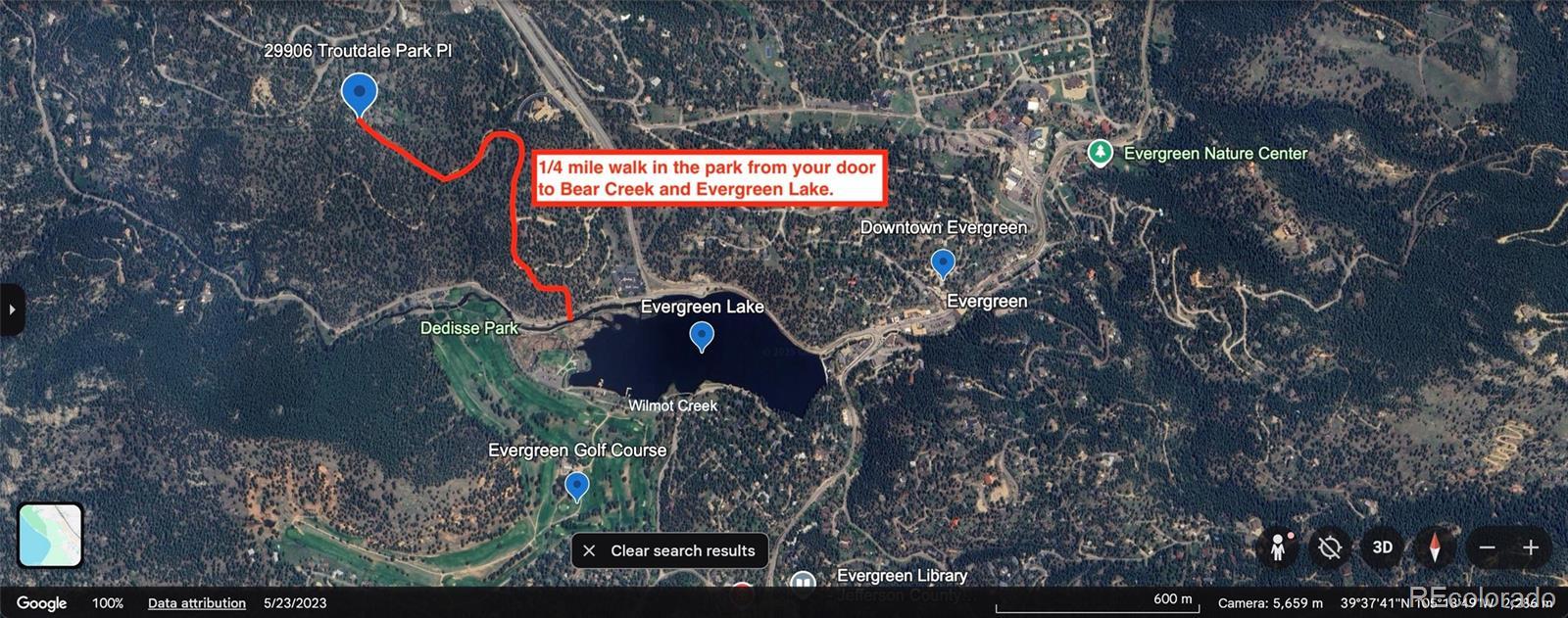 This elegant Evergreen patio home with main-floor master suite provides a very rare combination of easy, luxurious mountain living walking distance to town. It's literally a walk in the park to Bear Creek, Evergreen Lake and Downtown Evergreen with restaurants, shops and entertainment. Your backyard is Dedisse Park and hundreds of acres of protected open space. Walk right out your door to explore a vast network of hiking and biking trails, row or paddle on Evergreen Lake, golf at the acclaimed Evergreen Golf Course, fish in Bear Creek, or shop and dine Downtown. While the exterior is framed by towering pines, aspen groves and rock outcroppings, the interior is defined by vaulted ceilings, wood beams and trim, hardwood floors, an open floor plan, walls of windows, exquisite finishes and artistic styling throughout. The just completed tiered stone patio provides 800 sq ft of luxury outdoor living space with built-in gas fire pit, fountain, outdoor kitchen, landscaping and sprinkler system. Additionally, two large decks on the main and walk-out levels overlook the park. If you’ve never heard the elk bugle (or even if you have), you’re in for a treat as you soak in the hot tub or gather with family and friends around the fire pit. This house is an entertainer’s dream inside and out. The newly remodeled kitchen includes Bosch appliances, leathered and live edge granite counters, hammered copper farm sink, rustic wood backsplash and artisan glass cabinet faces. Features such as heated tile floors, a steam shower and heated bathtub dial up the luxurious comforts of this home. The improvements don’t stop there, this home has new: Class 4 hail resistant roof, furnace, central air, hot water heater, refinished hardwood floors and smart security cameras. Everyone who visits this home is bedazzled by its special charm. There's nothing to do but settle in and enjoy the very special lifestyle this property offers.
