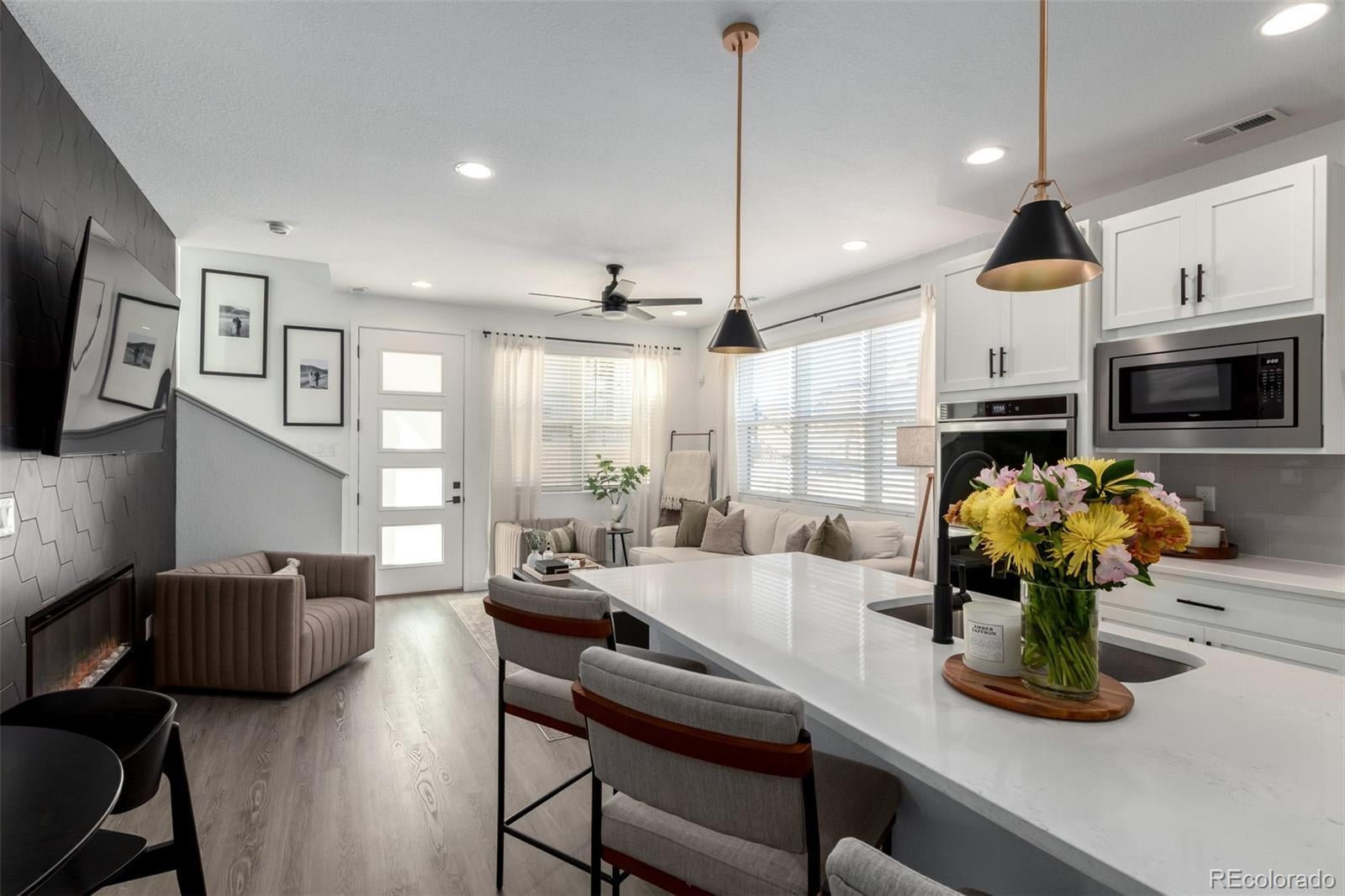 Welcome to this stunning, highly upgraded 3-bedroom, 2.5-bath townhome in the sought-after Sterling Ranch community, where modern design meets everyday comfort. From the moment you walk in, you’ll notice the attention to detail and pride of ownership—this home truly shows like a model. The open-concept main floor is perfect for entertaining, featuring a spacious living room with a sleek electric fireplace, tall ceilings, and abundant natural light that flows seamlessly into the dining area and kitchen. The chef’s kitchen is a true showpiece with stainless steel appliances, a double oven, quartz countertops, upgraded cabinetry, and a large center island—ideal for meal prep or gathering with friends and family. Upstairs, retreat to the luxurious primary suite complete with a 5-piece bathroom featuring a soaking tub, separate shower, dual vanities, and a walk-in closet. Two additional bedrooms offer flexibility for kids, guests, a home office, or hobbies. The laundry is conveniently located on the upper level. Modern upgrades throughout include a tankless water heater, solar panels for energy efficiency, and high-end finishes that add both style and value. This home also comes with all appliances included, making it completely move-in ready. Even better—most furniture can be negotiated to stay, offering a turnkey opportunity to start enjoying your new home immediately. Located in the vibrant Sterling Ranch community, you’ll love the miles of walking trails, community events, state-of-the-art recreation center, and nearby parks. Conveniently close to shopping, dining, and easy access to major highways for commuting, this home combines style, comfort, and convenience in one perfect package. Don’t miss your chance to own this exceptional Sterling Ranch townhome—modern, efficient, and ready for you to move right in!