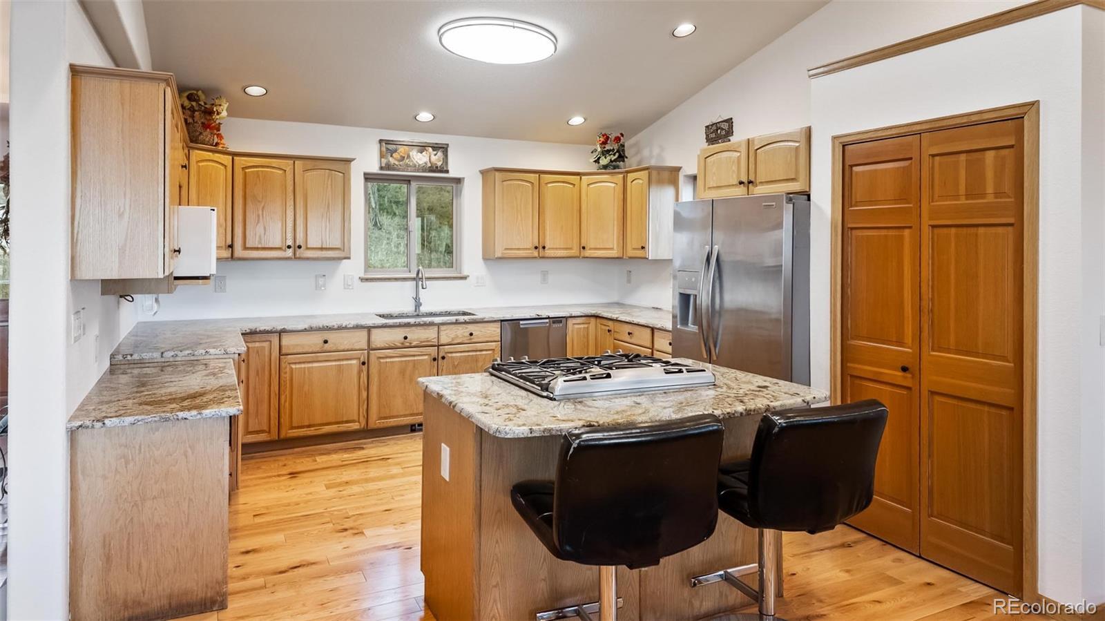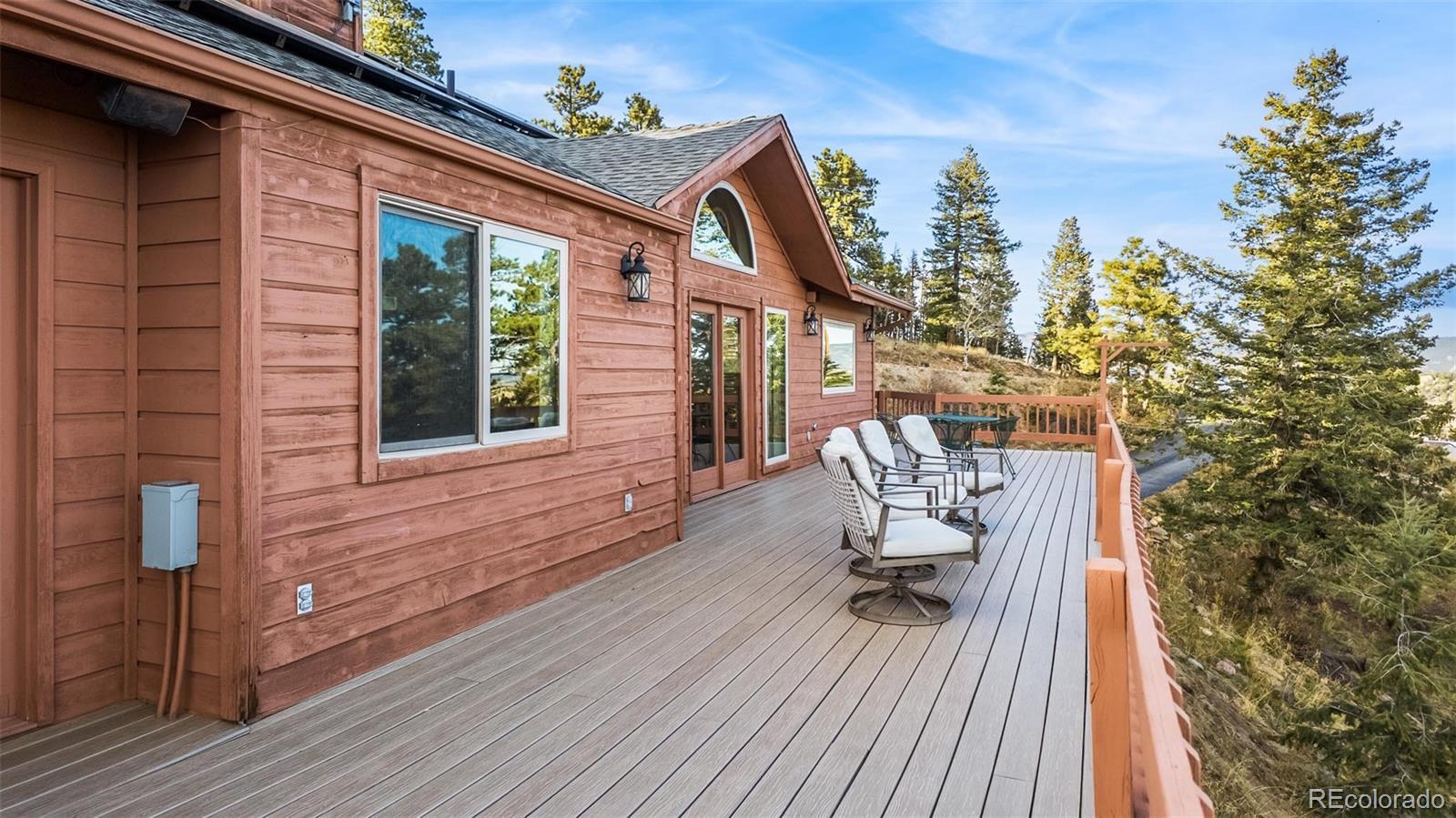 Your private mountain escape awaits. Beautiful mountain and city views. Spacious lot full of colorful Aspens and rock outcropping's. Accessible property surrounds this 4 bedroom 3 full bath mountain home. A quick drive to Denver and the ski areas. This location is appealing to skiers, hikers, nature lover's and those who need a quick commute to Denver Metro. Two huge decks facing east for year round entertaining, plenty of sun provides natural light all year round. 11 kilowatt solar panels on the roof are owned and transferable, keeping utility costs down. New counters in kitchen, hardwood flooring in the high traffic areas, open floor plan with large windows and sliding glass doors. Primary suite offers ensuite bathroom, plenty of closet space and amazing views. Lower level is great for entertaining or mother in law quarters with it's own wet bar, flex room, bedroom and bathroom.