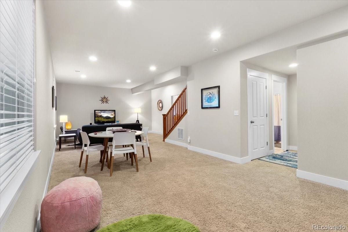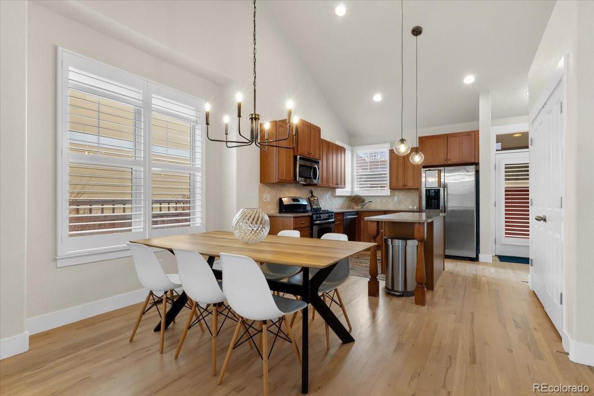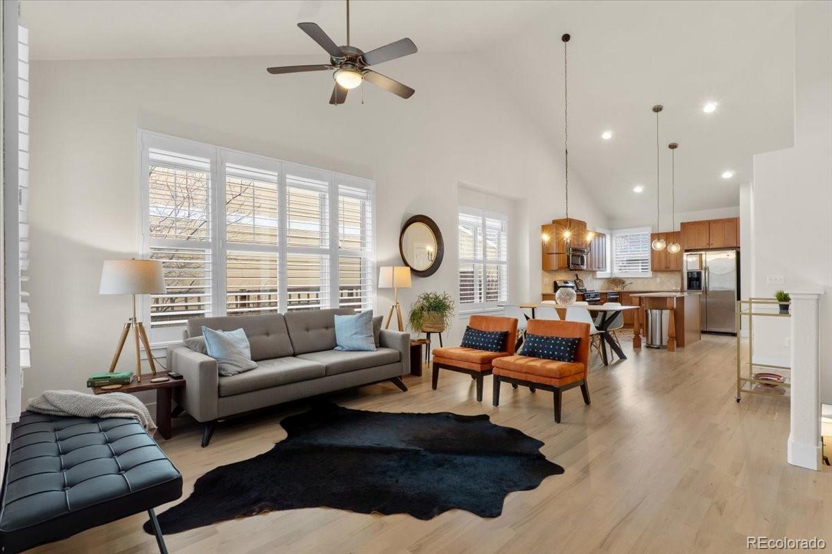 The perfect combination with comforts of a contemporary new-ish home, the beauty of classic bungalow architecture AND in a wonderful location in wildly-popular Central Park. Ranch-style with a main floor master, soaring ceilings 16'9" at the top, stunning plantation shutters, an open concept floorplan and a wonderful window package, this one is much better than most. With only two stairs from the garage into the house and room for a ramp and no stairs inside the main floor and a main-floor laundry, this may be ideal for someone with mobility limitations. Great versatility in the basement where the ceiling height is a wonderful 8'8". There are four egress windows. As of now, there is one [wonderful] bedroom, but with minimal expense, there could be three [for a total of five in the house] by finishing the unfinished portion (which already has egress) and shortening the 40 foot-long family room to add what would be a fourth or fifth bedroom and still have a huge family room. Freshly refinished real oak floors, fresh paint, some fresh lighting each contribute to this being in wonderful move-in condition with no “want”, nor “need” projects. The Outdoor living spaces are extraordinary. With a charming front porch, perched high above the street, you can socialize with the neighborhood. If you prefer privacy, you’ll be drawn to the professionally landscaped back yard, complete with a stunning flagstone patio and nice plantings. The oversized garage is a dream and the alley is clean and neat. It’s walkable to many shops, restaurants, grocery stores, many parks, the pool, the recreation center, the A-Train Light Rail, Sand Creek Trail and so much more.