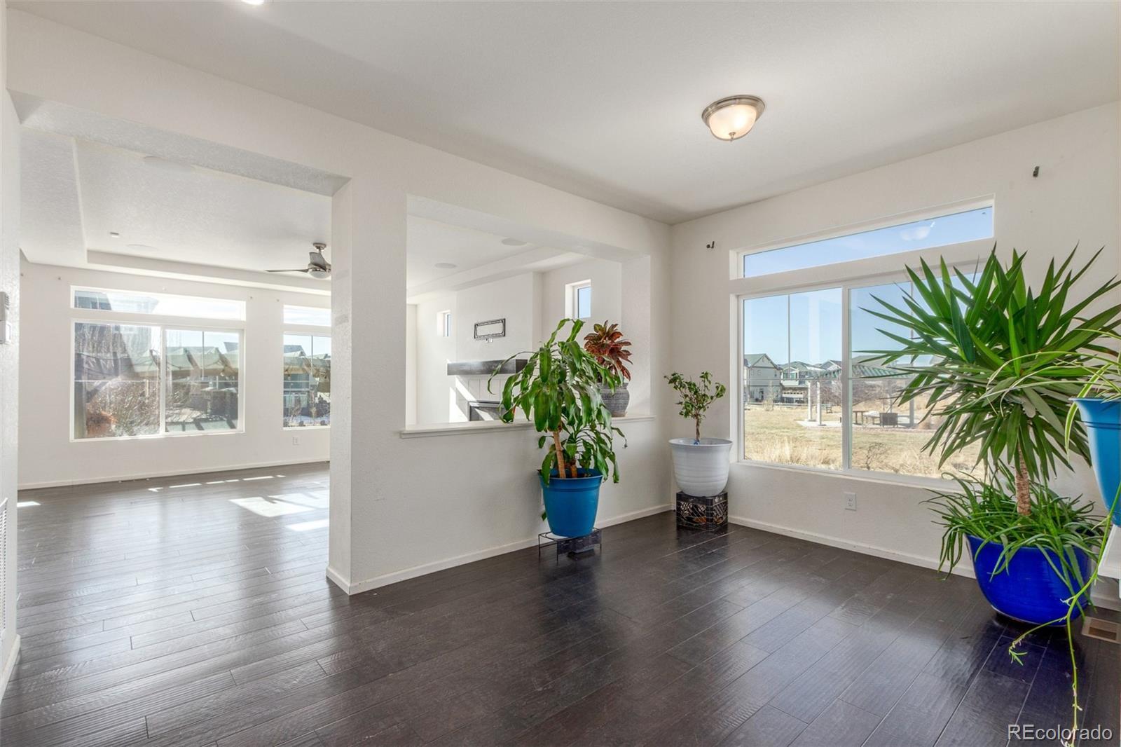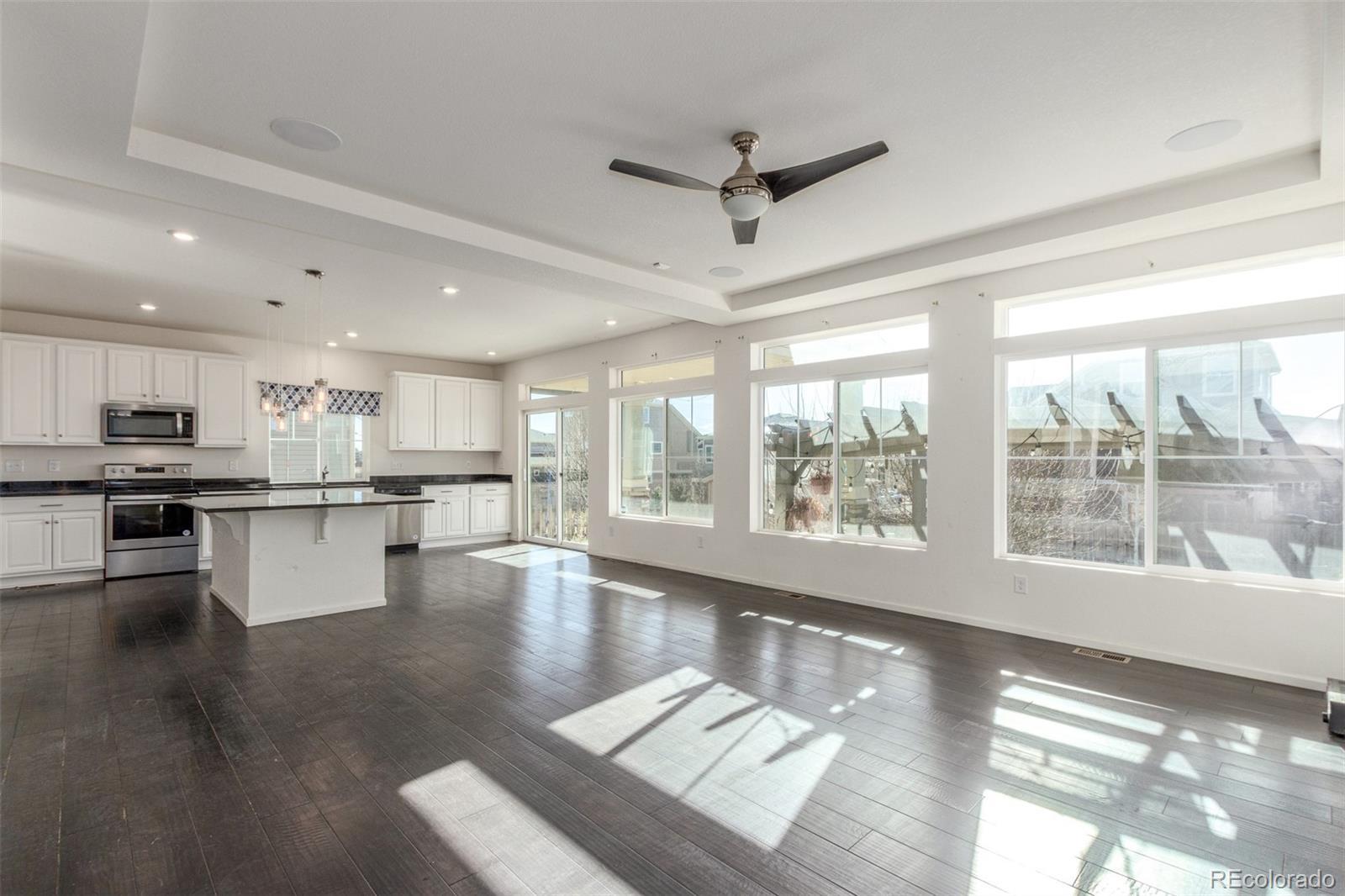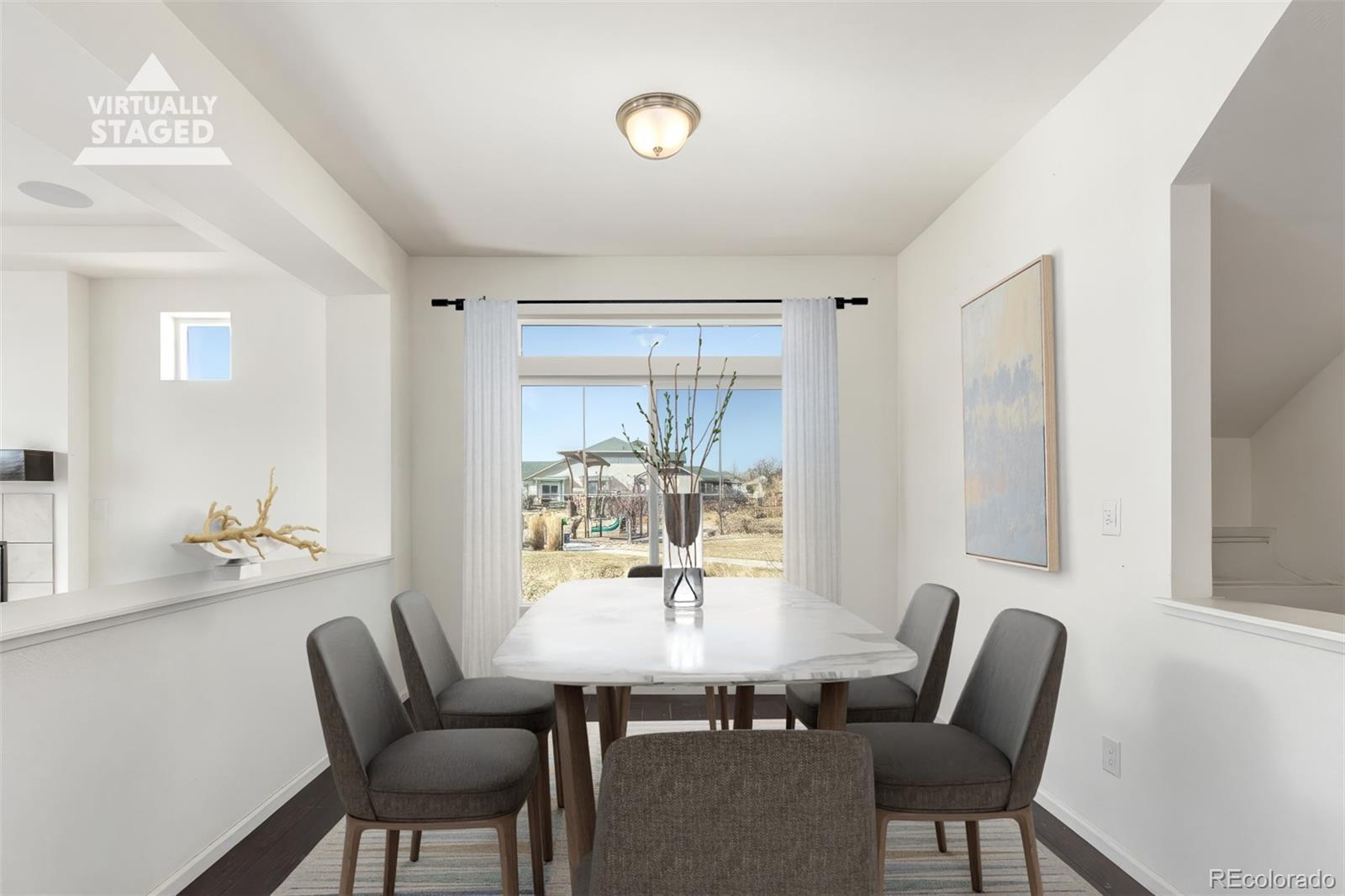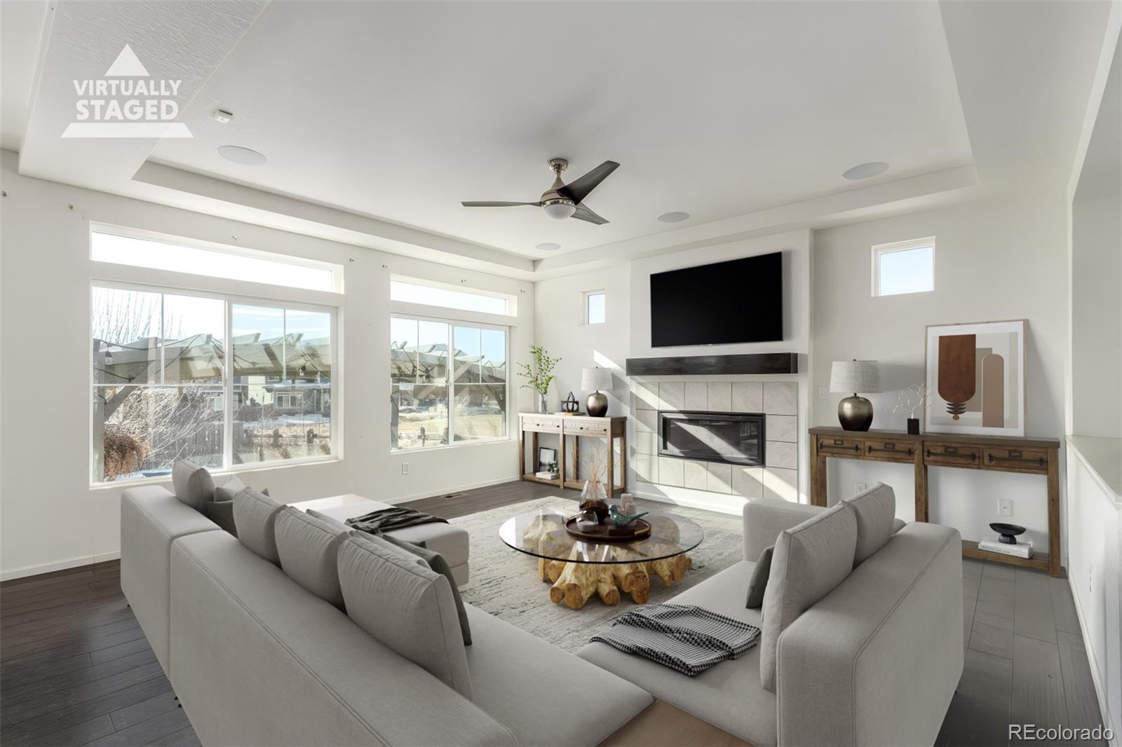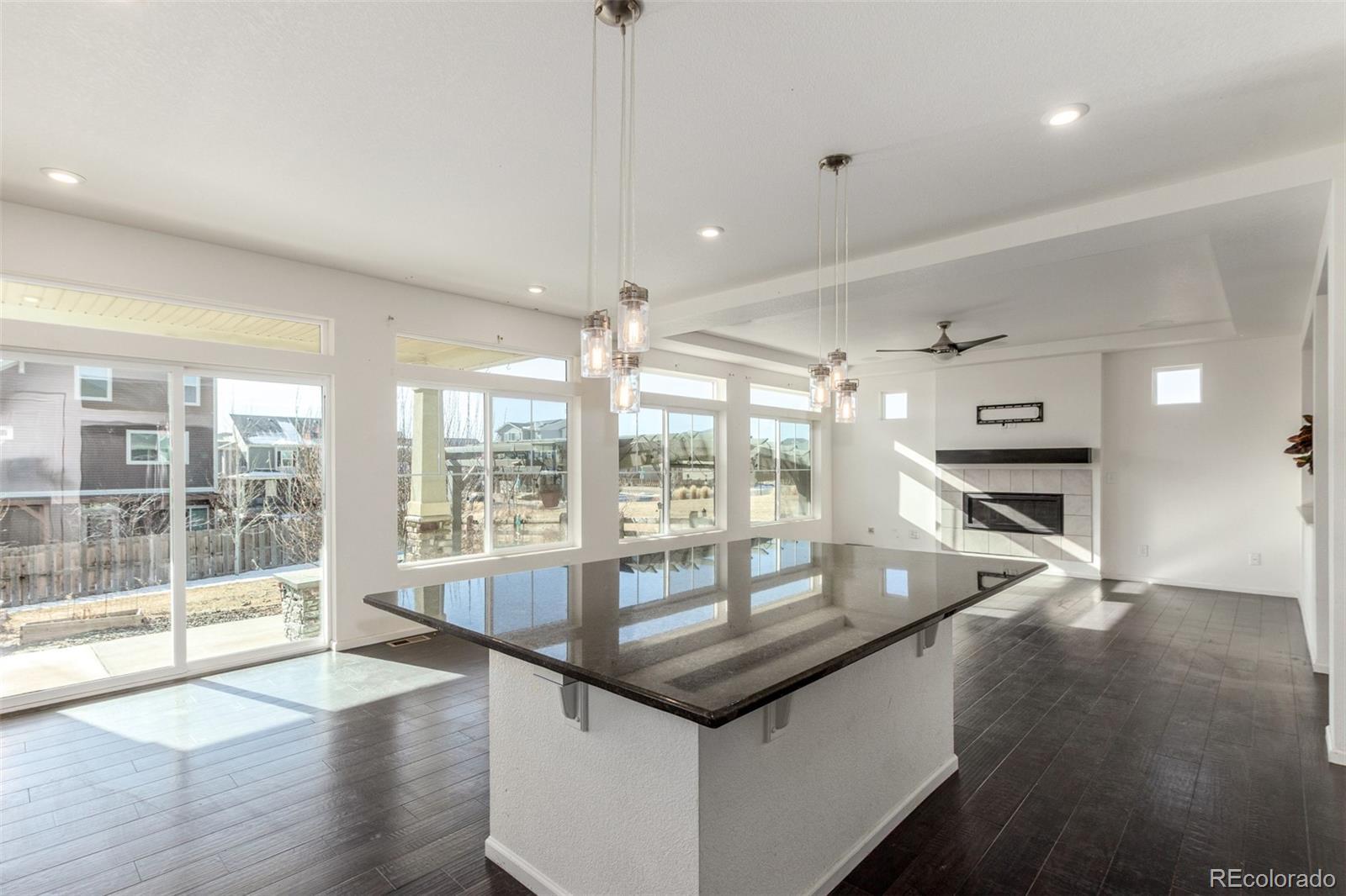 Set along a quiet greenbelt in the Adonea community, this light-filled home pairs intentional upgrades with an open, elevated layout designed for modern living. A charming front porch and mature landscaping create a warm first impression, offering a sense of arrival that feels both grounded and refined. Inside, tall ceilings, warm wood flooring, and a soft color palette establish an atmosphere of calm and cohesion. A flexible dining space unfolds just off the entry, equally suited for gatherings, a home office, or a creative studio. Beyond, the open concept living area centers around a cozy fireplace and surround sound wiring, creating a natural gathering place for evenings of music, movies, or relaxed entertaining. An upgraded southern facing window package draws abundant natural light across the main level, enhancing the home’s airy and connected feel. The kitchen anchors the heart of the home with an upgraded granite countertop package, stainless steel appliances, and an oversized island that invites conversation and connection. Ample cabinets, recessed + pendant lighting, and a walk-in pantry blend elegance with functionality. Upstairs, three bedrooms and a versatile loft provide room to retreat, recharge, or reimagine. The primary suite introduces a contemporary barn door that opens to a serene ensuite with dual granite sinks and a spacious walk-in closet, creating a private sanctuary at the end of the day. Downstairs, the unfinished basement presents a canvas for future expansion. Outdoors, a covered patio extends the living space into the backyard, offering an inviting setting to unwind while overlooking the peaceful greenbelt. The 2-car garage includes a 240v EV charger, seamlessly blending modern convenience with forward thinking design. This luxurious and open Aurora home delivers an elegant lifestyle rooted in light, space, and thoughtful upgrades, where every detail has been curated to support a life well lived.