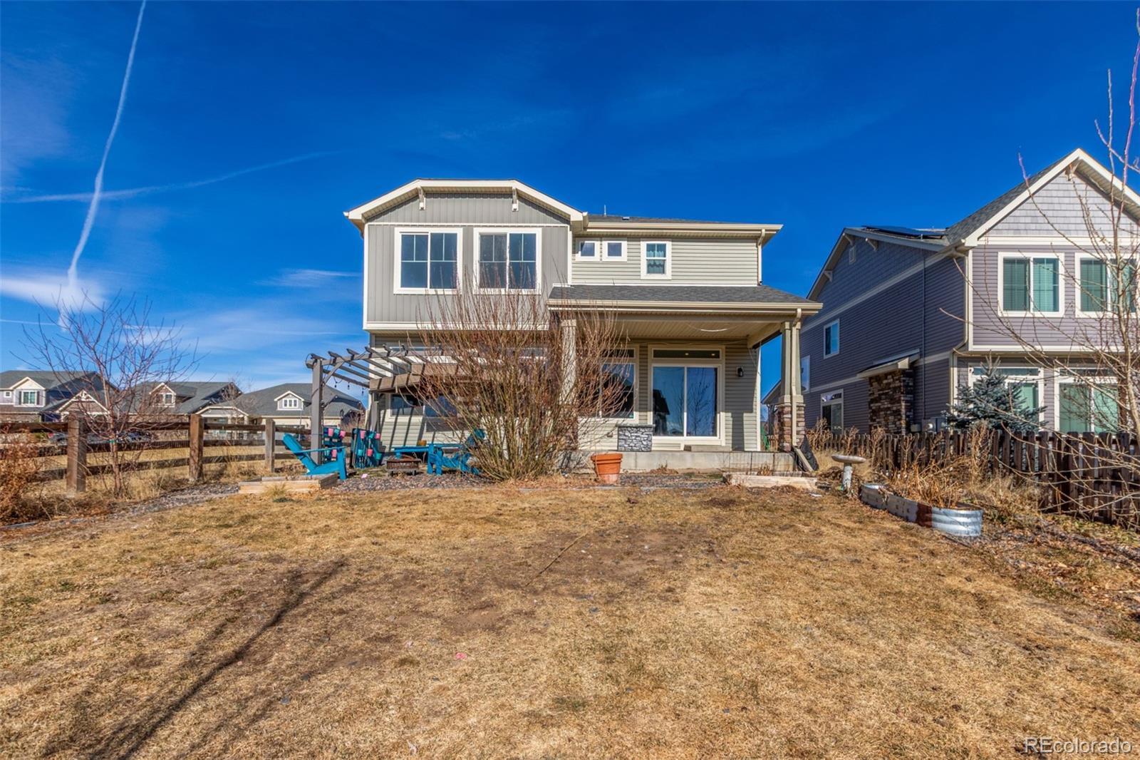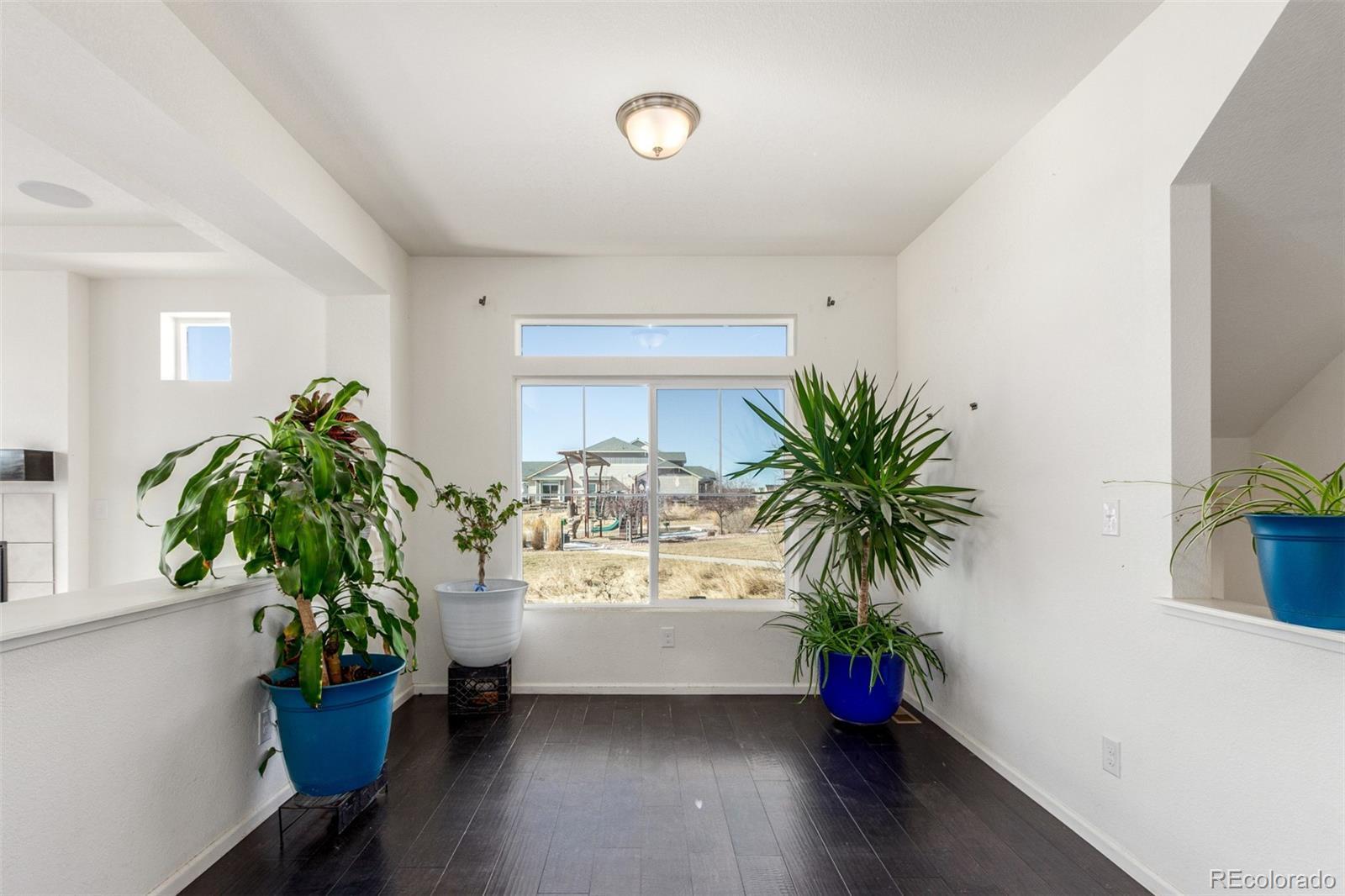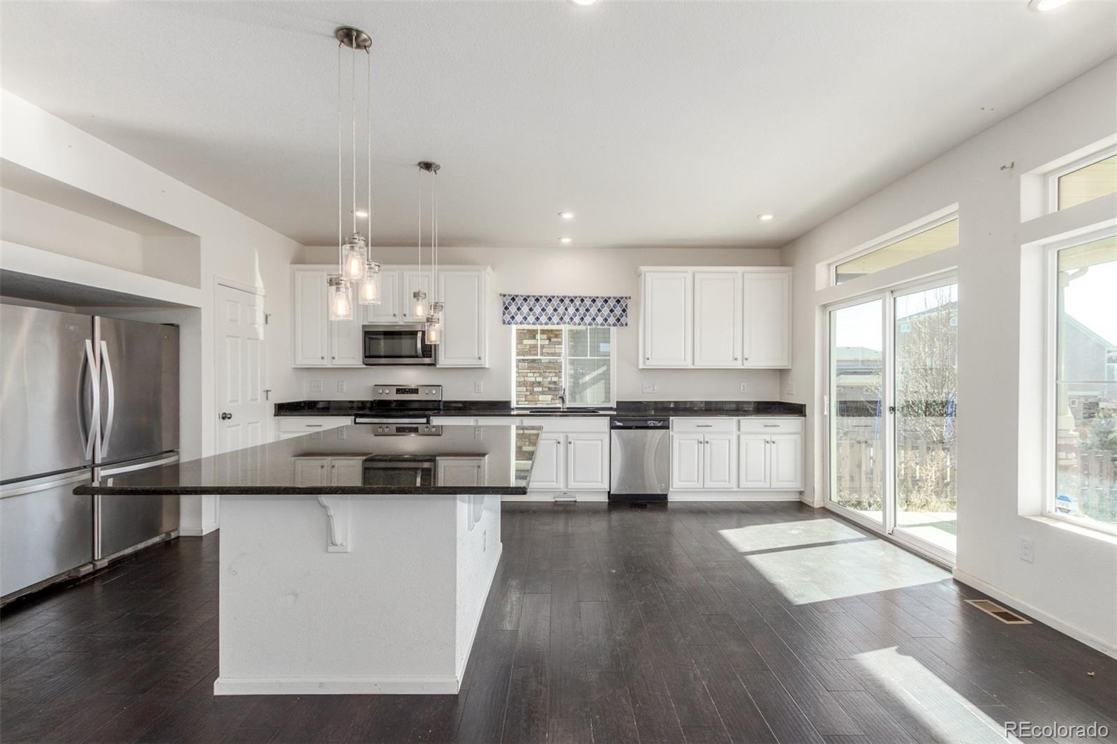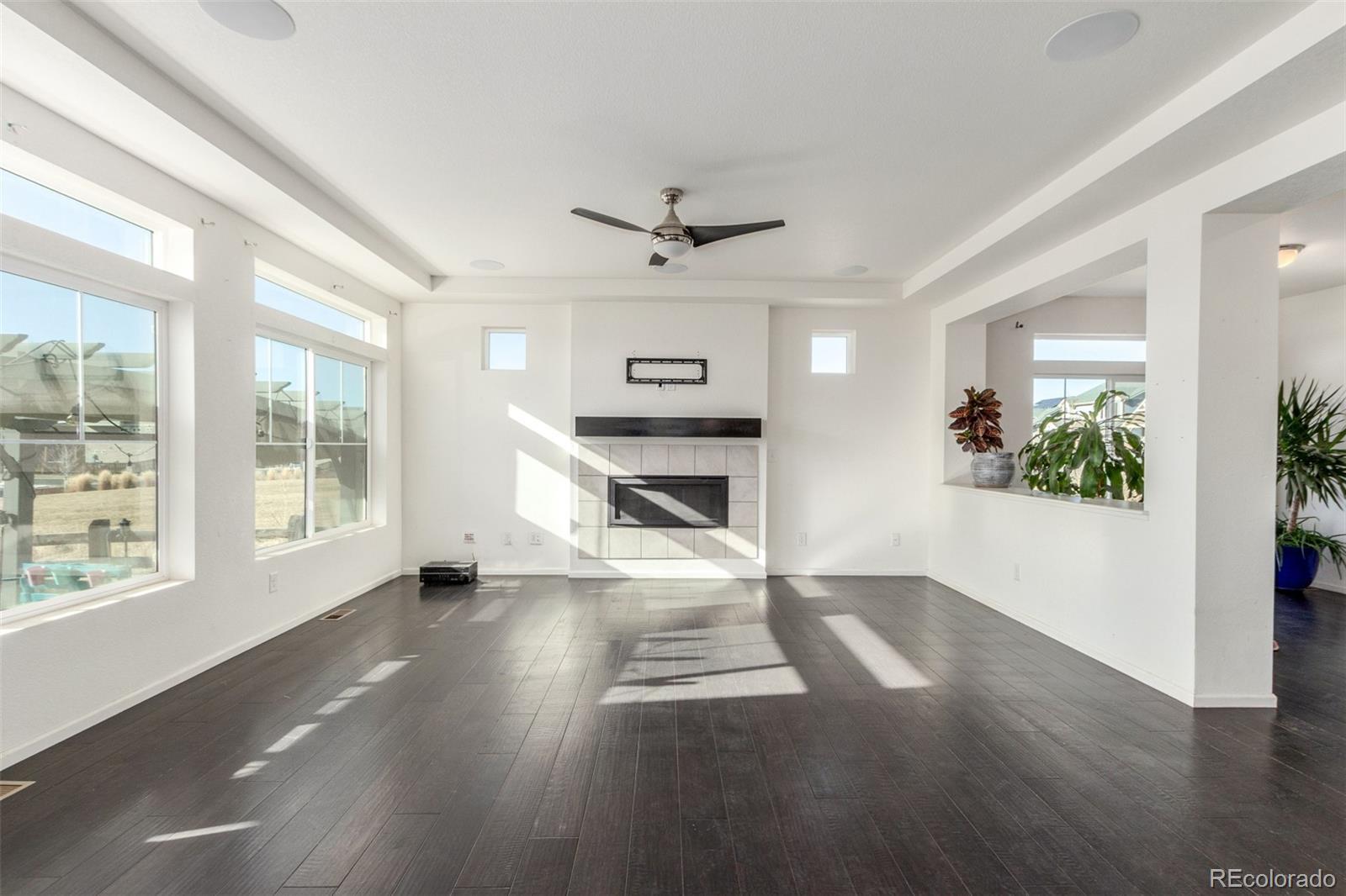 Set along a quiet greenbelt in the Adonea community, this light-filled home pairs intentional upgrades with an open, elevated layout designed for modern living. A charming front porch and mature landscaping create a warm first impression, offering a sense of arrival that feels both grounded and refined. Inside, tall ceilings, warm wood flooring, and a soft color palette establish an atmosphere of calm and cohesion. A flexible dining space unfolds just off the entry, equally suited for gatherings, a home office, or a creative studio. Beyond, the open concept living area centers around a cozy fireplace and surround sound wiring, creating a natural gathering place for evenings of music, movies, or relaxed entertaining. An upgraded southern facing window package draws abundant natural light across the main level, enhancing the home’s airy and connected feel. The kitchen anchors the heart of the home with an upgraded granite countertop package, stainless steel appliances, and an oversized island that invites conversation and connection. Ample cabinets, recessed + pendant lighting, and a walk-in pantry blend elegance with functionality. Upstairs, three bedrooms and a versatile loft provide room to retreat, recharge, or reimagine. The primary suite introduces a contemporary barn door that opens to a serene ensuite with dual granite sinks and a spacious walk-in closet, creating a private sanctuary at the end of the day. Downstairs, the unfinished basement presents a canvas for future expansion. Outdoors, a covered patio extends the living space into the backyard, offering an inviting setting to unwind while overlooking the peaceful greenbelt. The 2-car garage includes a 240v EV charger, seamlessly blending modern convenience with forward thinking design. This luxurious and open Aurora home delivers an elegant lifestyle rooted in light, space, and thoughtful upgrades, where every detail has been curated to support a life well lived.